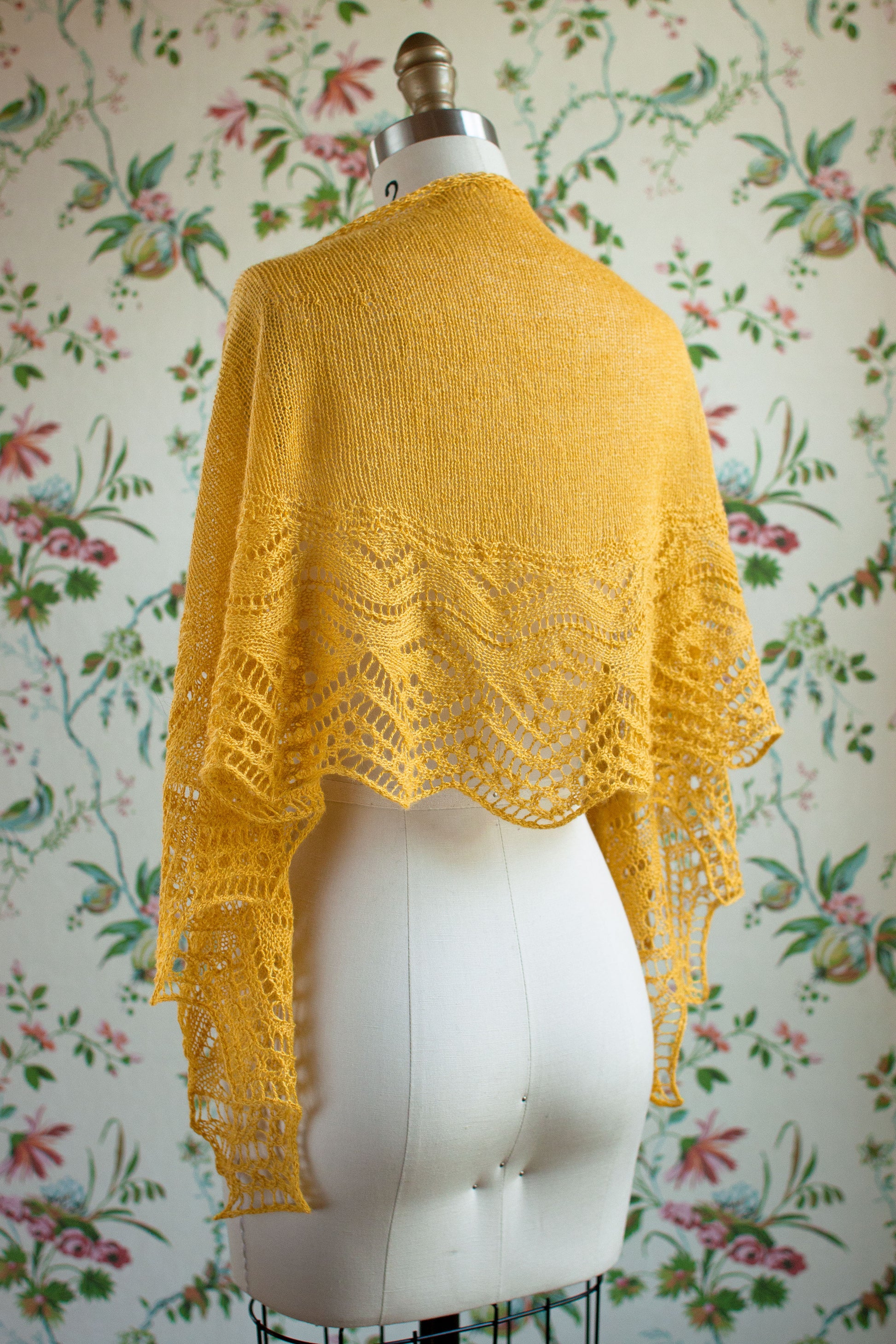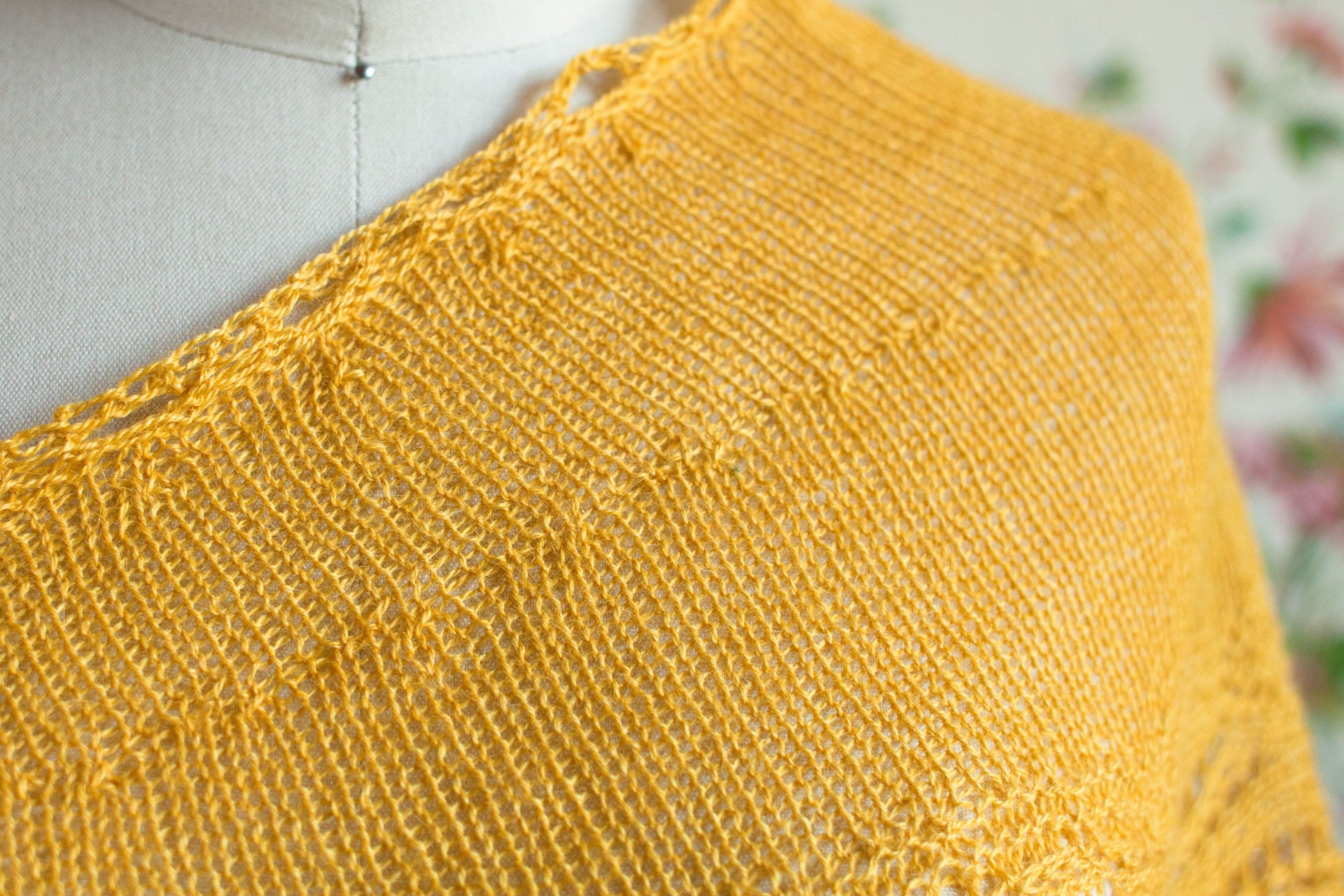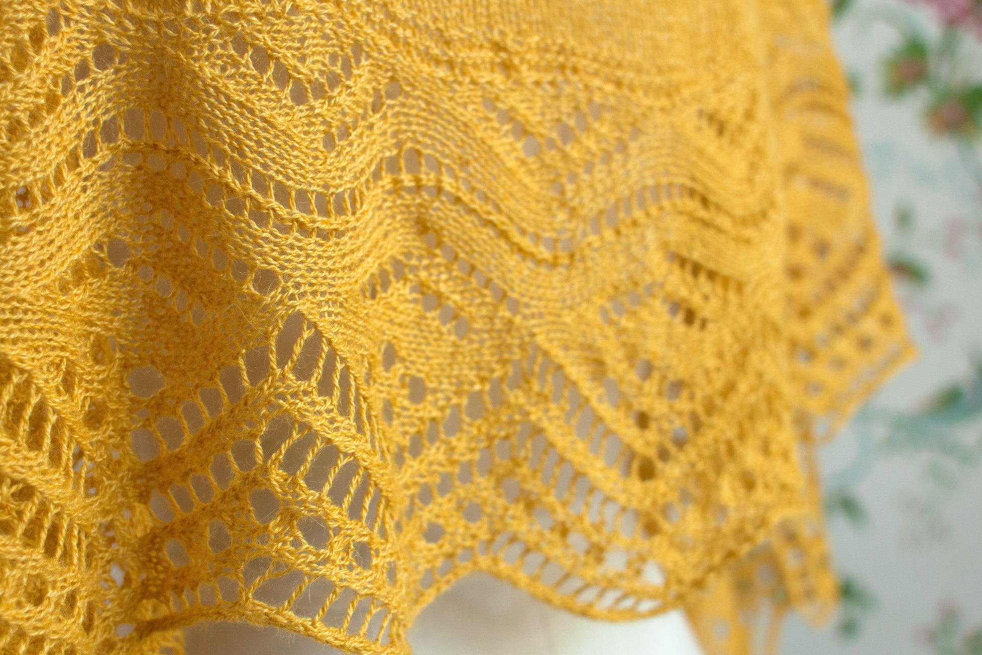 (Gauge is not crucial, but any change to row gauge will lead to a shorter wingspan and a shallower shawl)