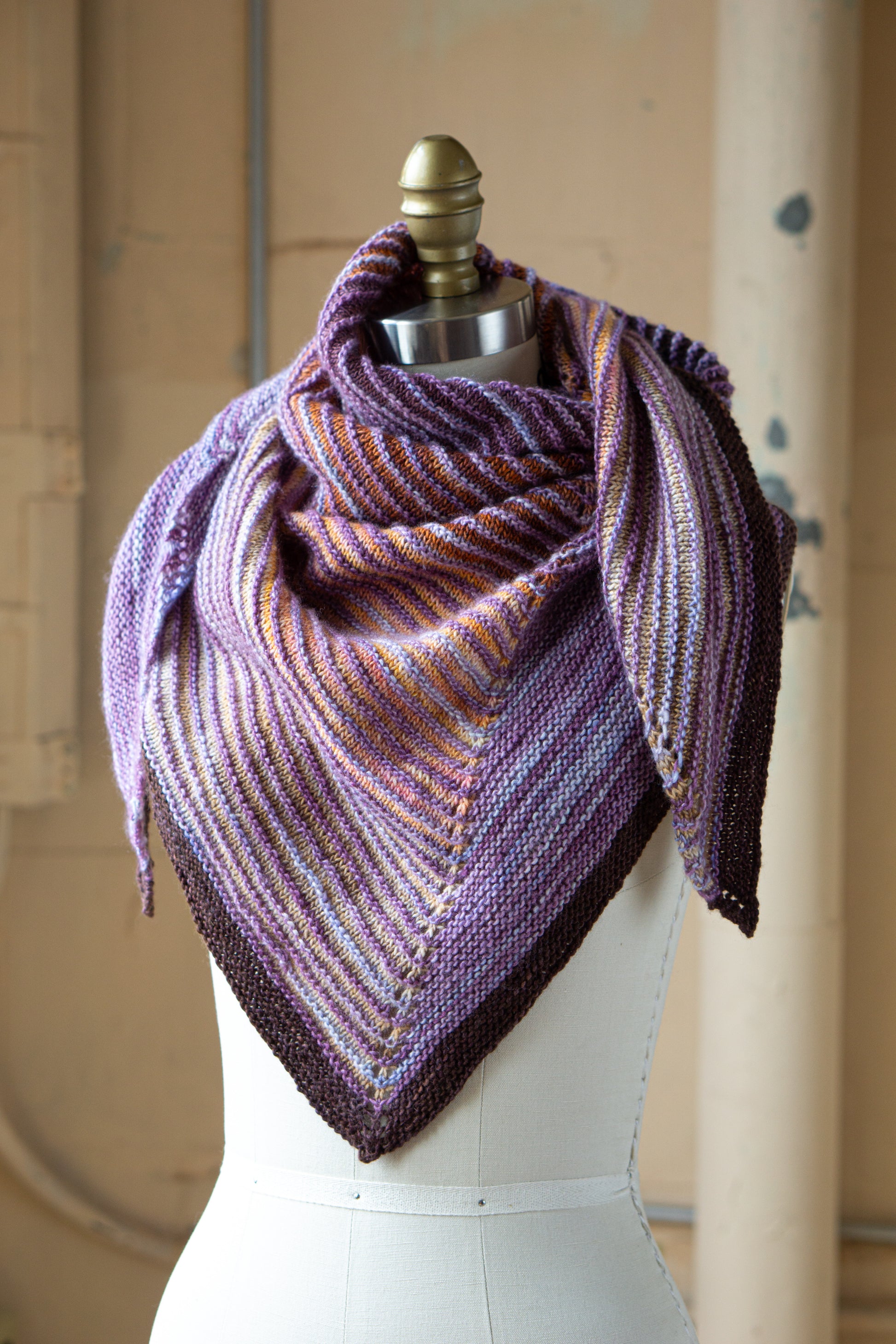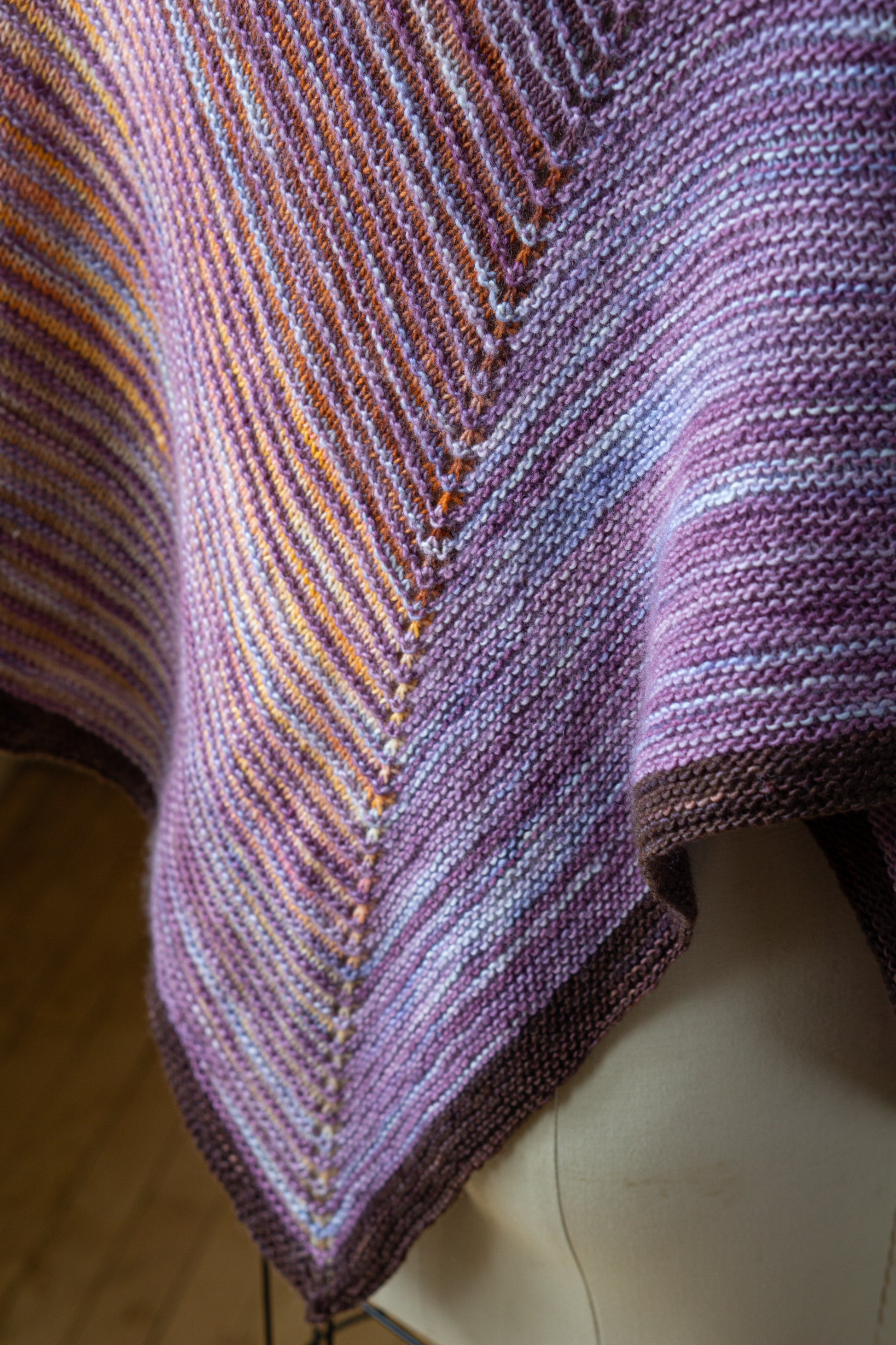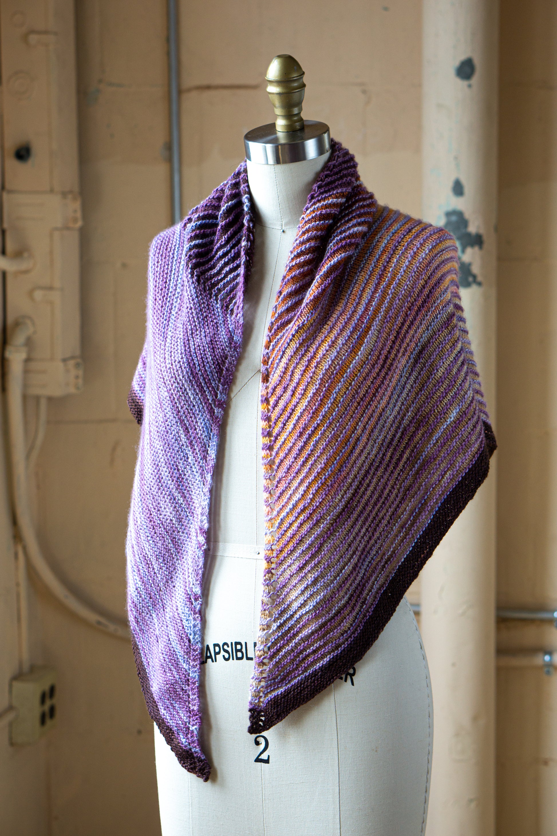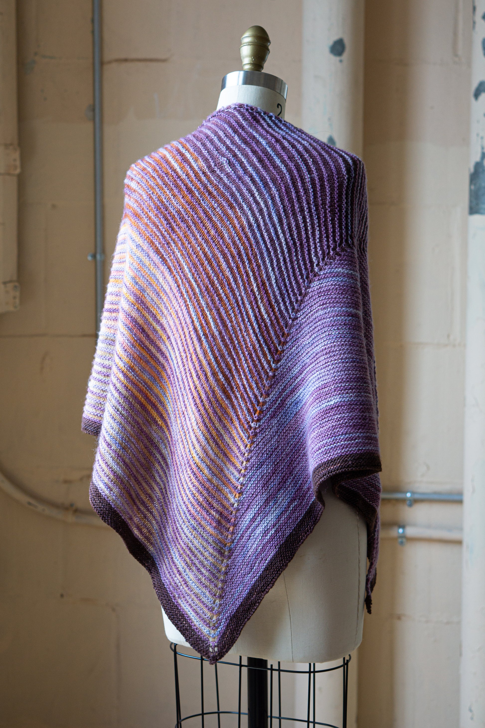 An unexpected combination of stripes and short rows gives the shawl an asymmetric triangular shape.