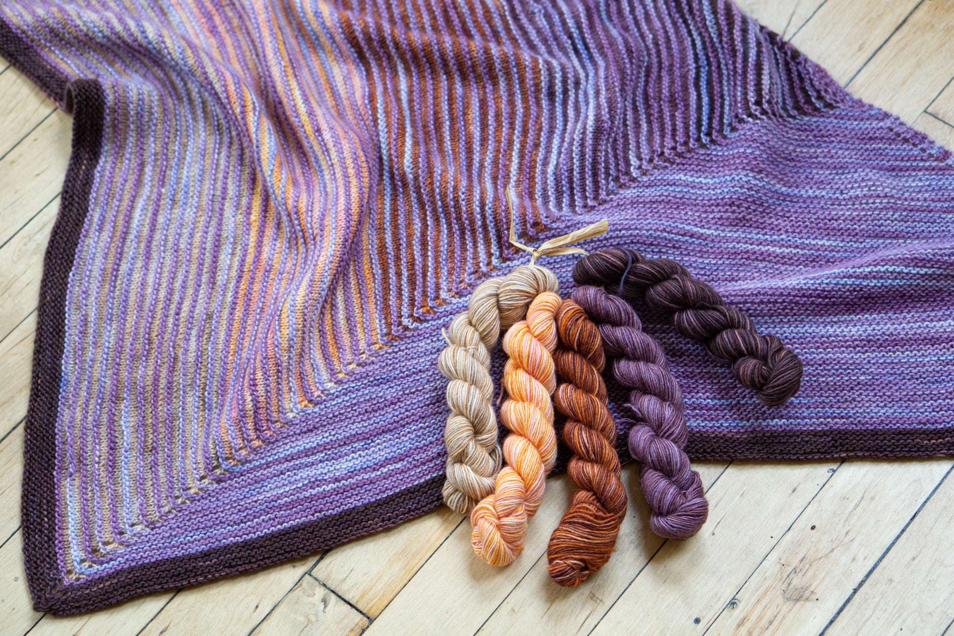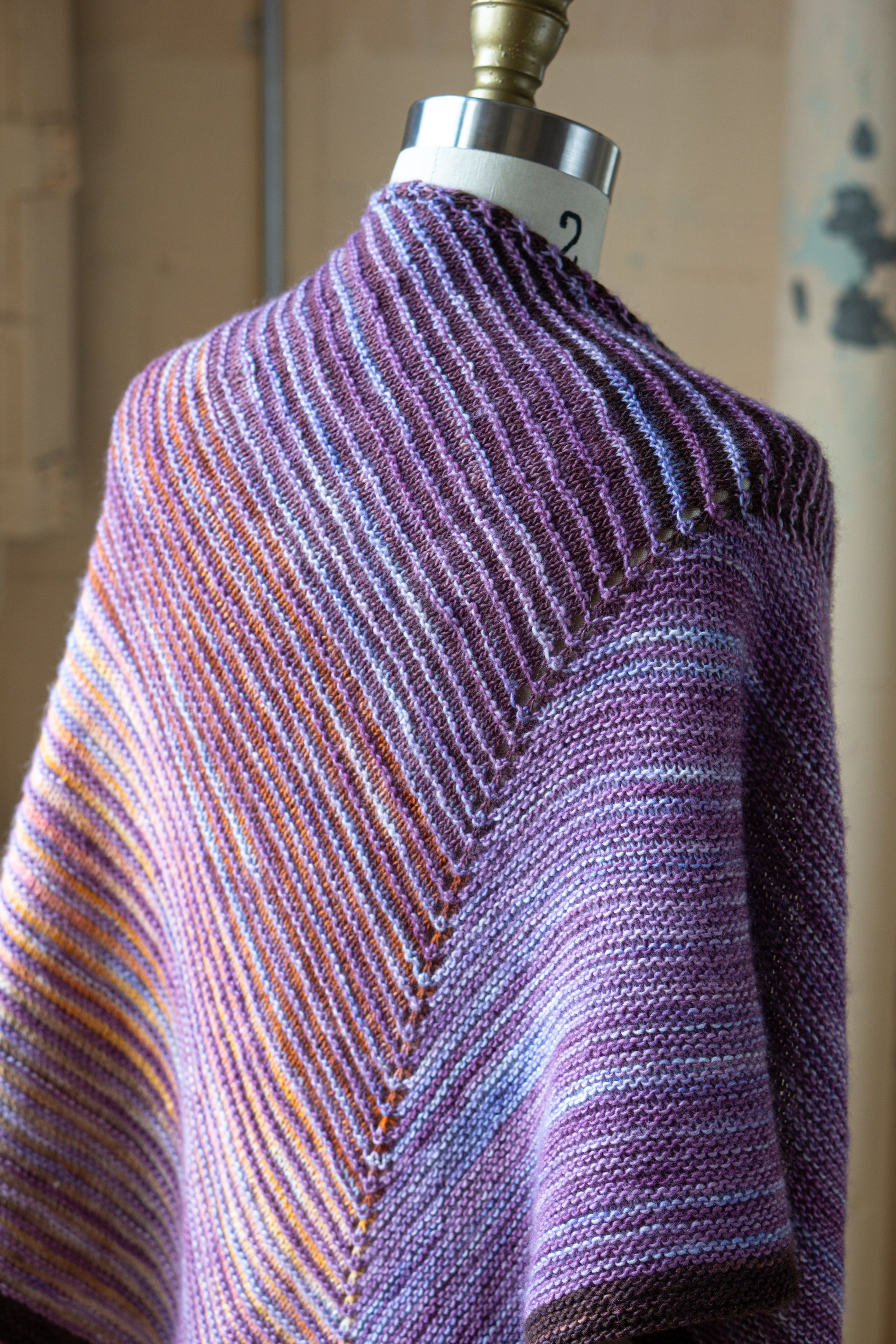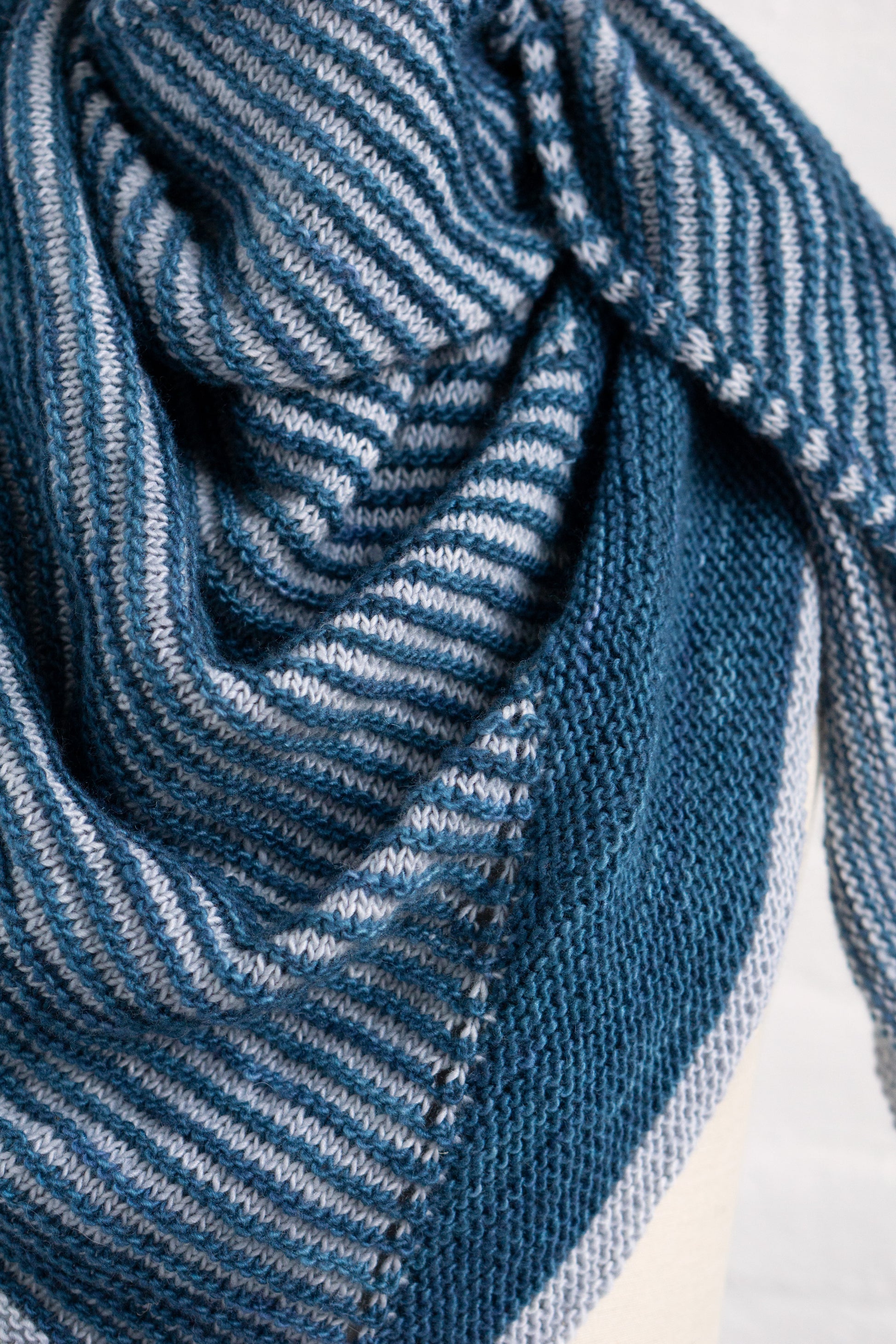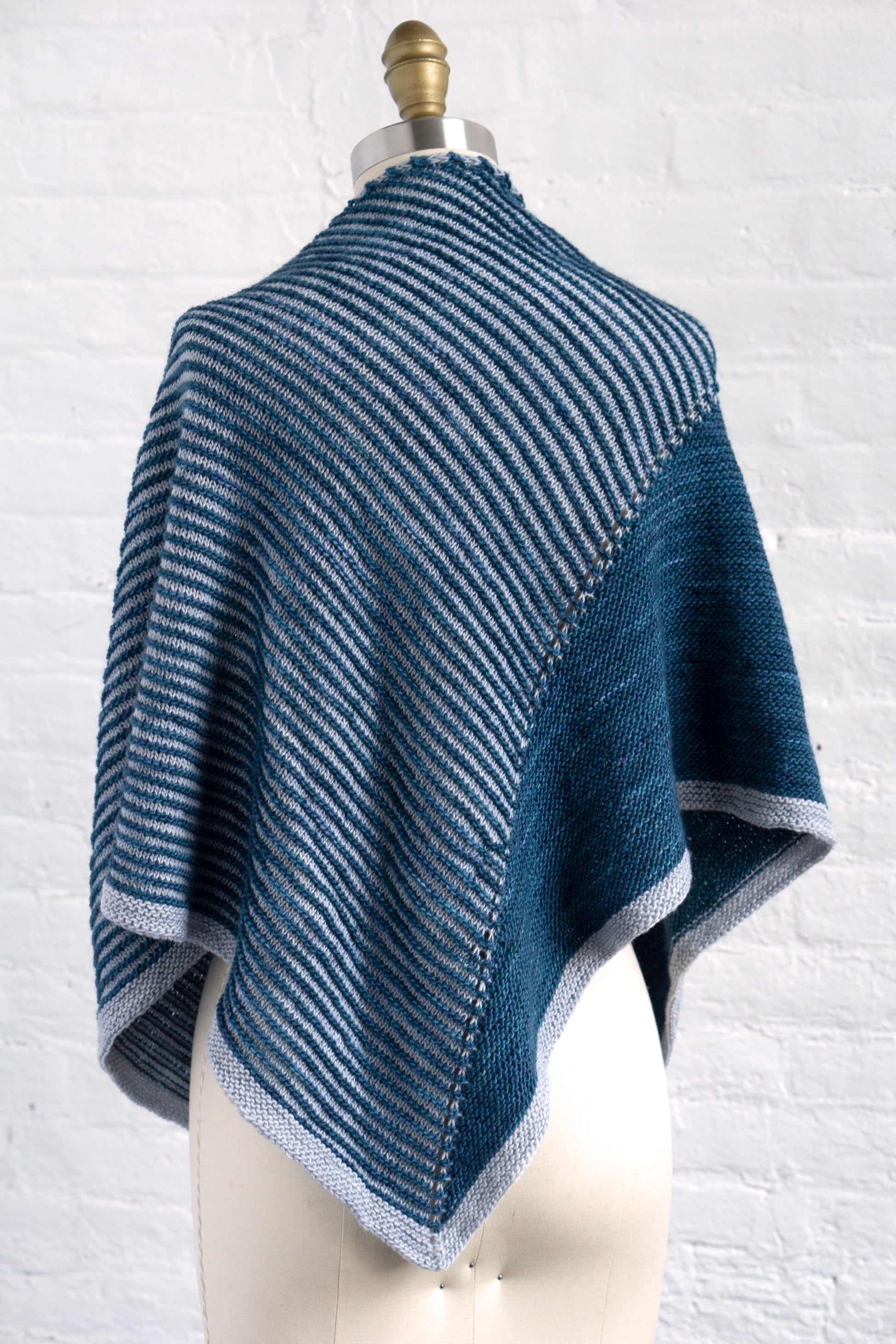 An unexpected combination of stripes and short rows gives the shawl an asymmetric triangular shape.