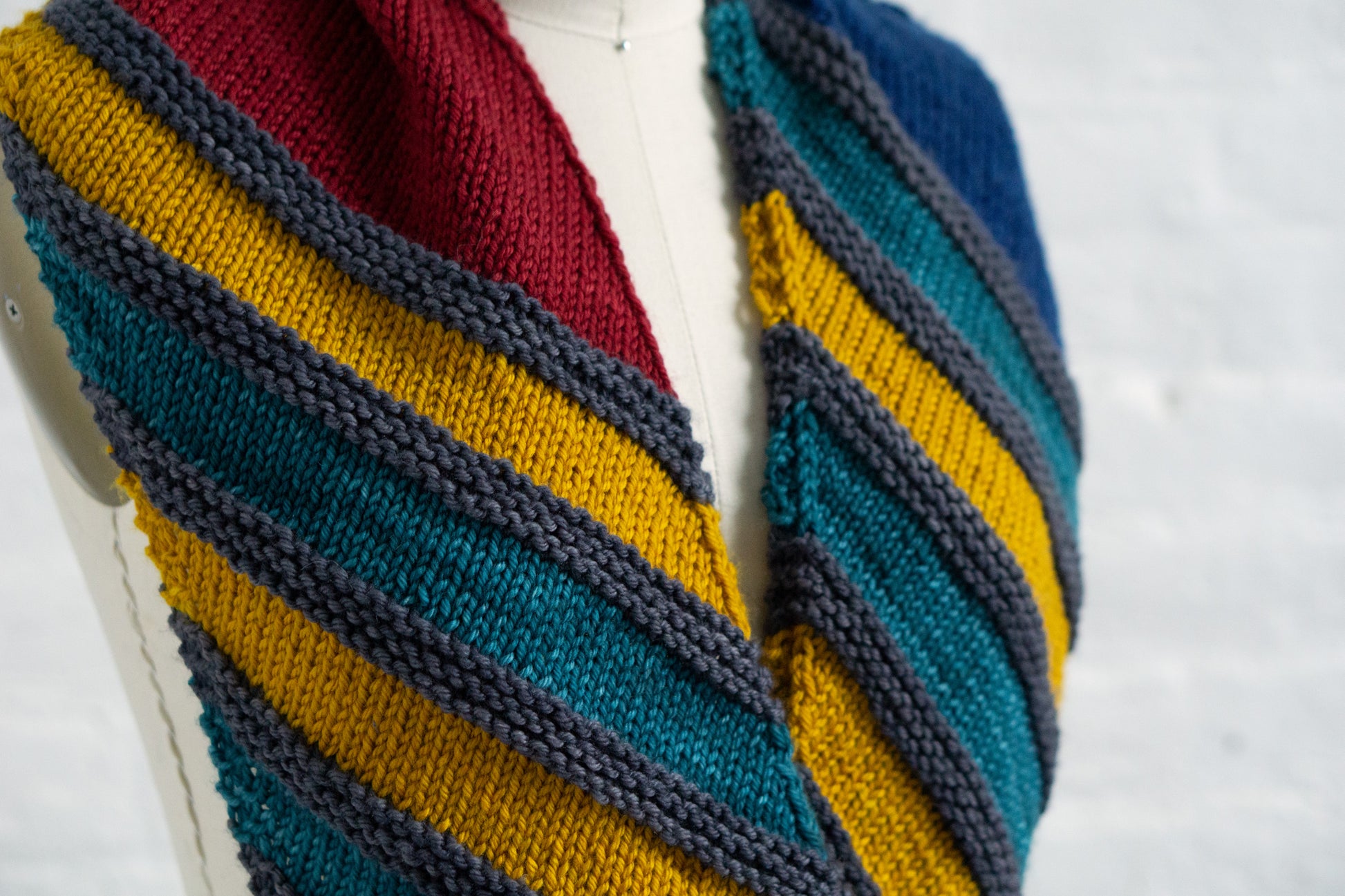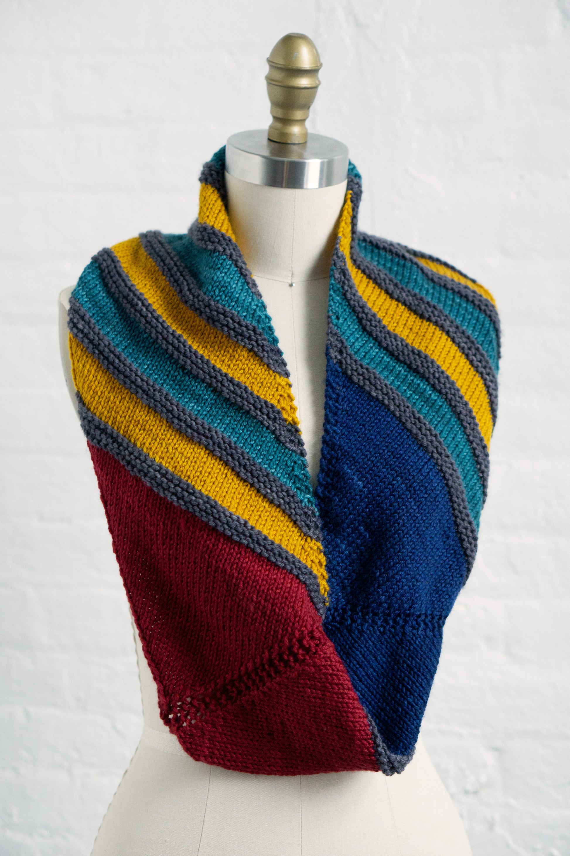 Gather 5 of your favorite colors of Alegria Grande Bocados - our 25g worsted weight mini-skeins - to make this modular cowl full of stripes and shapes!