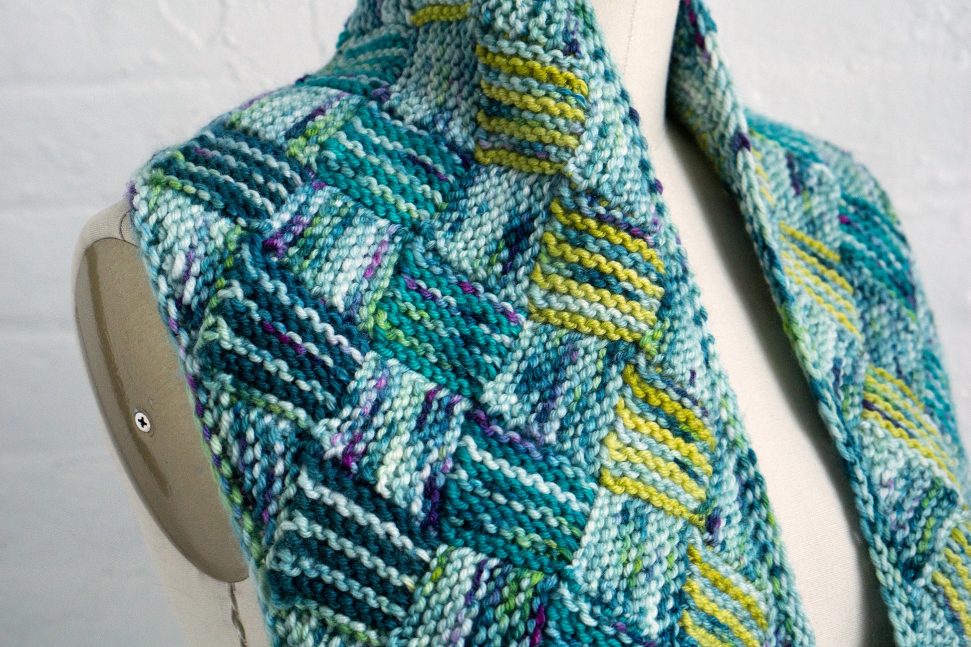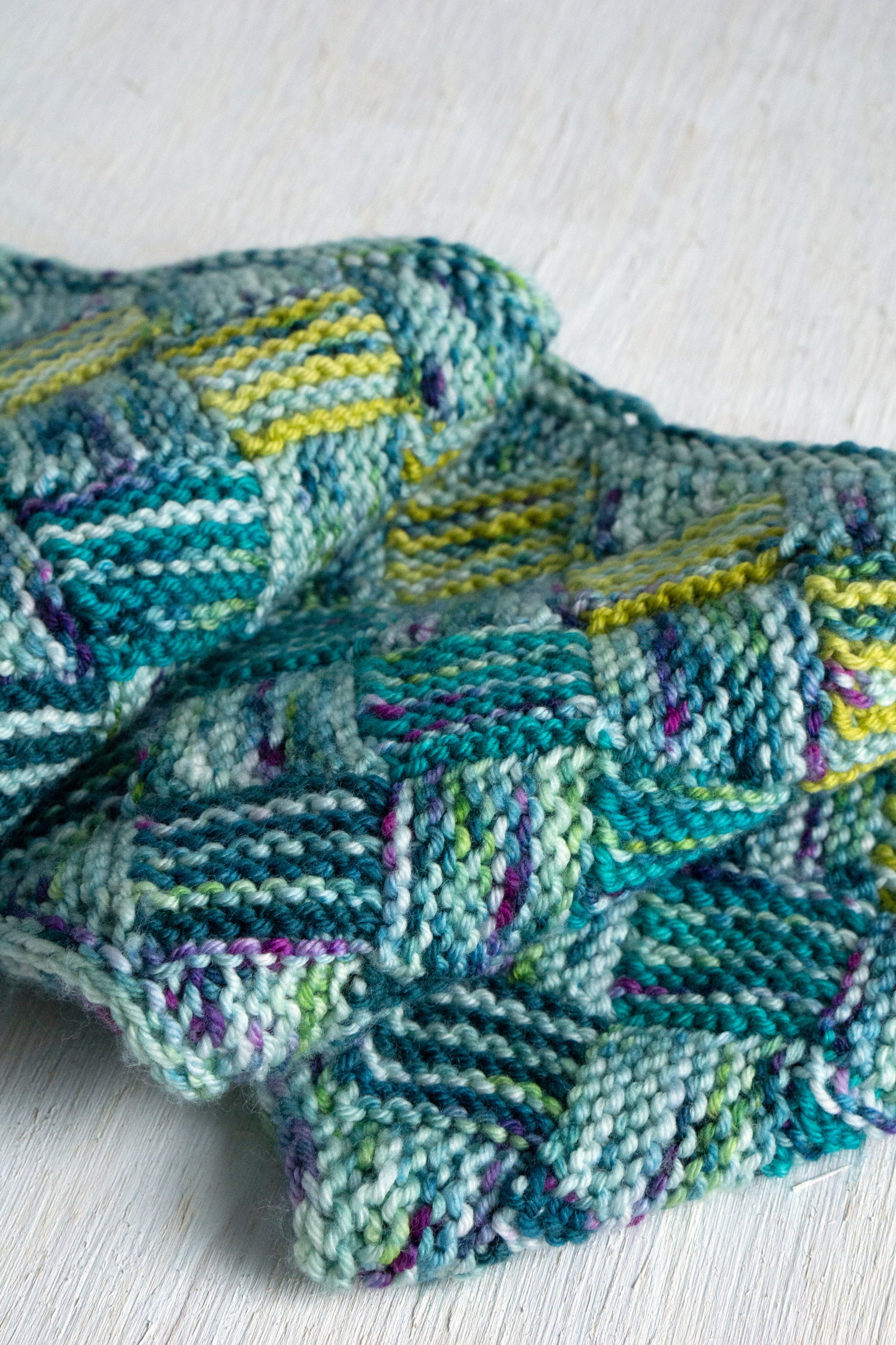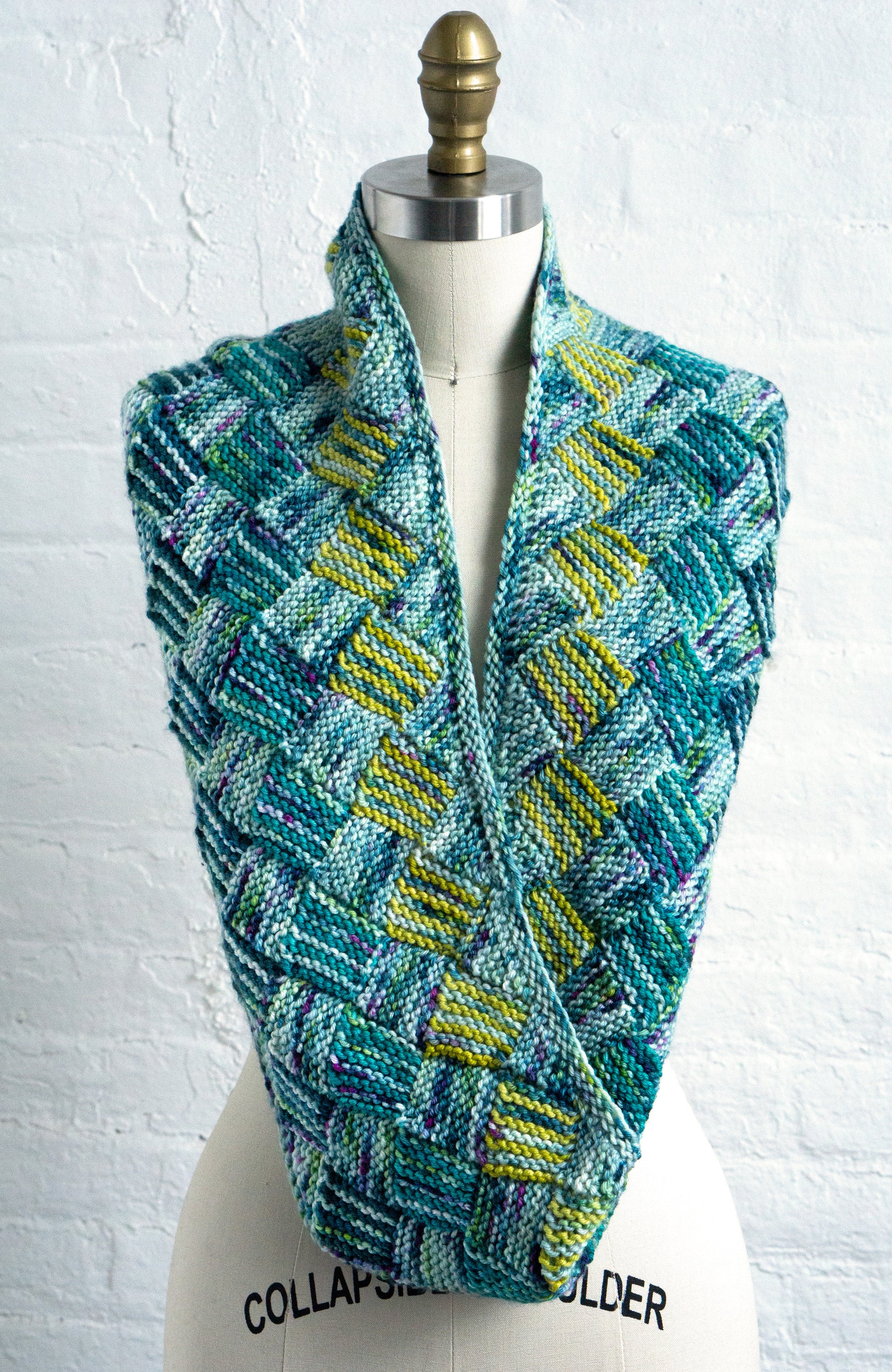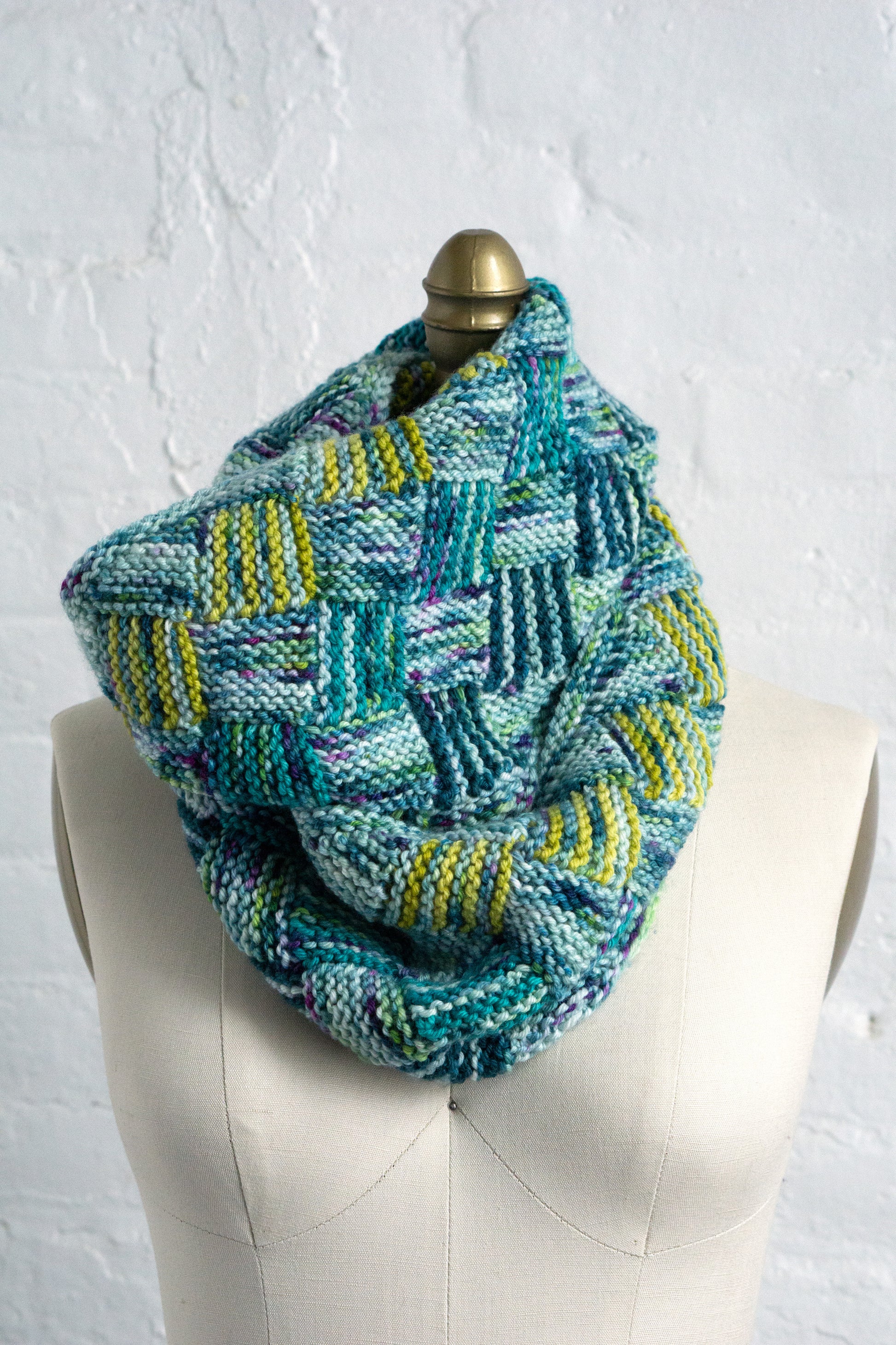 As a study in color, the cowl is knit in two different versions: Alegria Grande and Maxima. Use 3 Alegria Grande Bocados to create a subtle gradient. Or, in Maxima, one contrast color high steps its way through the entrelac pattern.