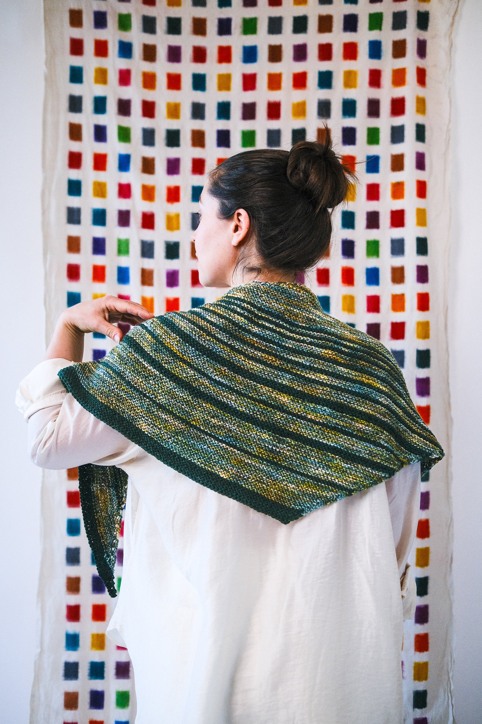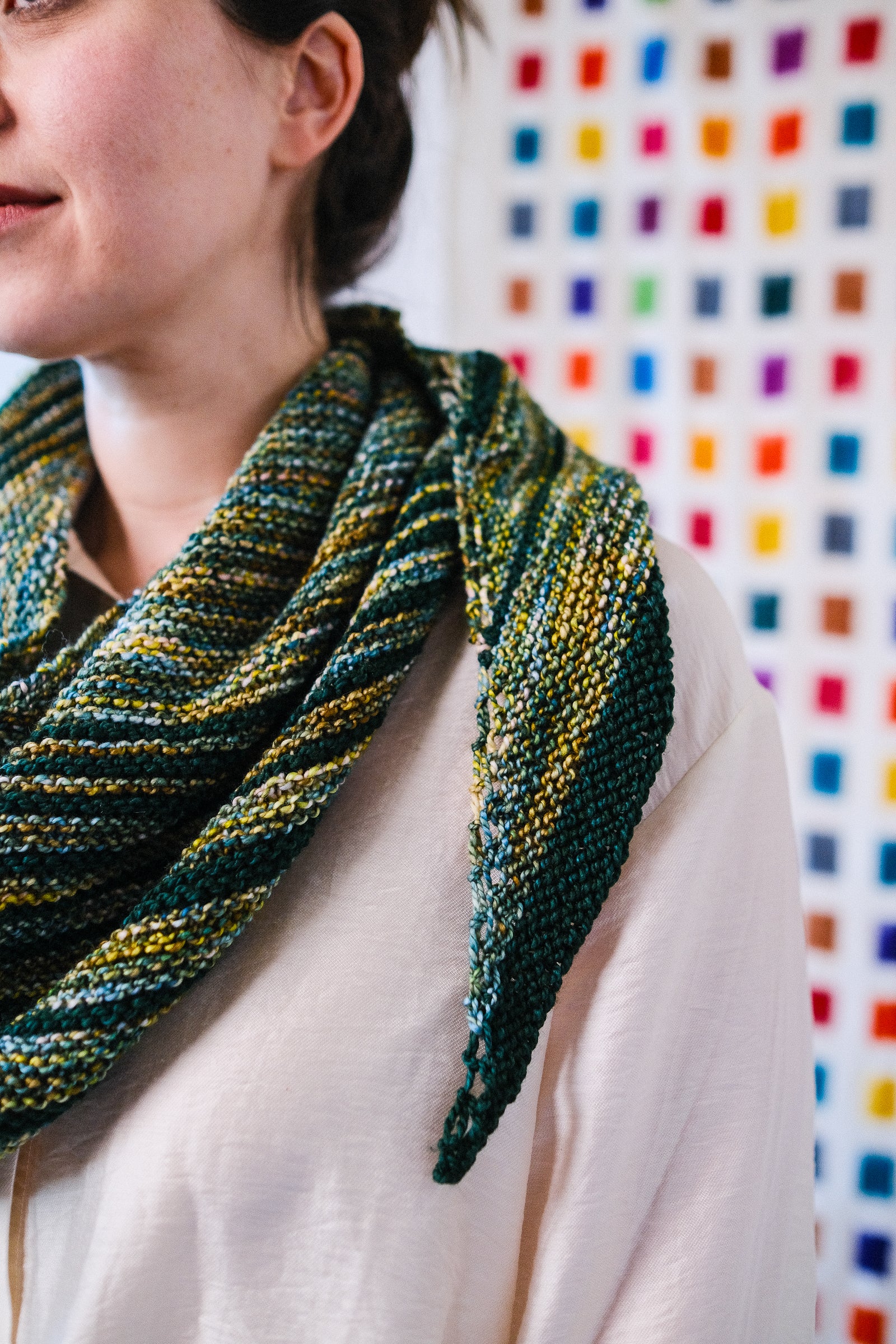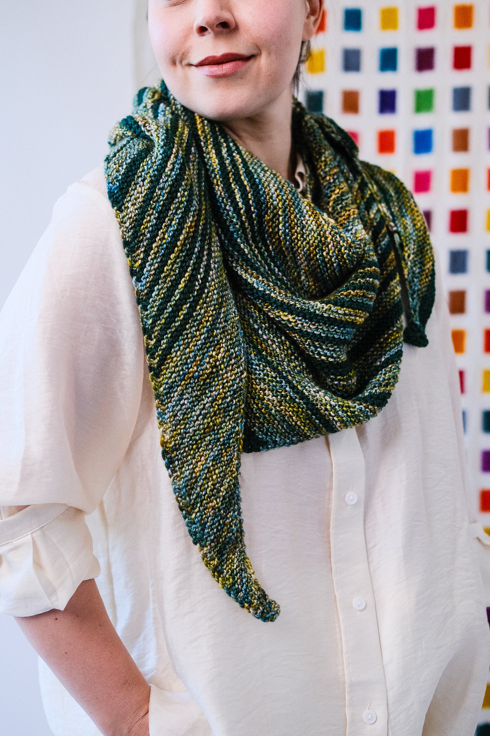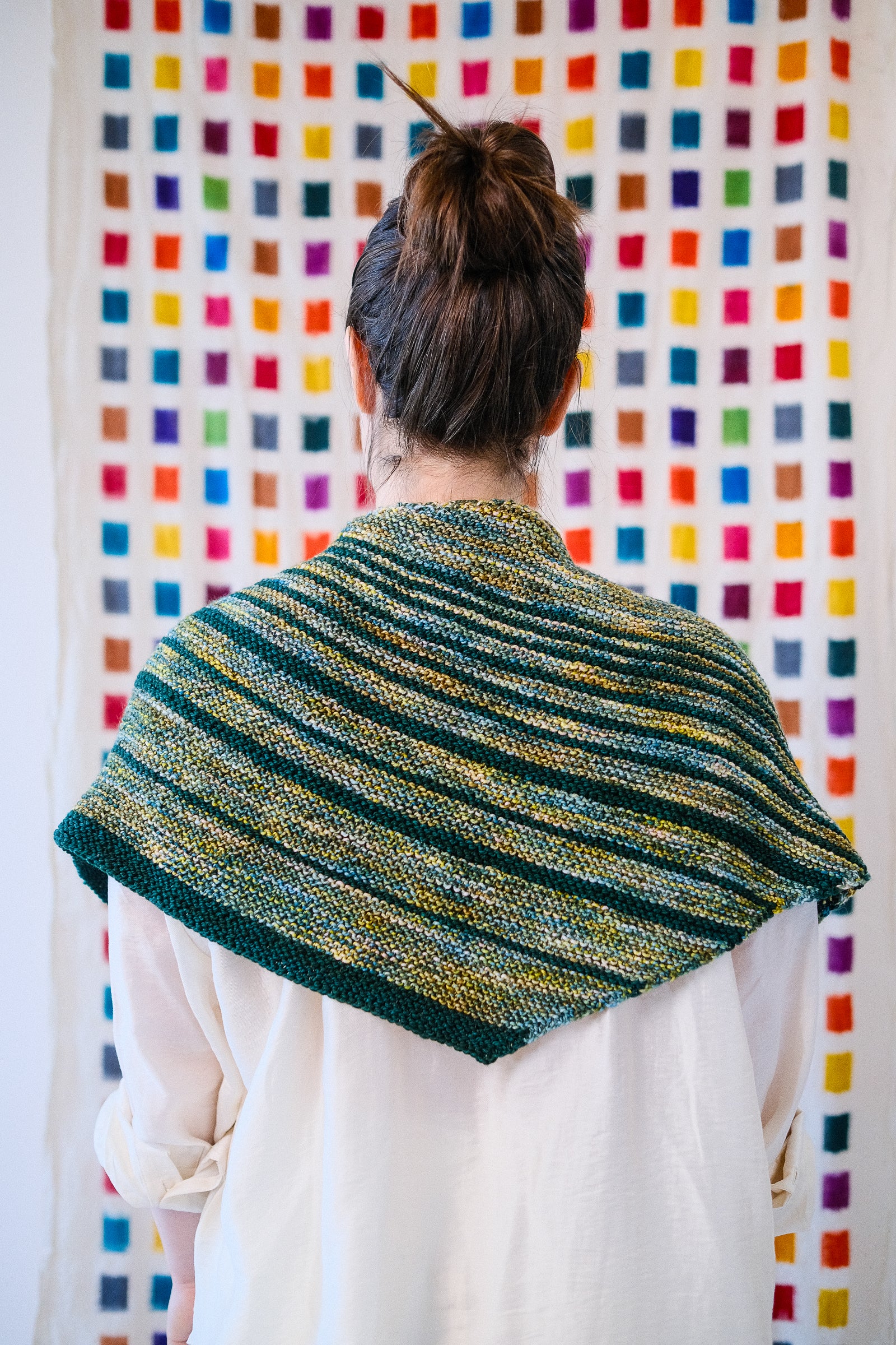 Stripes of semi-solid Sami remind us of Saturn's rings against a background of multicolor Marla. The shape is an asymmetrical triangle worked from one long point to the opposite short side, all in trusty garter stitch.