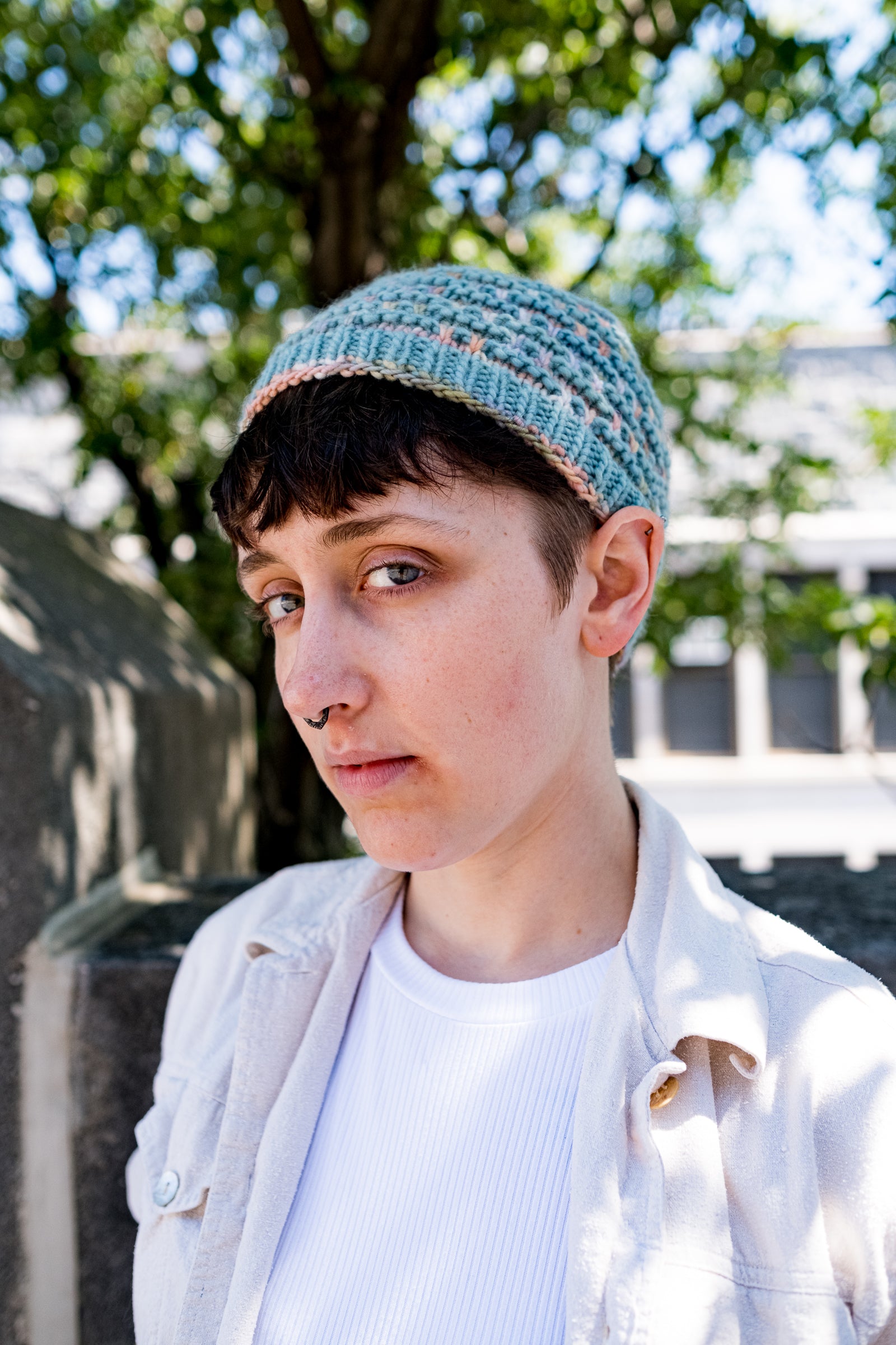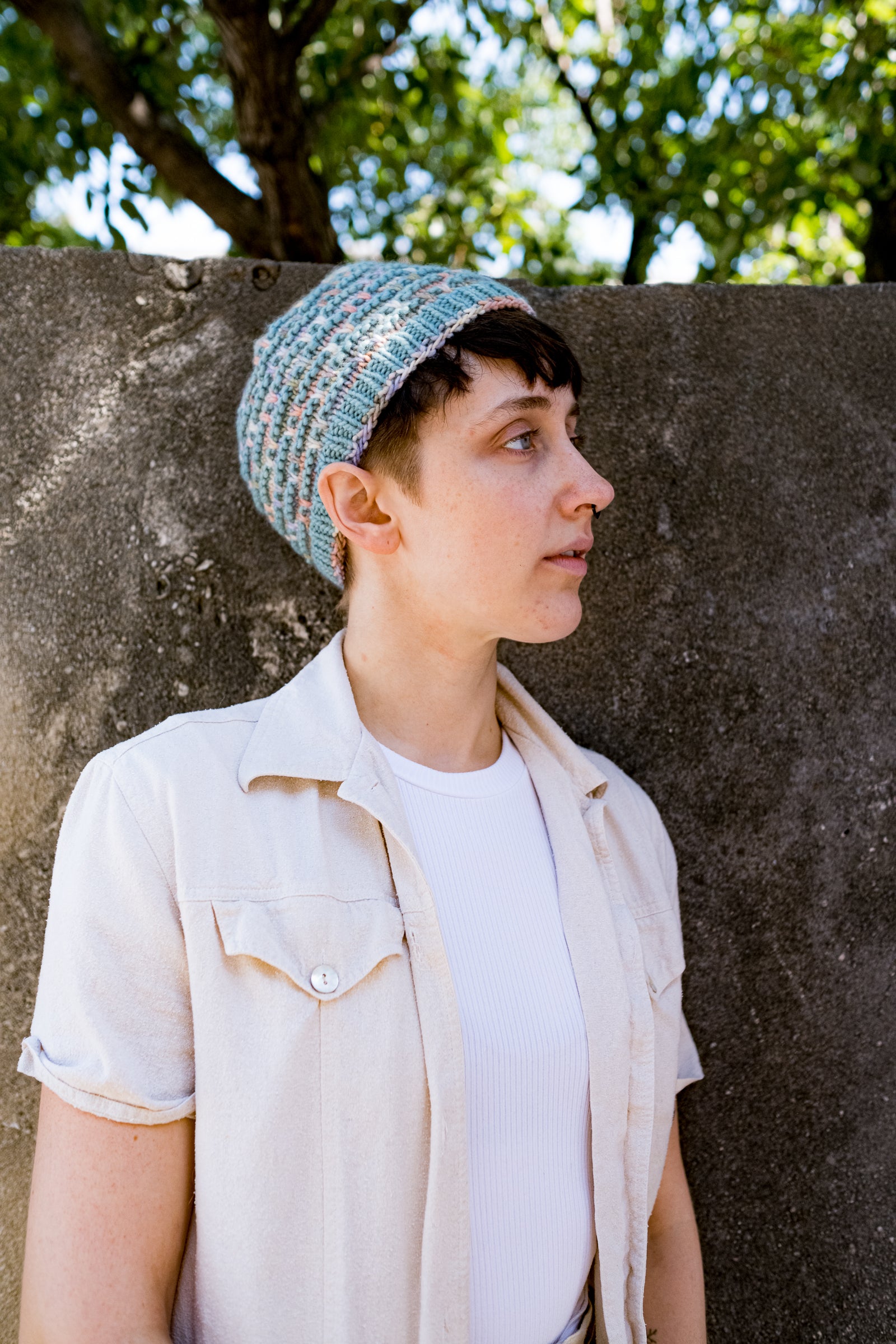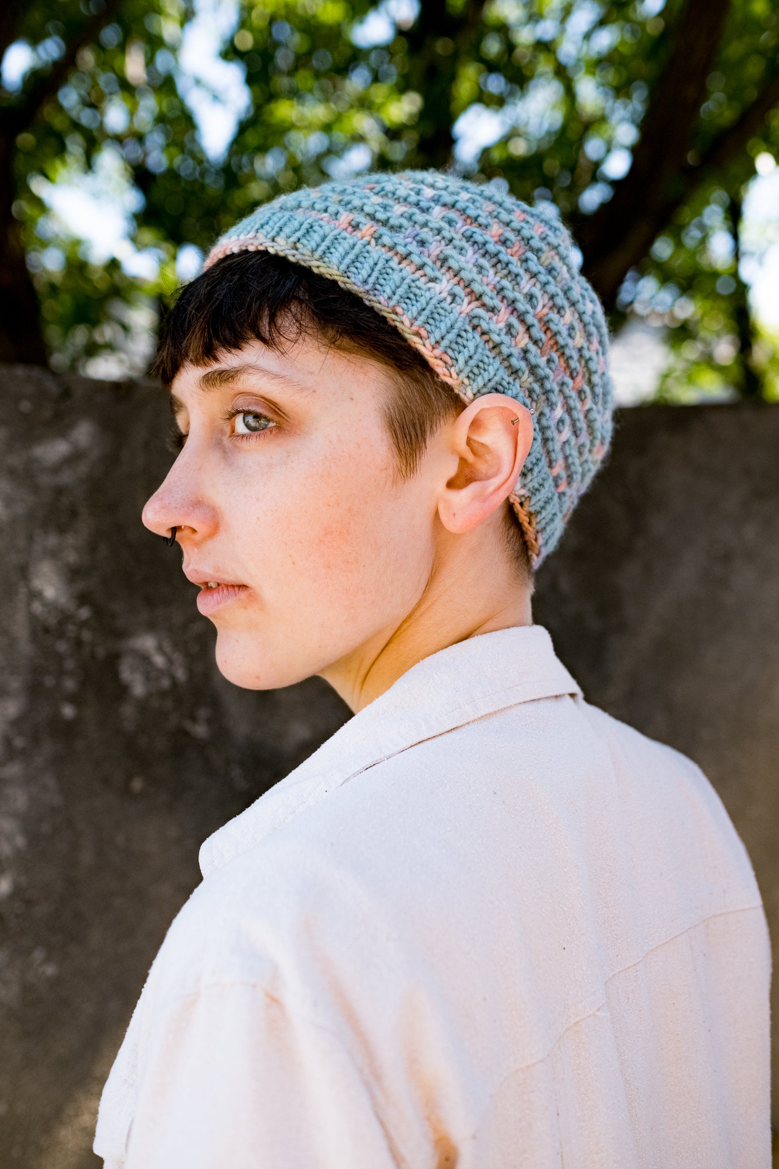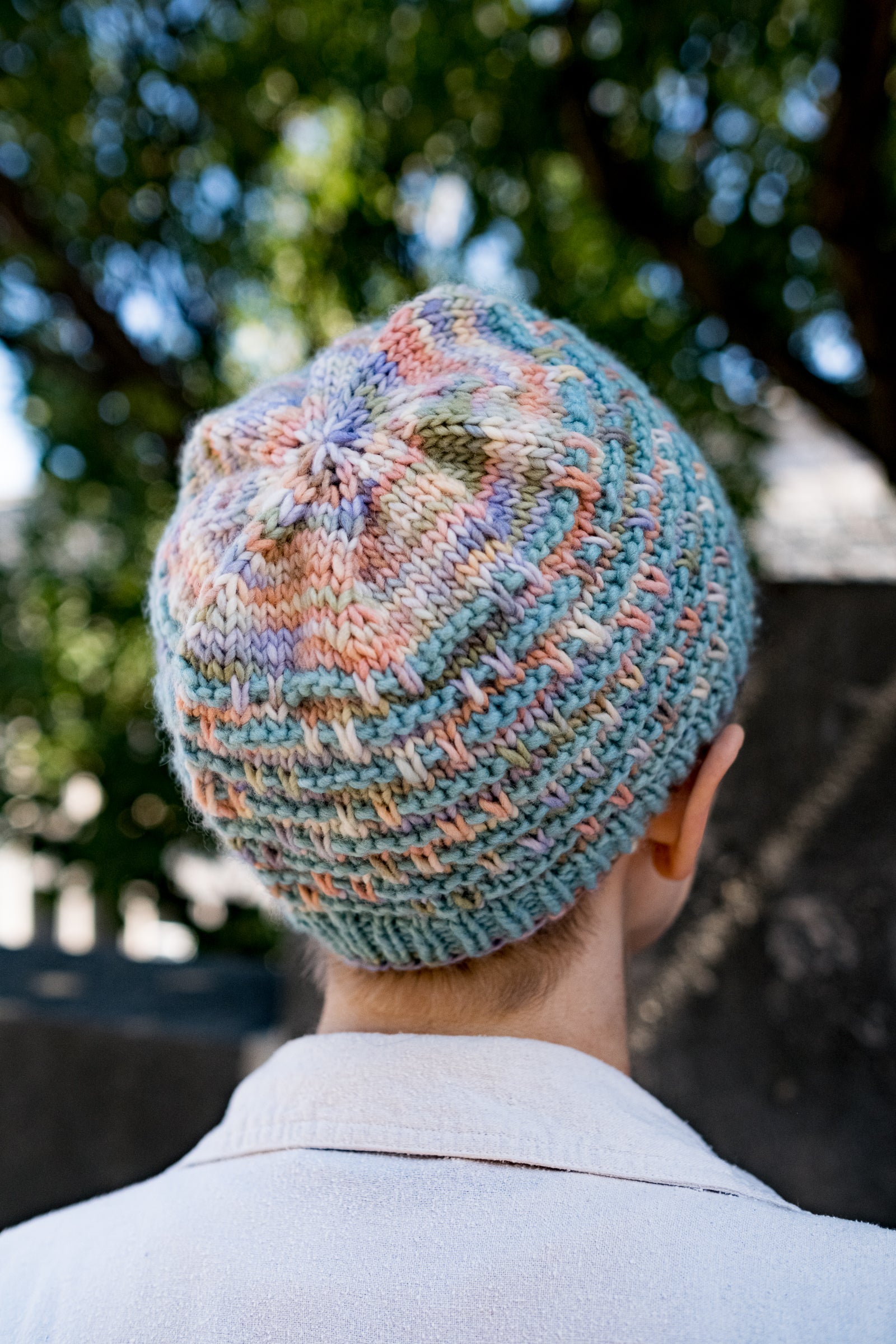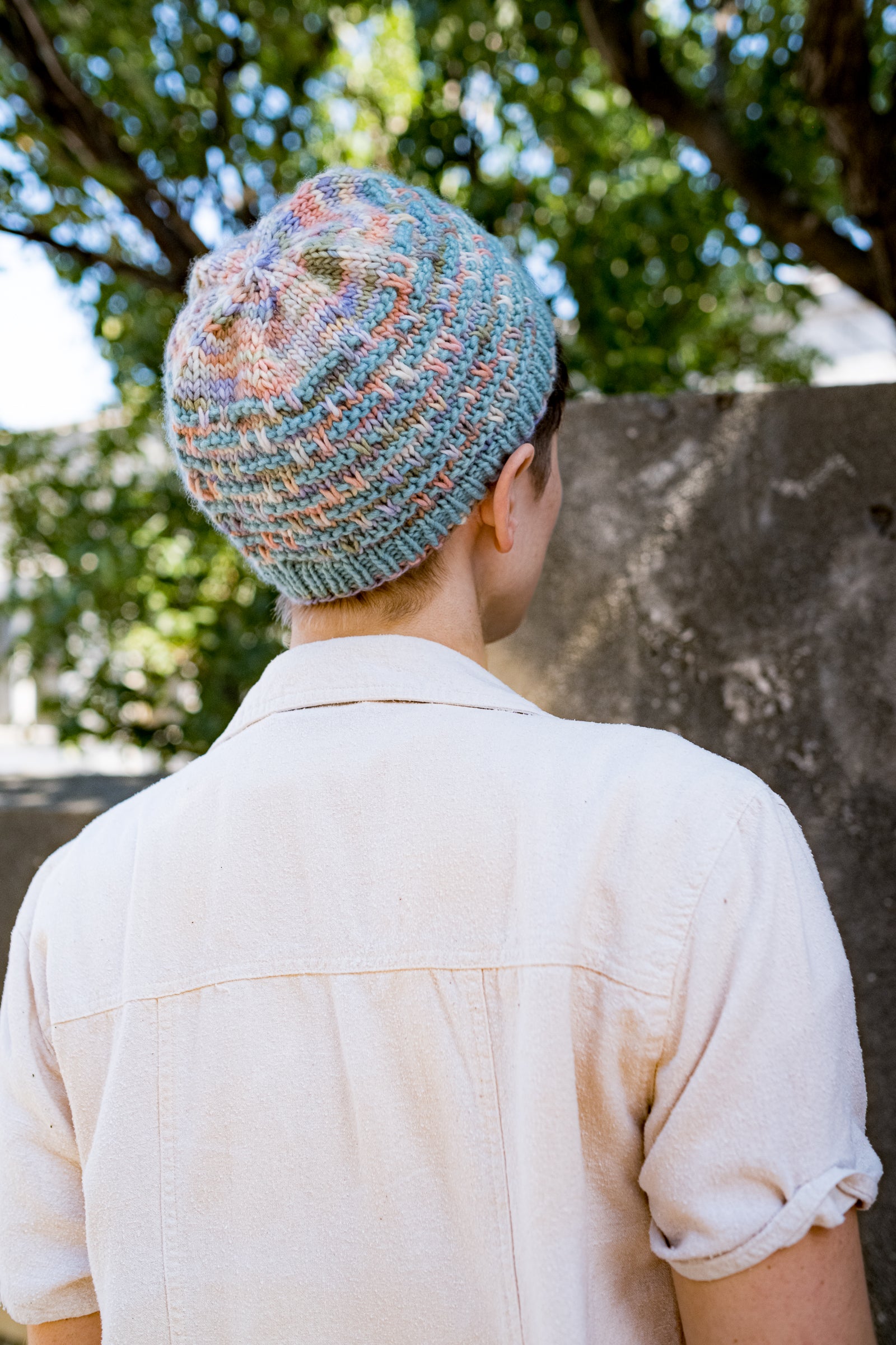 The Sea + Shore Hat uses Maxima in Mosaic and Lagoon in a fun slip-stitch pattern to make a cap full of color and texture!