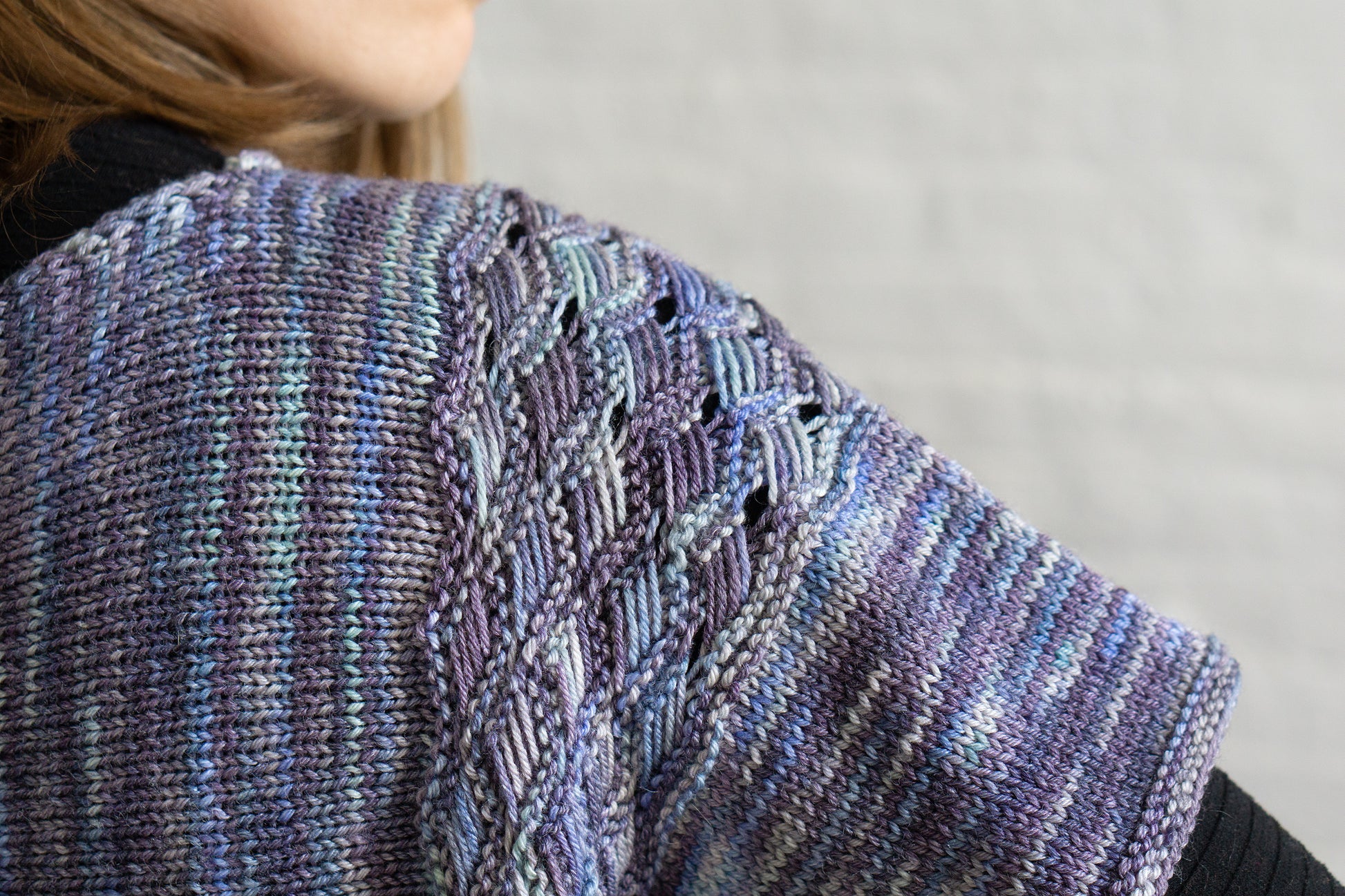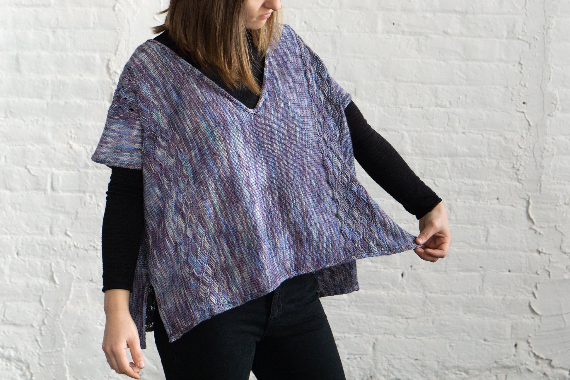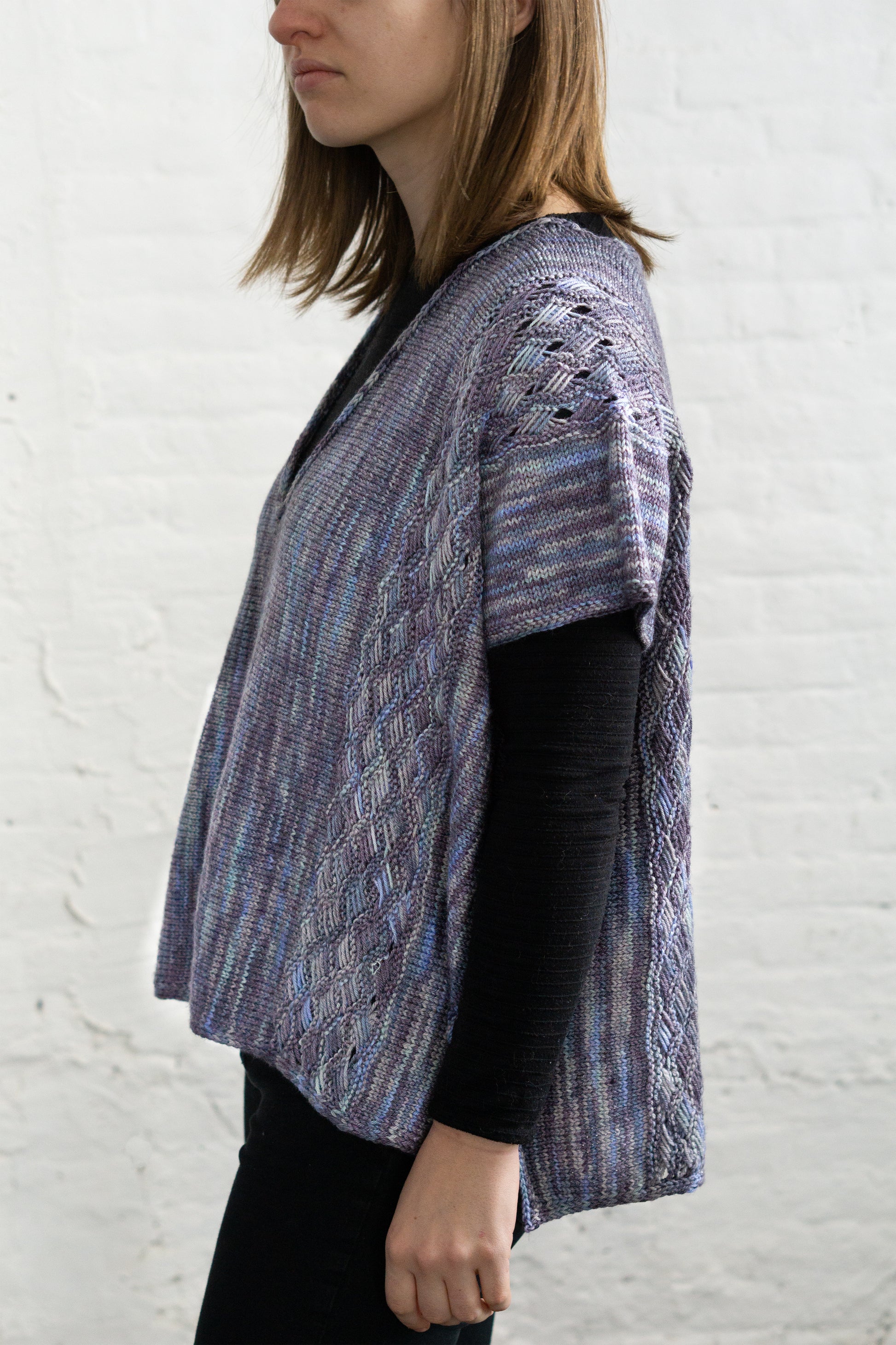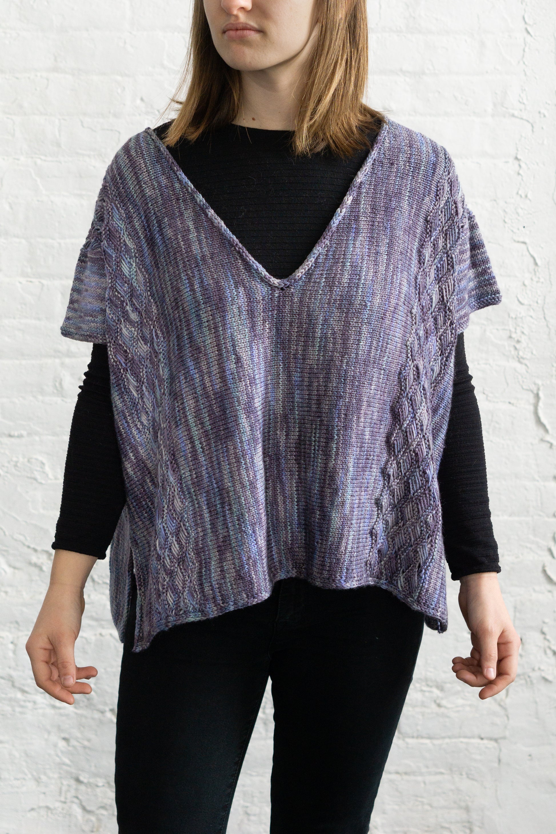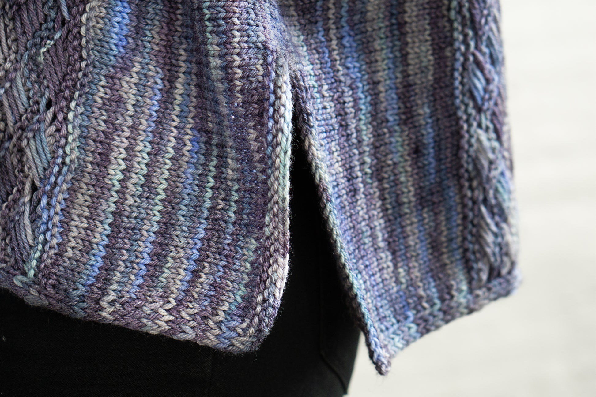 Yarn Requirements: Feliz, shown in Z9977 Provence (4 sk)