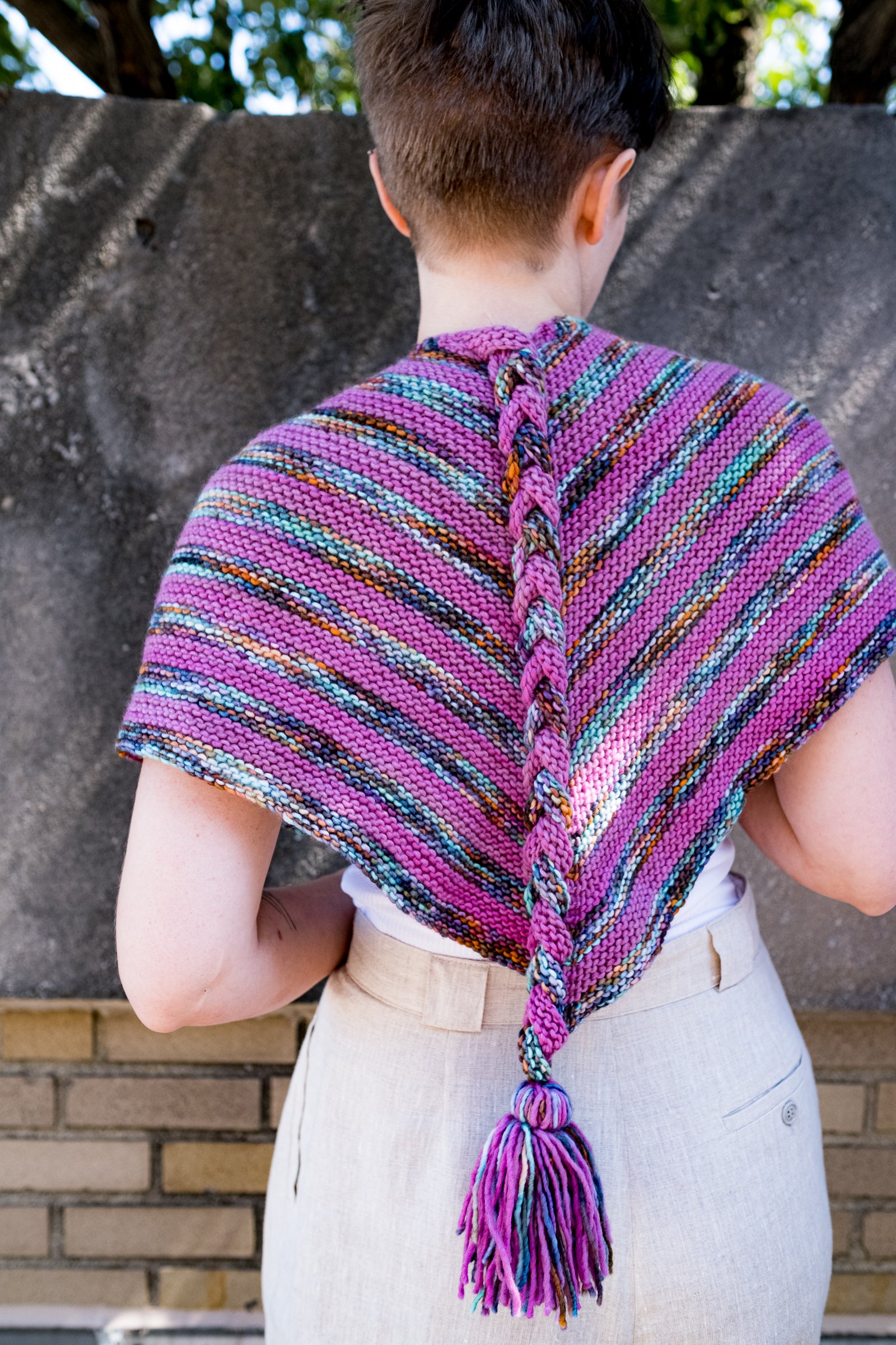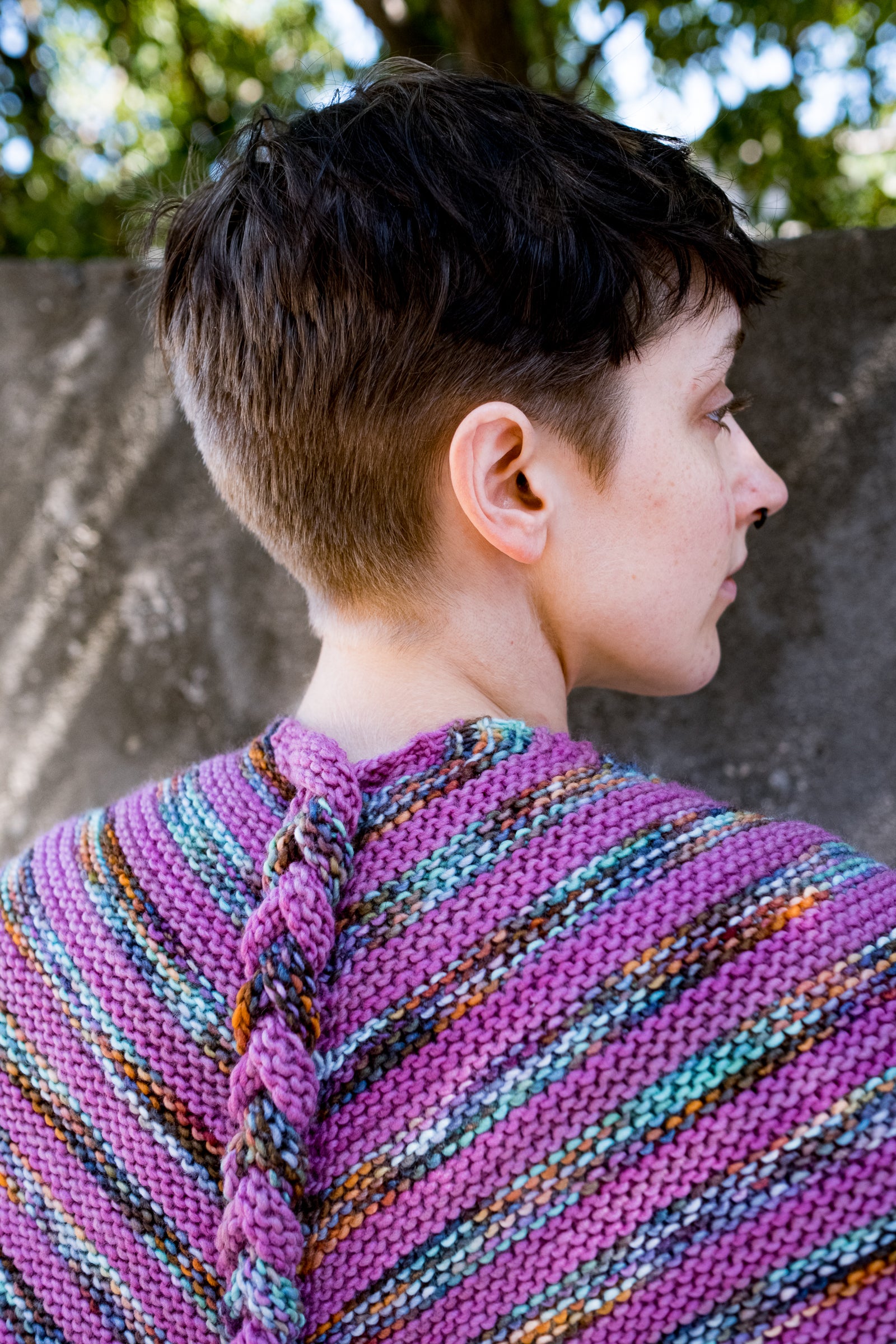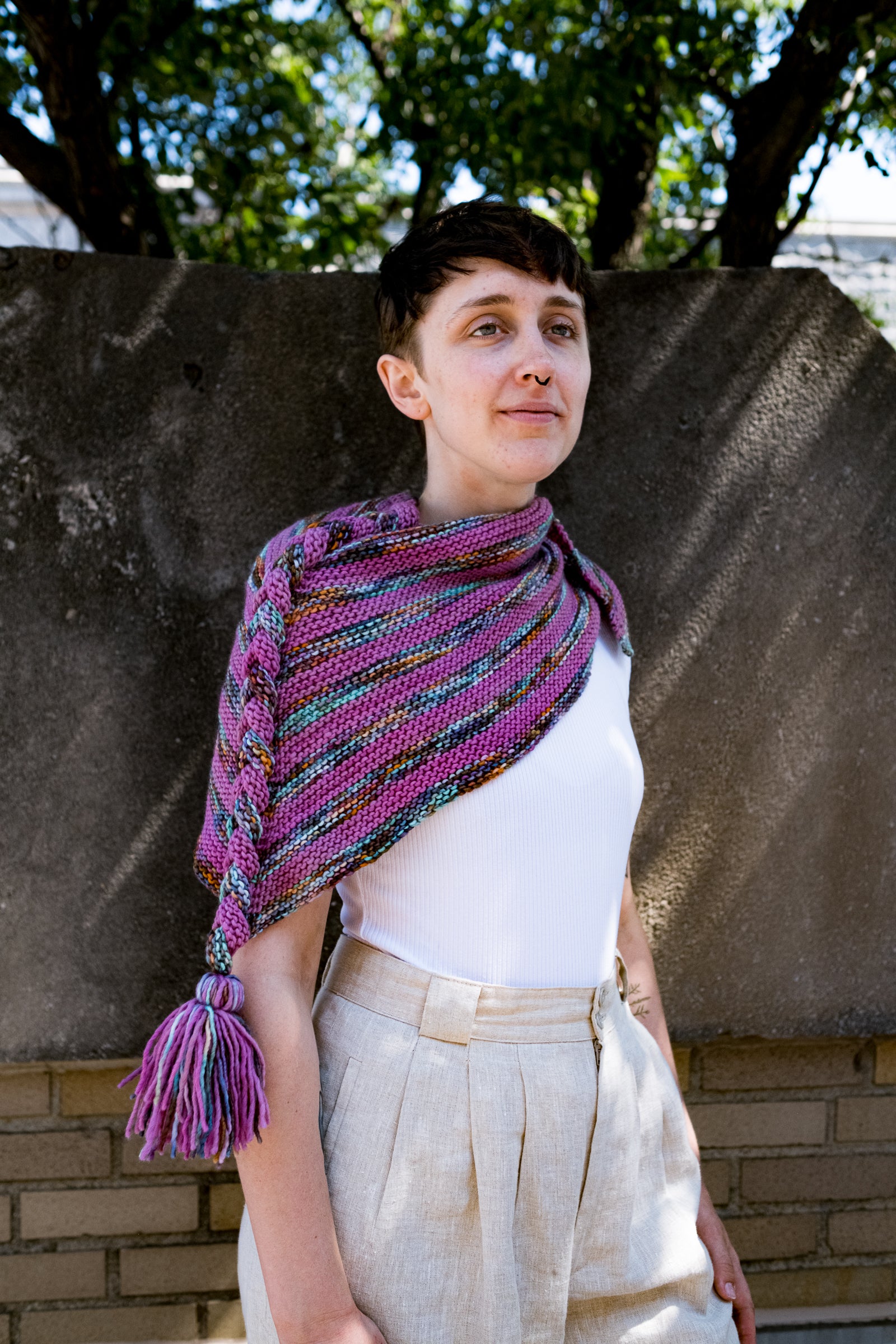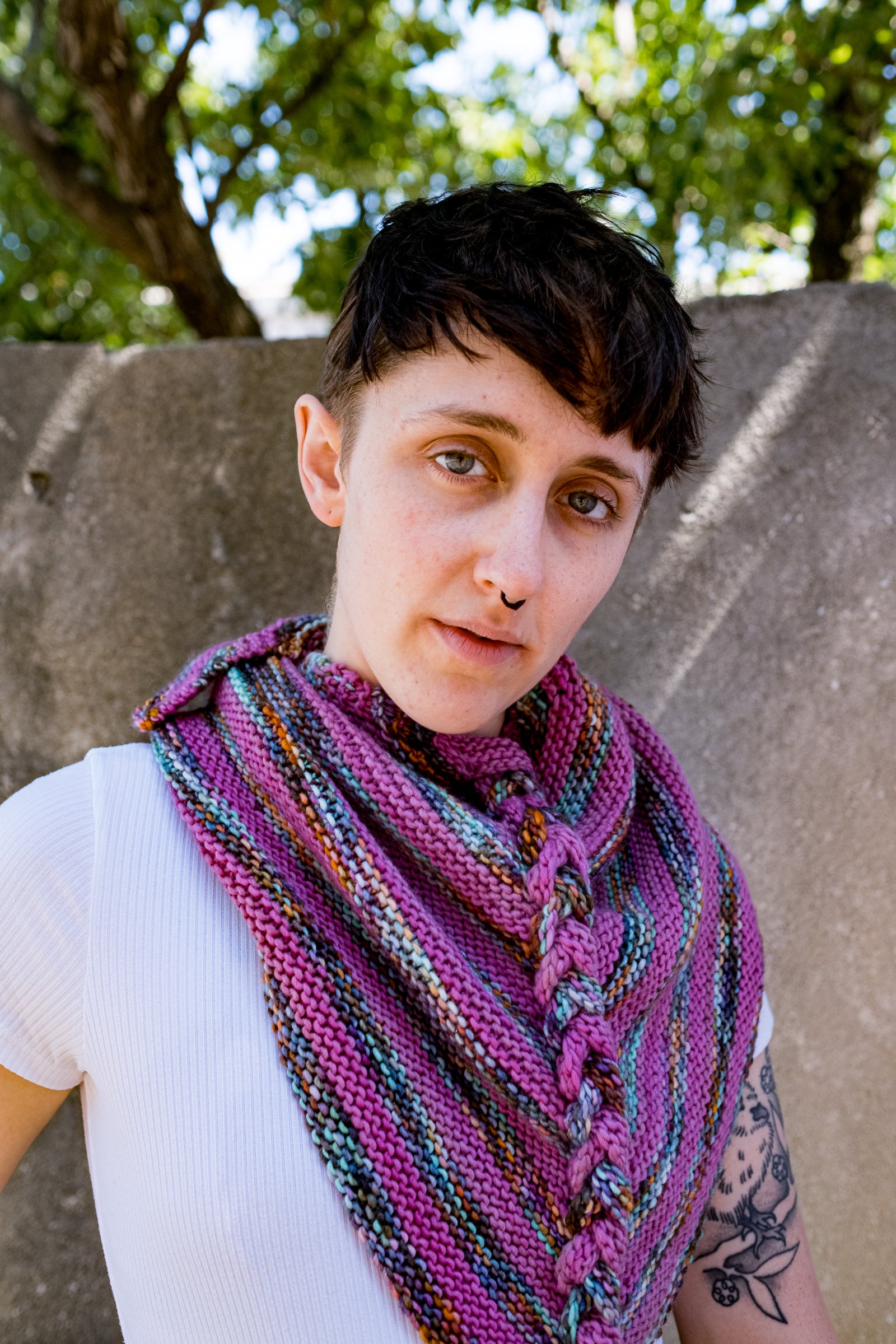Toast + Jam takes the simplest detail of knitted fabric - a single column of stitches - and scales it up to become the bold, dimensional "braid" down the center of the shawl!