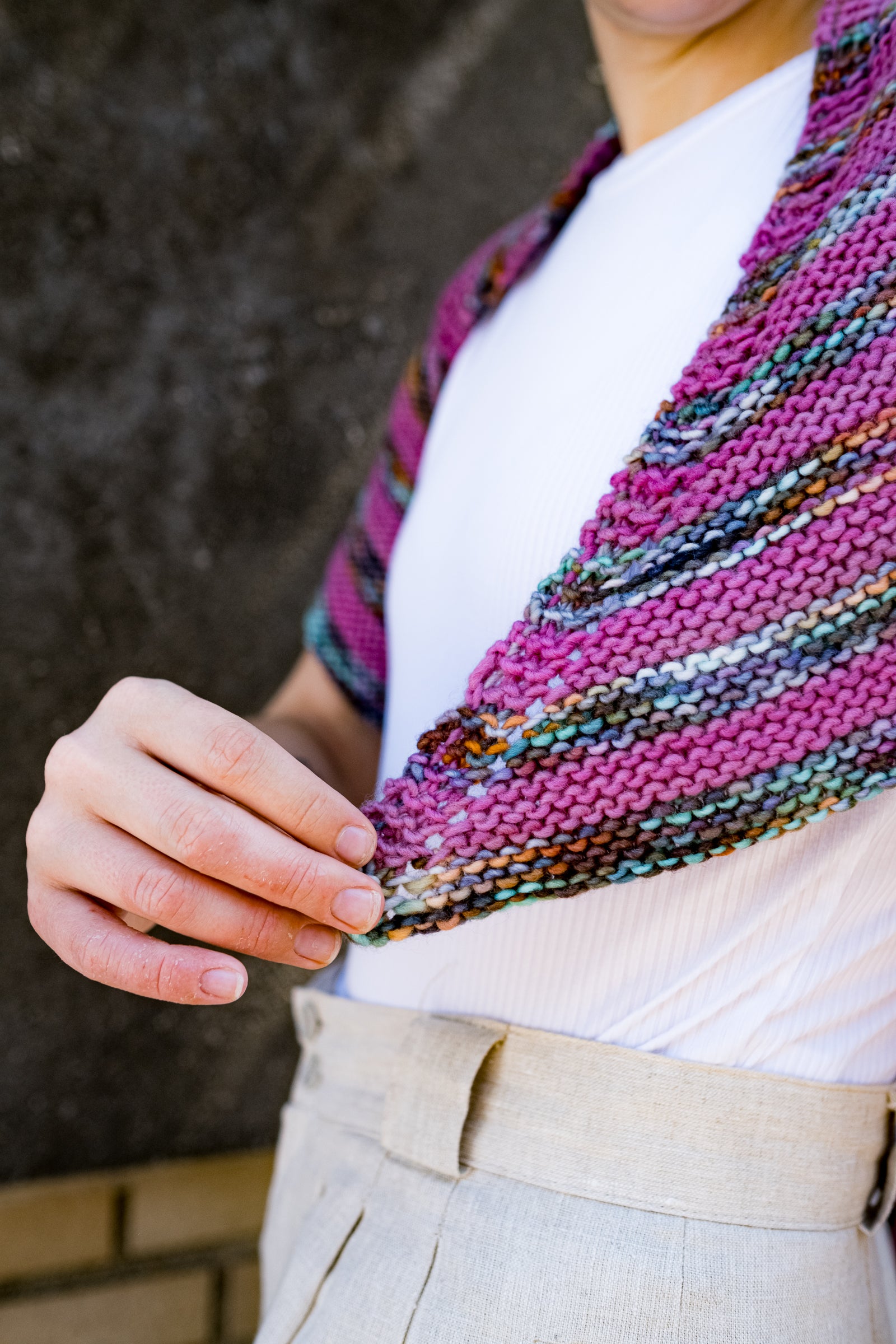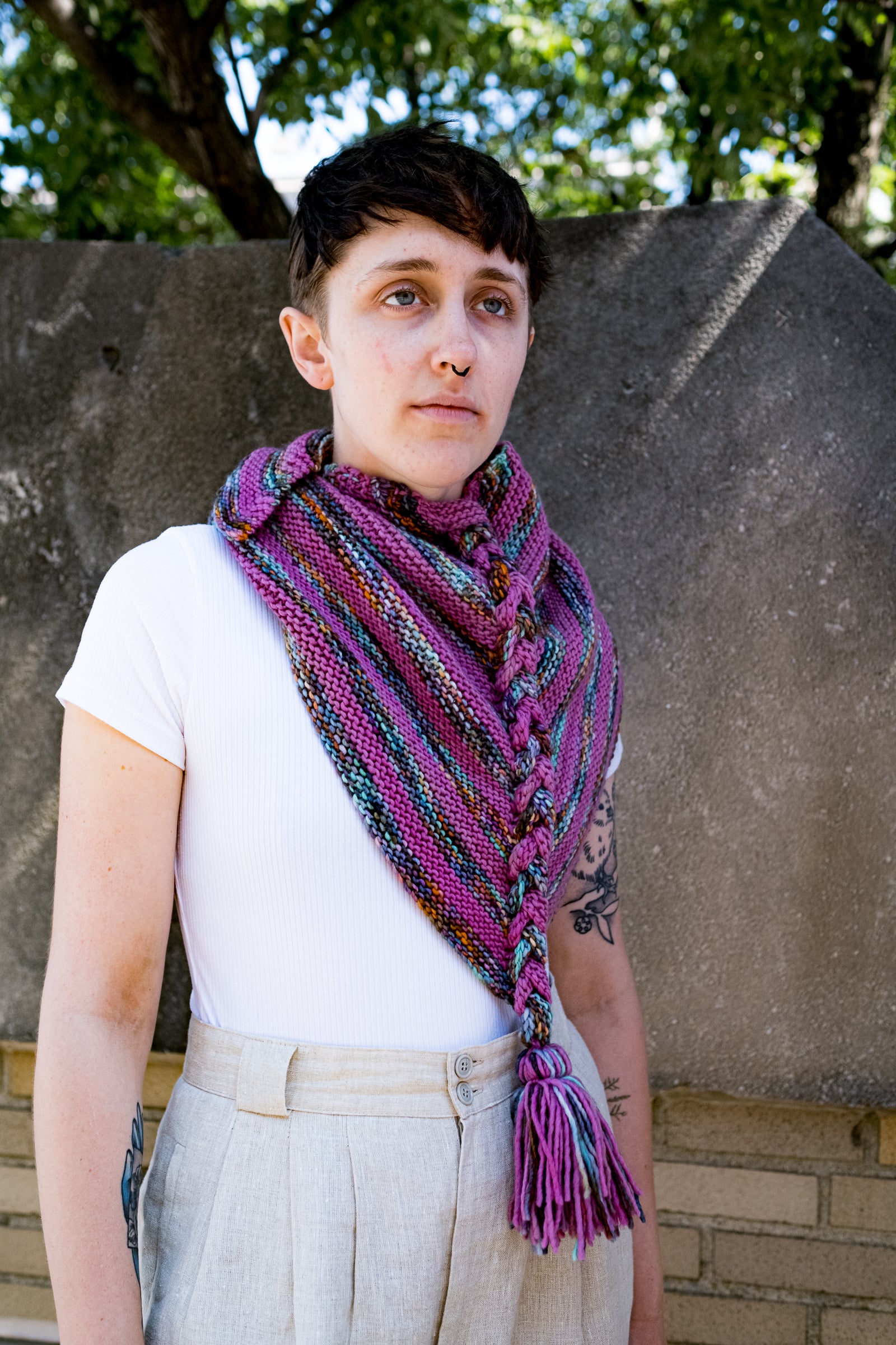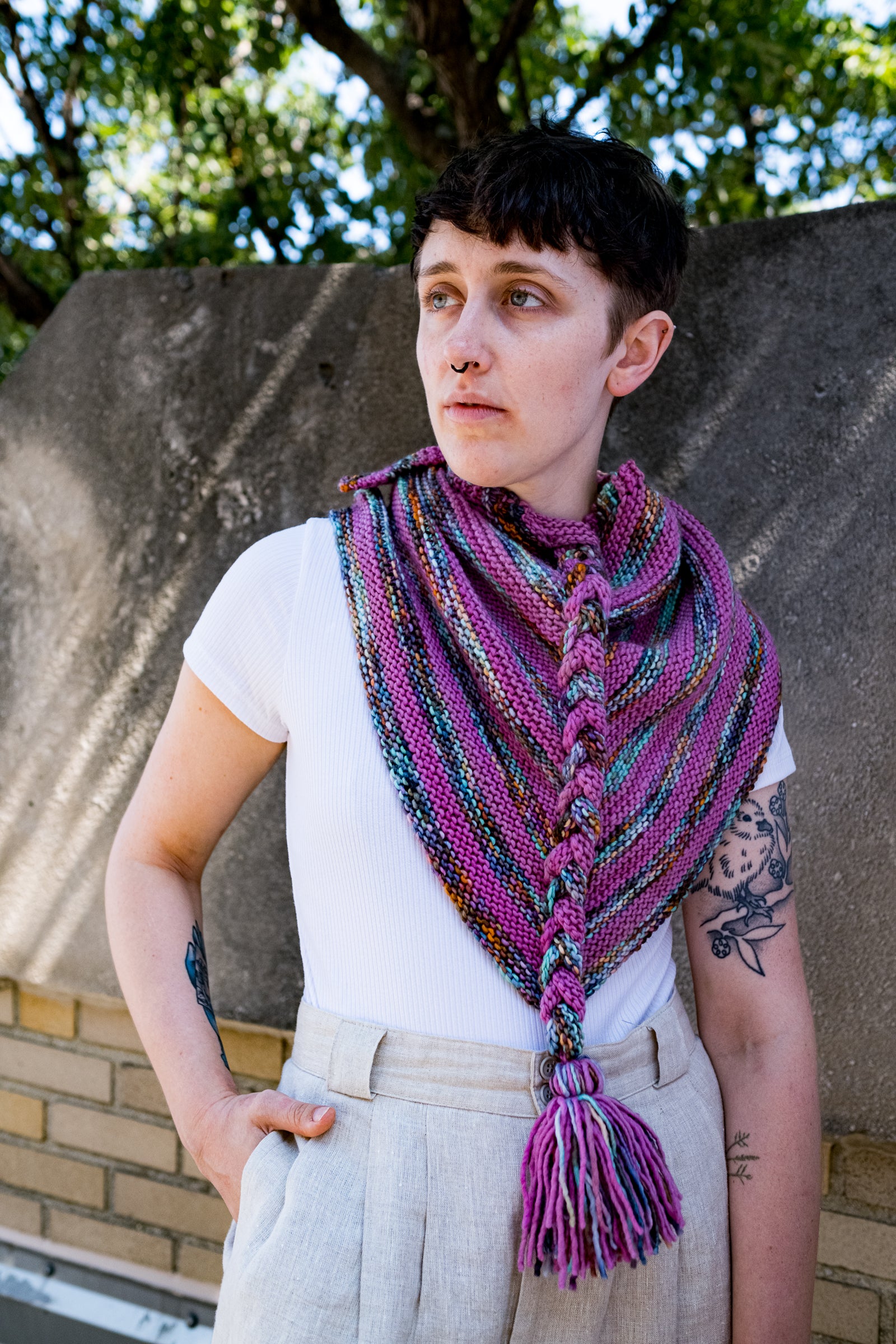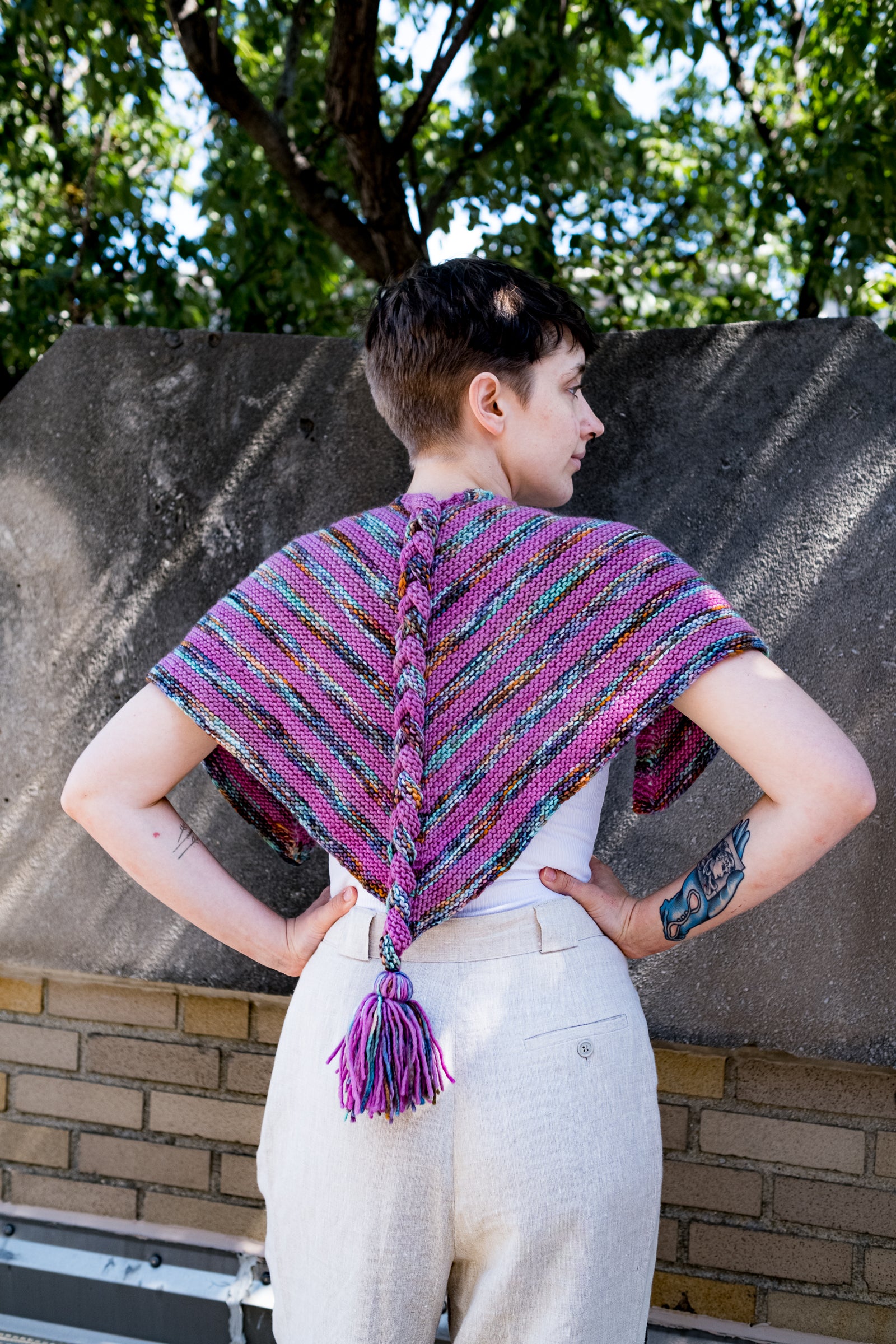 Toast + Jam takes the simplest detail of knitted fabric - a single column of stitches - and scales it up to become the bold, dimensional "braid" down the center of the shawl!