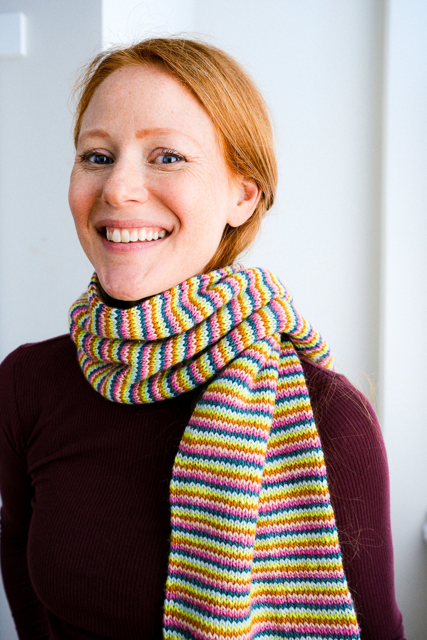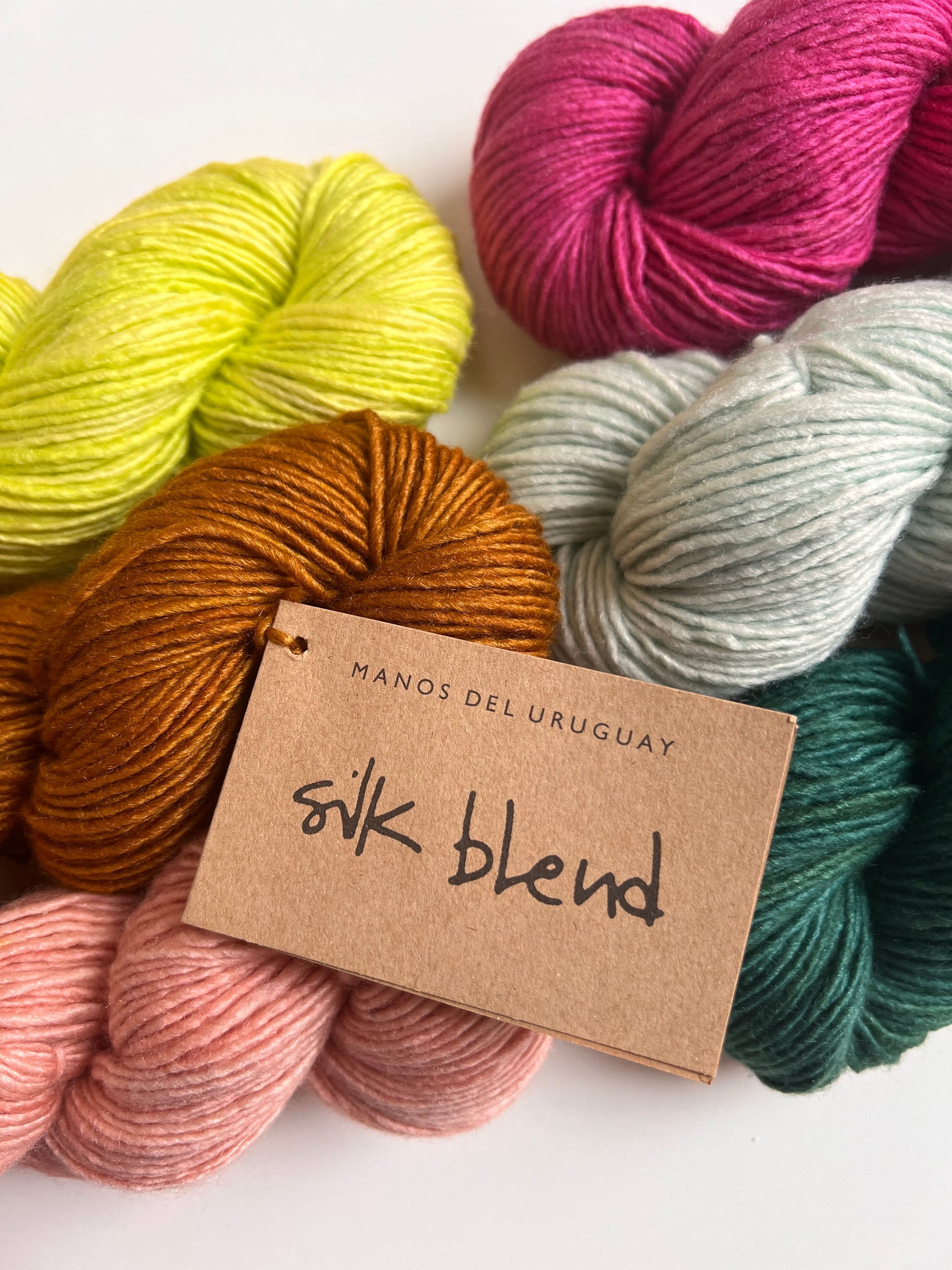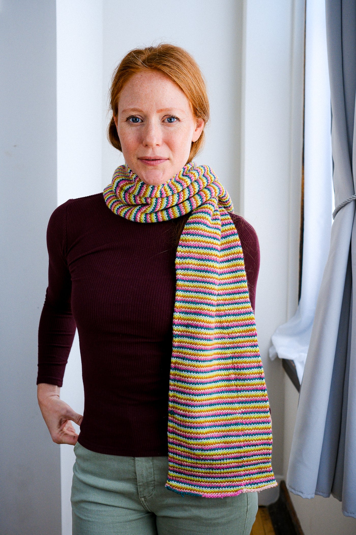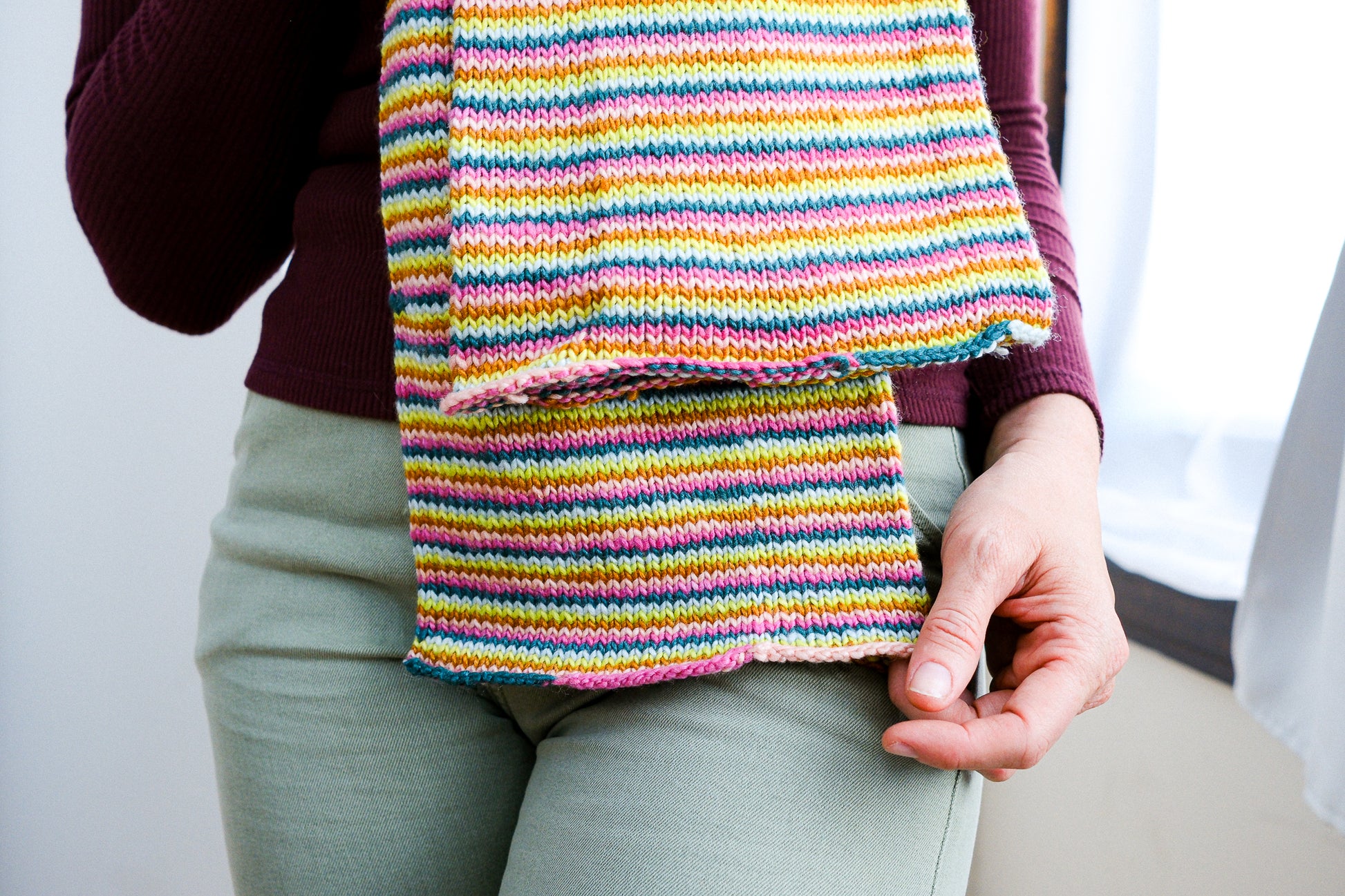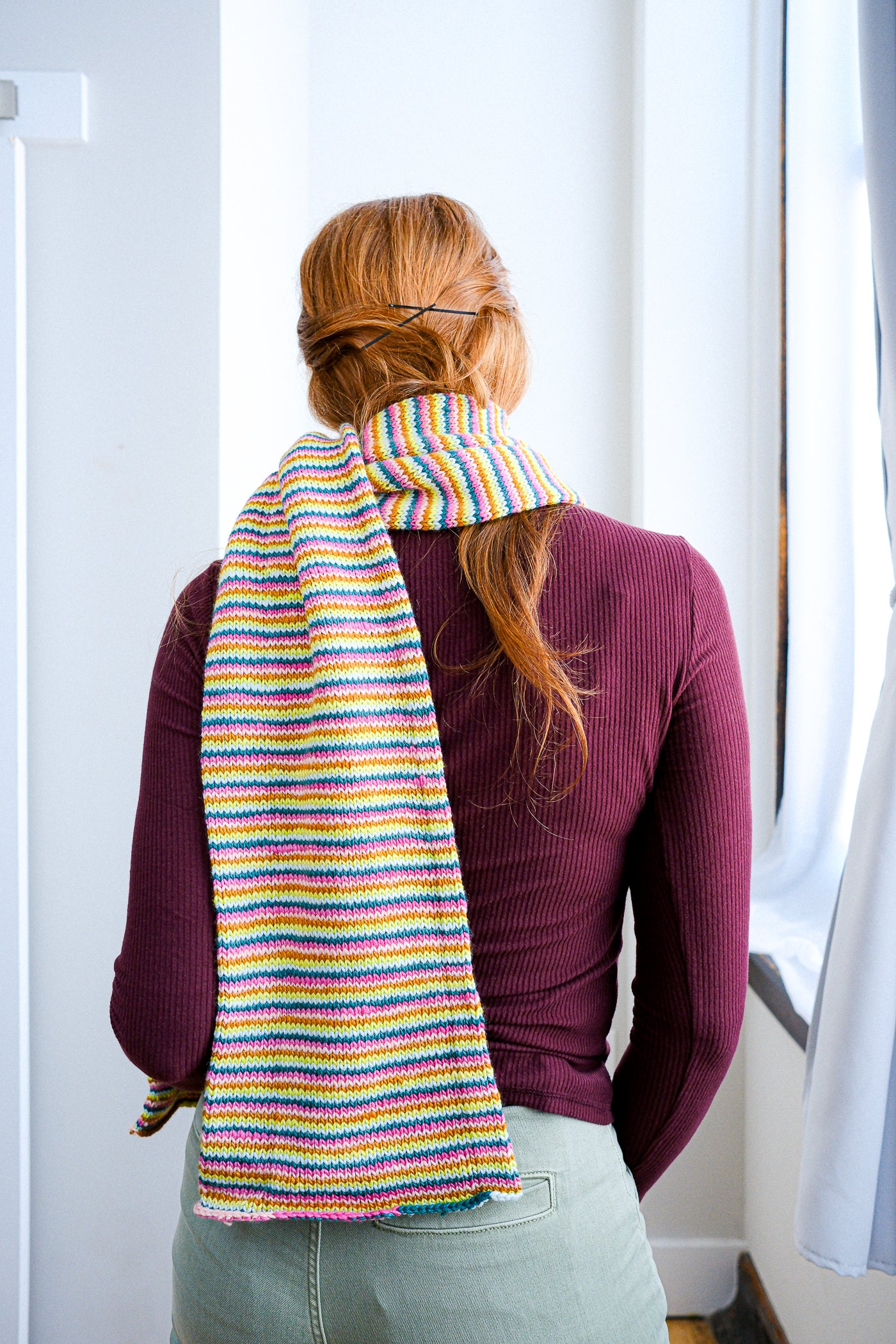 Six colors of Silk Blend come together in a spiral knit scarf - alternate dropping and picking up colors as you knit in the round to create a tubular scarf with one-row stripes!
