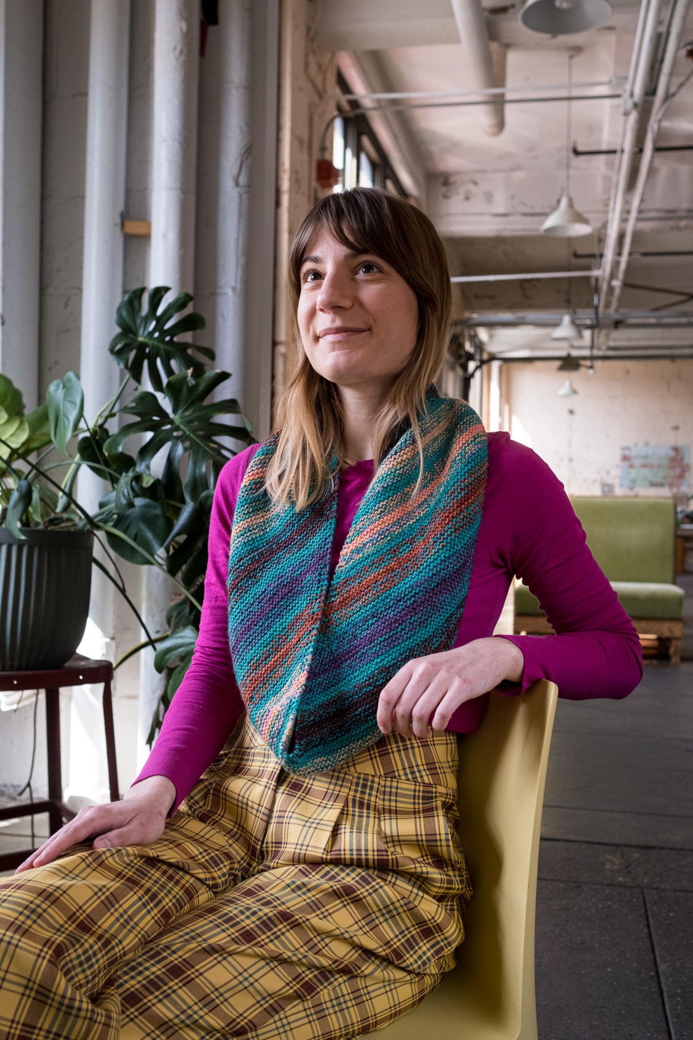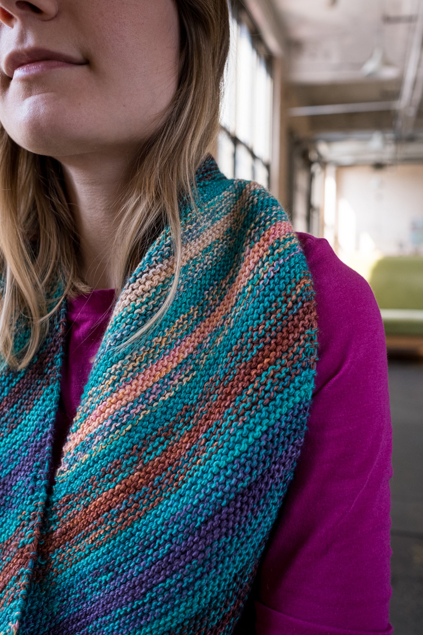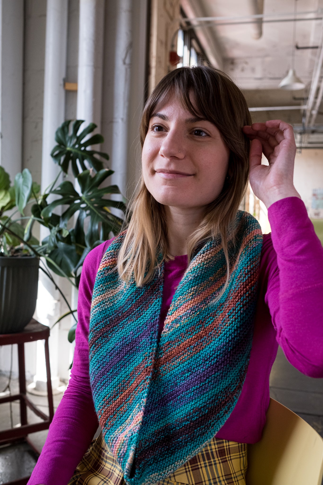 The Zelda Cowl takes marled stripes up a notch with a simple bias structure. The stripe sequence plays marled stripes against solid ones for a salt-and-pepper contrast.