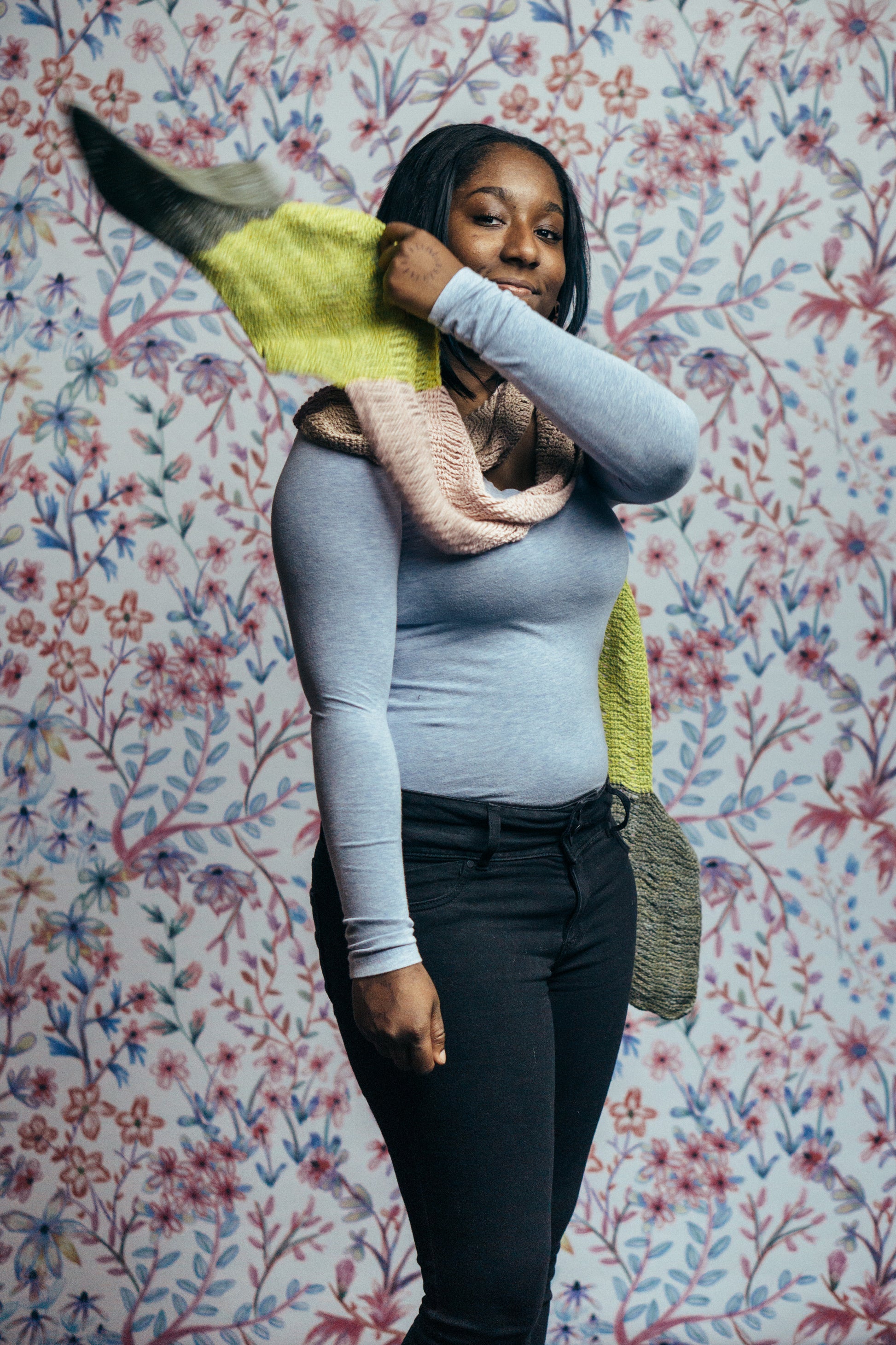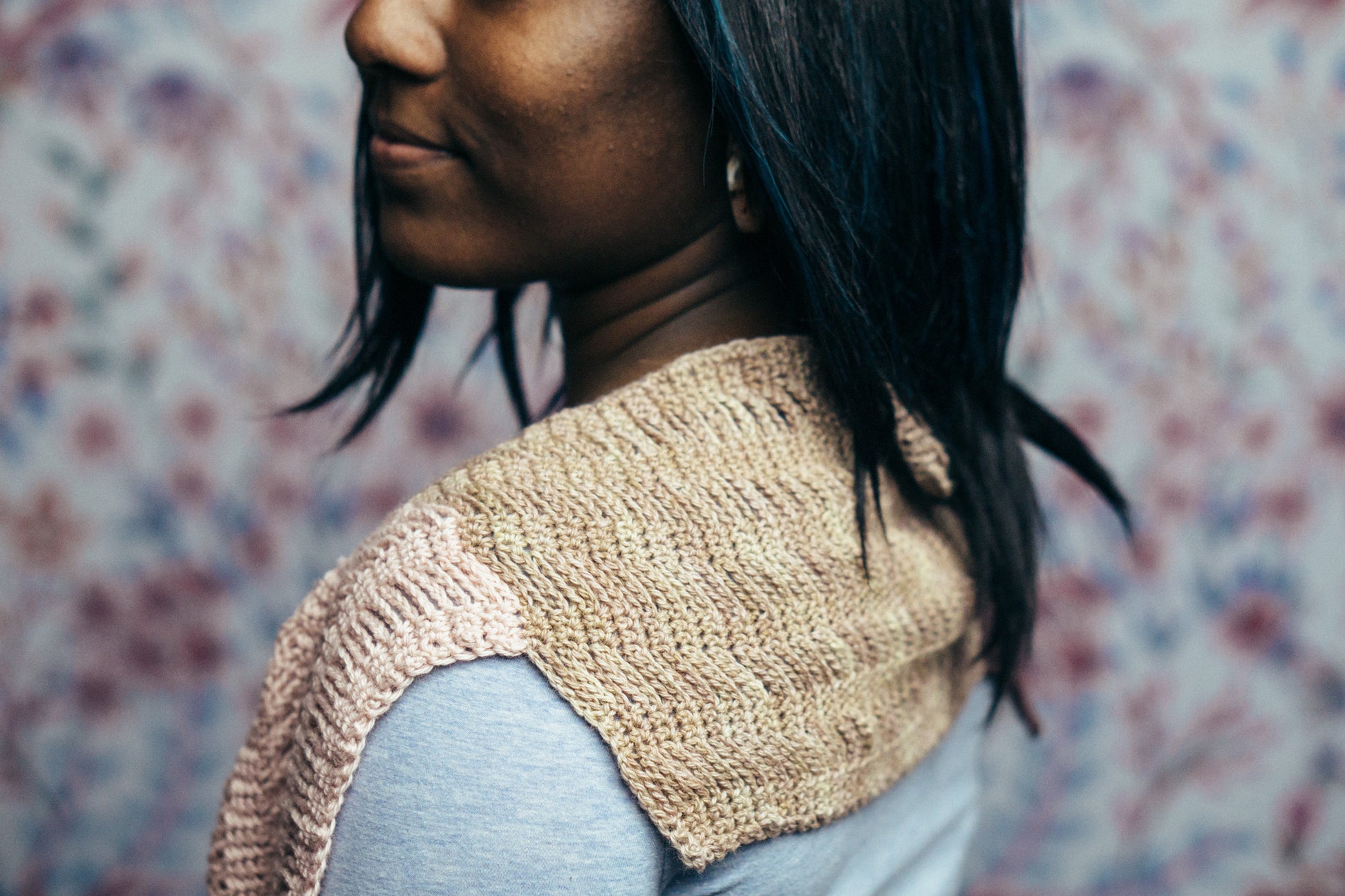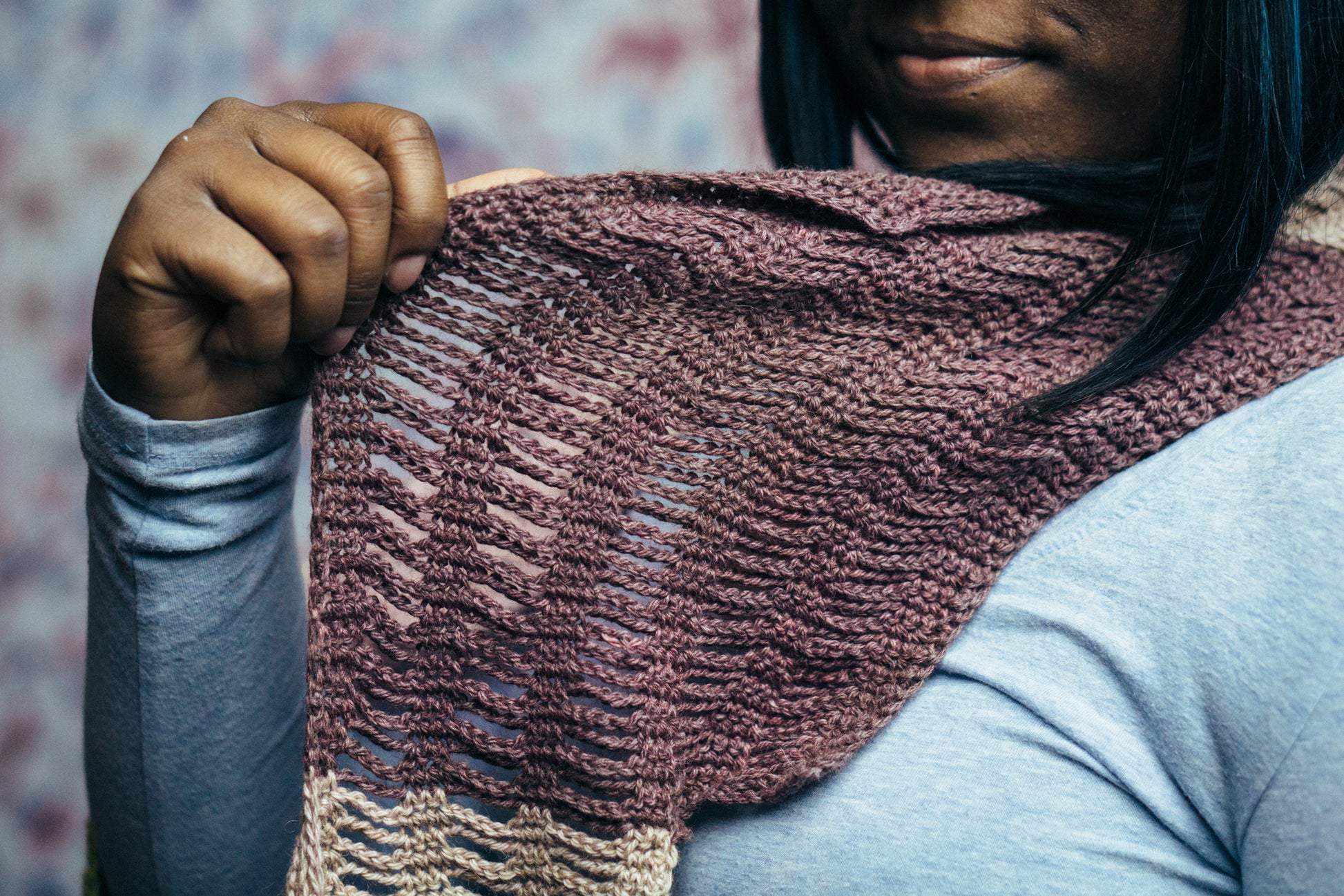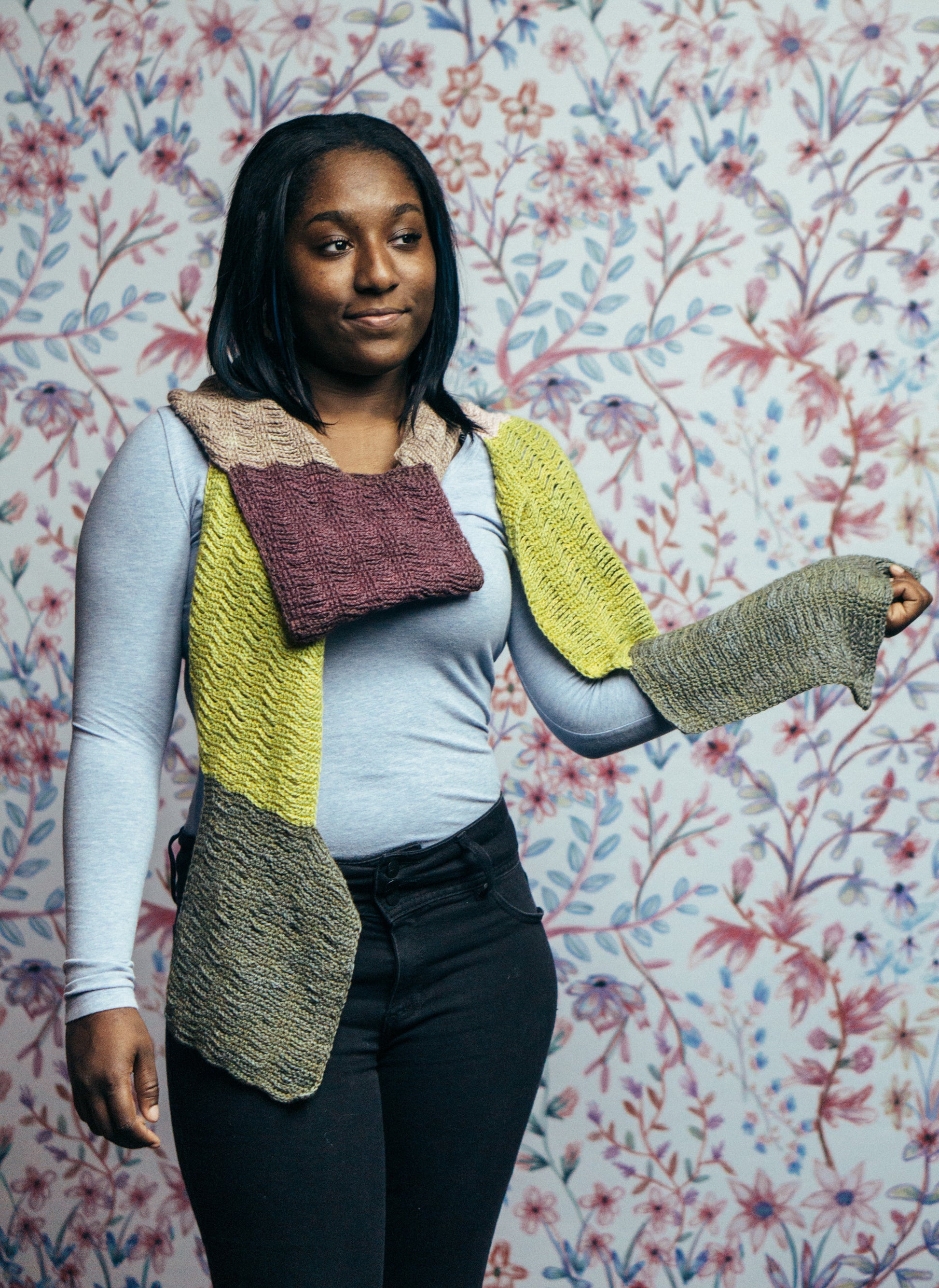 Ahora is a colorful wrap, worked in strands of chain stitch anchored by bars of single crochet to show off Serena’s airiness and drape. 5 colors connected give this scarf a playful way to work with your favorite Springtime hues.