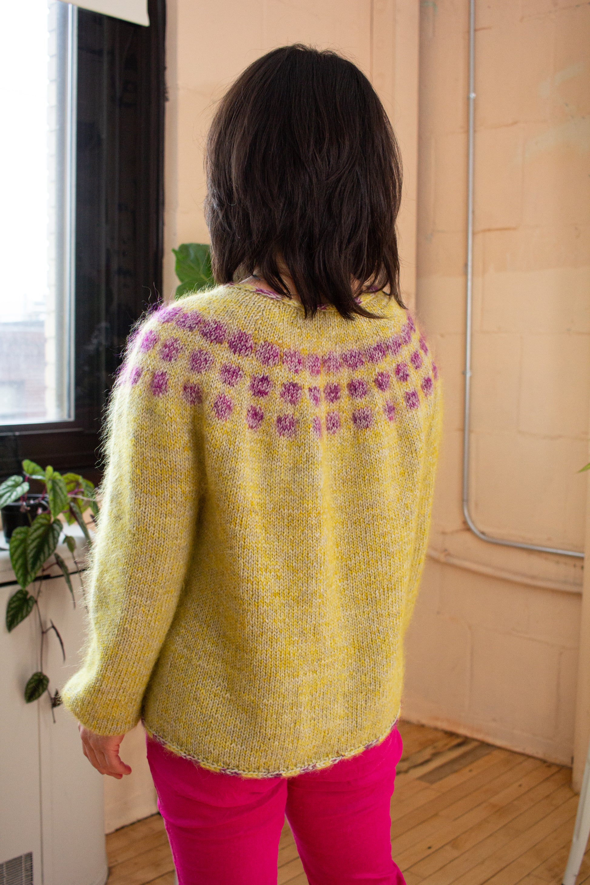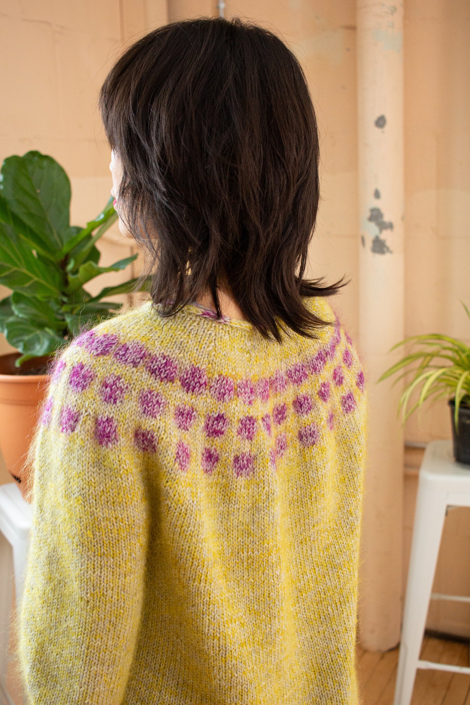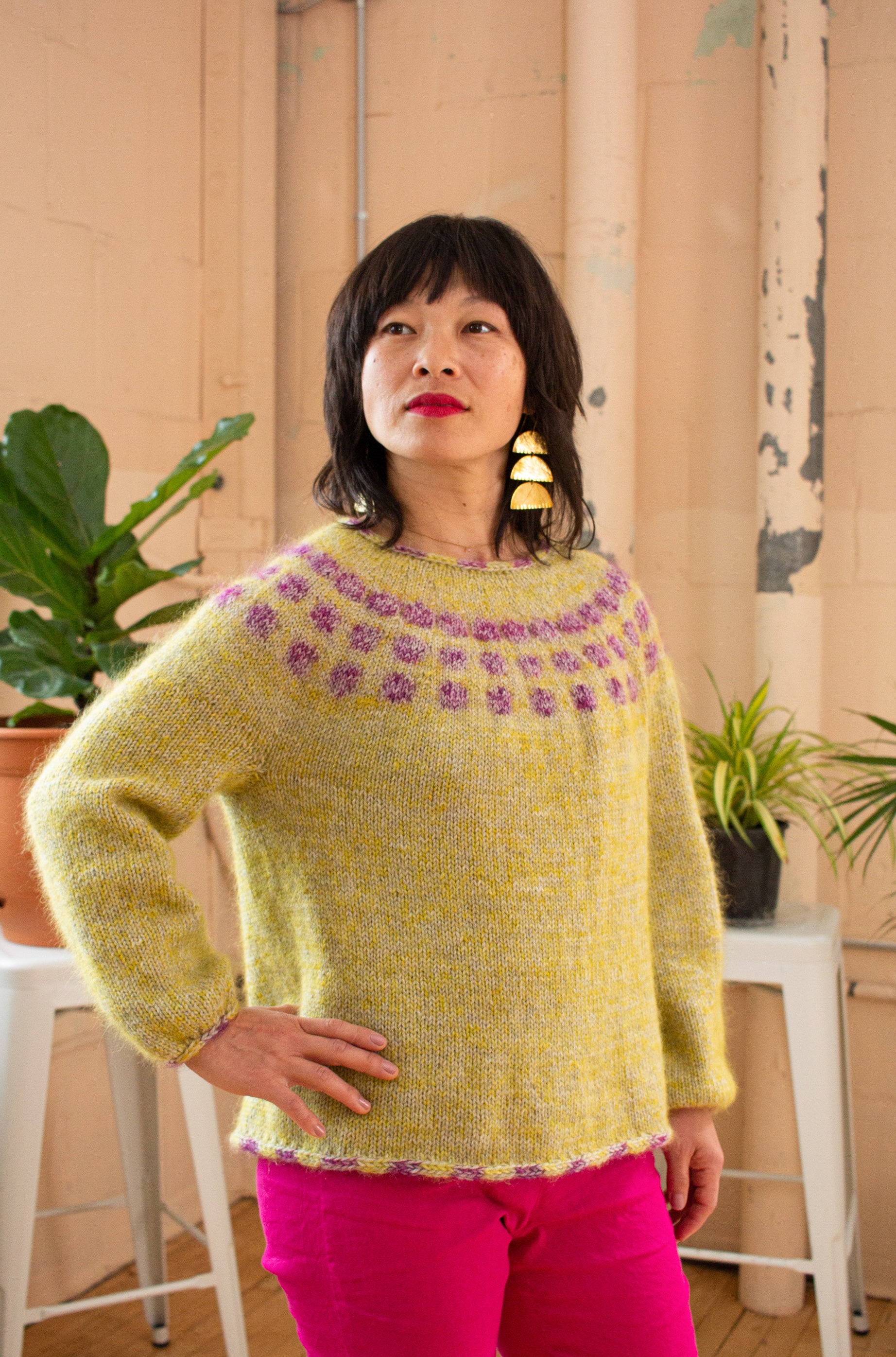 This simple yoke sweater has fun with marling - a technique where two yarns are held together to create a new color. In this case, natural grey Alpaca Heather is held alternatively with two different colors of mohair laceweight Cabrito, giving almost a watercolour effect.