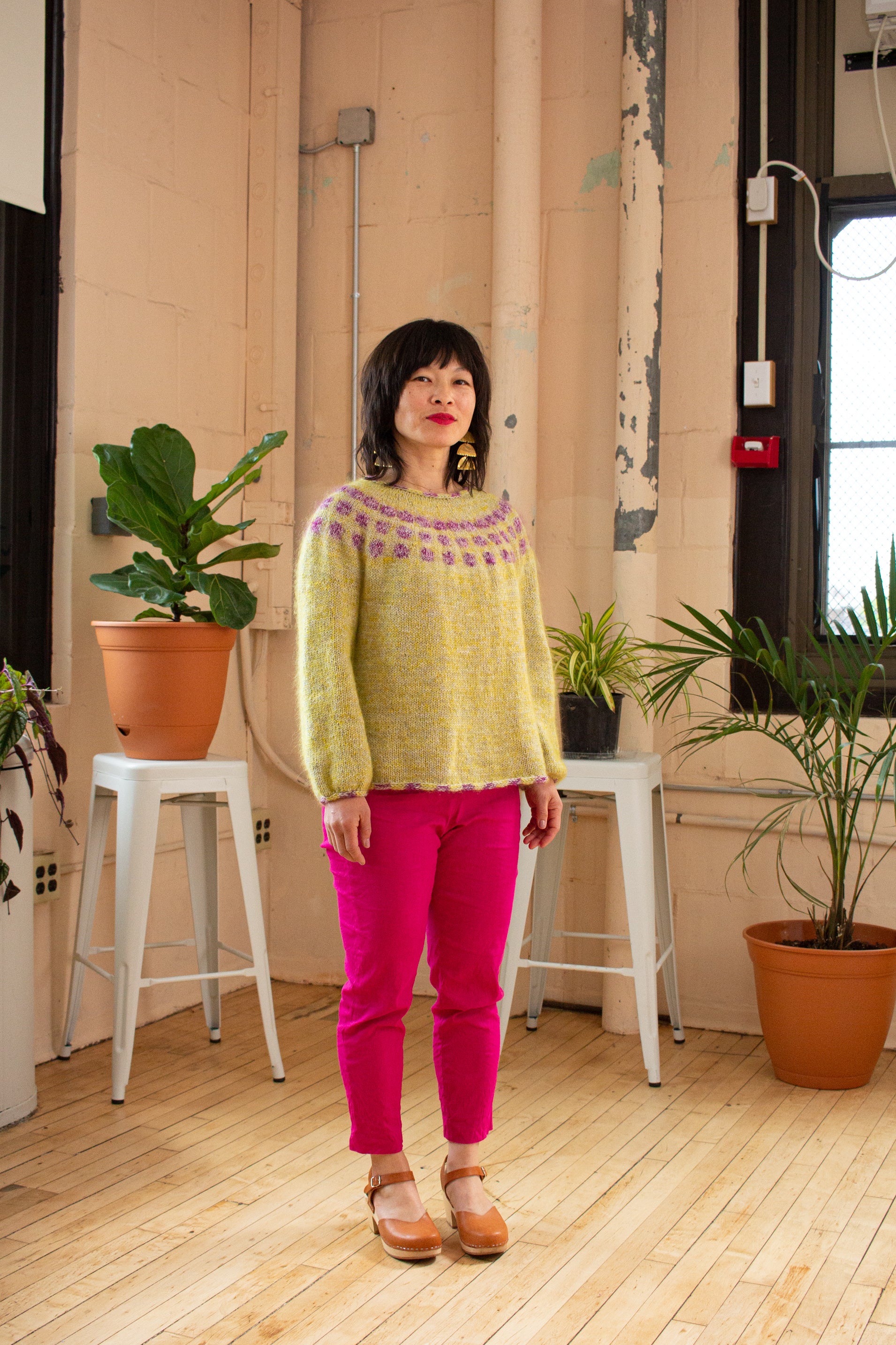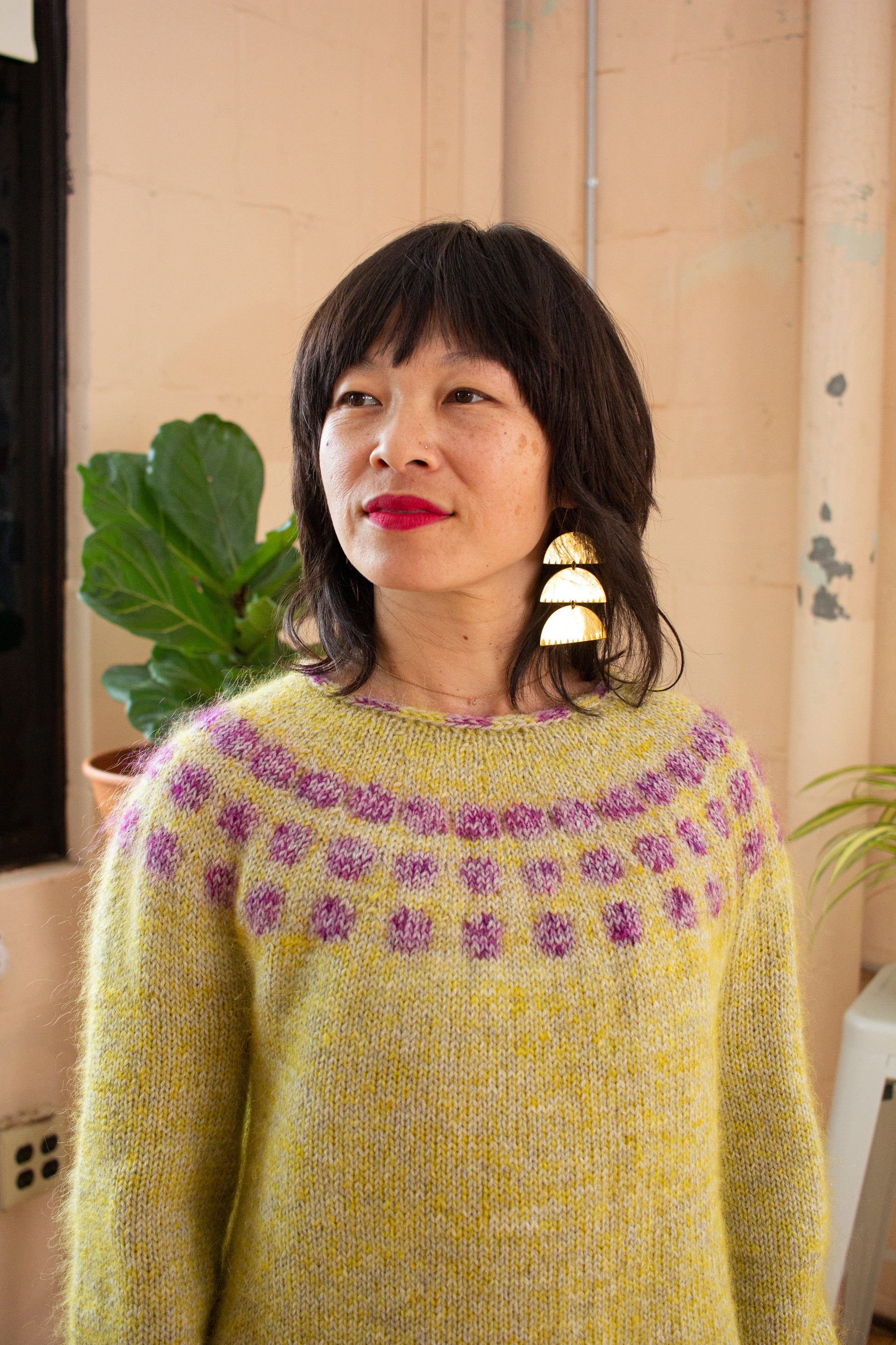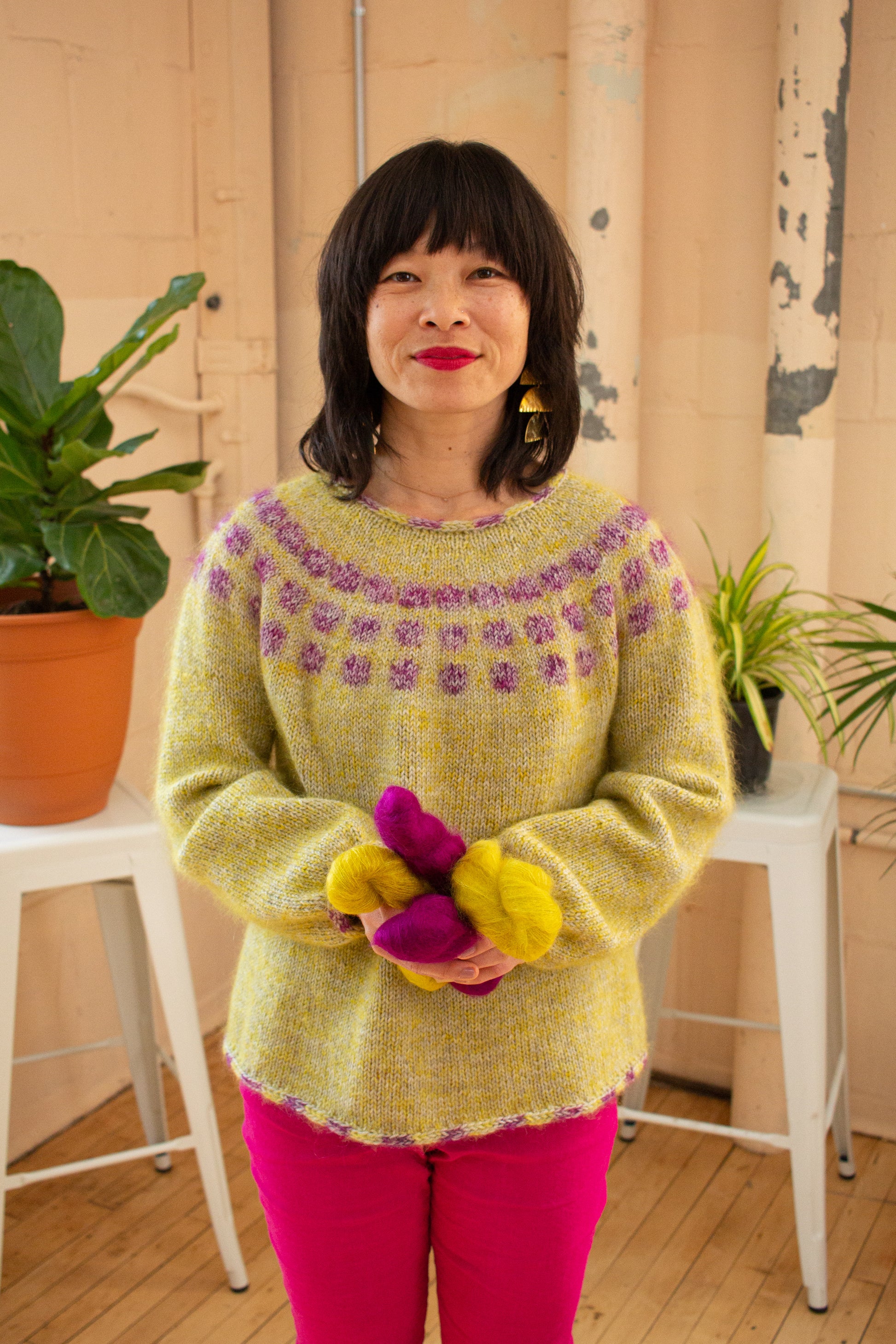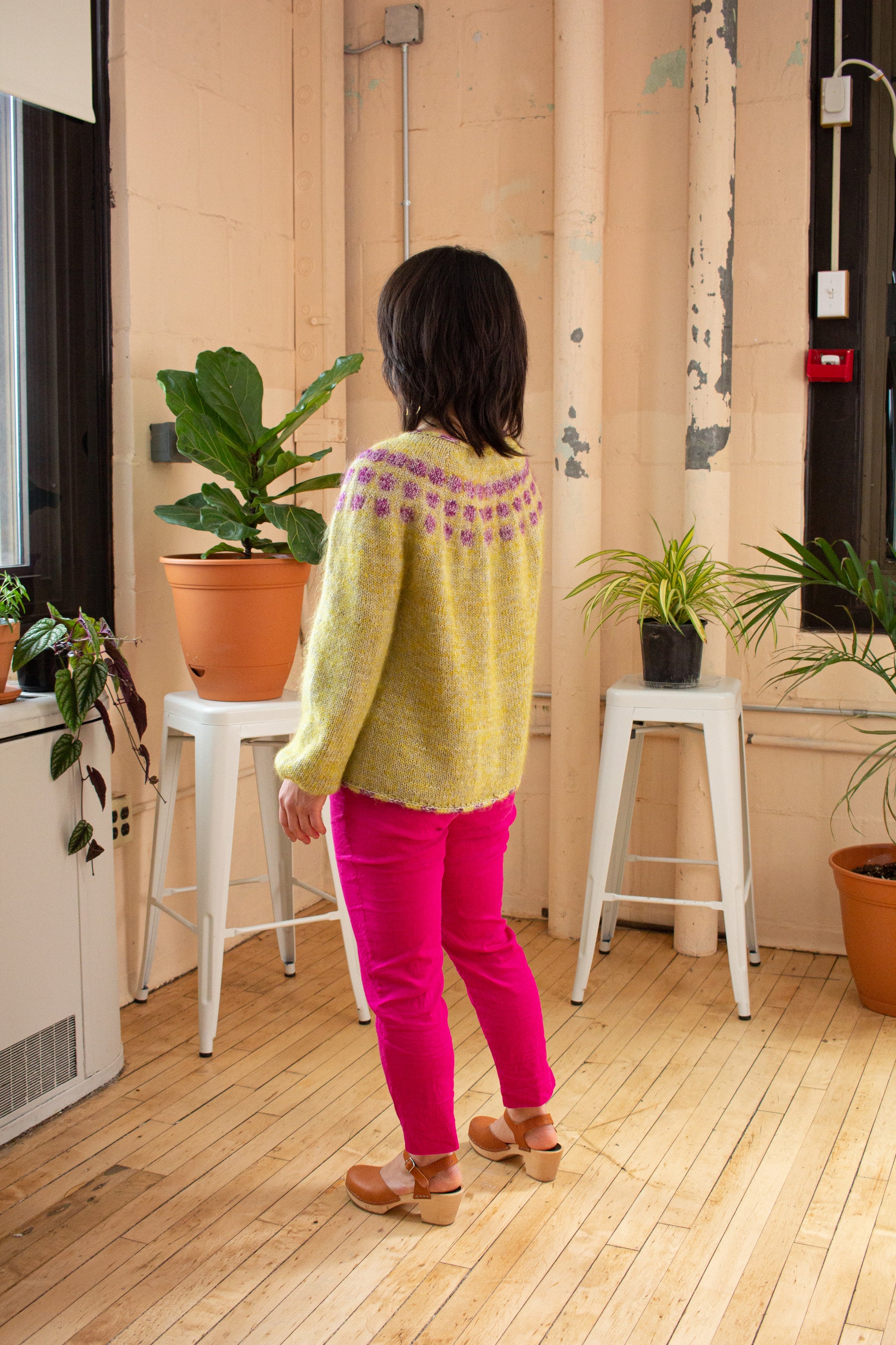 This simple yoke sweater has fun with marling - a technique where two yarns are held together to create a new color. In this case, natural grey Alpaca Heather is held alternatively with two different colors of mohair laceweight Cabrito, giving almost a watercolour effect.