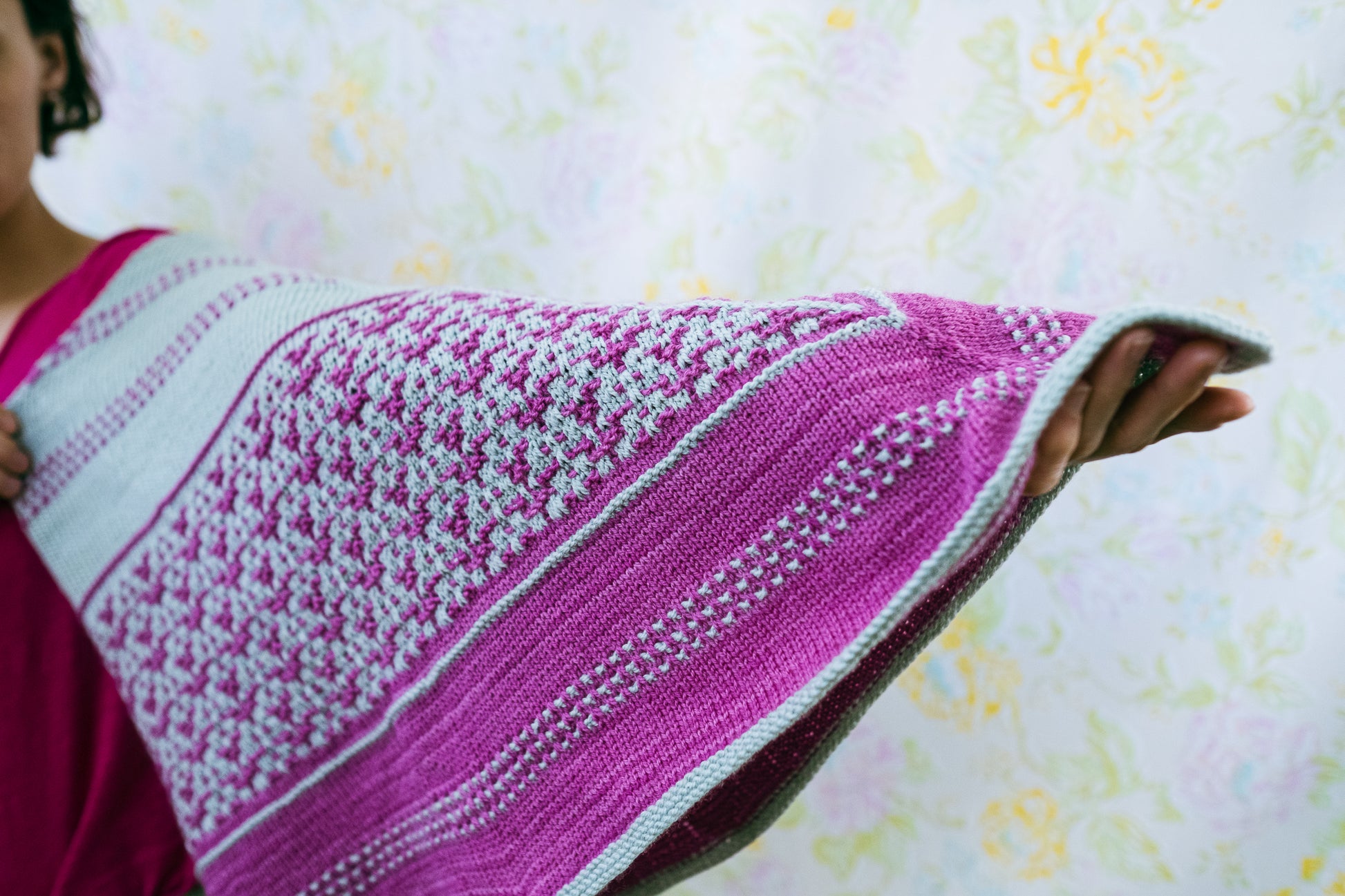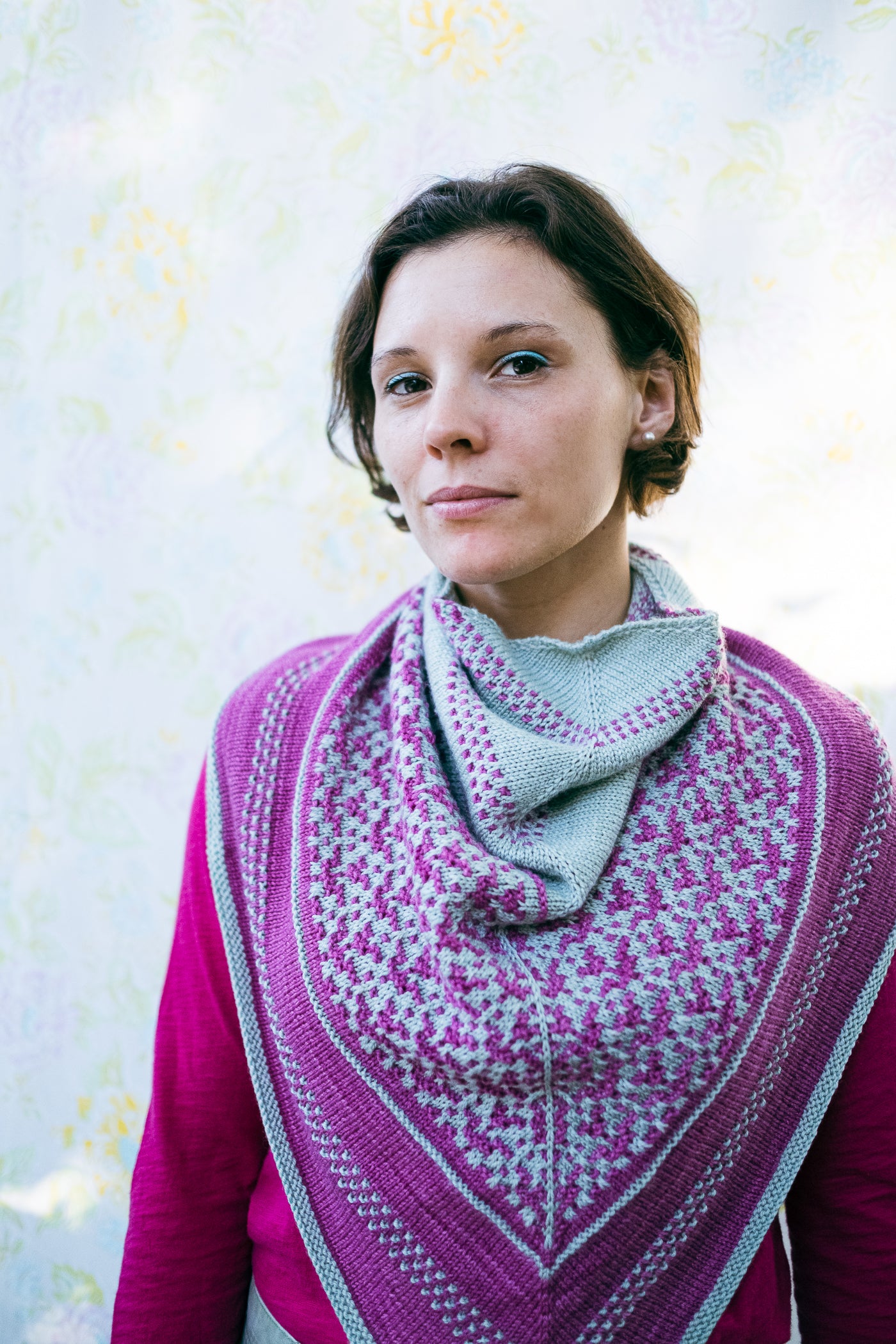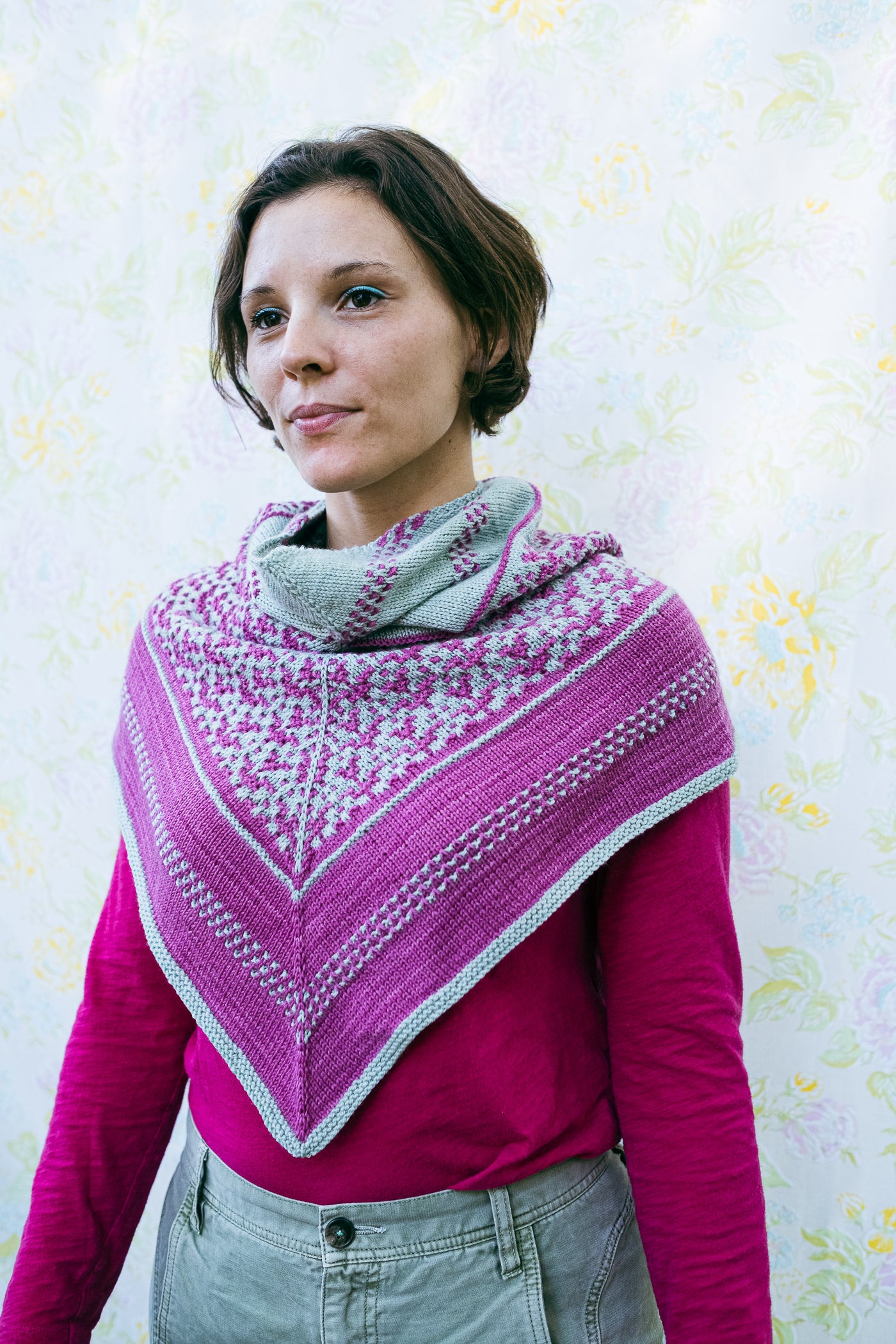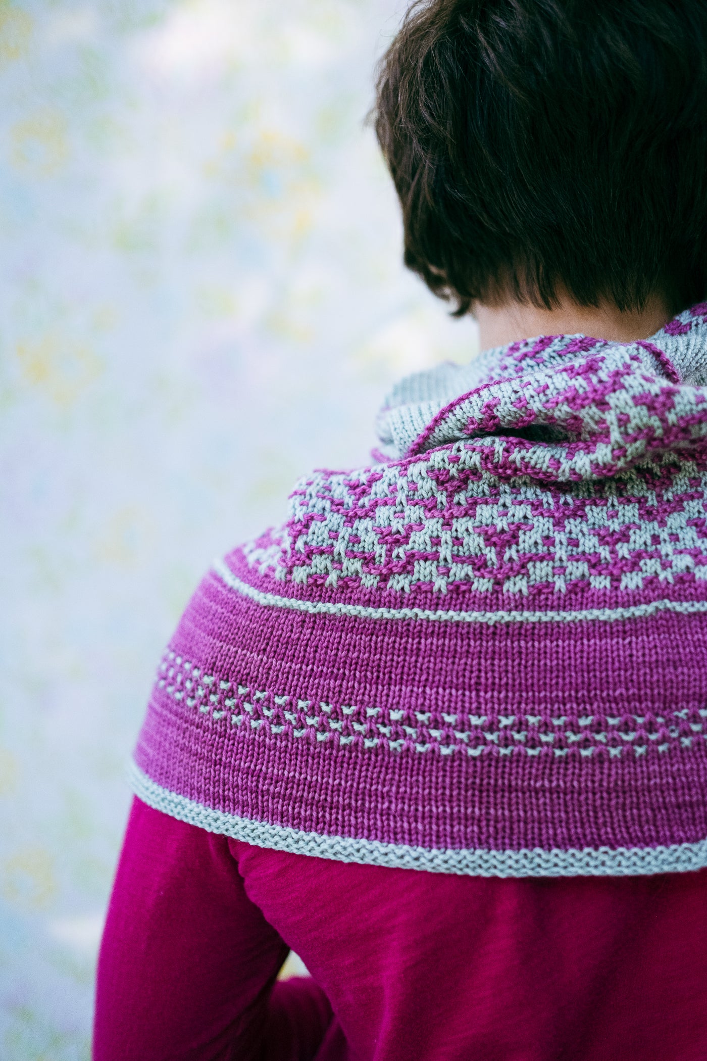This cowl begins with a garter tab cast-on and is worked in rows of stockinette and slipped-stitch pattern with increases at each end of the row and on each side of the center stitch. Once it has reached the correct neck circumference, the piece is joined in the round and worked down to the lower edge.