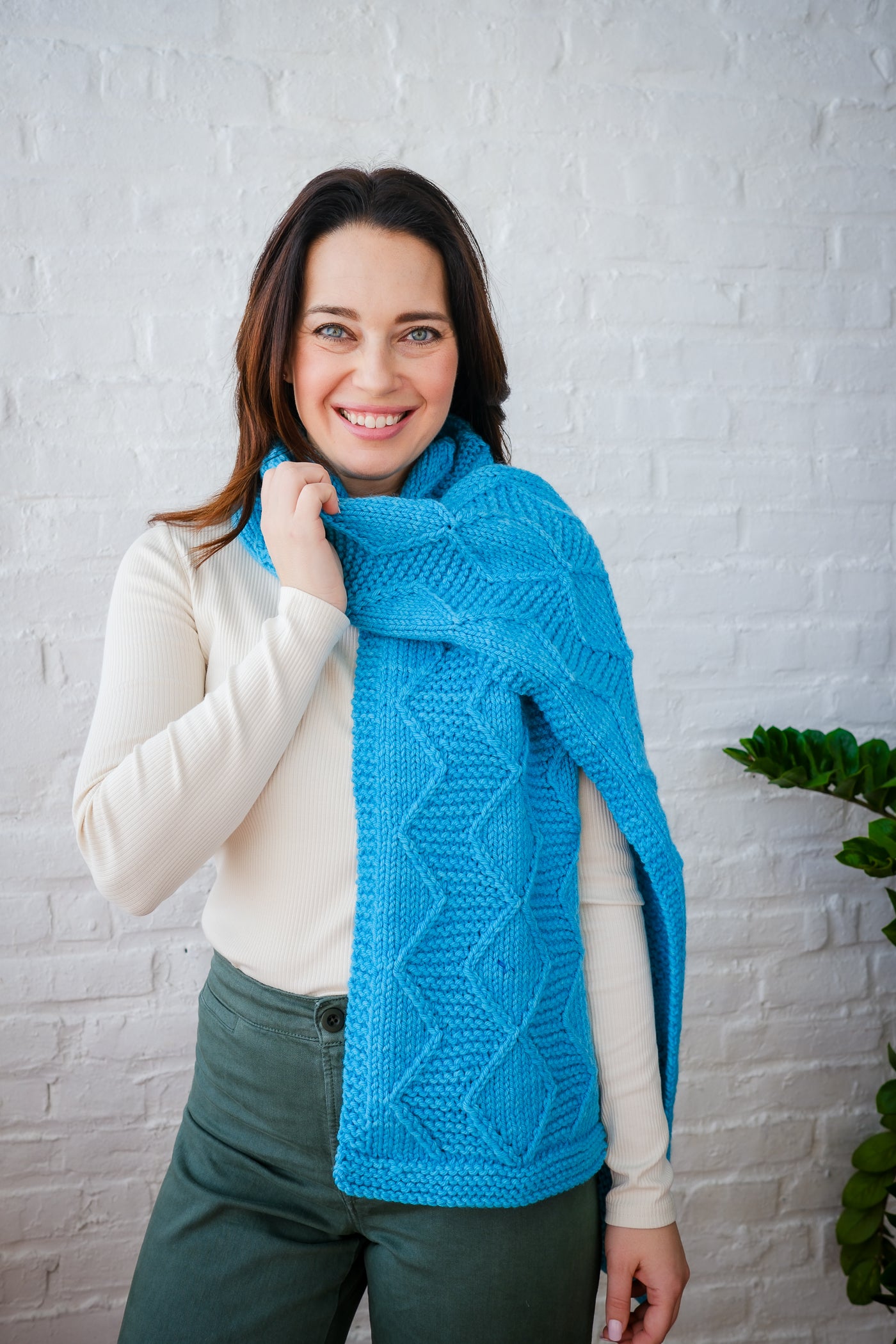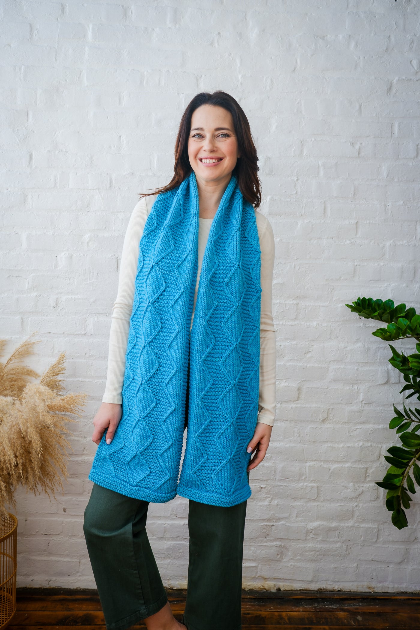 Enjoy working the rhythmic cable pattern highlights in all-gender design. Grab your new, cozy scarf in our bulky Cardo all season long!