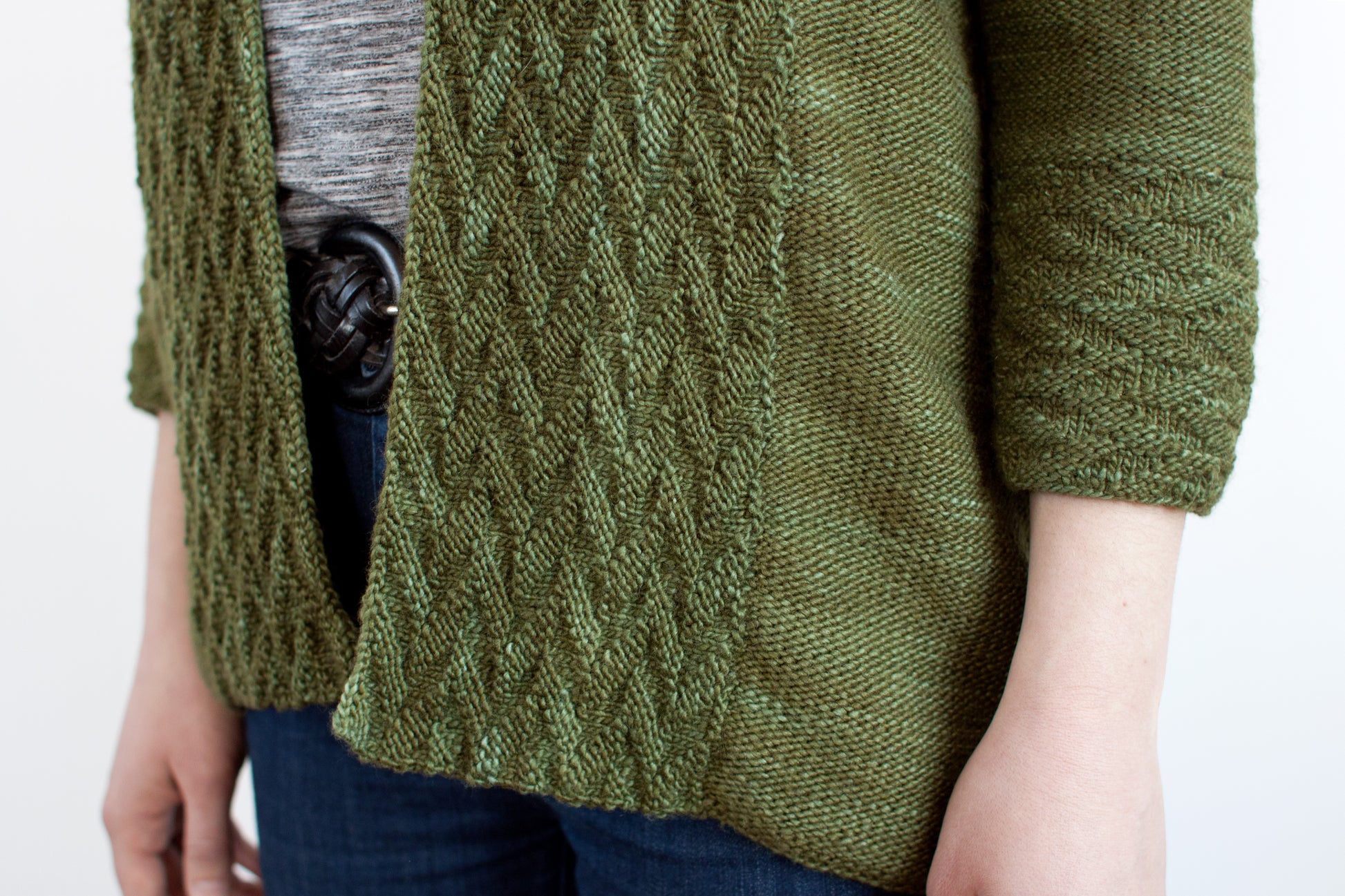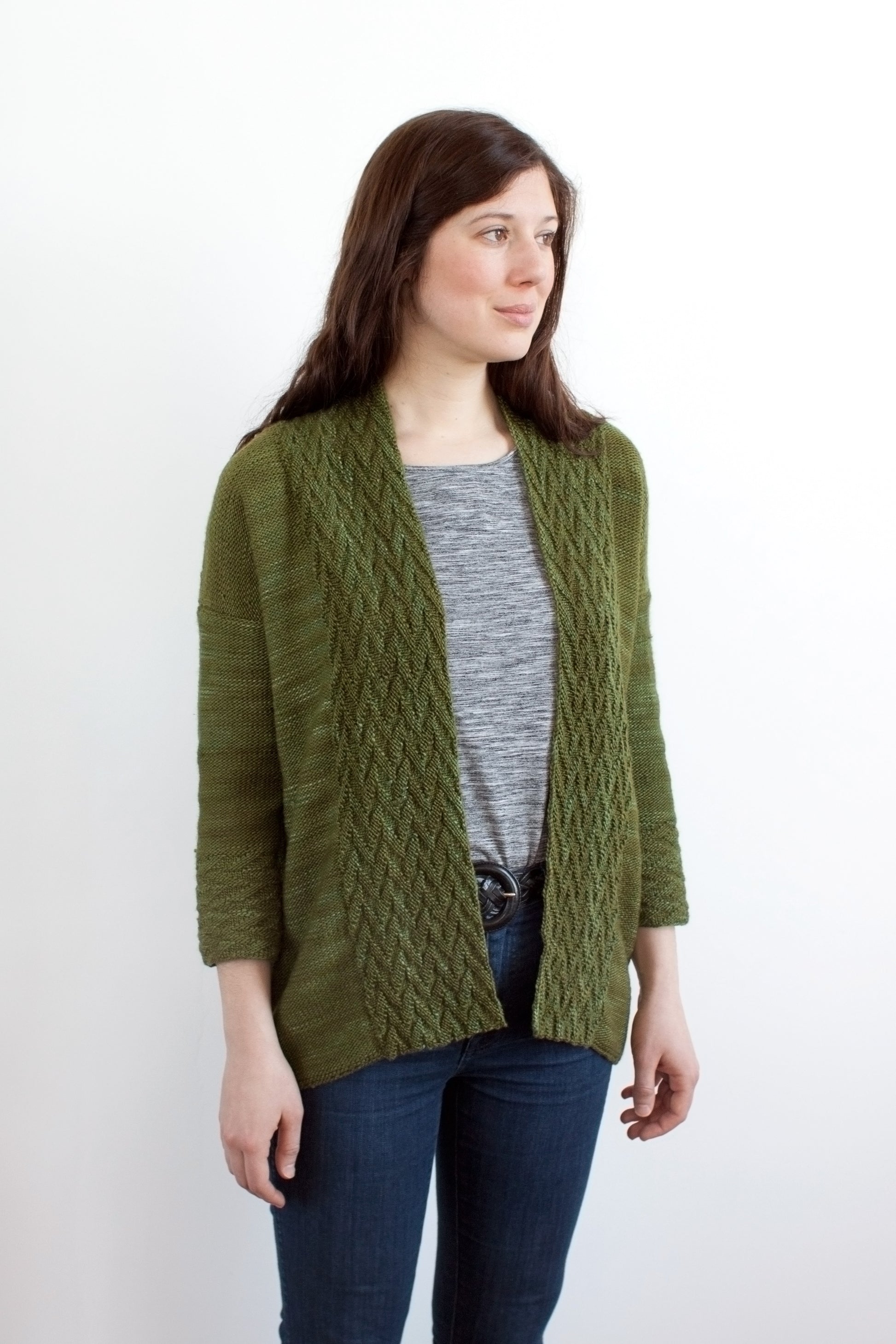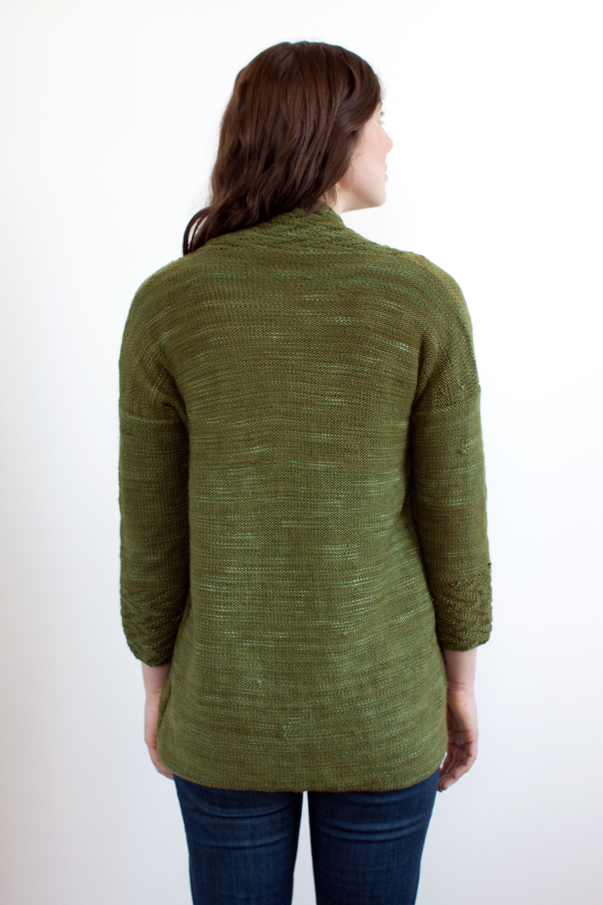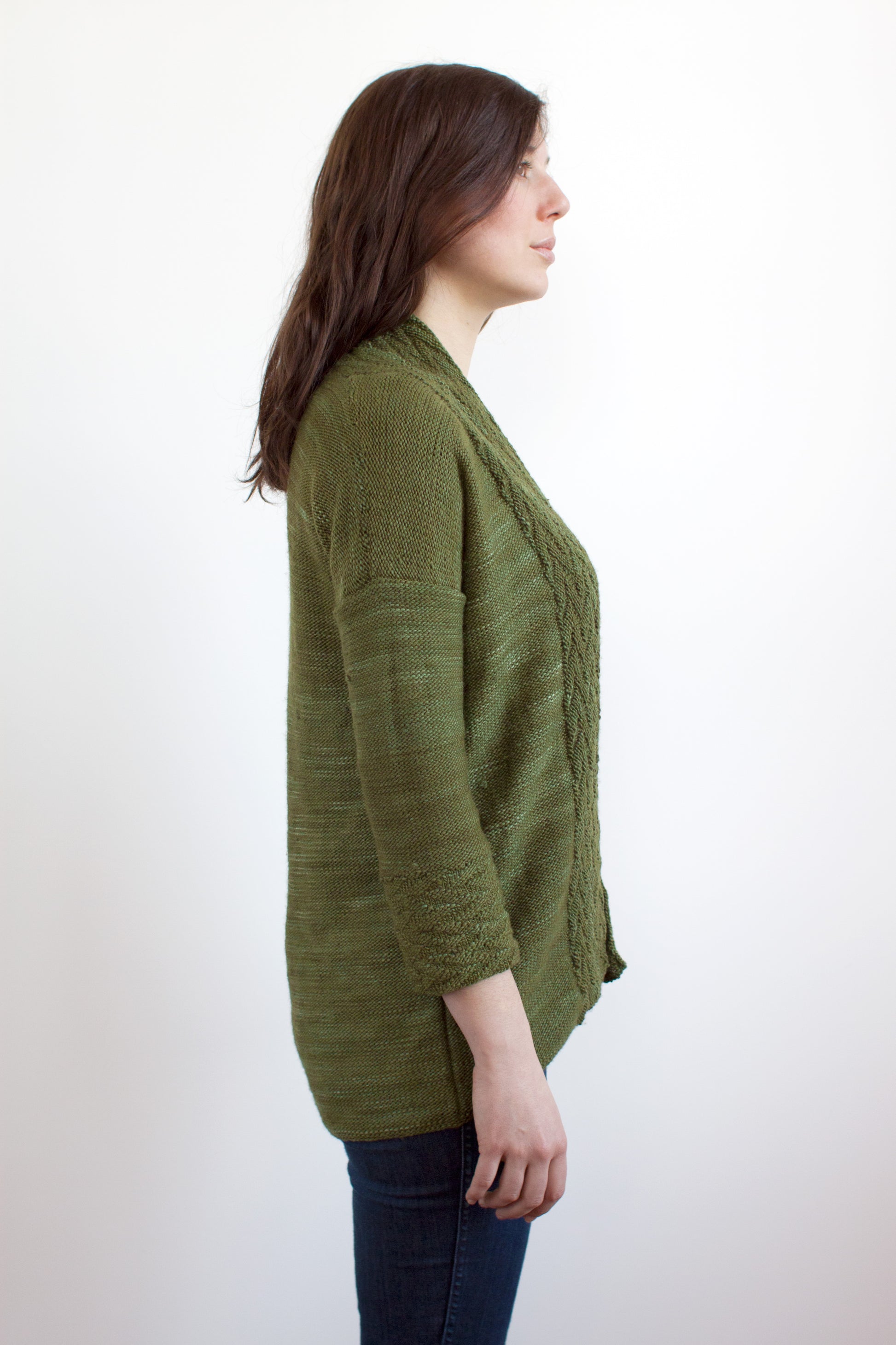 Yarn Requirements: Silk Blend, shown in 3055 Olive (9 (10, 11, 12, 13) sks)