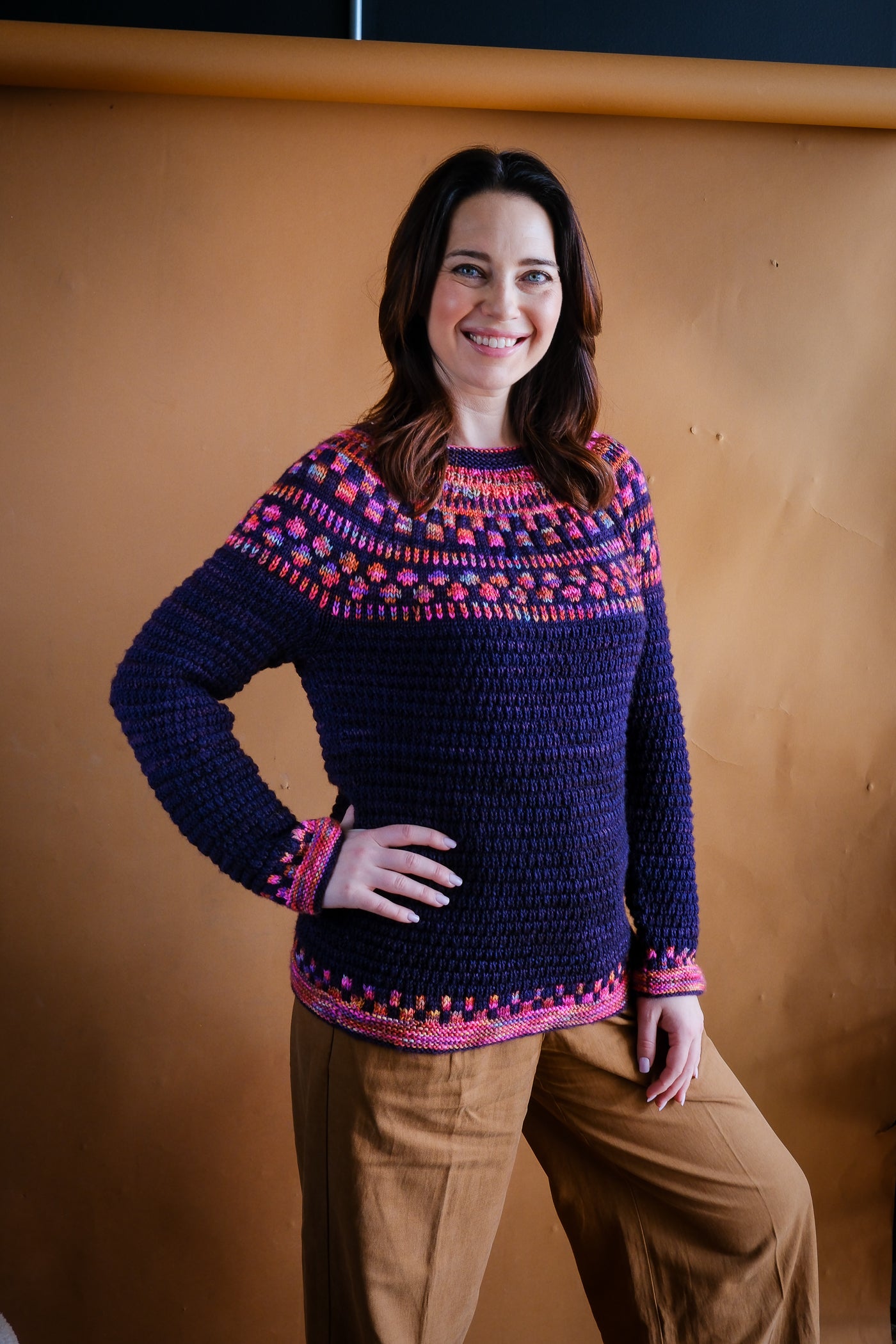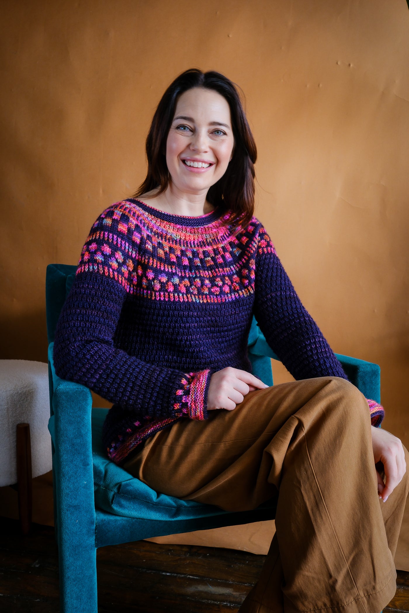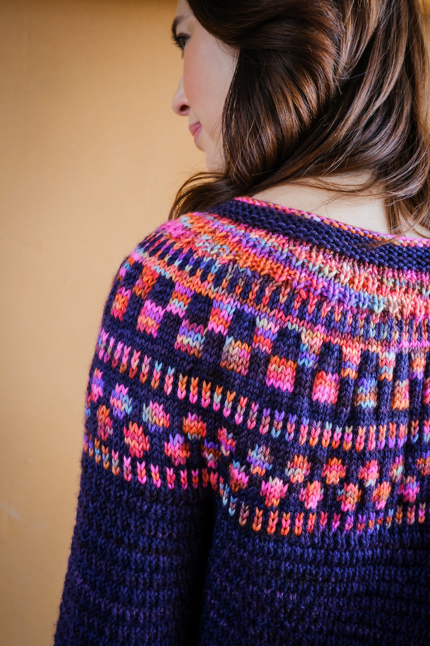 Bands of colorful garter stitch accent this pullover worked from the bottom up, while a simple allover texture stitch echoes the colorwork at the yoke to unify the design. Deborah's choice of the bright and cheery Carnaval for the colorwork pattern is nicely contrasted with the deeper tones of Eggplant as the MC -- though we can easily imagine this all-gender piece in a million other color combinations.