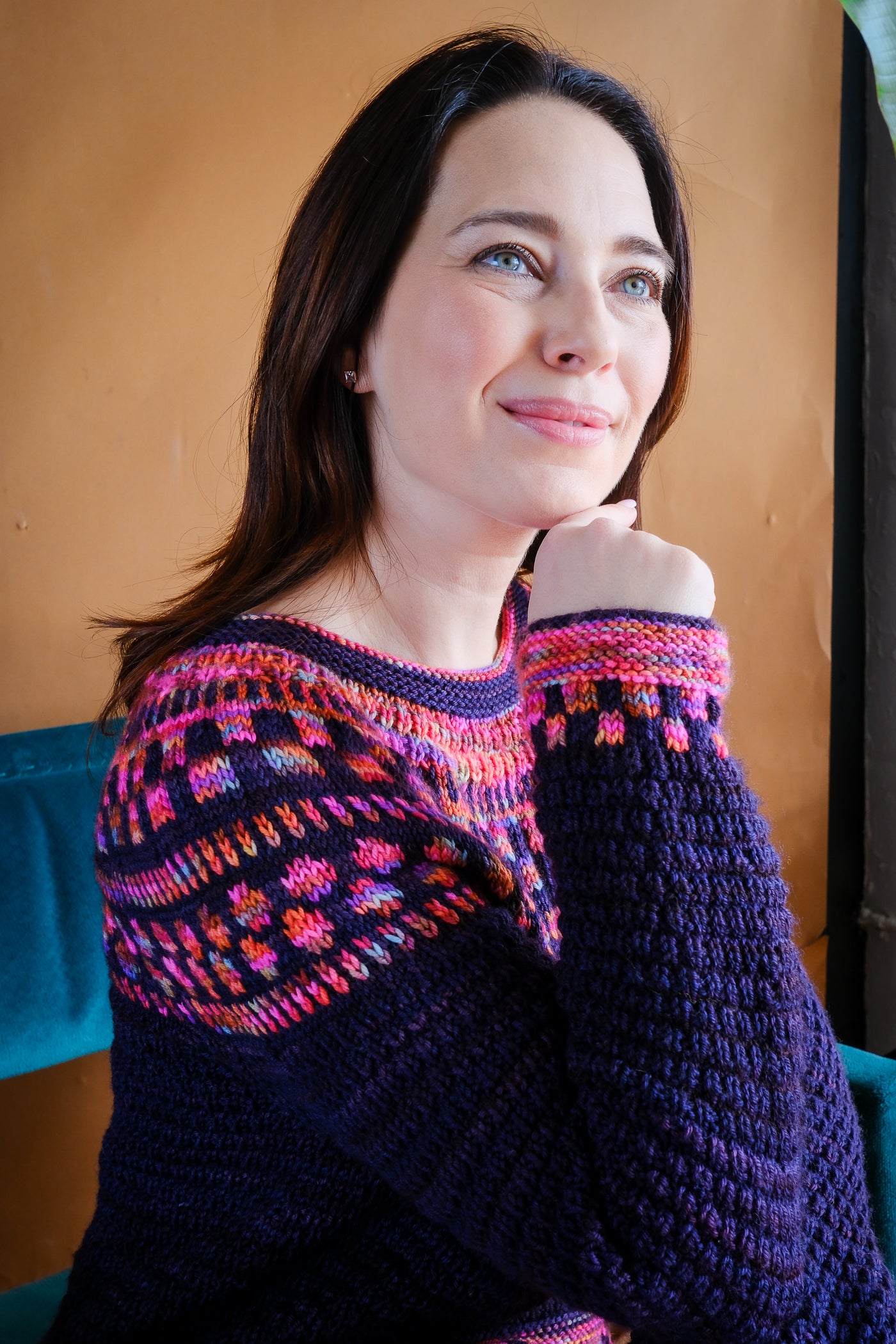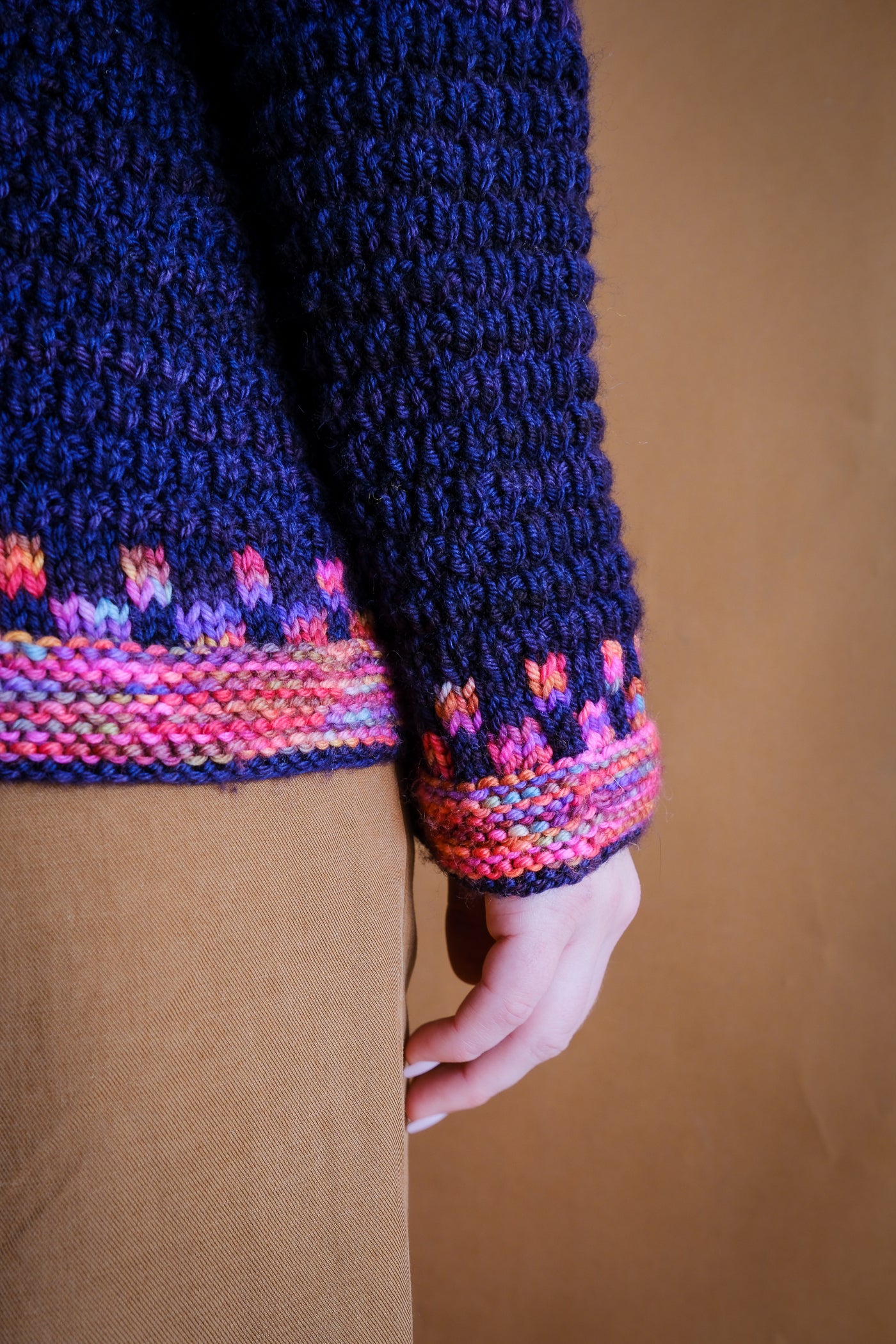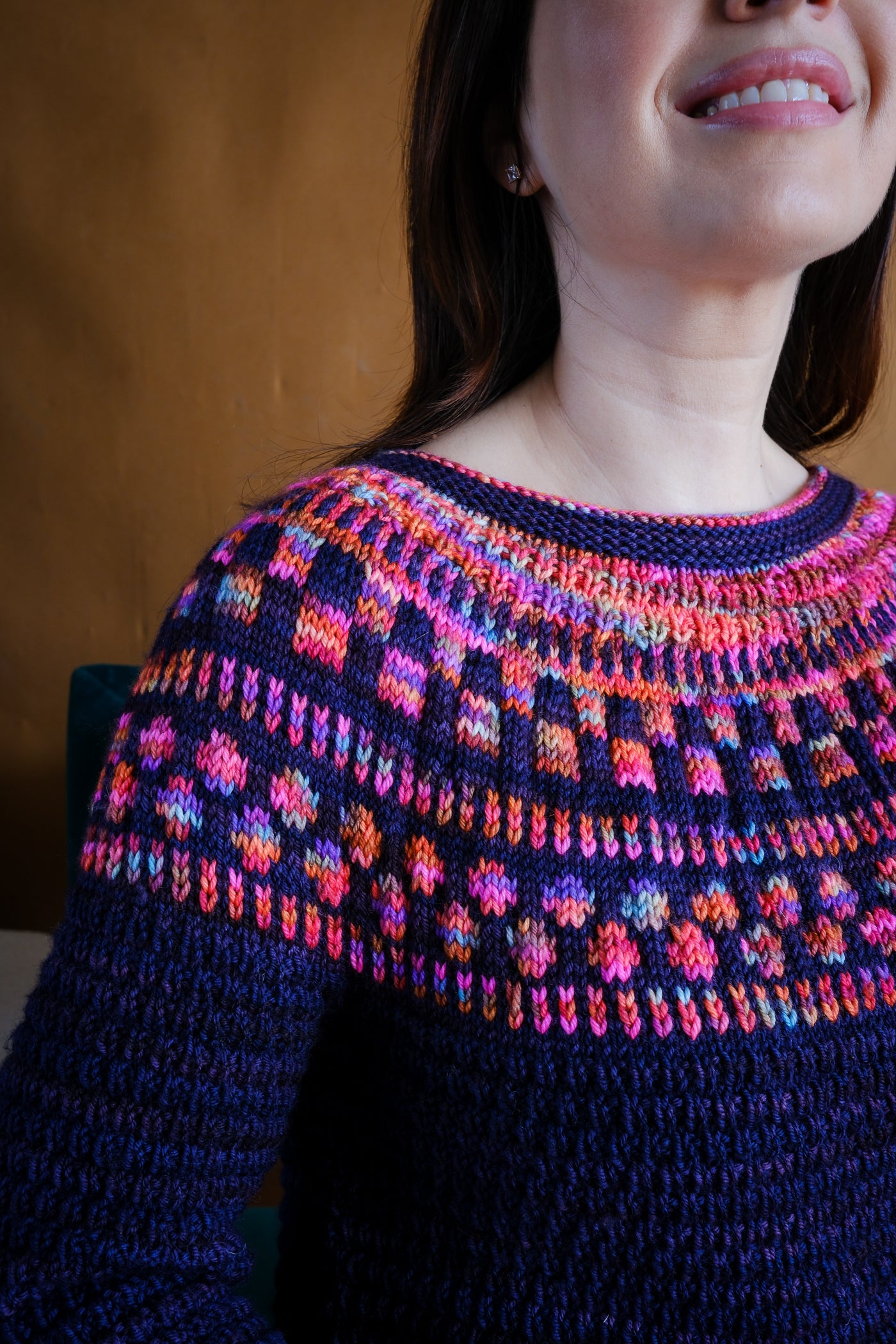 Bands of colorful garter stitch accent this pullover worked from the bottom up, while a simple allover texture stitch echoes the colorwork at the yoke to unify the design. Deborah's choice of the bright and cheery Carnaval for the colorwork pattern is nicely contrasted with the deeper tones of Eggplant as the MC -- though we can easily imagine this all-gender piece in a million other color combinations.