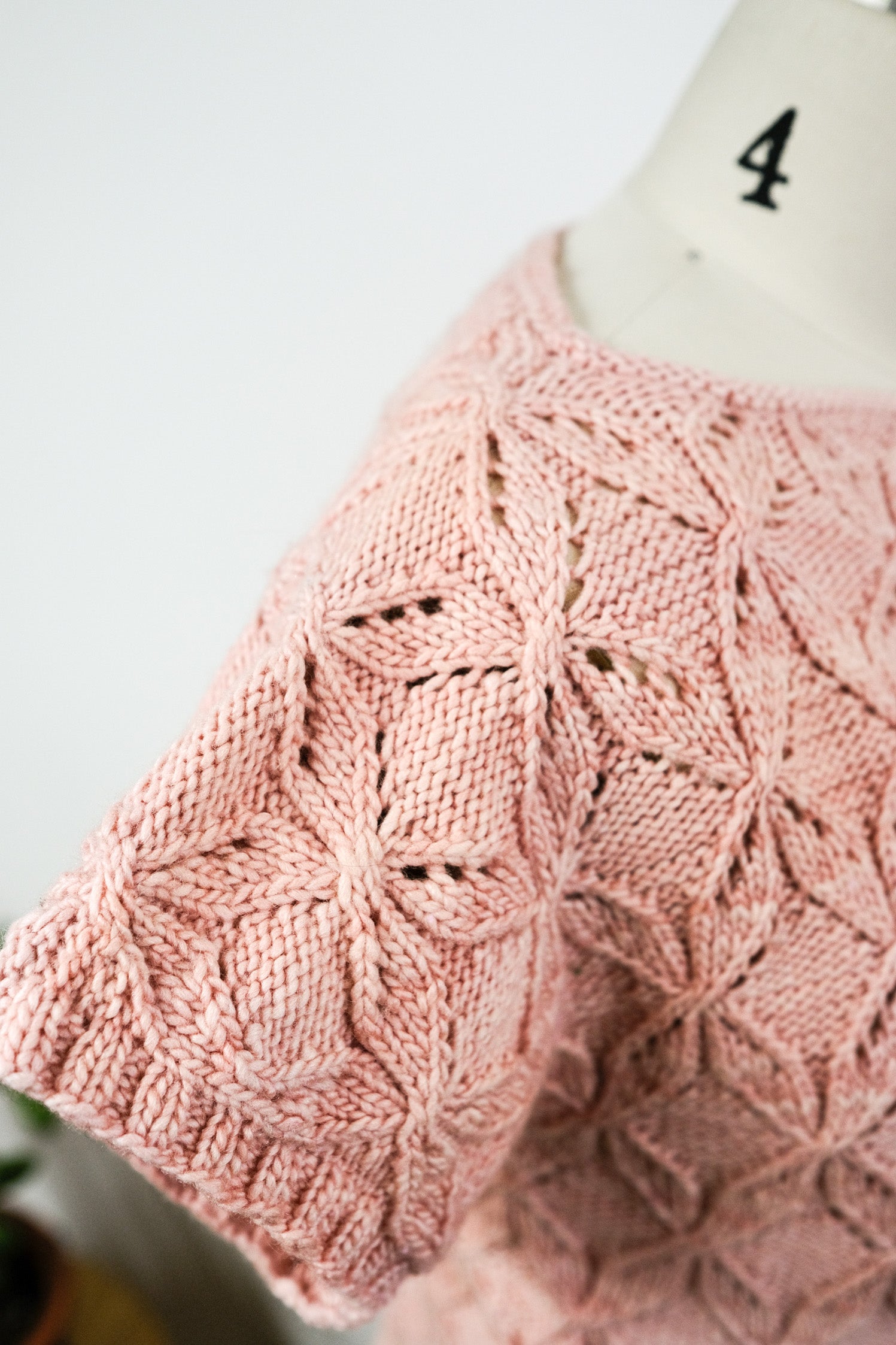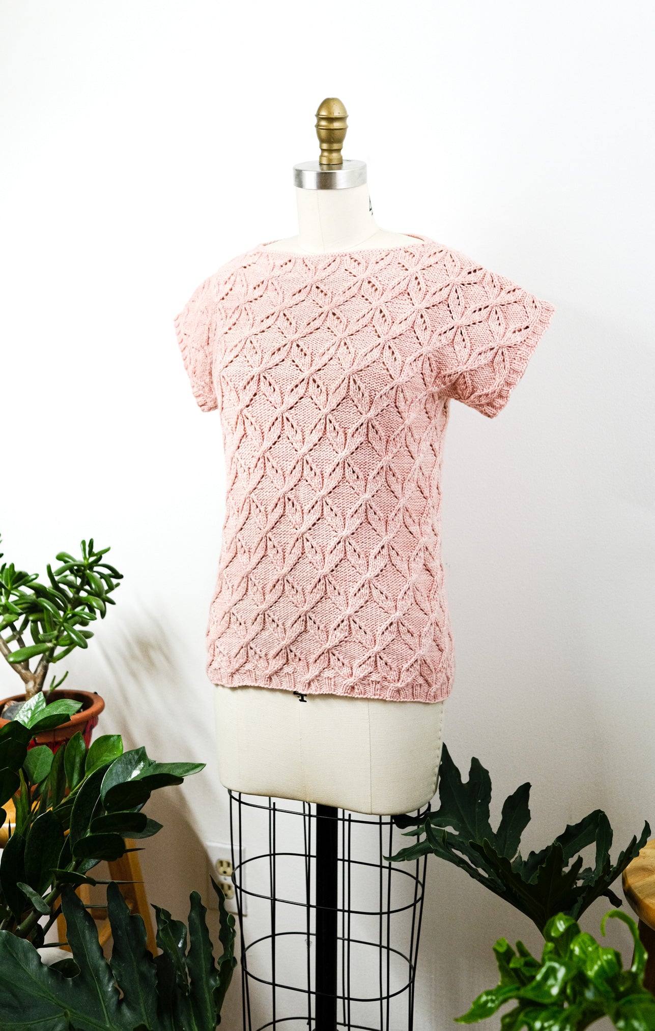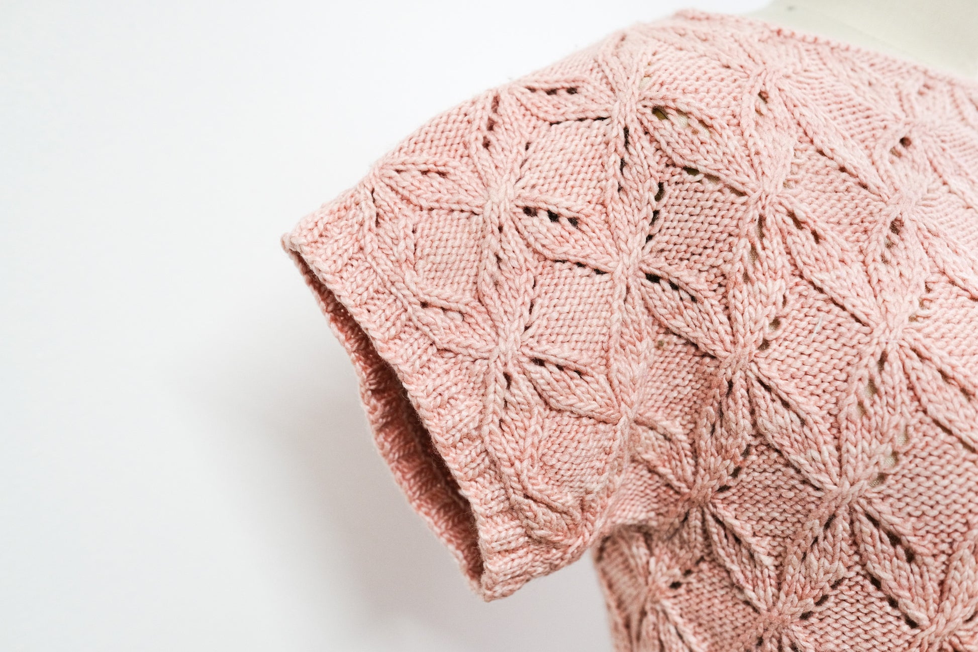 Knit all in one piece, this tee is beautifully designed with minimal shaping to keep the focus on the fascinating stitch pattern - which flows seamlessly around body and sleeves without interruption.