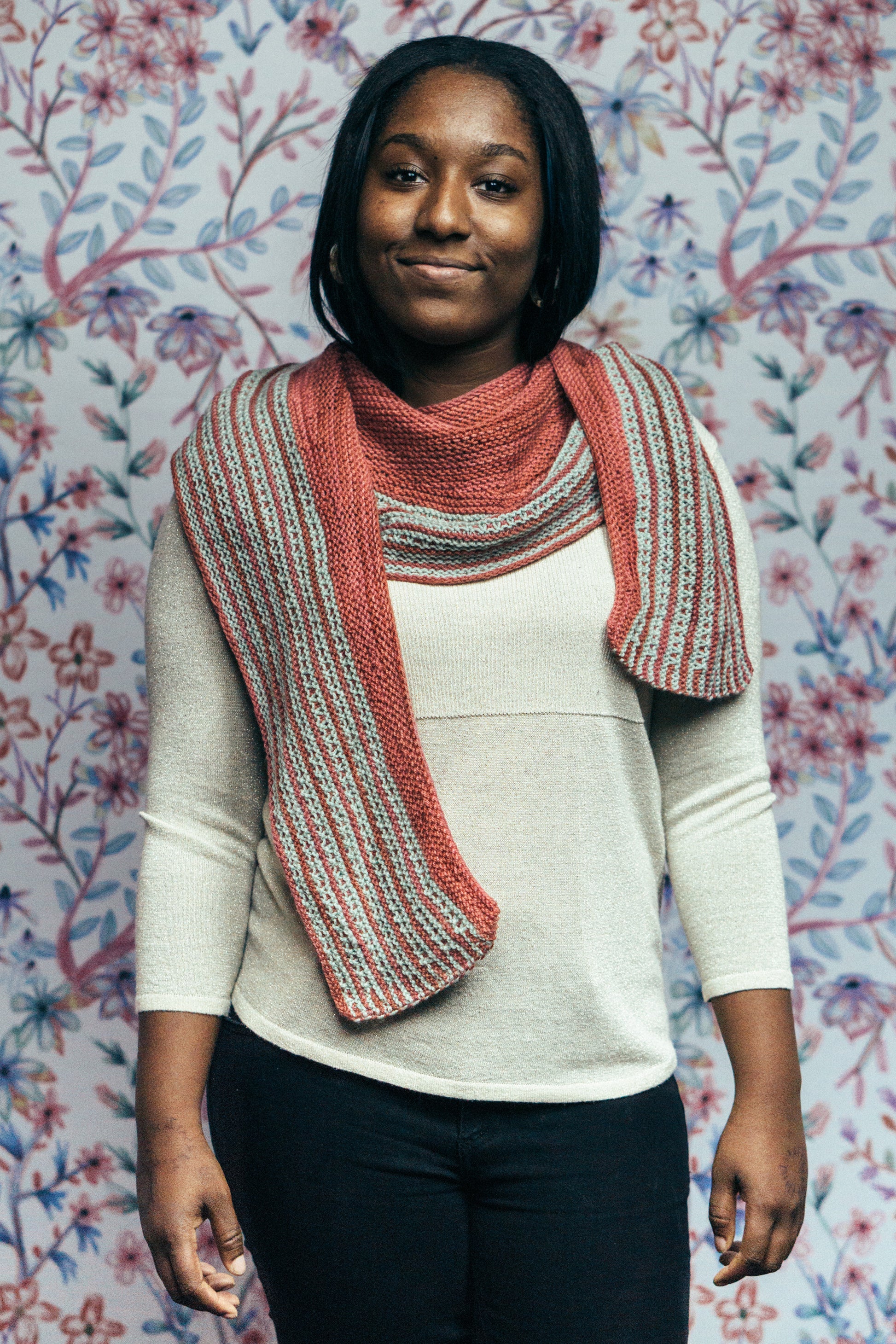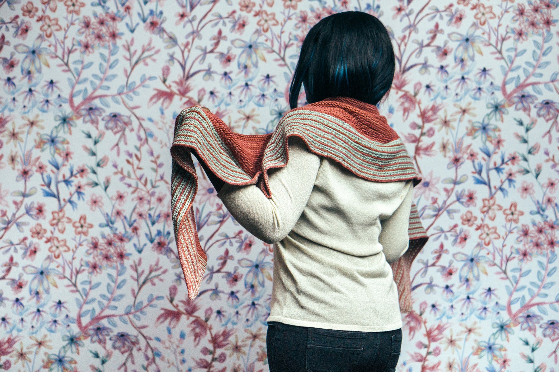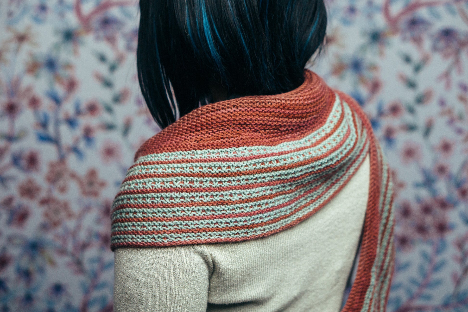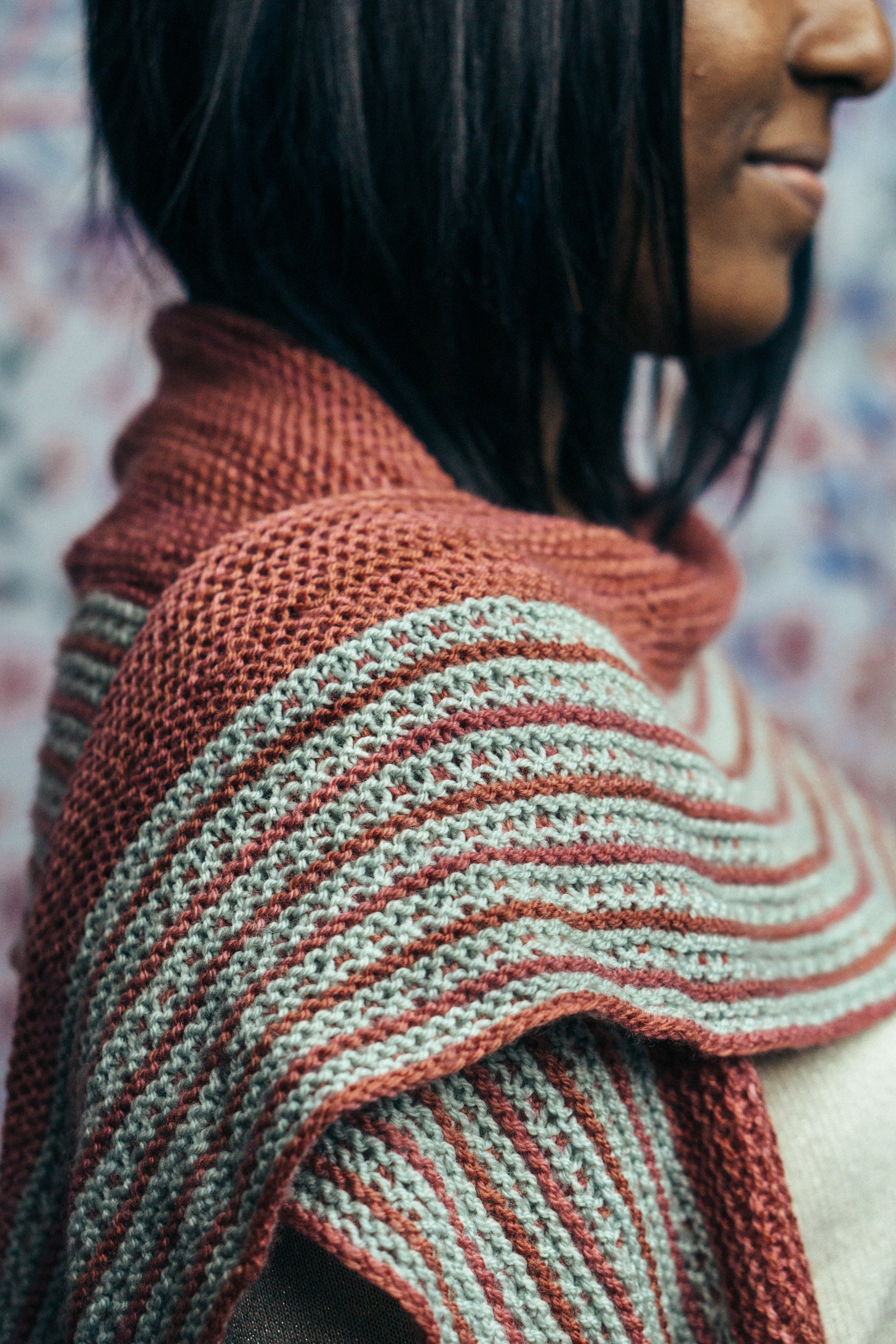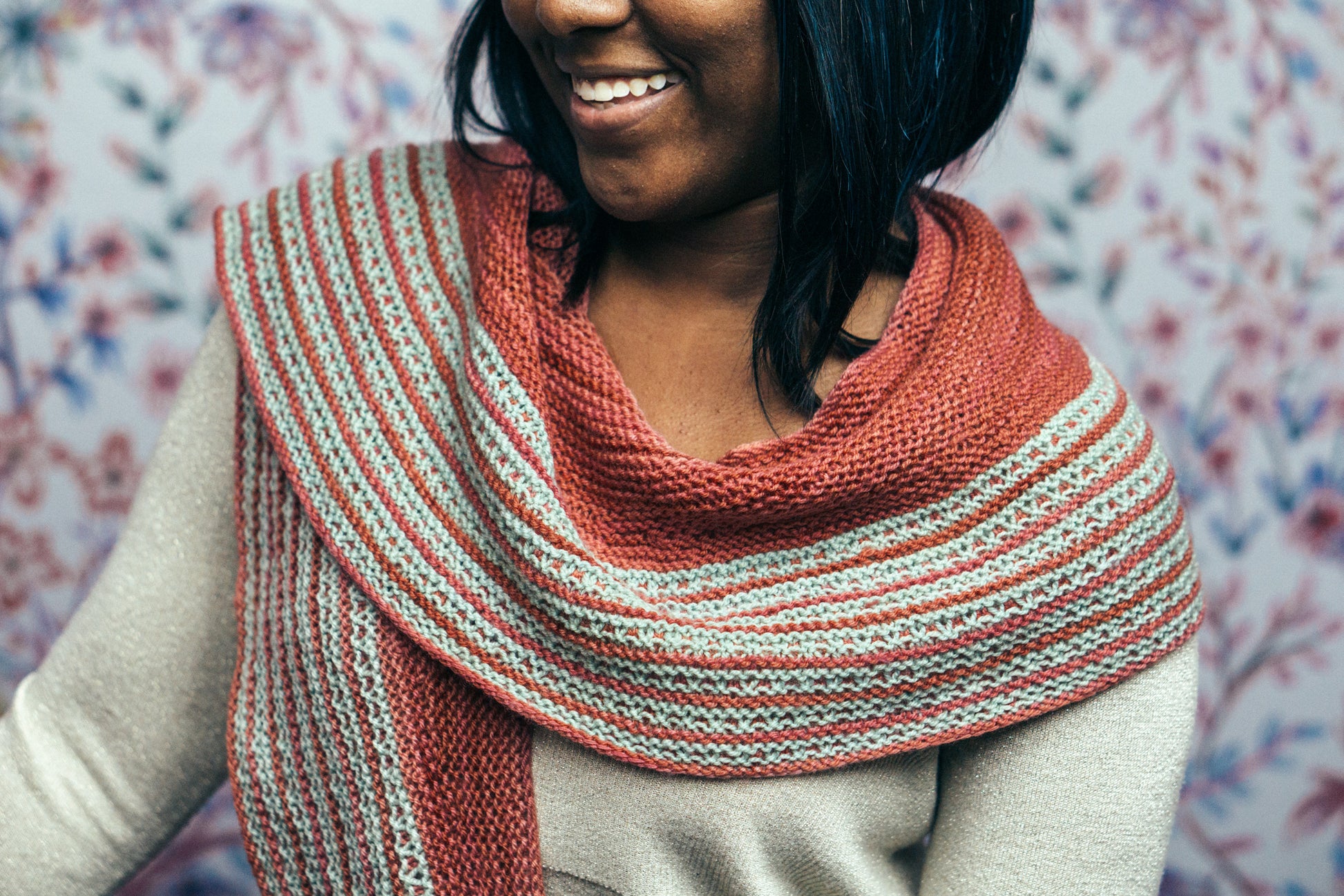 Momentito is a not-too-big, not-too-small crescent for trans-seasonal wear. The deep border highlights two soft semi-solid colors in a couldn't-be-simpler slip-stitch pattern.