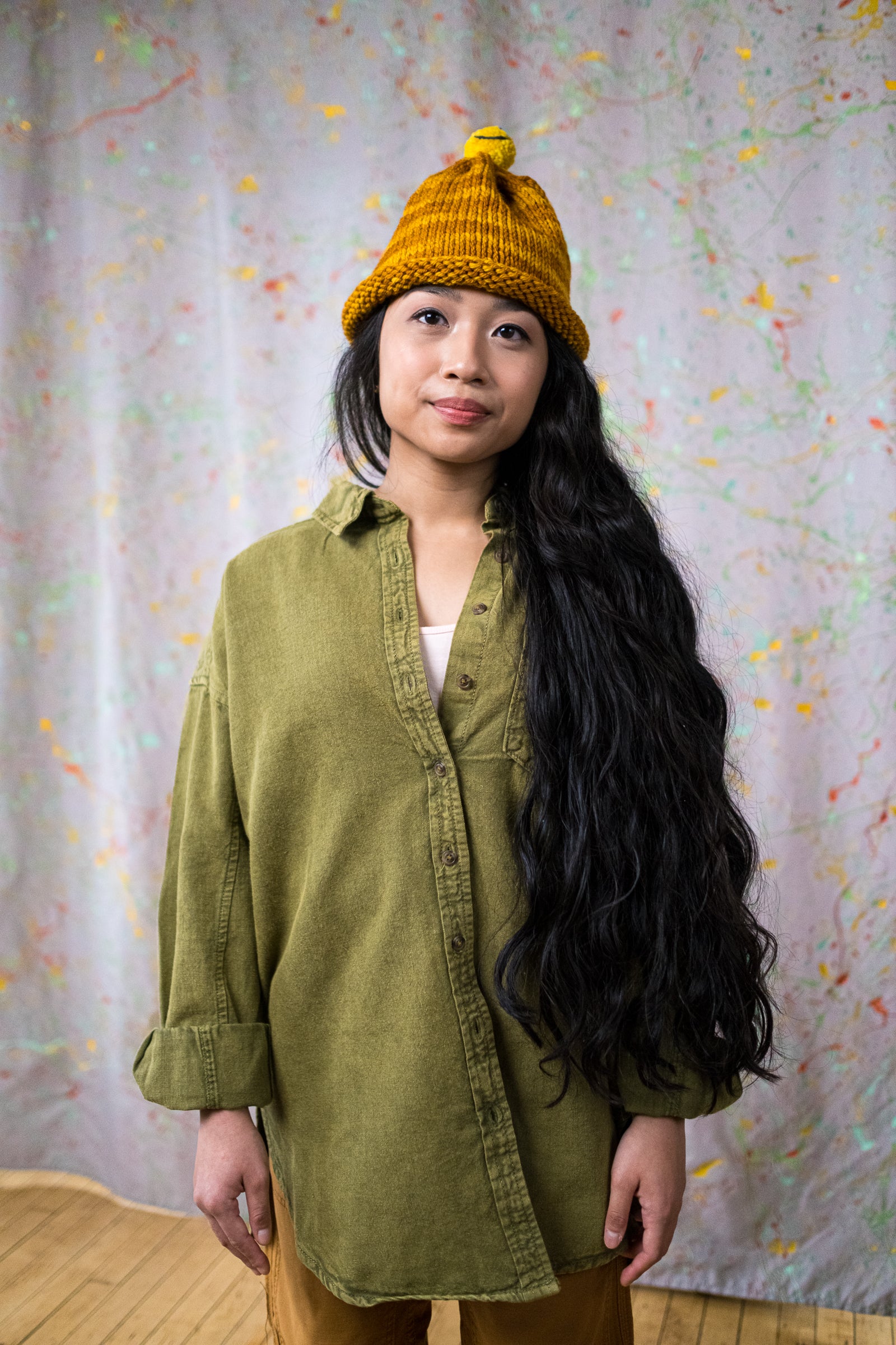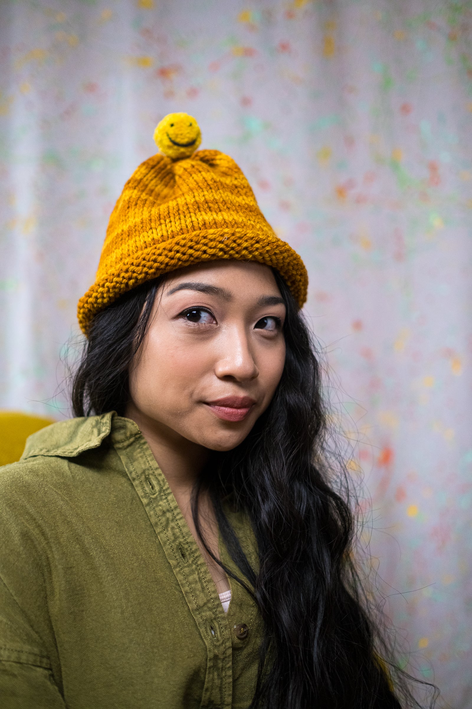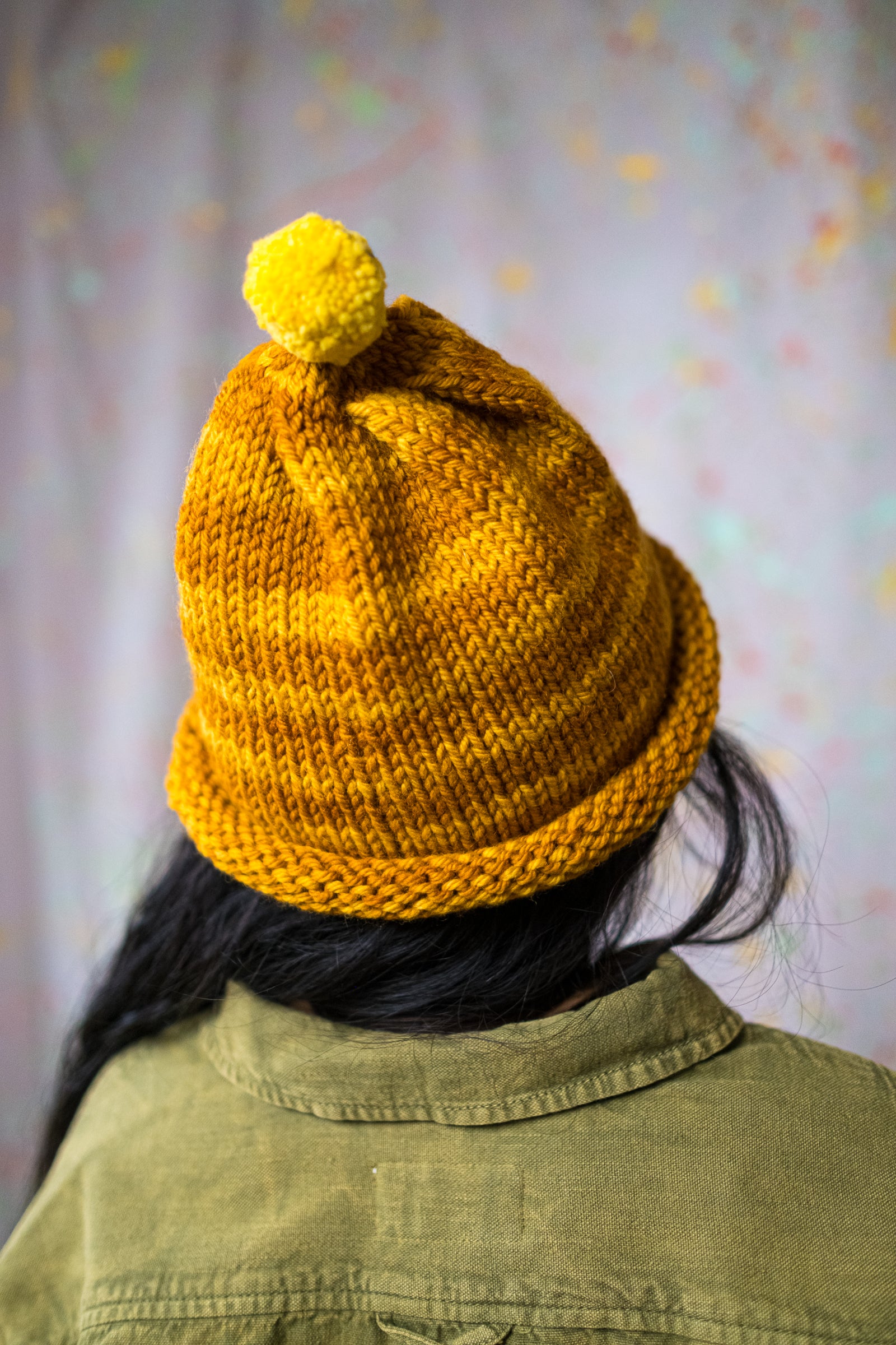 This hat starts as a typical rolled-brim cap, but the top moves into new territory: a series of pleats, accentuated by the bulk of Cardo. Instructions included for the smiley-face pompom!