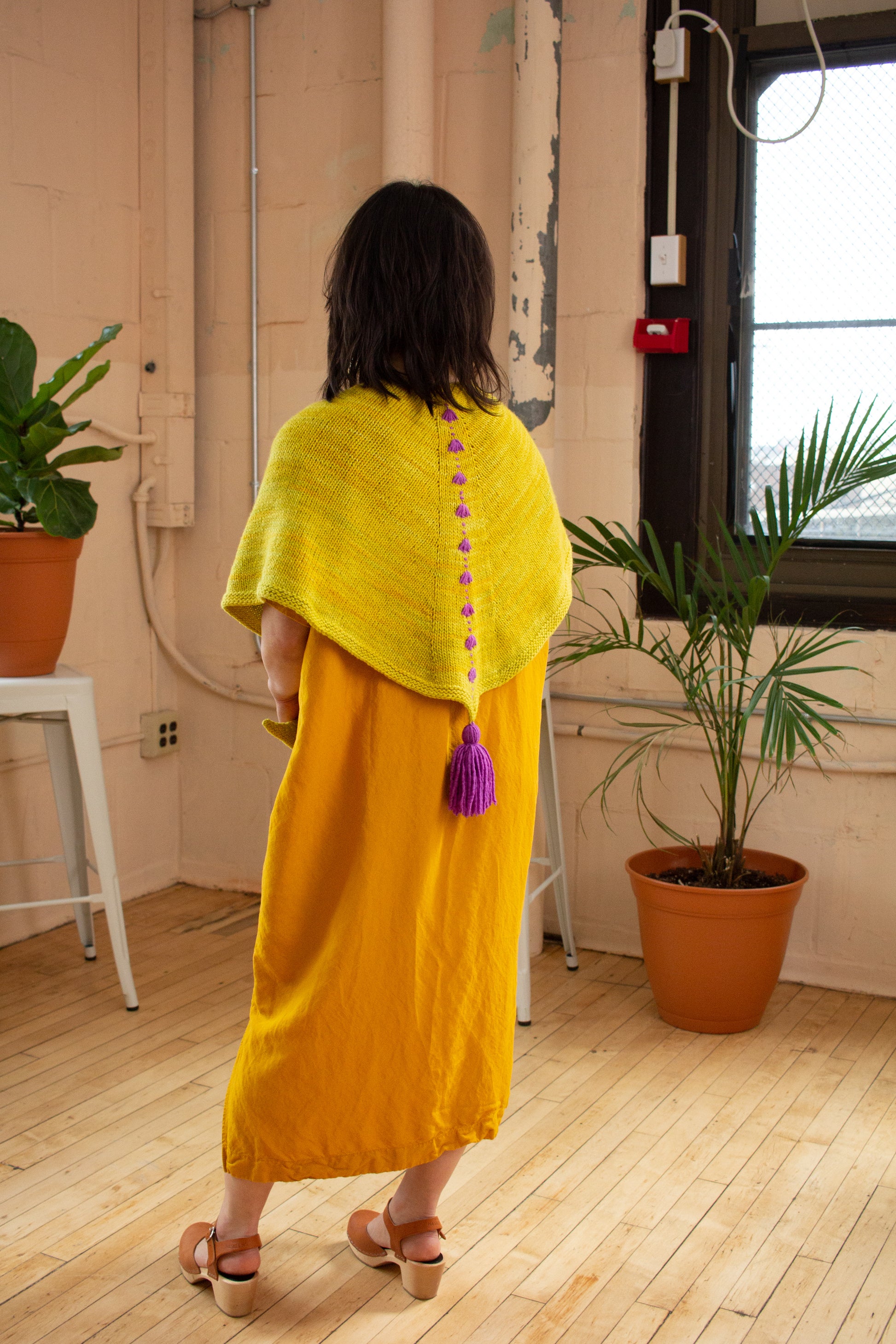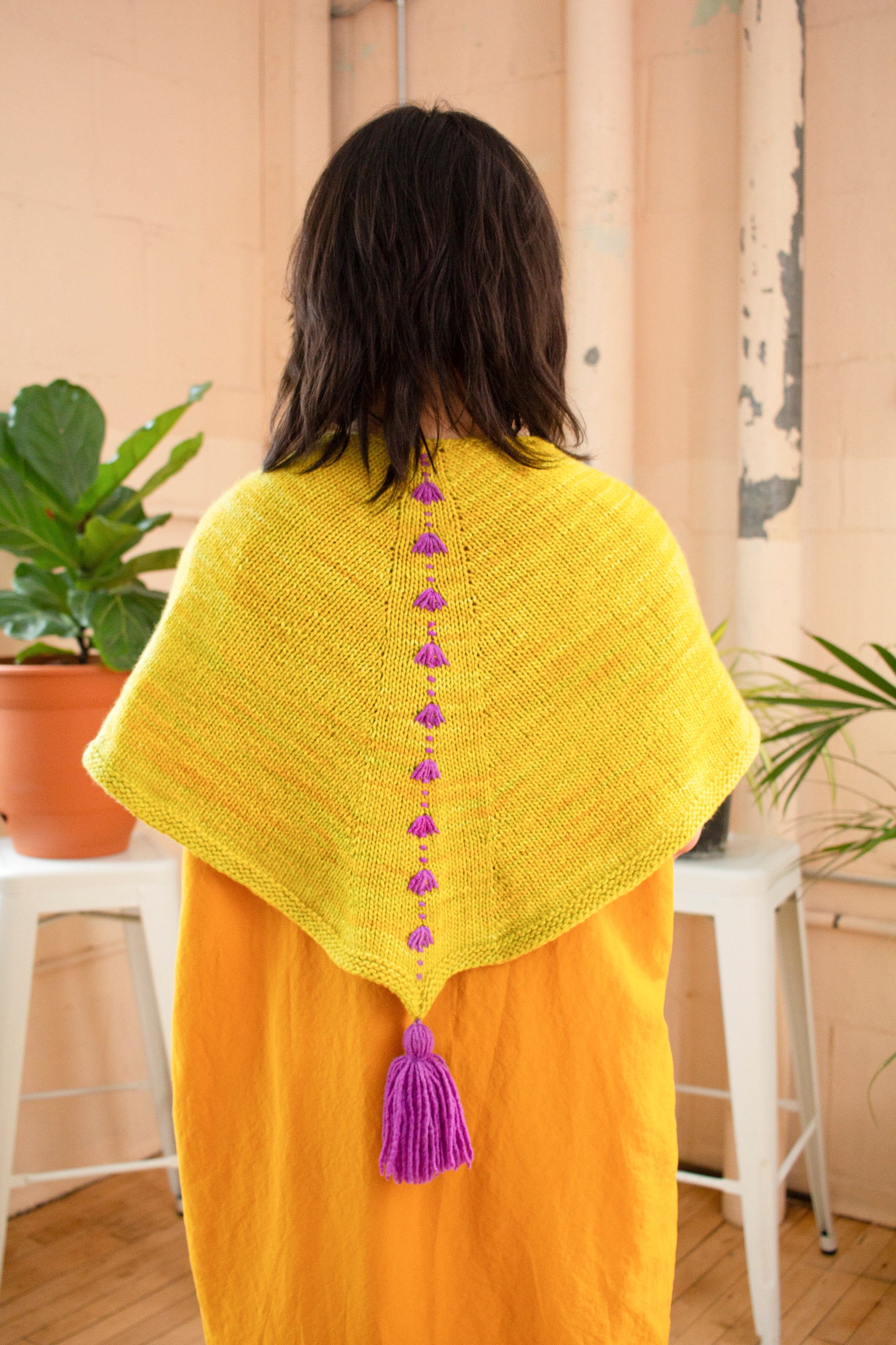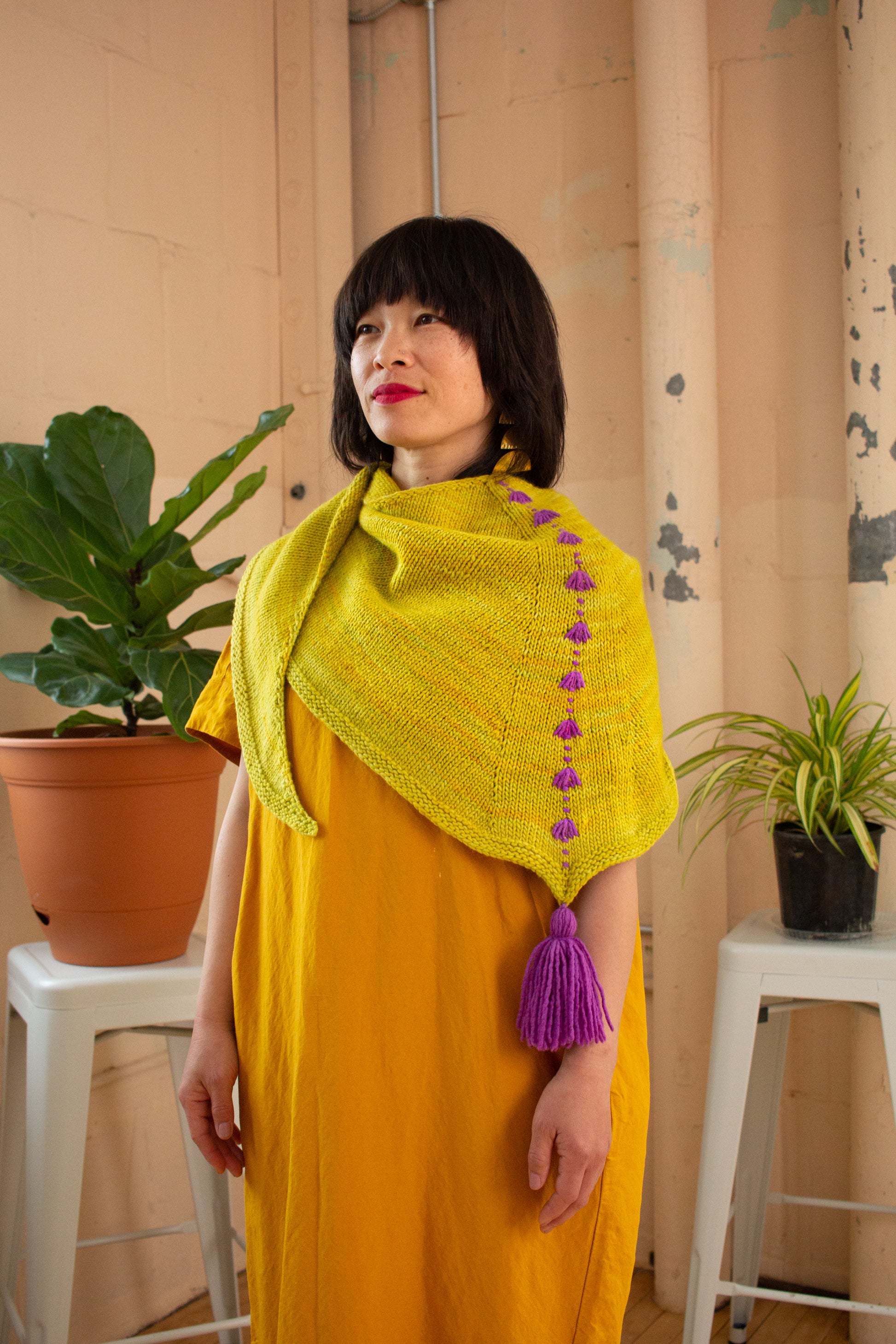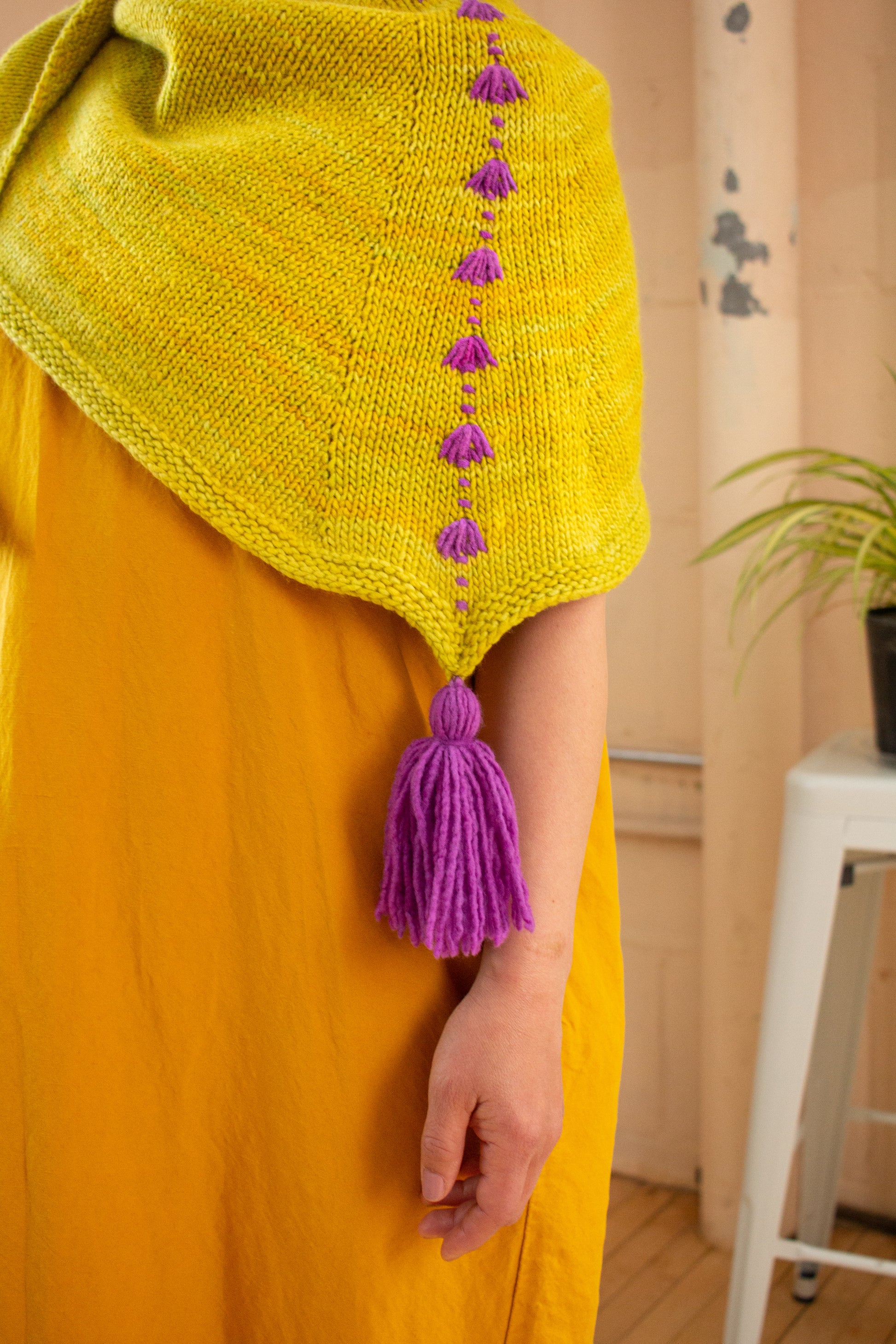This crescent shawl features a dip stitch and inlay pattern in the center. Much longer than it is deep, this shawl looks great styled as a kerchief, with the decorative panel and tassel front and centre.
