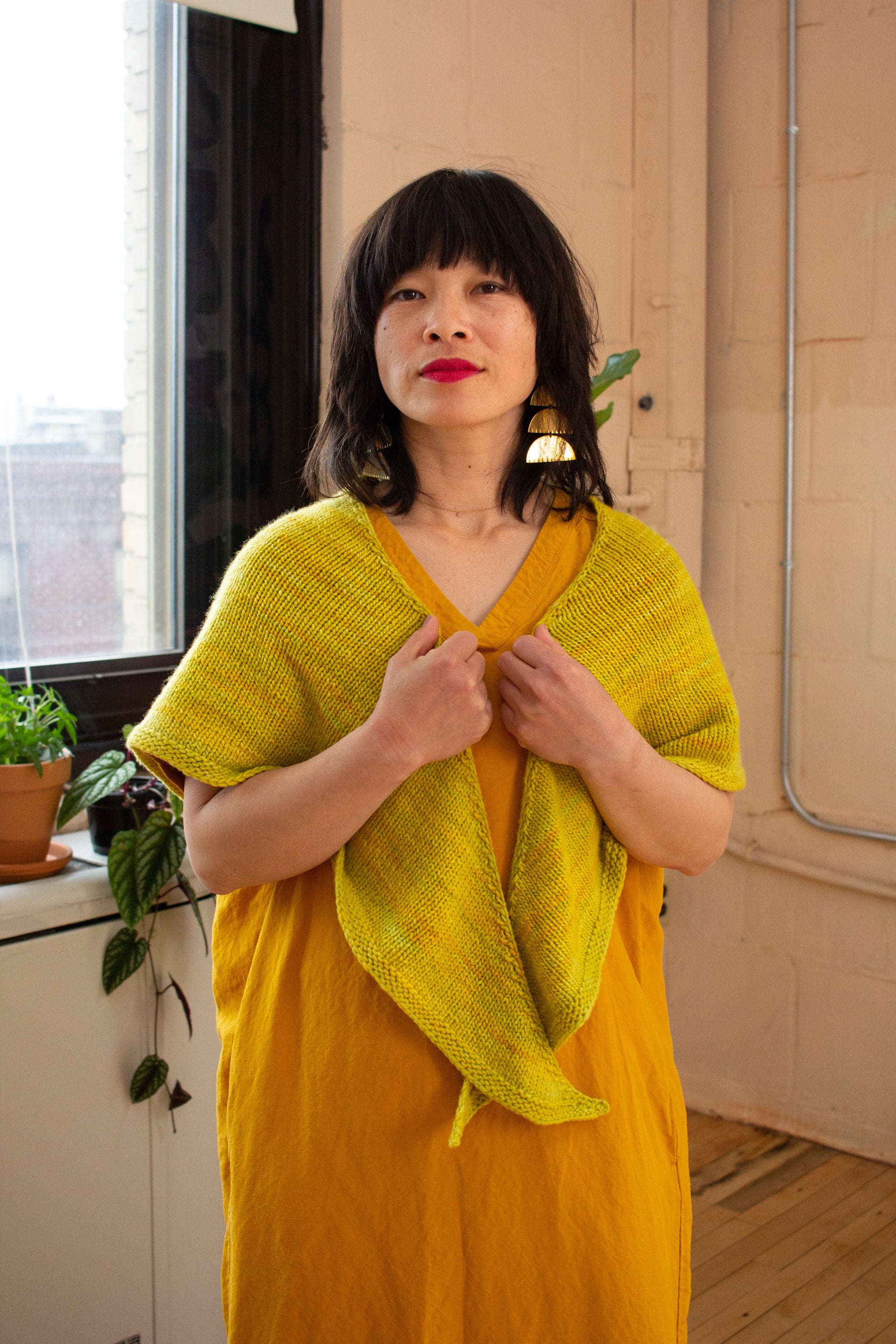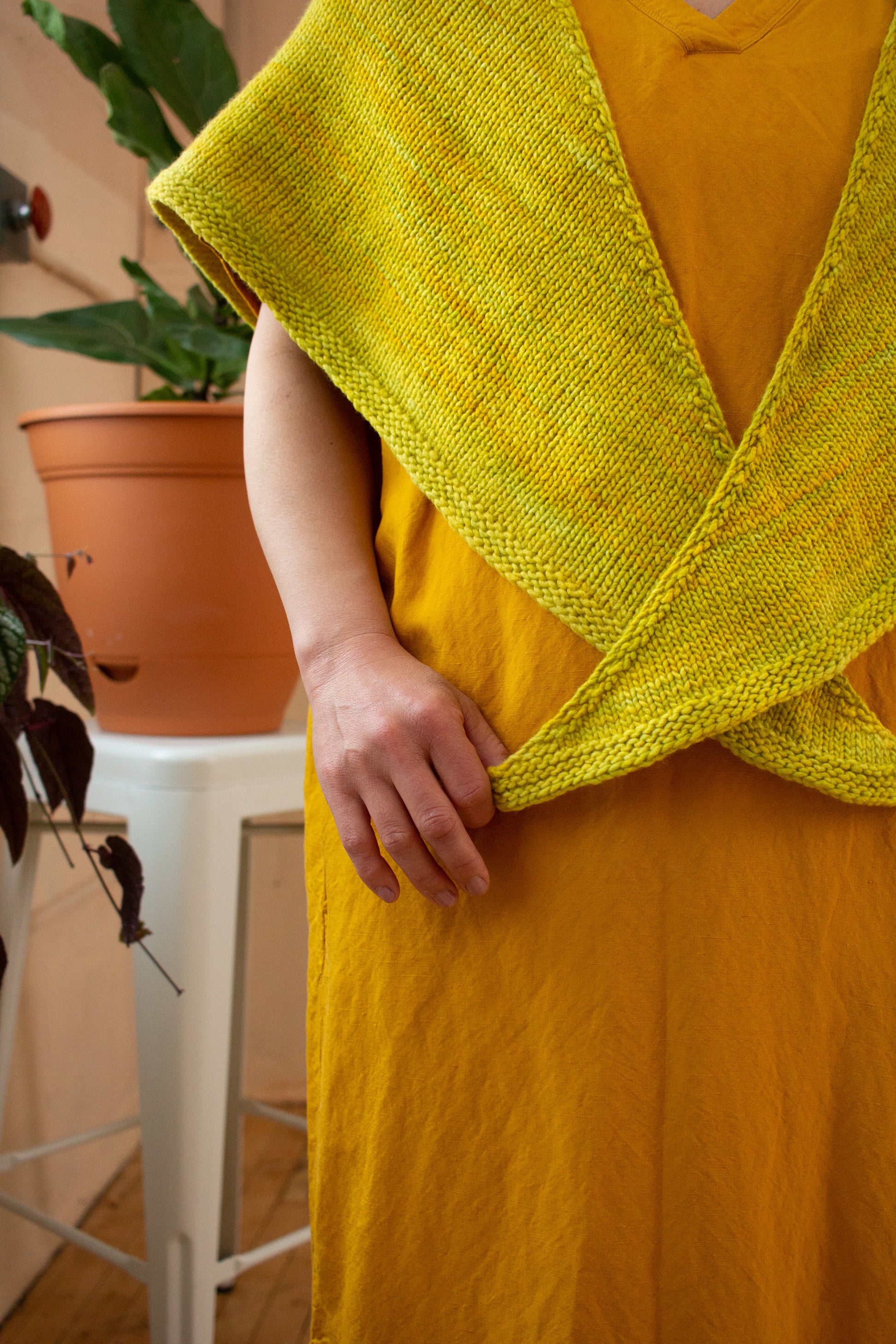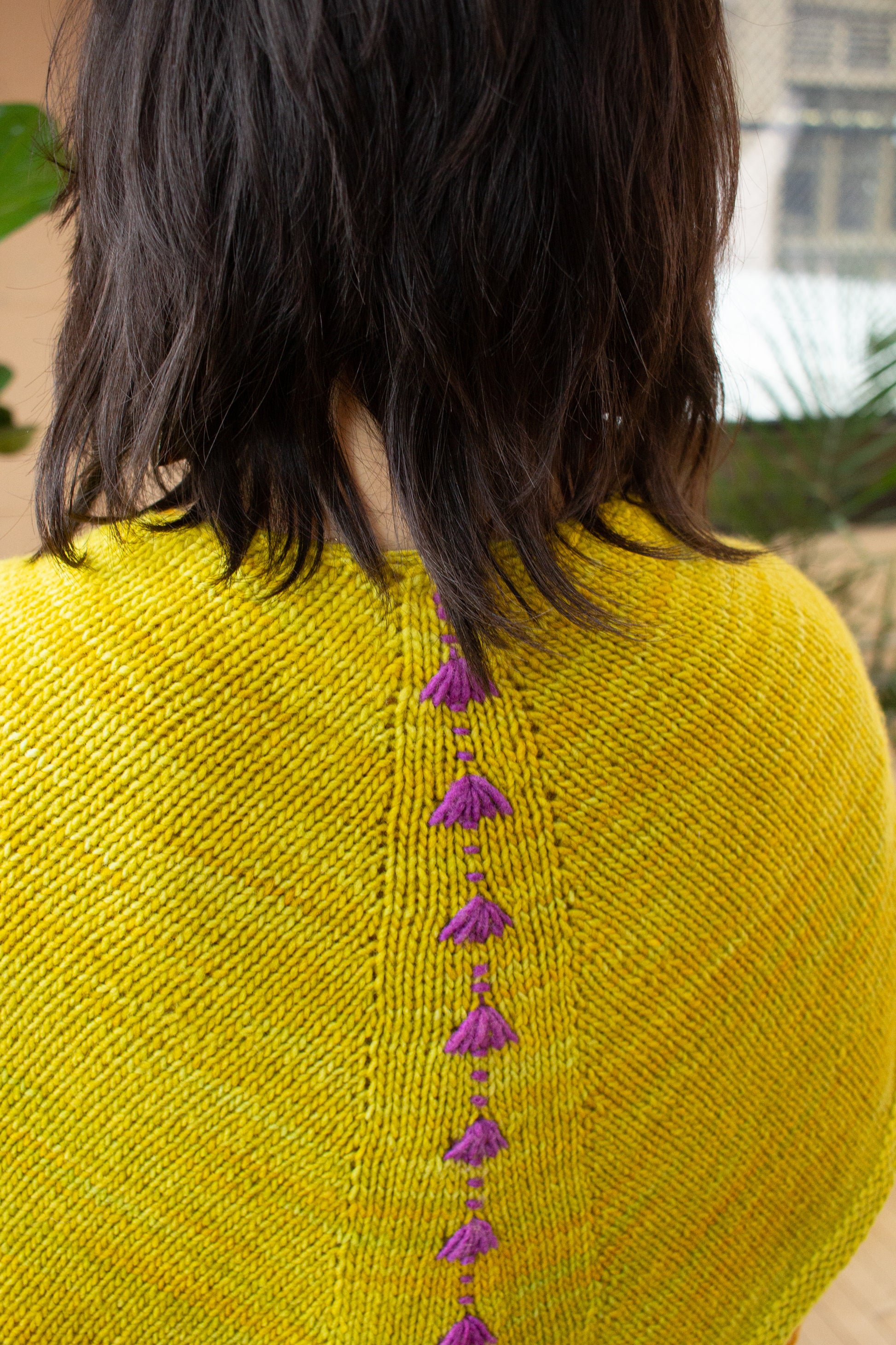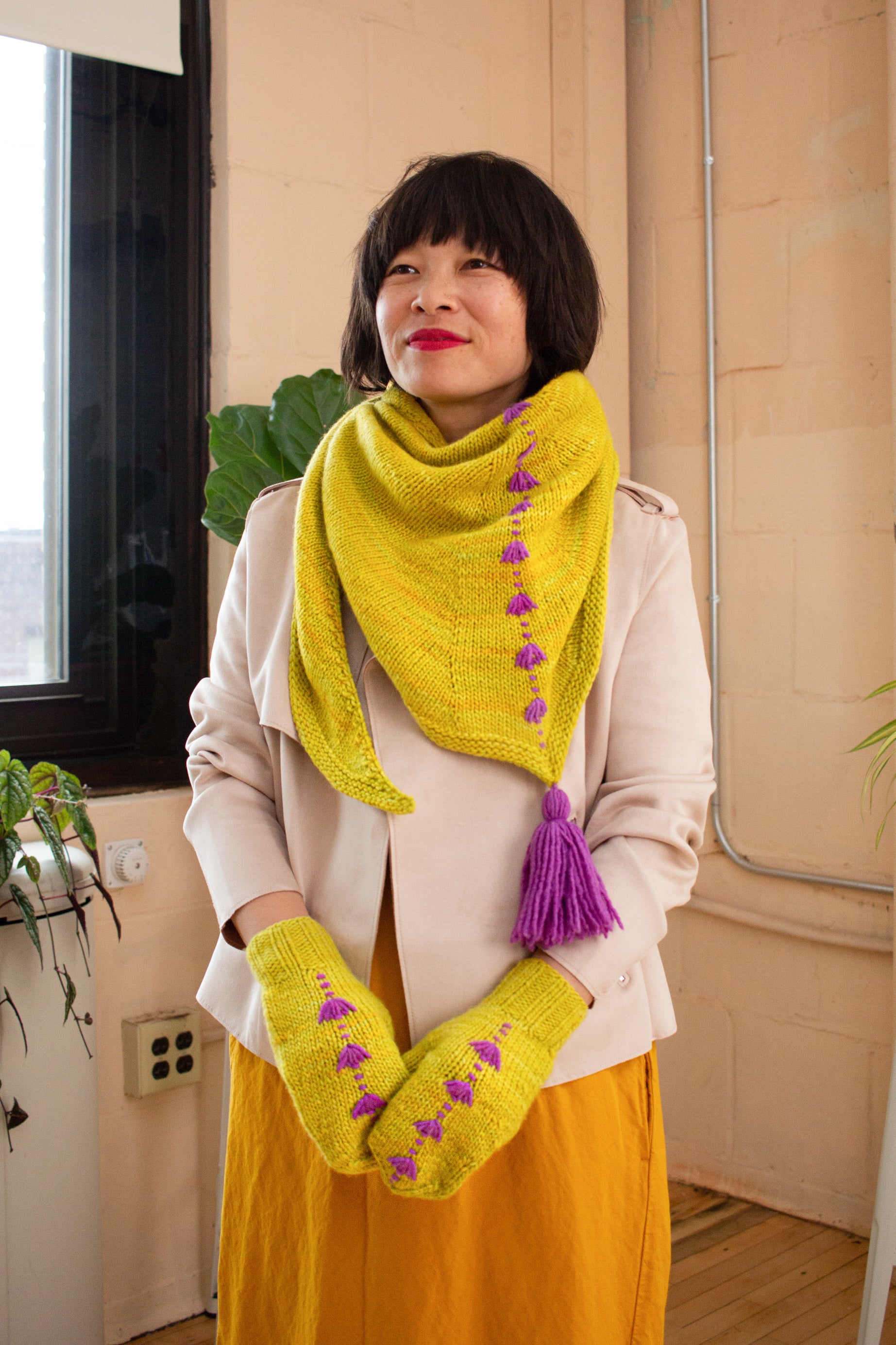 This crescent shawl features a dip stitch and inlay pattern in the center. Much longer than it is deep, this shawl looks great styled as a kerchief, with the decorative panel and tassel front and centre.