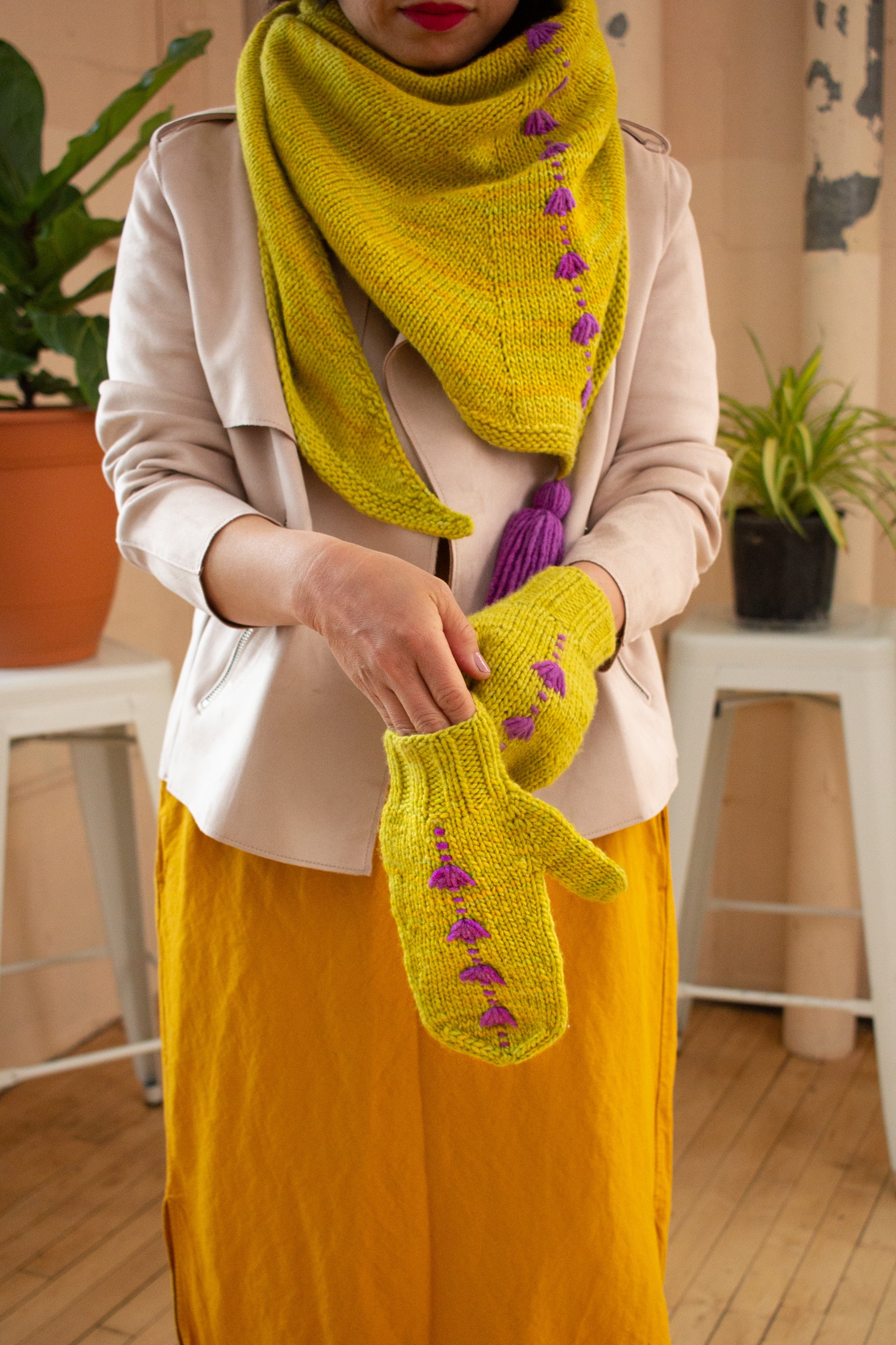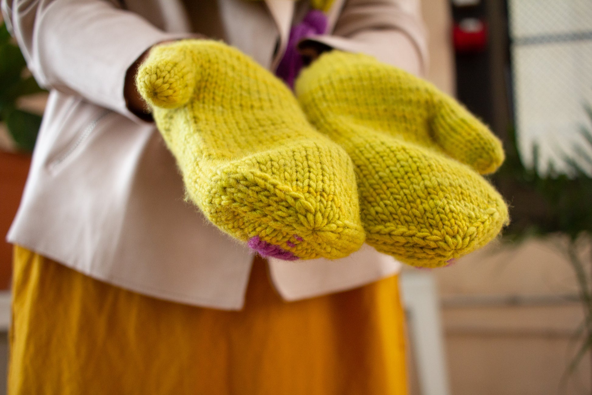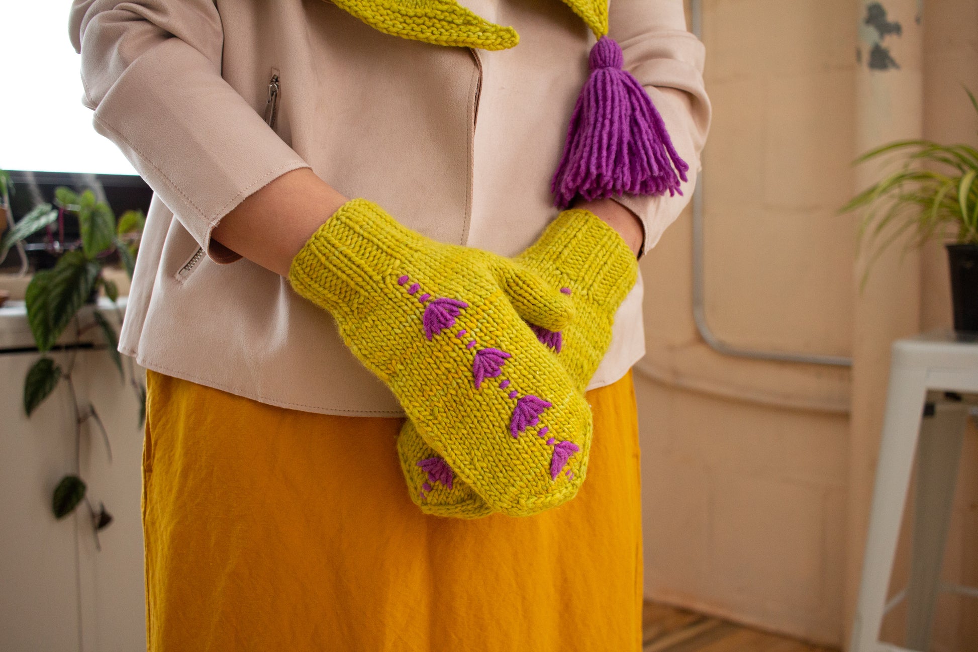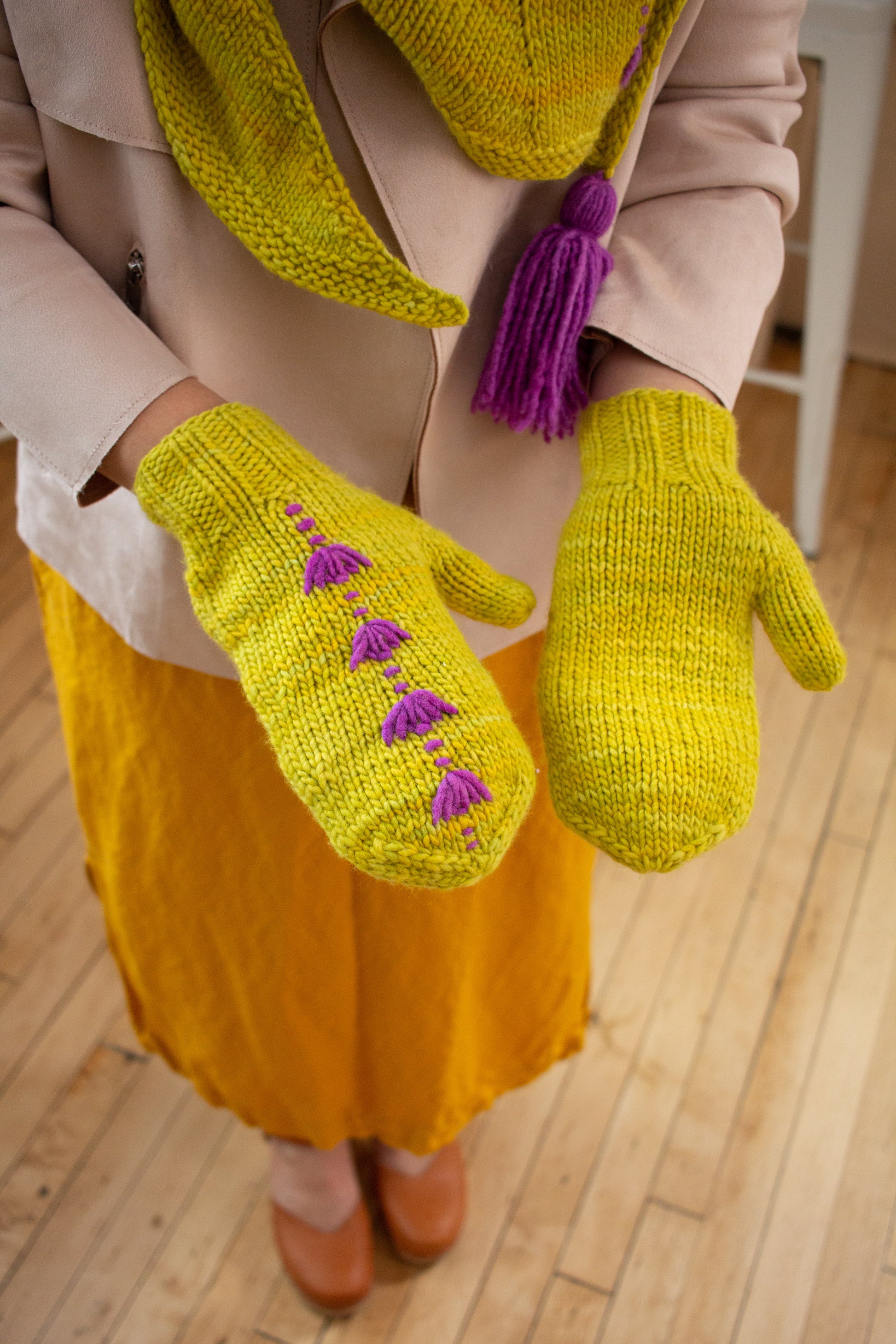 The Raya Mitts use the same inlay and dip stitch panel as the Raya Shawl, but here it is worked in the round. It’s just as simple to do, and the decorative motifs add a pop to these simple but very practical mittens.