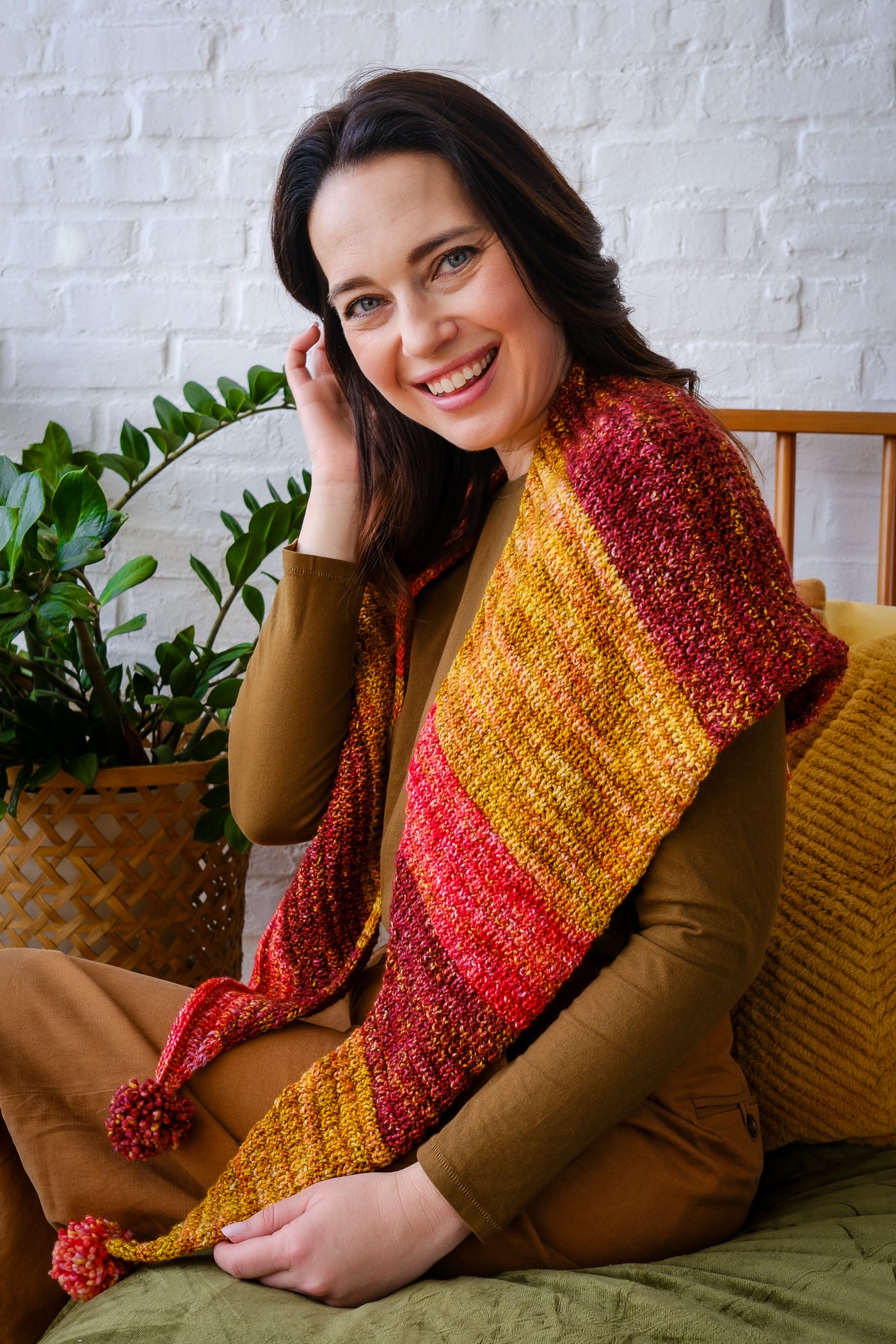 One-skein scarf: 1 sk of either yarn Shown in K101 Spices (Marla) and Y2612 Peonies (Sami)