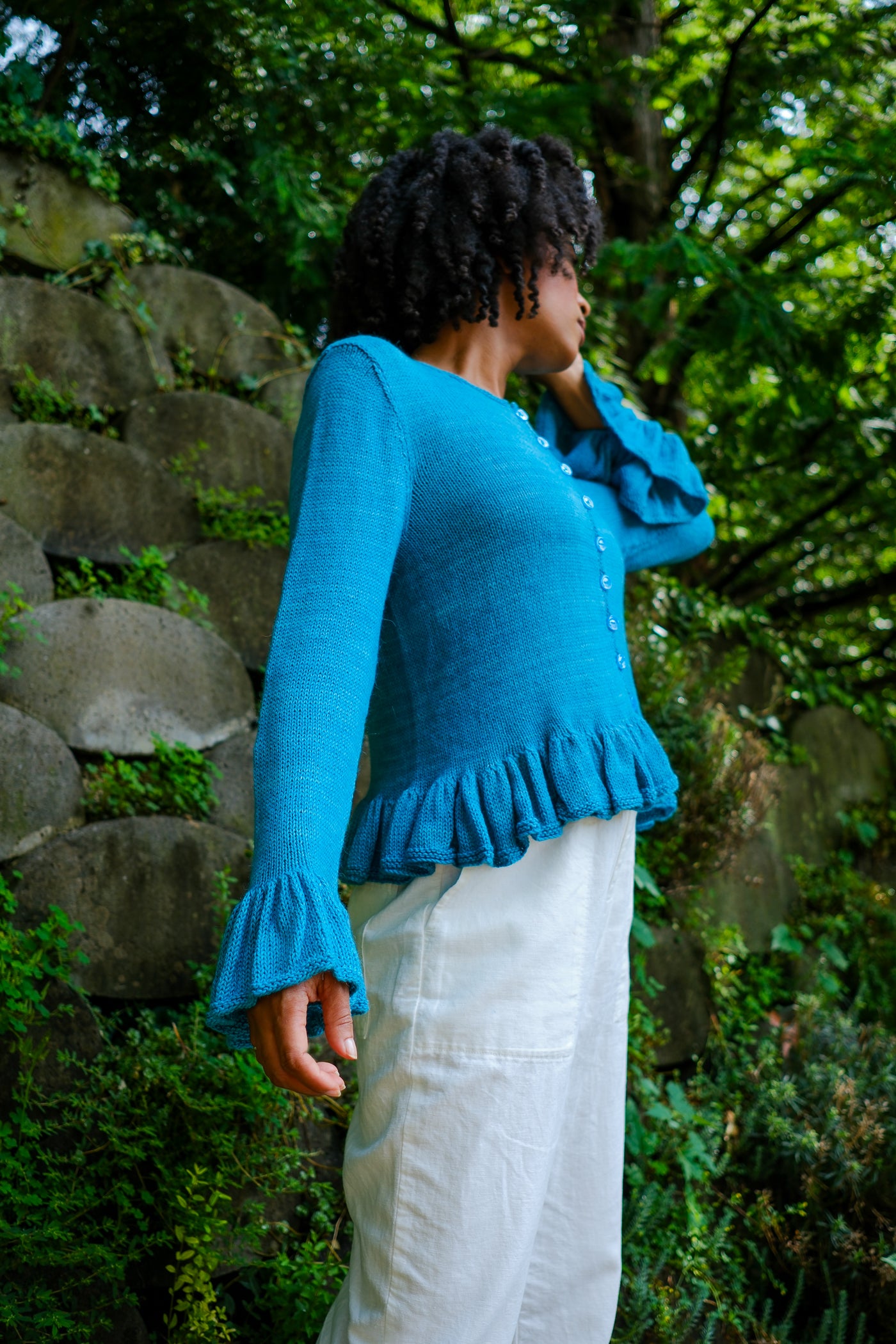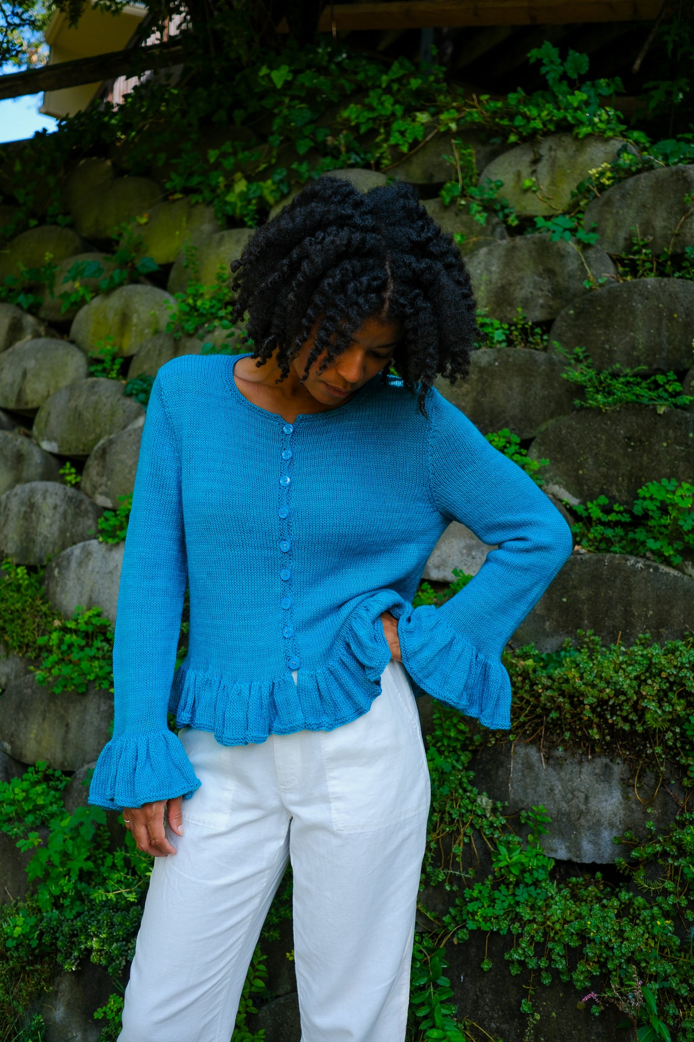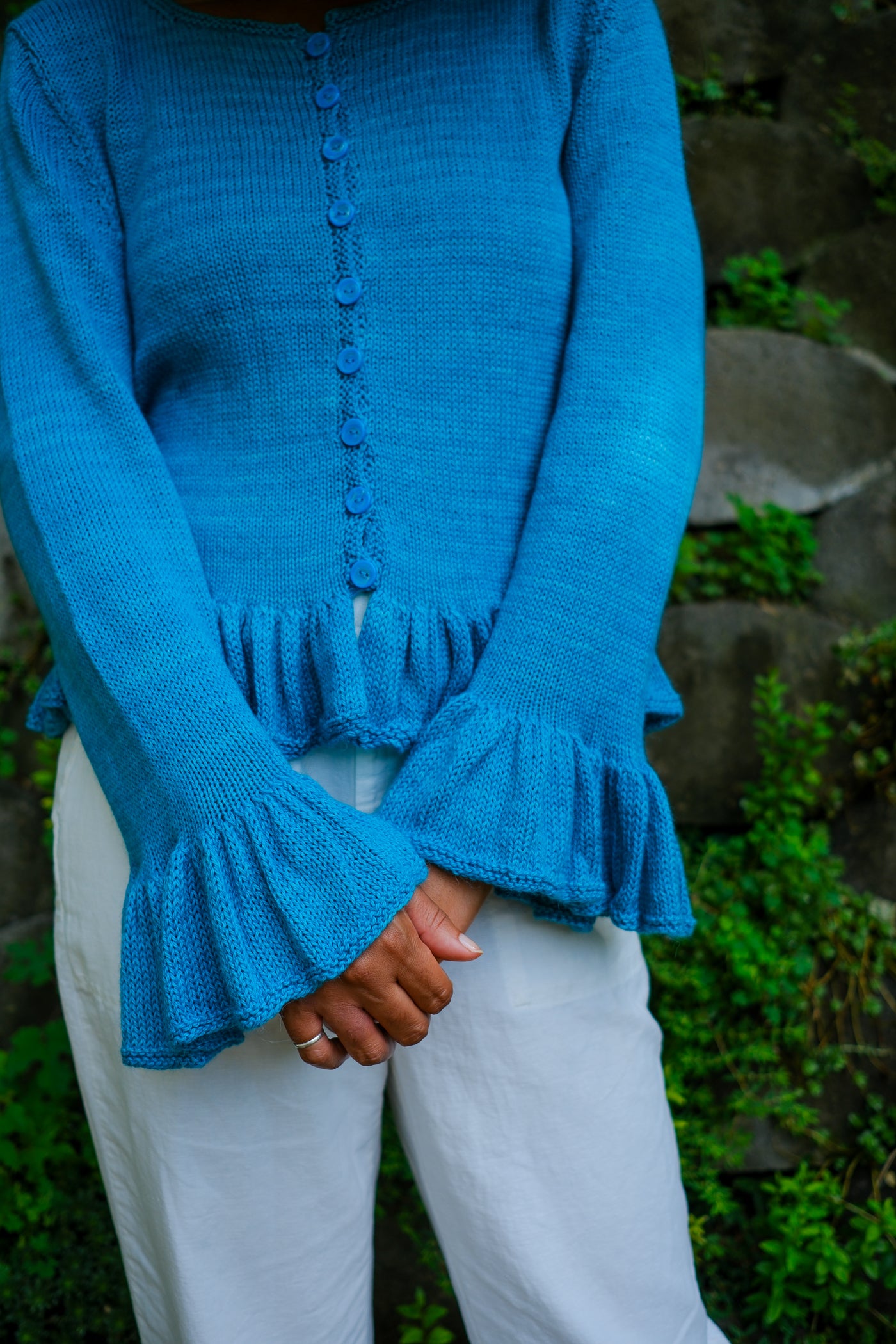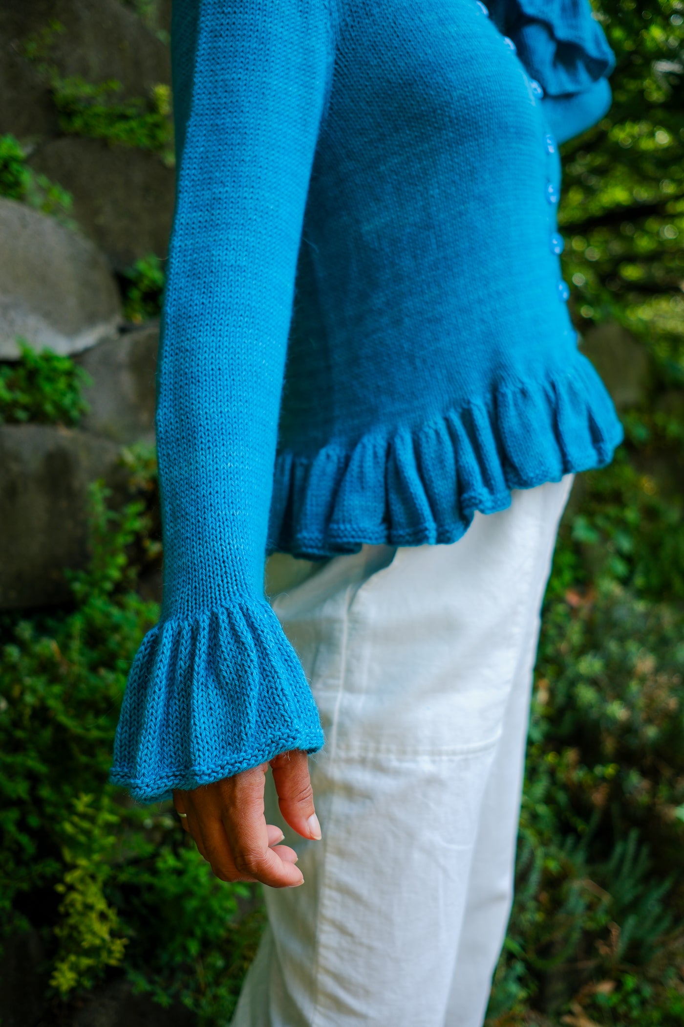 Sardinia is a cardigan that can be worn open as a second layer or closed as a first. Larger needles keep the ruffles soft with maximum drape; smaller needles and a firmer gauge make the body of the garment crisp in contrast.