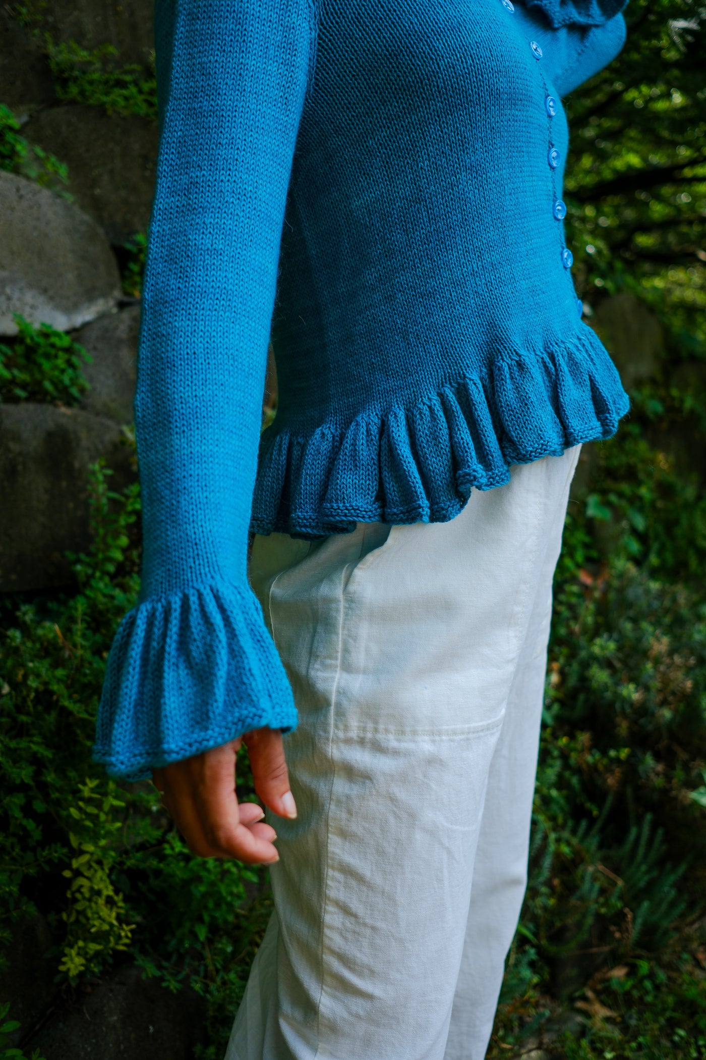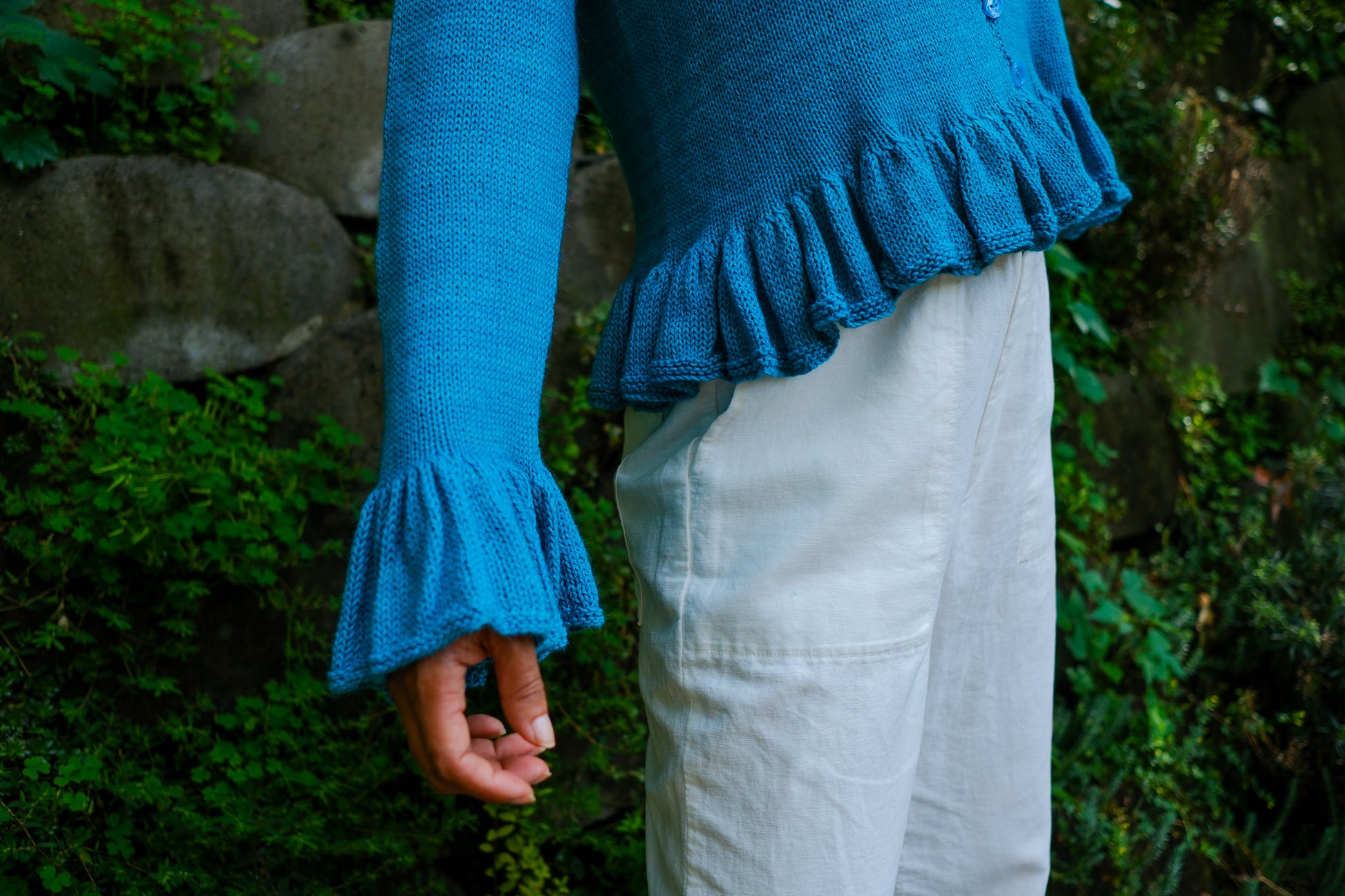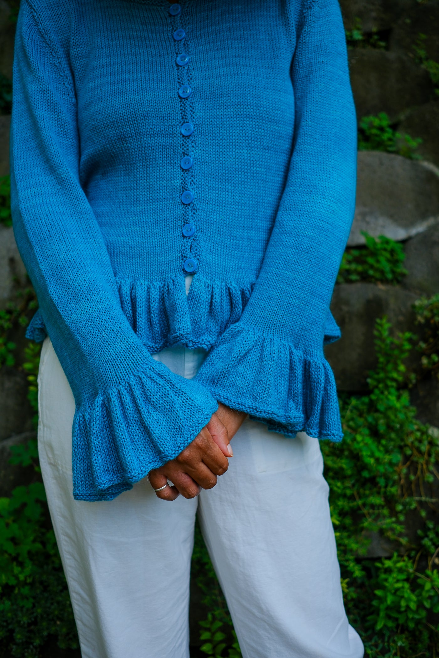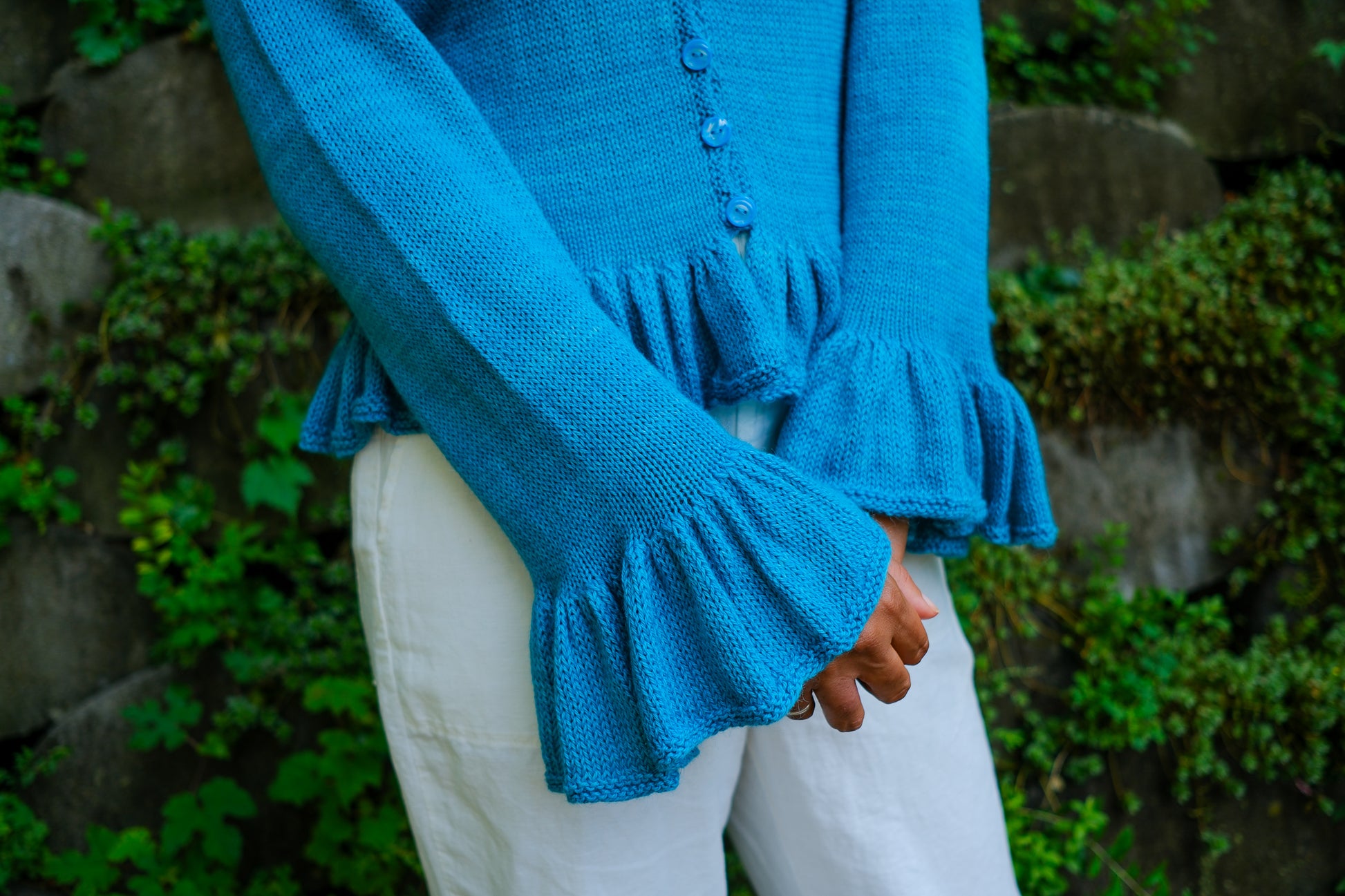 Sardinia is a cardigan that can be worn open as a second layer or closed as a first. Larger needles keep the ruffles soft with maximum drape; smaller needles and a firmer gauge make the body of the garment crisp in contrast.