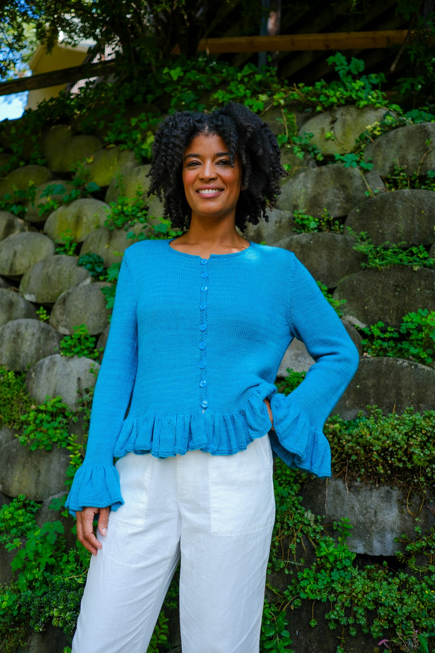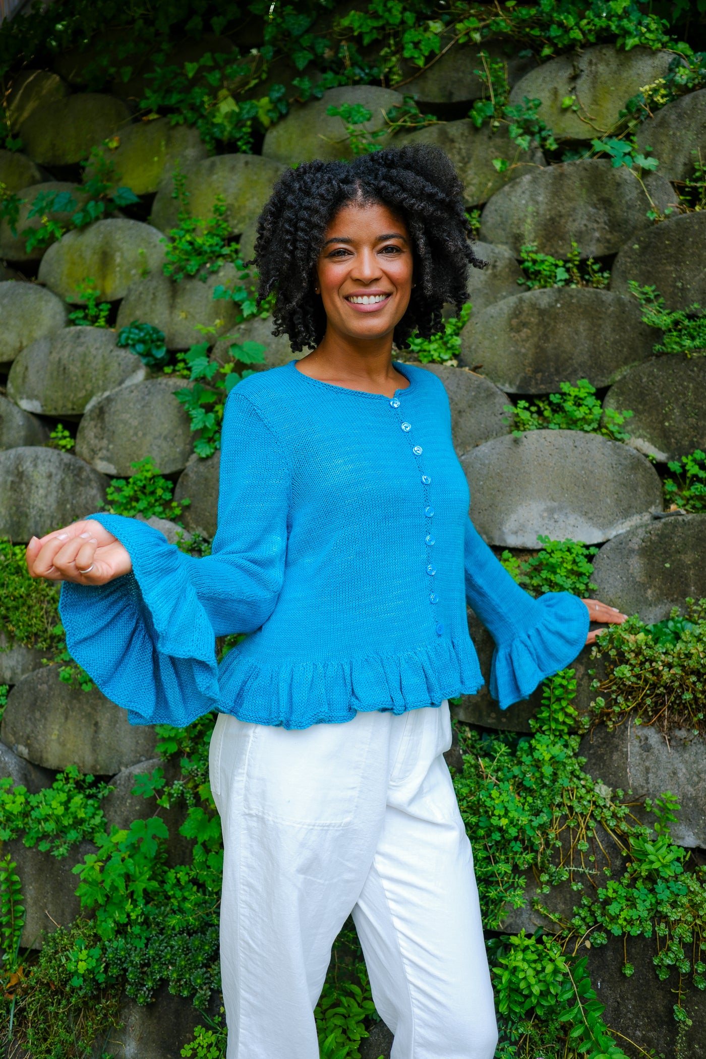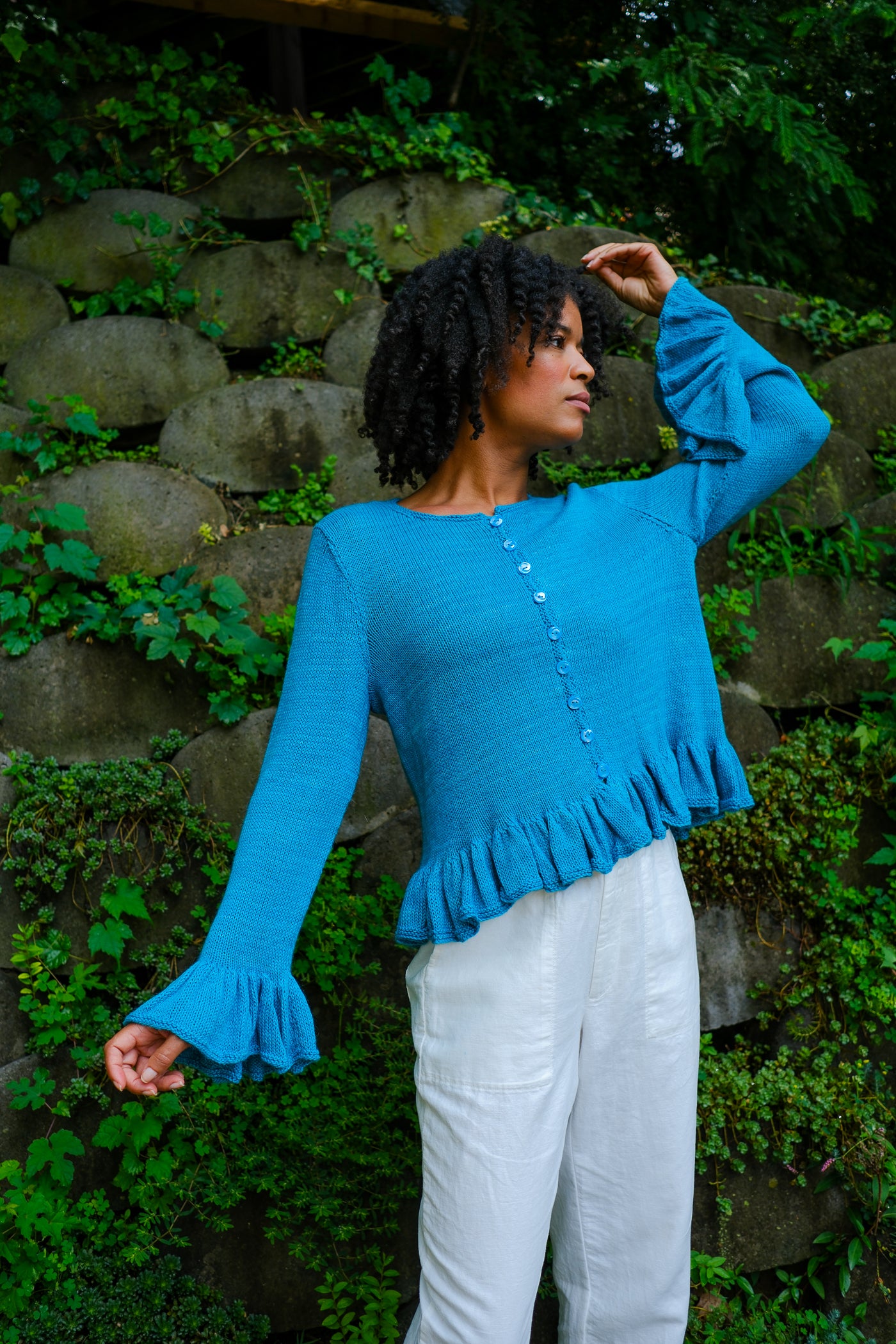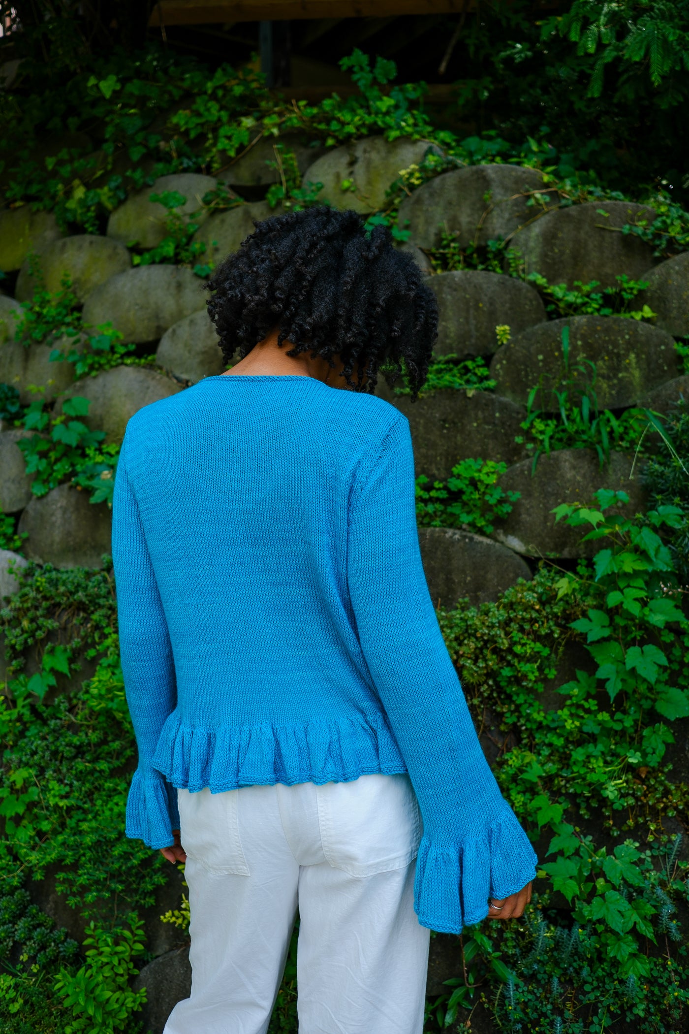 Sardinia is a cardigan that can be worn open as a second layer or closed as a first. Larger needles keep the ruffles soft with maximum drape; smaller needles and a firmer gauge make the body of the garment crisp in contrast.