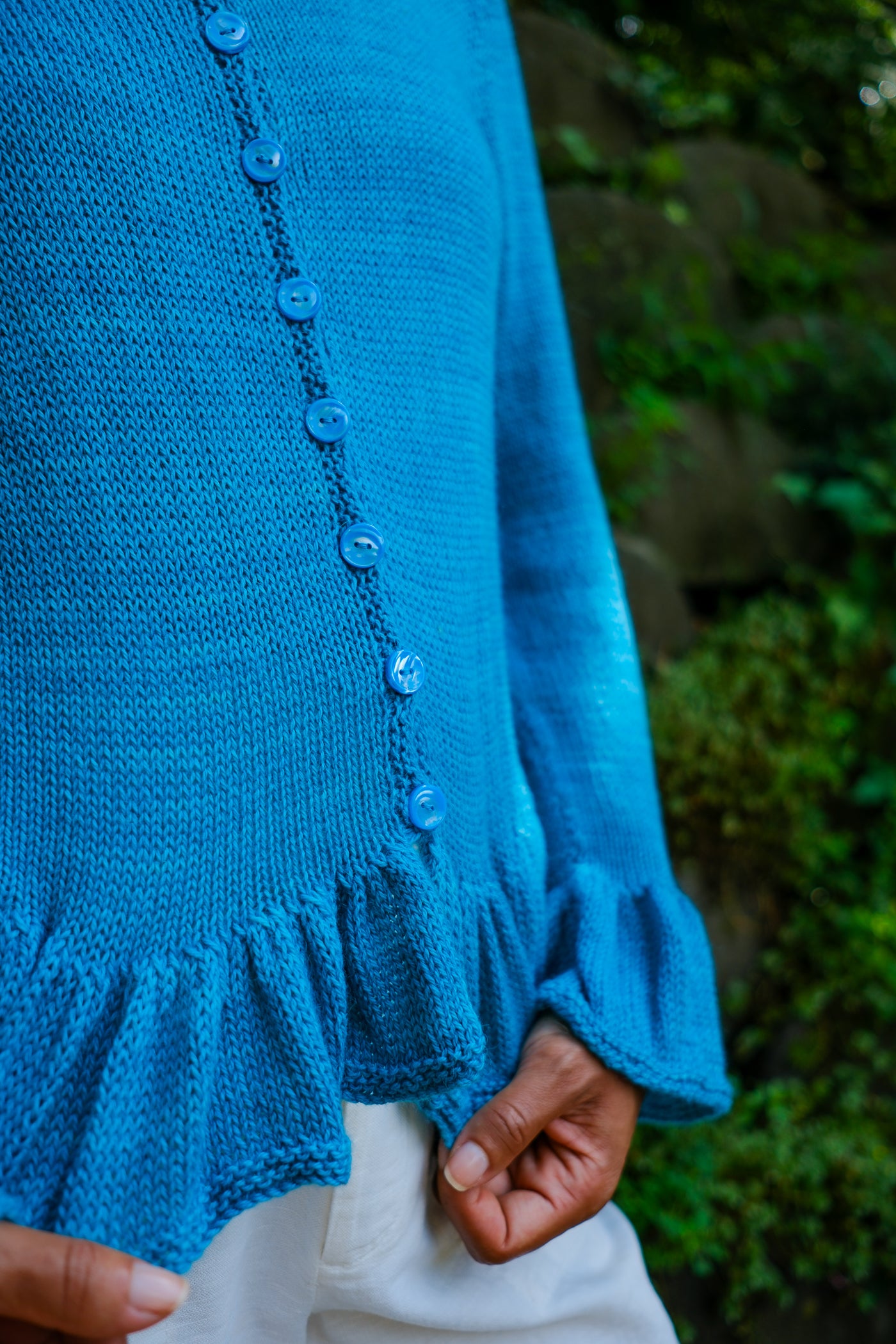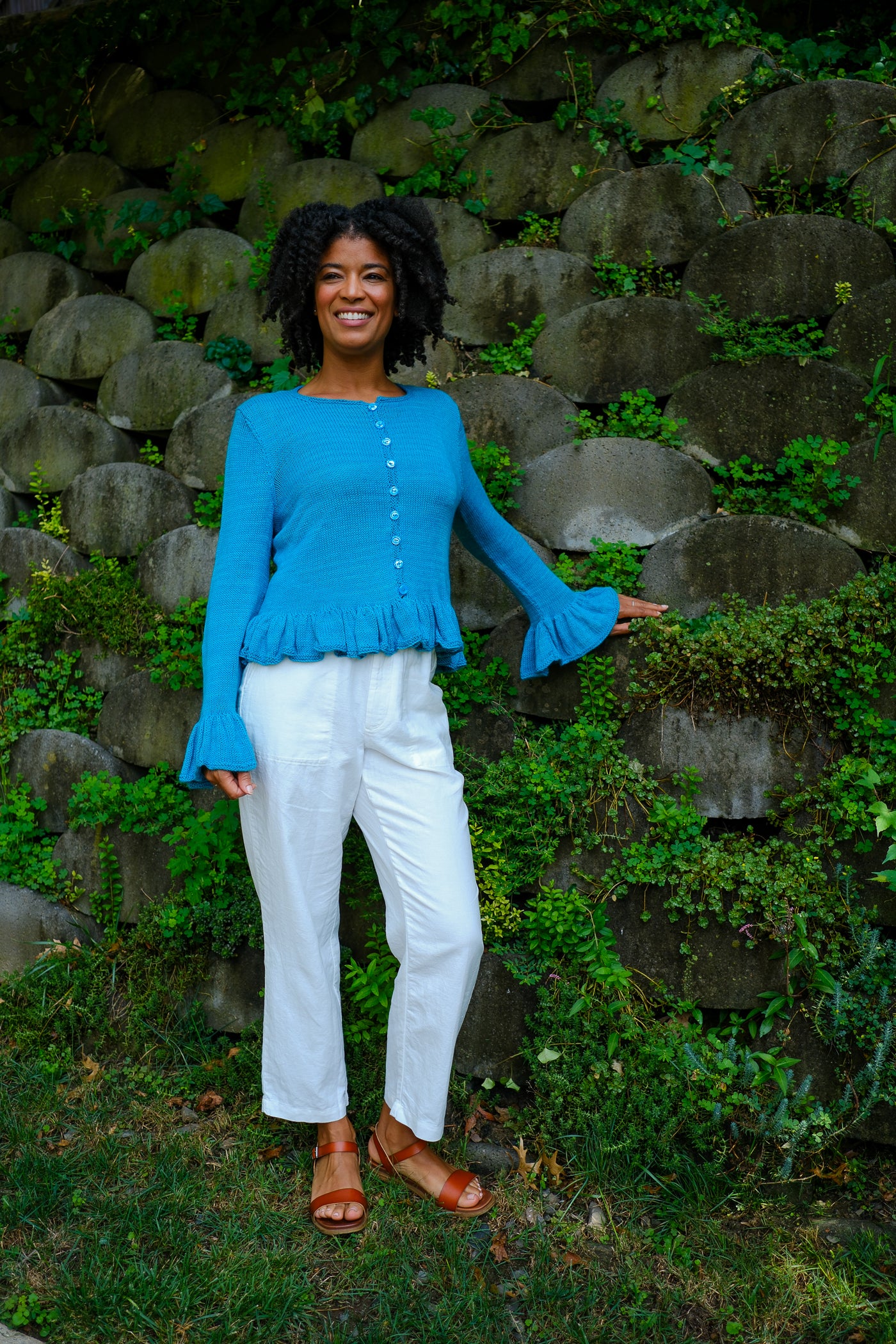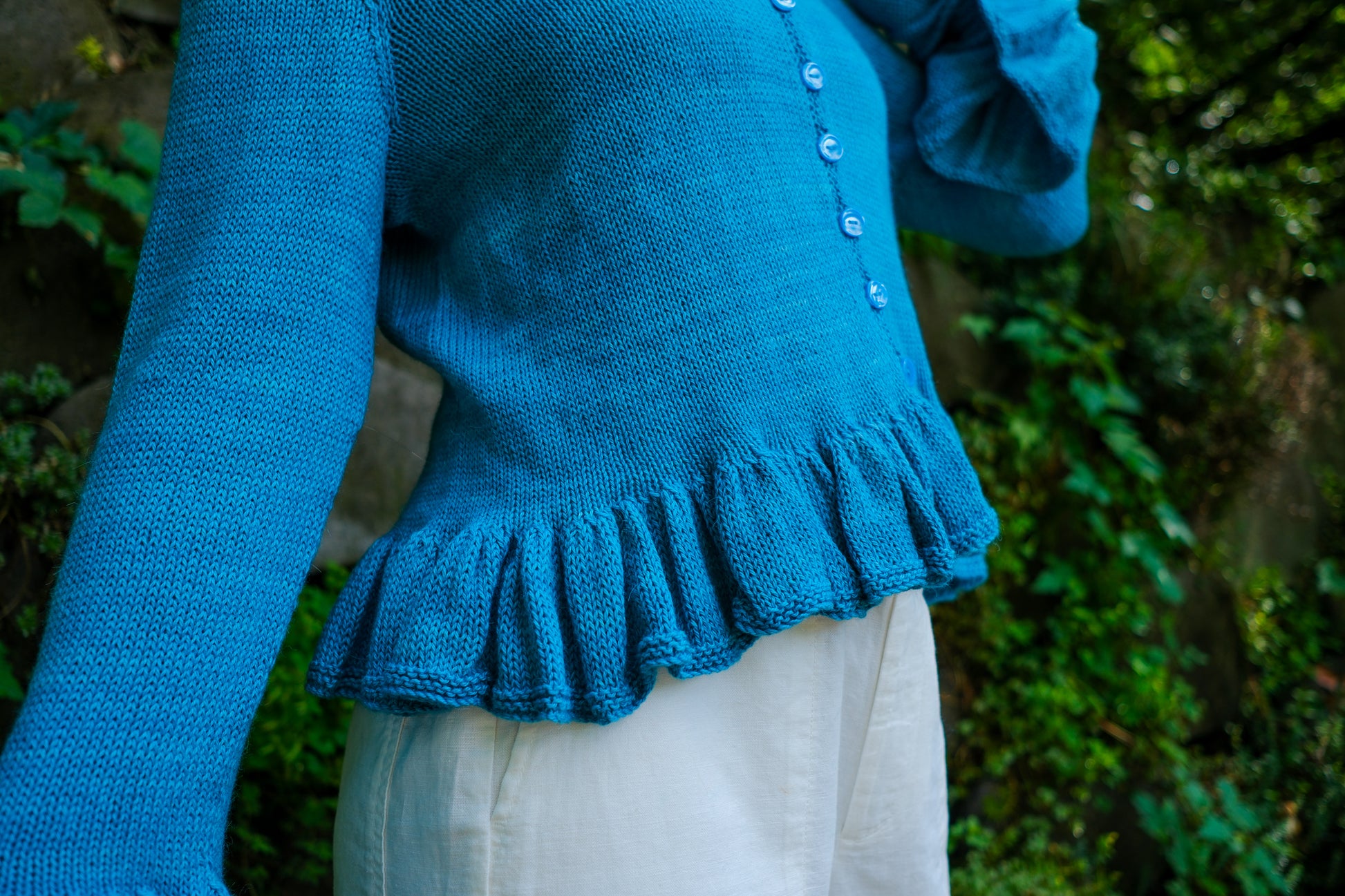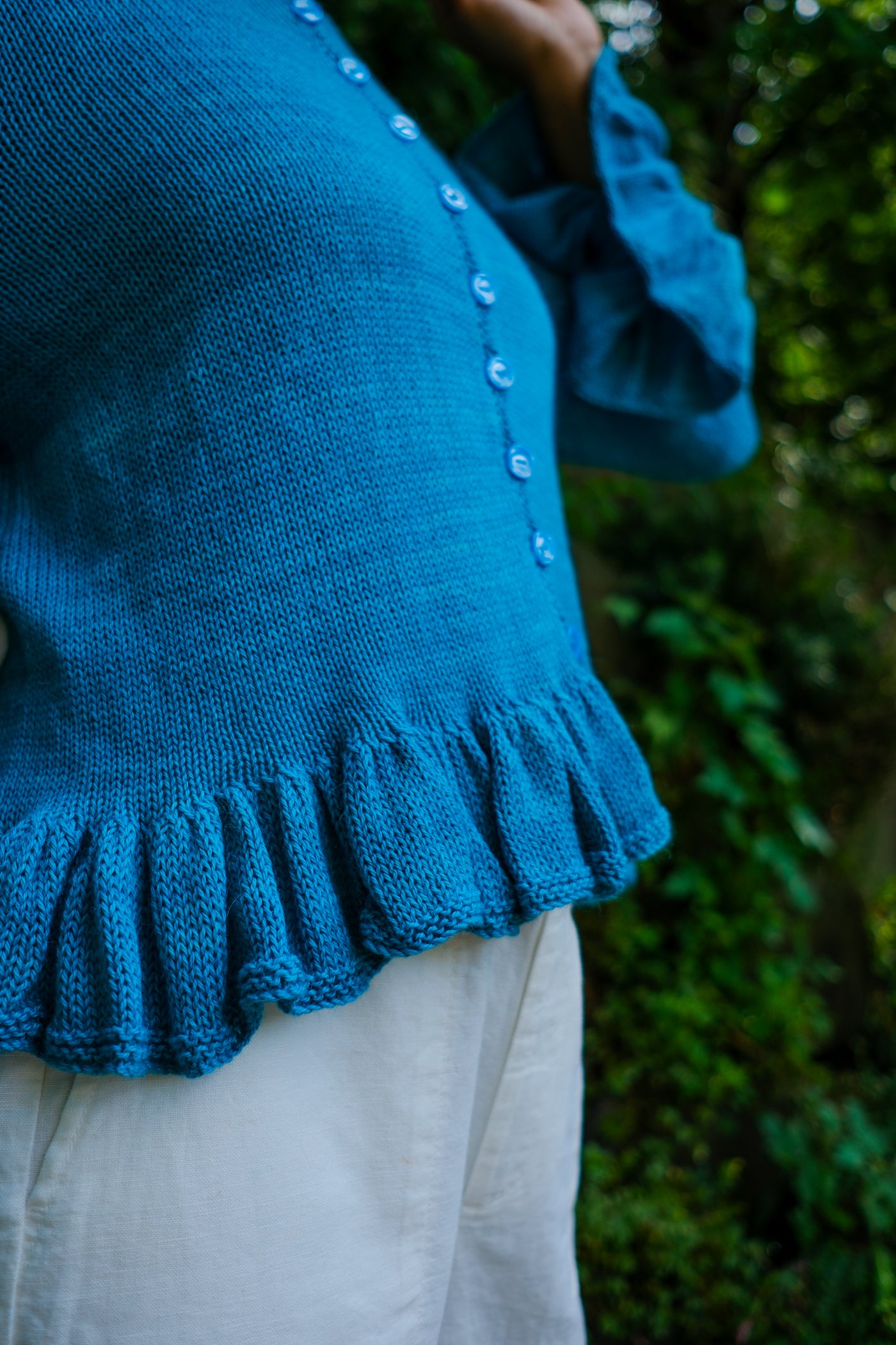Sardinia is a cardigan that can be worn open as a second layer or closed as a first. Larger needles keep the ruffles soft with maximum drape; smaller needles and a firmer gauge make the body of the garment crisp in contrast.