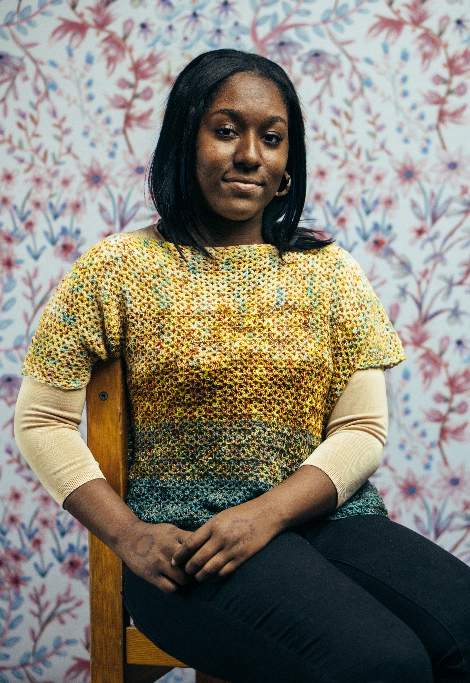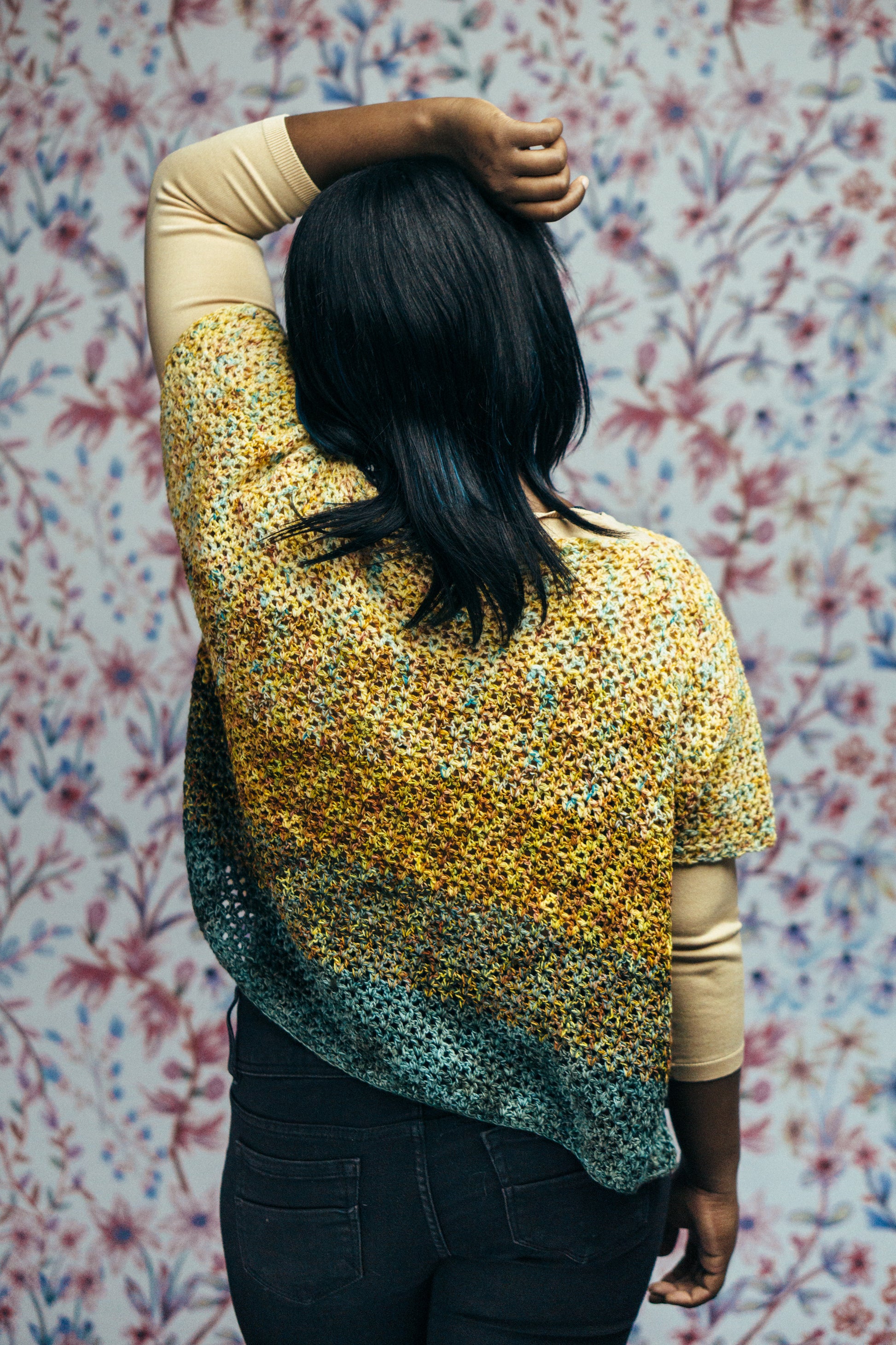 This crocheted poncho is all about the fabric. Two strands of Marina held together in an easy mesh stitch produce an airy garment with excellent drape; they also allow a subtle fade from one color to another. Choose 3 colorways that have a hue in common, or go bolder with 3 totally independent shades. We chose the Harvest Moon kit, one of 5 Gradiente Kits to choose from!