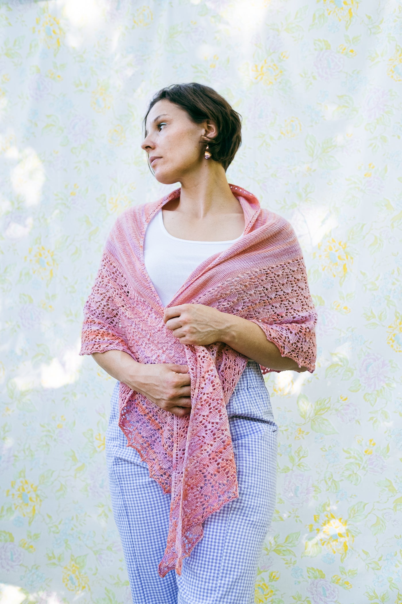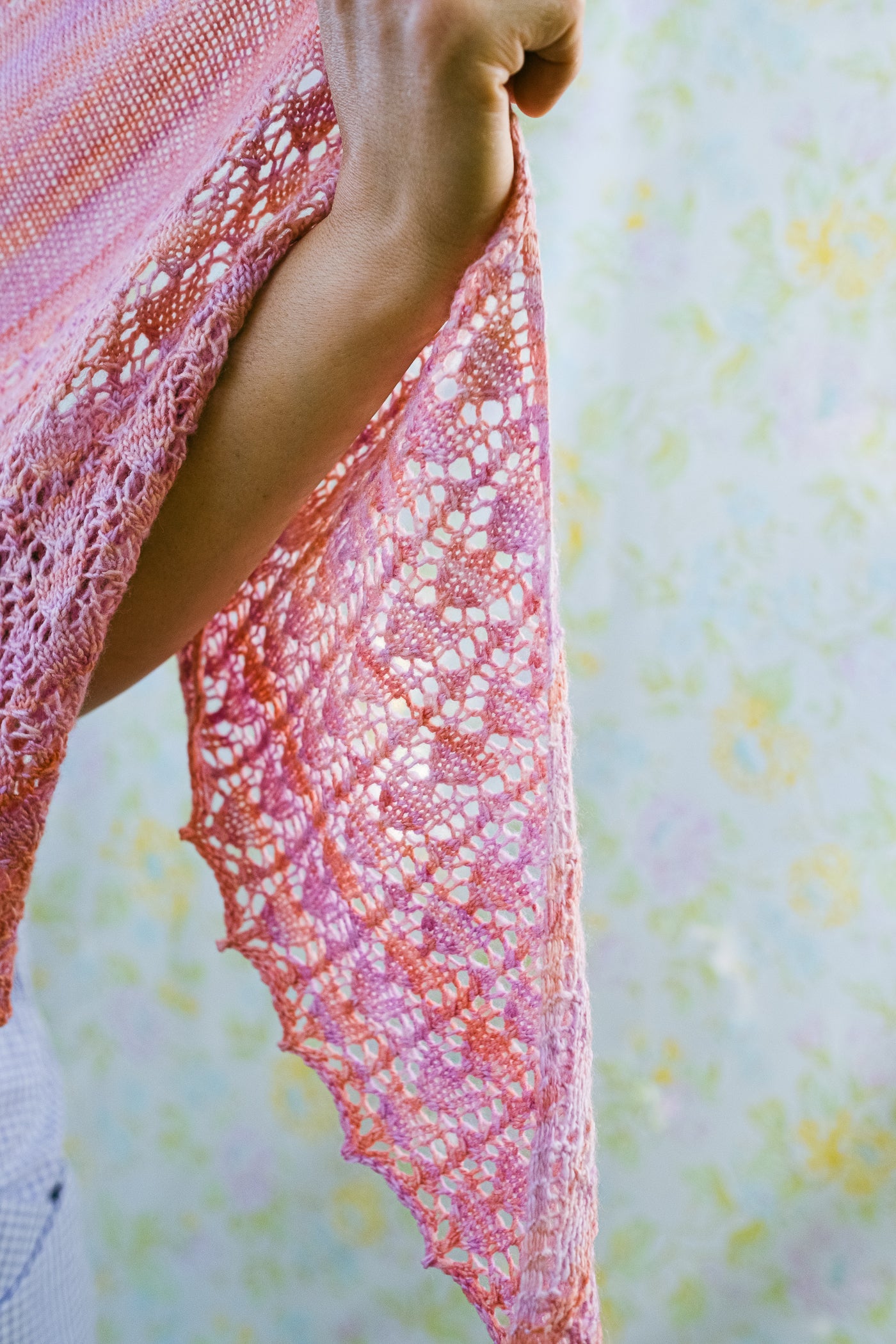 After increasing to the specified number of stitches, the shawl finishes with a simple lace border resembling tiny tulips. The piece shown has eleven repeats of the 8-row border pattern, but you can work more or fewer repeats for a larger or smaller shawl. You may need to buy extra yarn if making a significantly larger shawl.