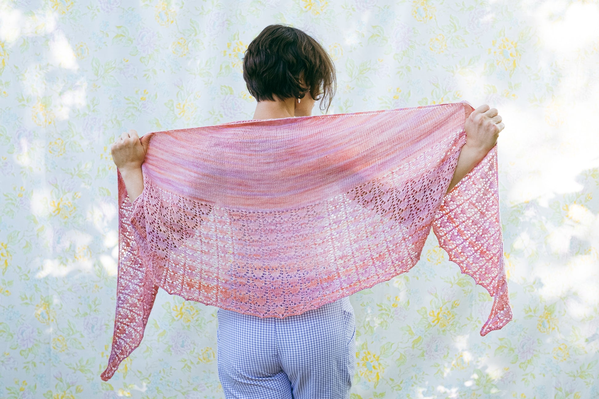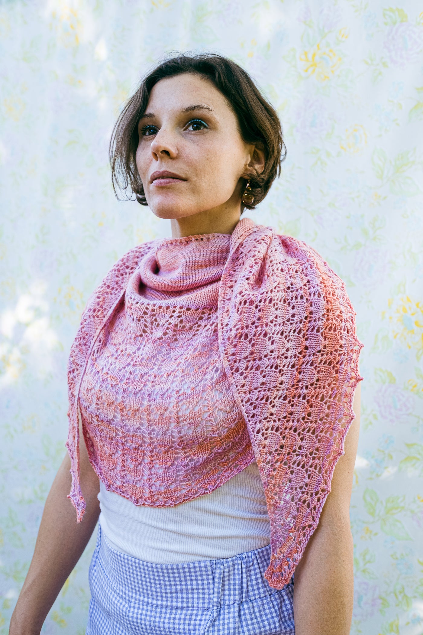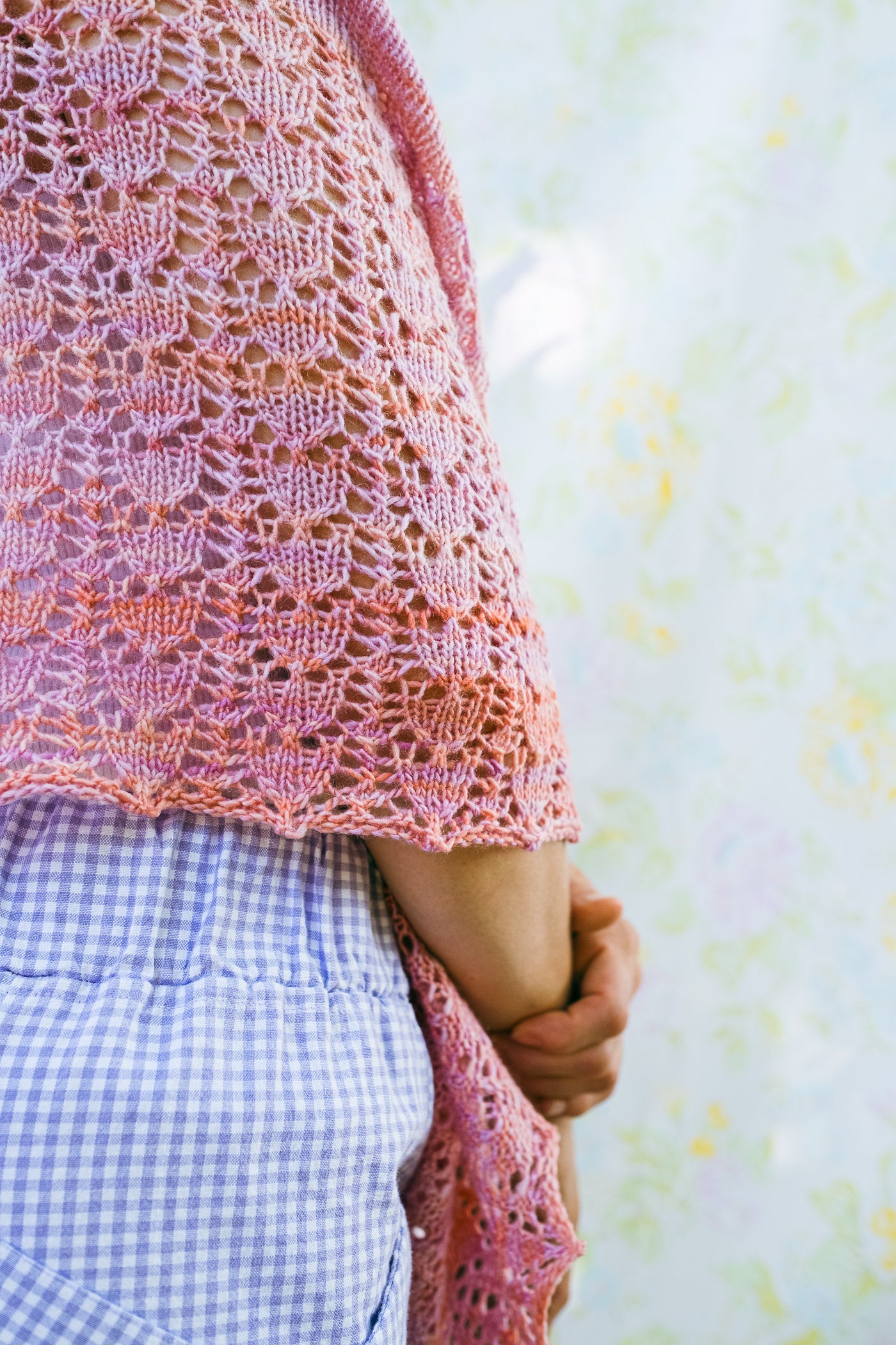 This is a crescent-shaped shawl. It begins with a garter tab cast-on followed by rows of stockinette stitch with increases worked at each end of both RS and WS rows.