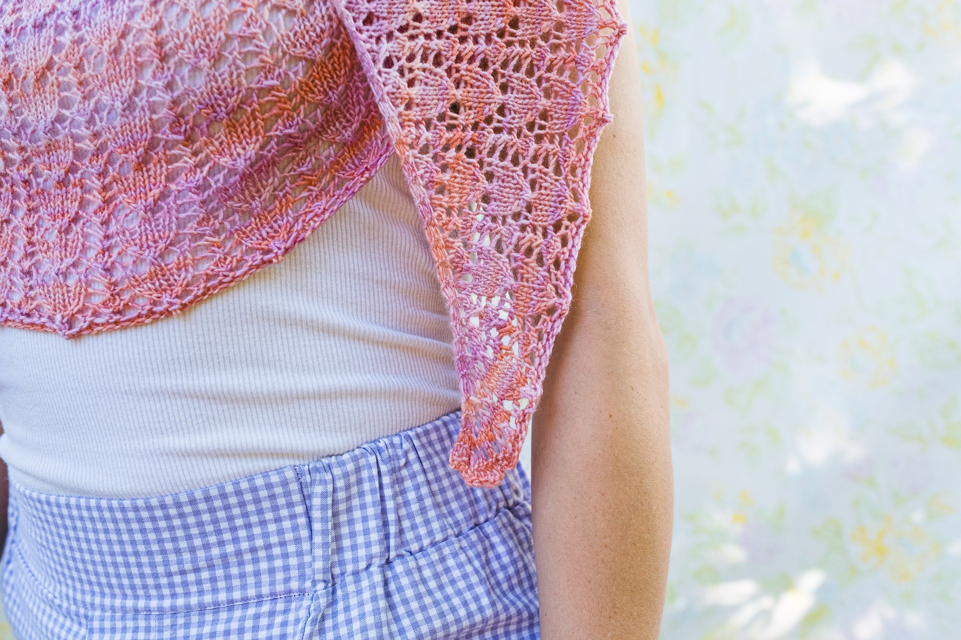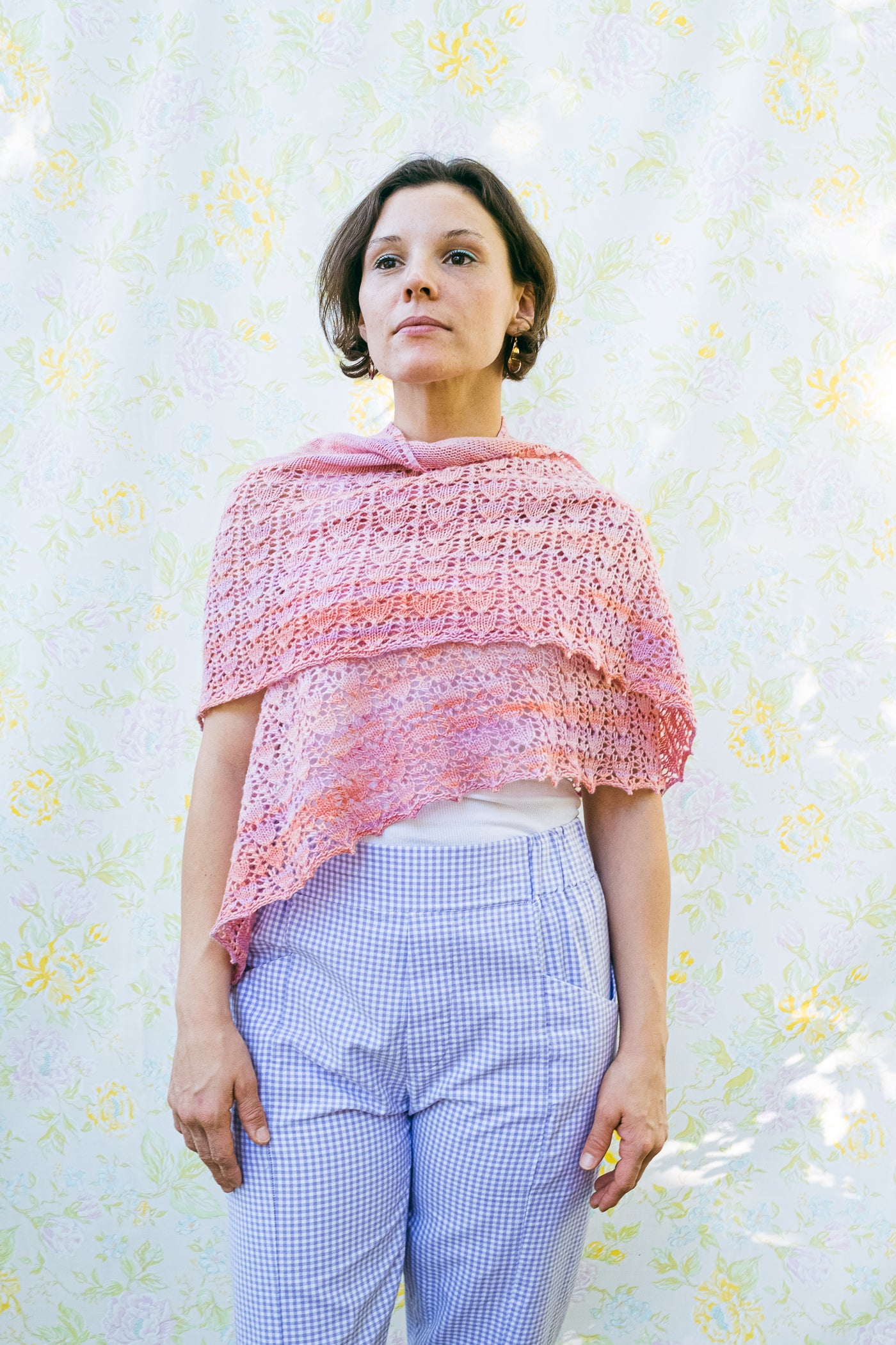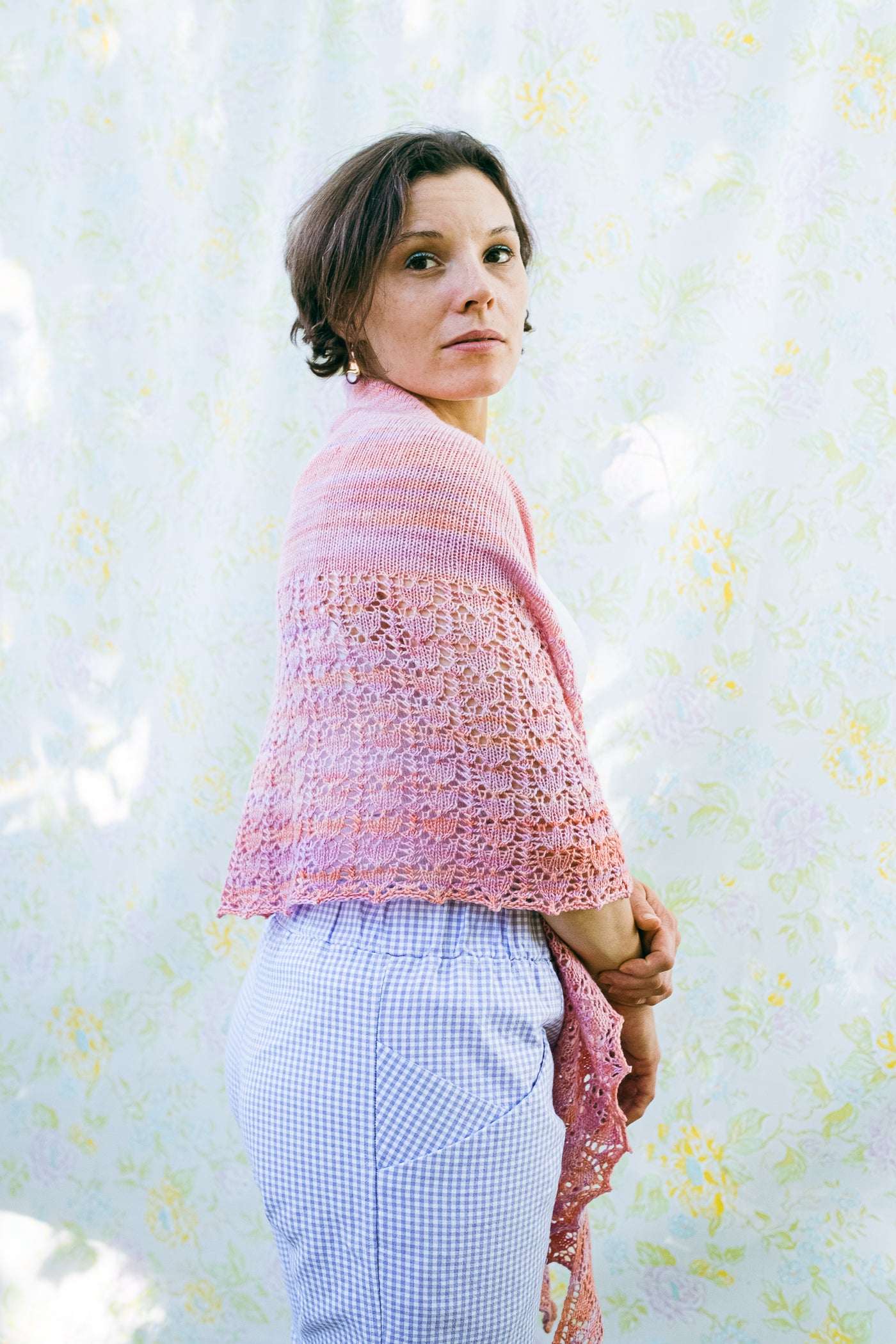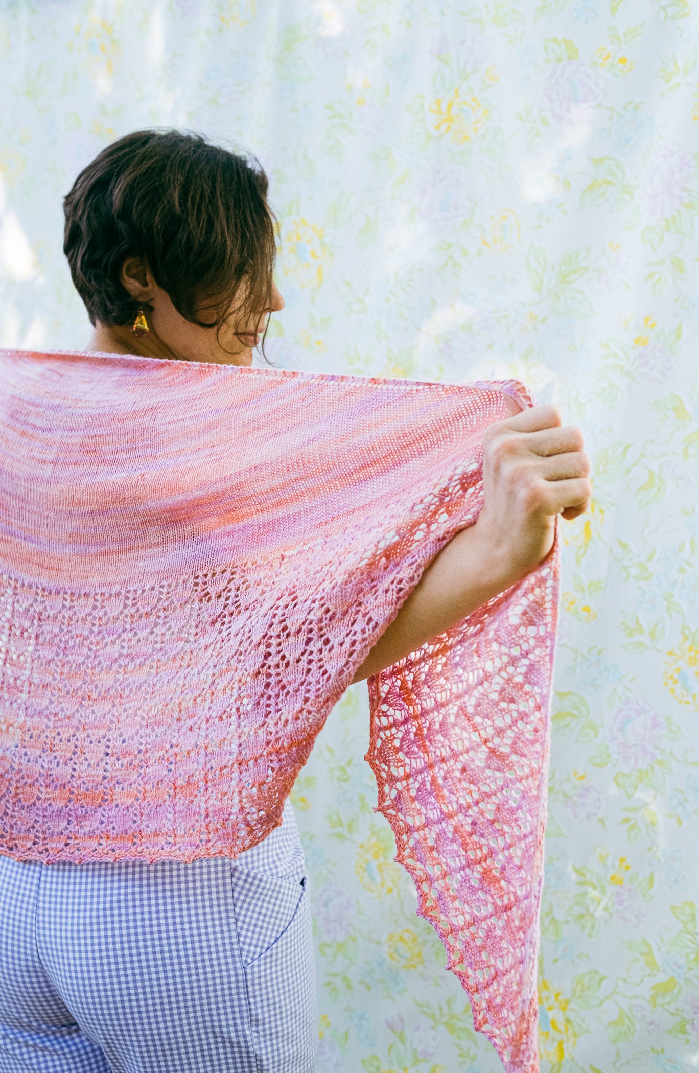 This is a crescent-shaped shawl. It begins with a garter tab cast-on followed by rows of stockinette stitch with increases worked at each end of both RS and WS rows.