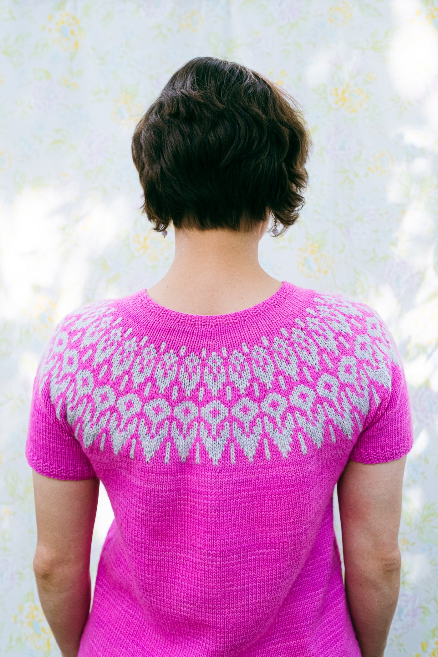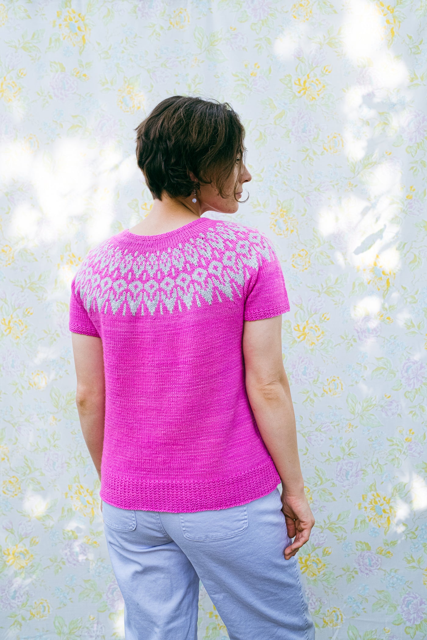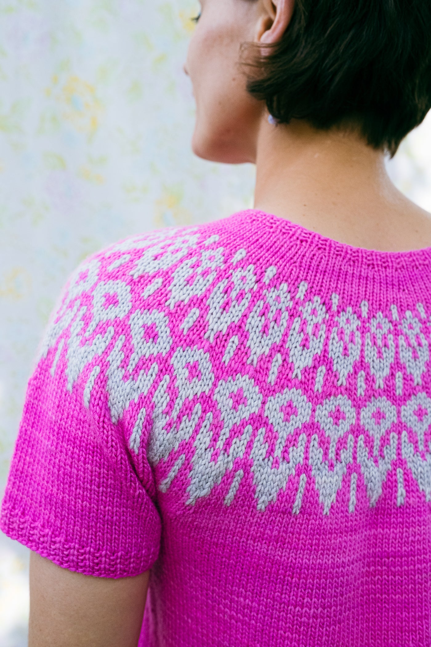 This short-sleeved circular yoke pullover is worked in the round from the top down.