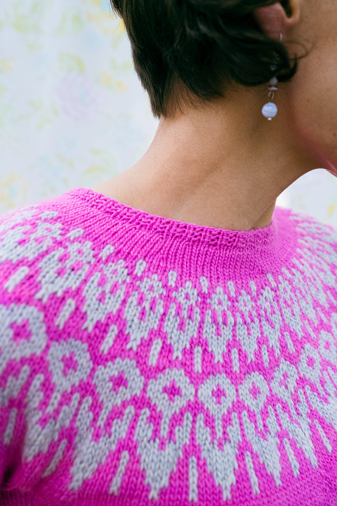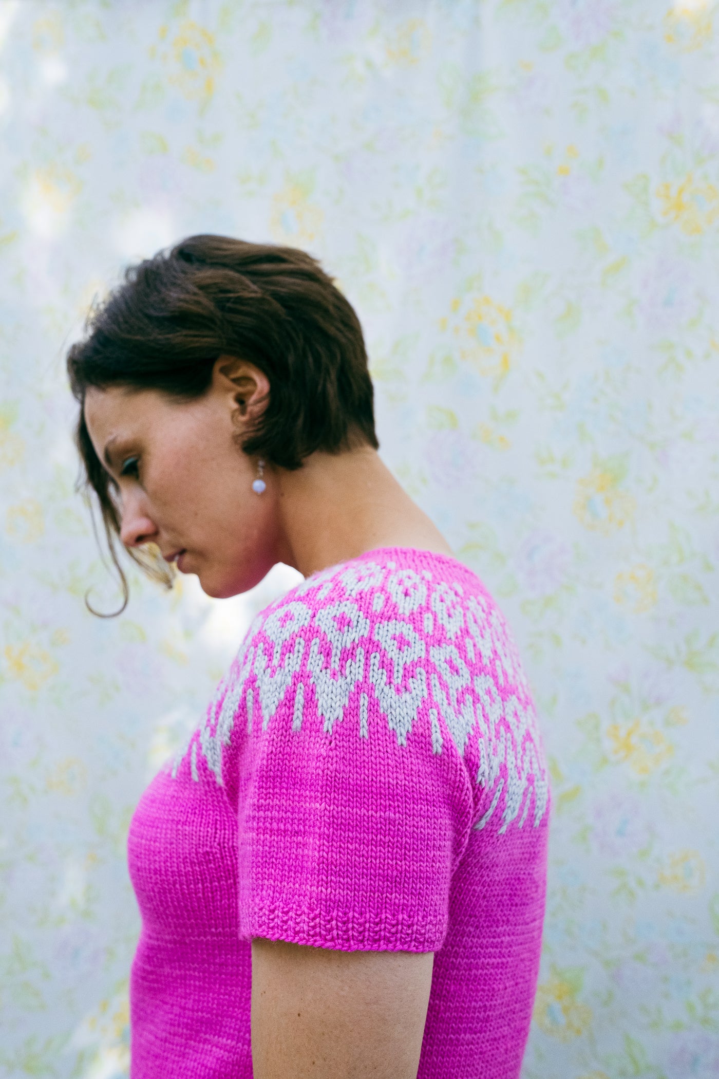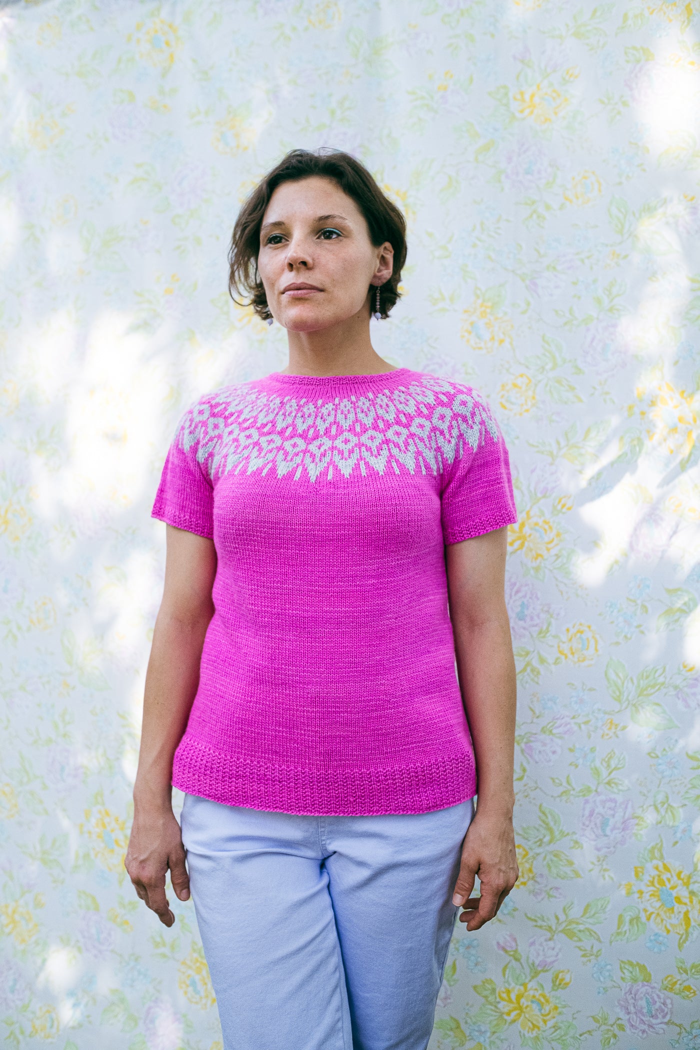 This short-sleeved circular yoke pullover is worked in the round from the top down.