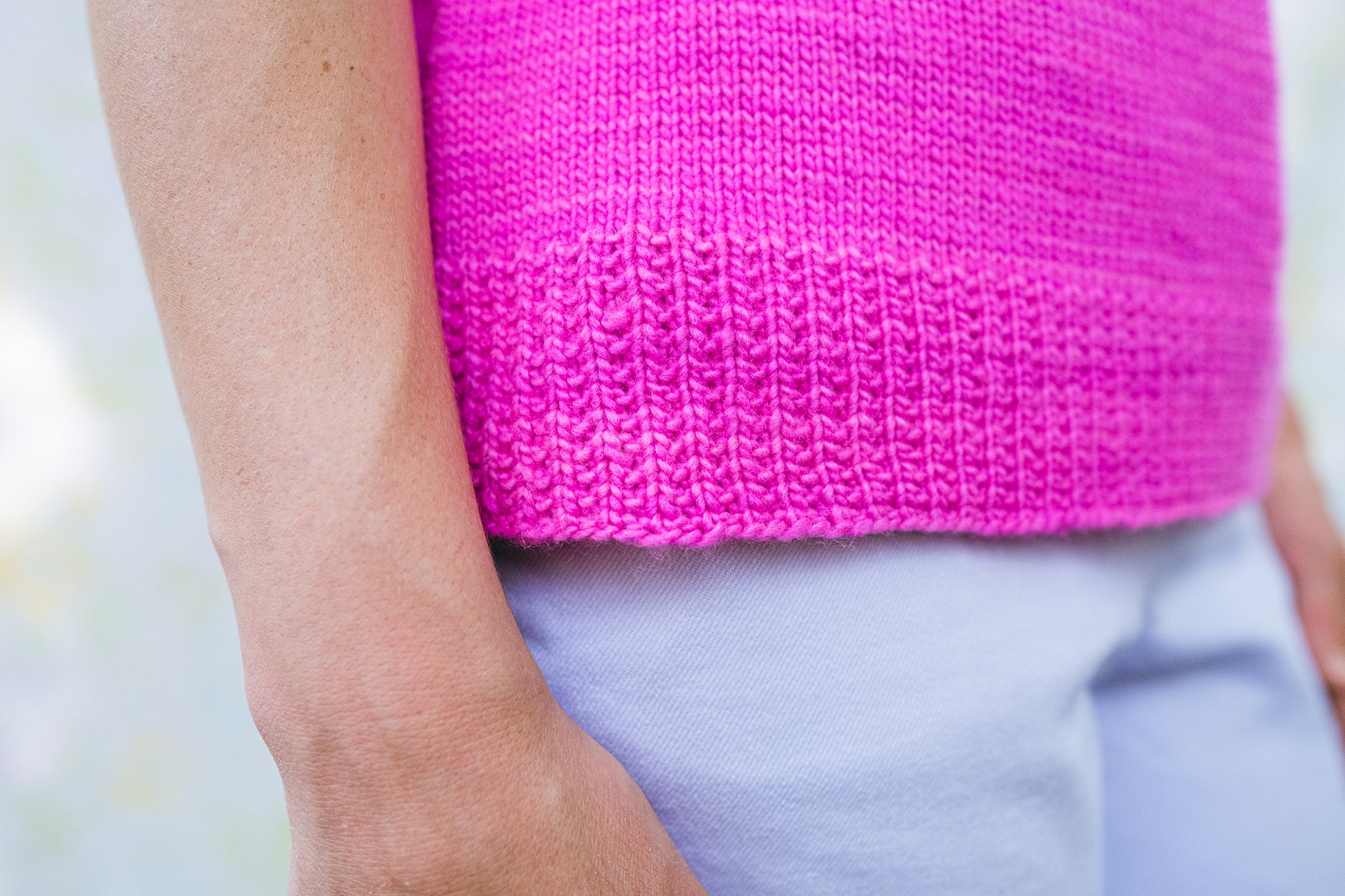Two shaping choices are provided for the lower body. The first is a no-shaping option where the lower body is a straight tube having the same number of stitches at the lower edge and bust. The second choice is a slight A-line option used for the sweater shown with a hip circumference 2¾” to 4” larger than the bust circumference, depending on size.