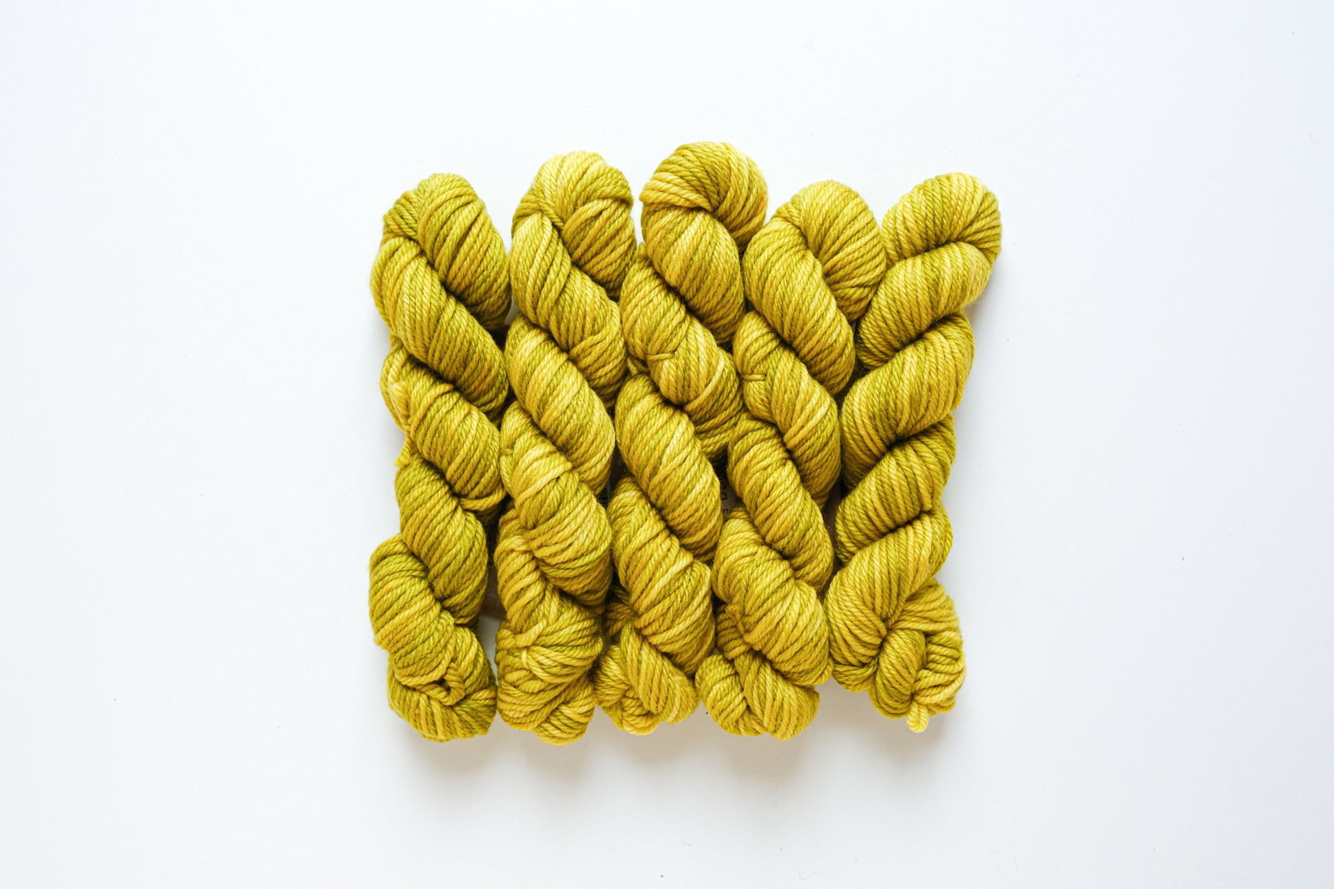 Alegria Grande Bocados, Spanish for ‘little bites,’ are just right for colorwork! Available in a rainbow of colors to coordinate with both semi-solids and space-dyed shades.