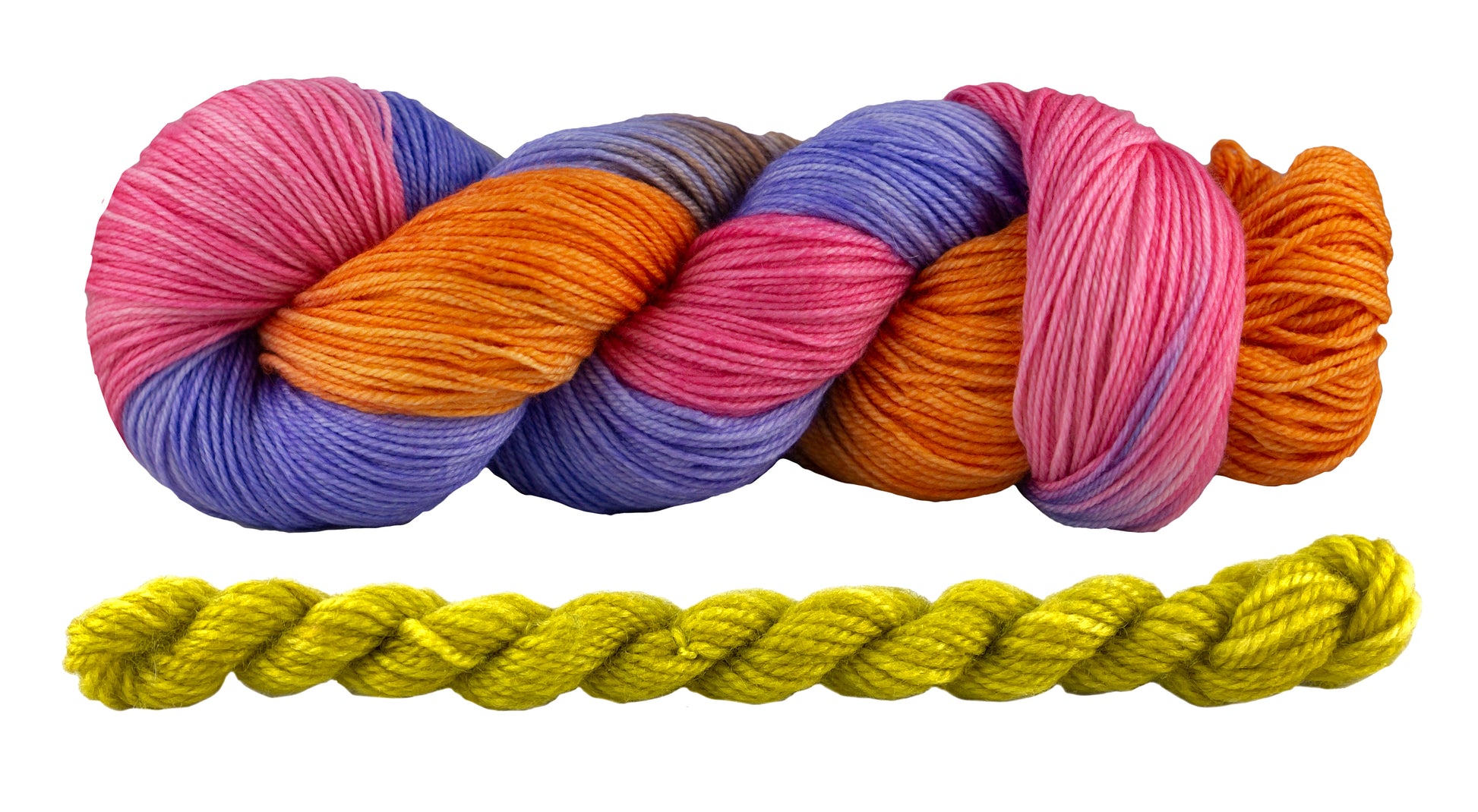 Each Superpool Kit comes with a mini-skein of an accent colors for heels, toes, or any part of a sock. The mini-skein is 20g / 89yds. The two come tied together with a paper cord bow (pictured).