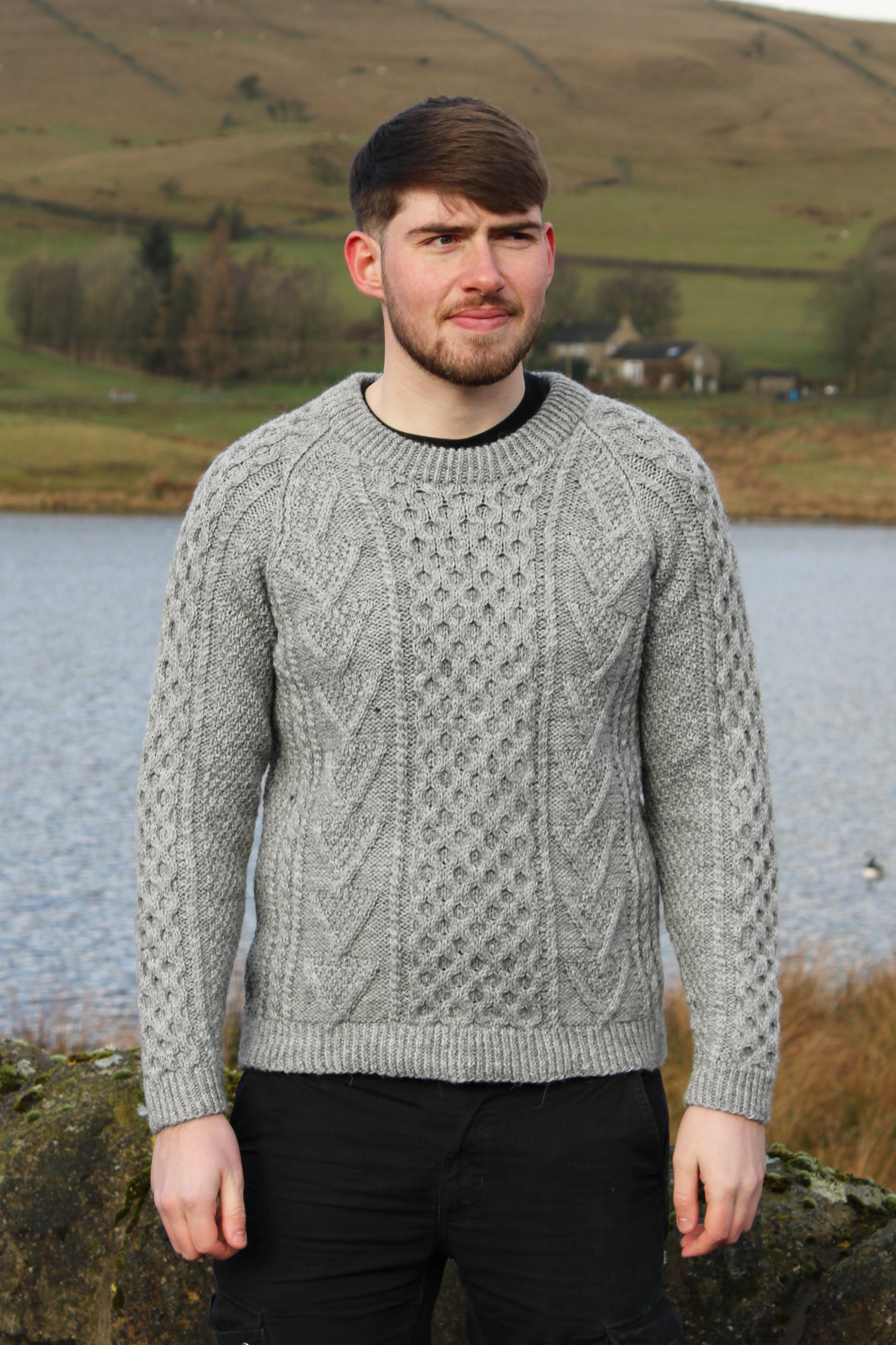 Cillian is a traditional Aran sweater pattern. It features the Honeycomb stitch, which is thought to have symbolised the hard-working bees and was said to have brought luck and abundance of catch to the fishermen at sea. This sweater was designed using our Coast yarn. This yarn is sold on 200g hanks, perfect for an all-over textured sweater.