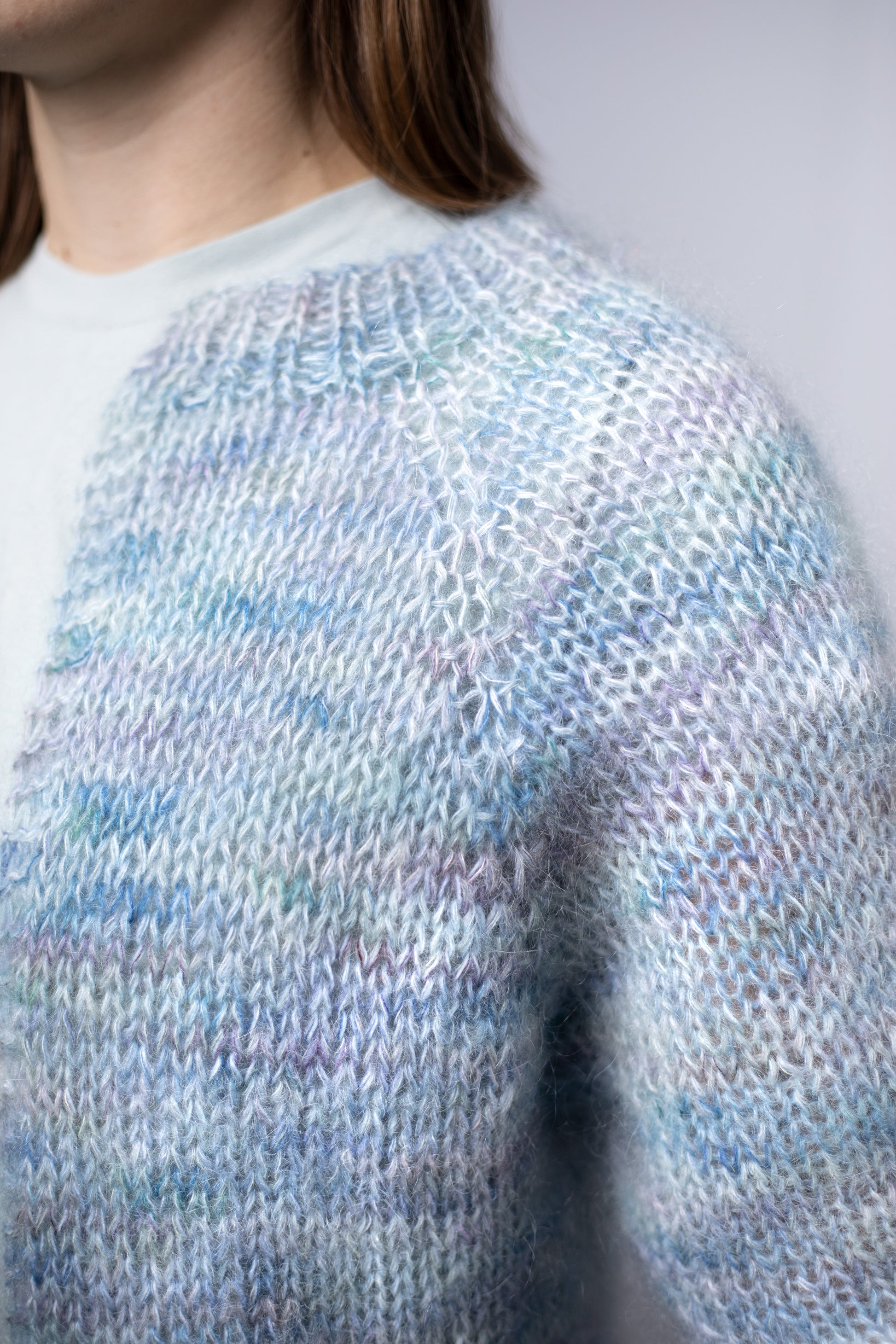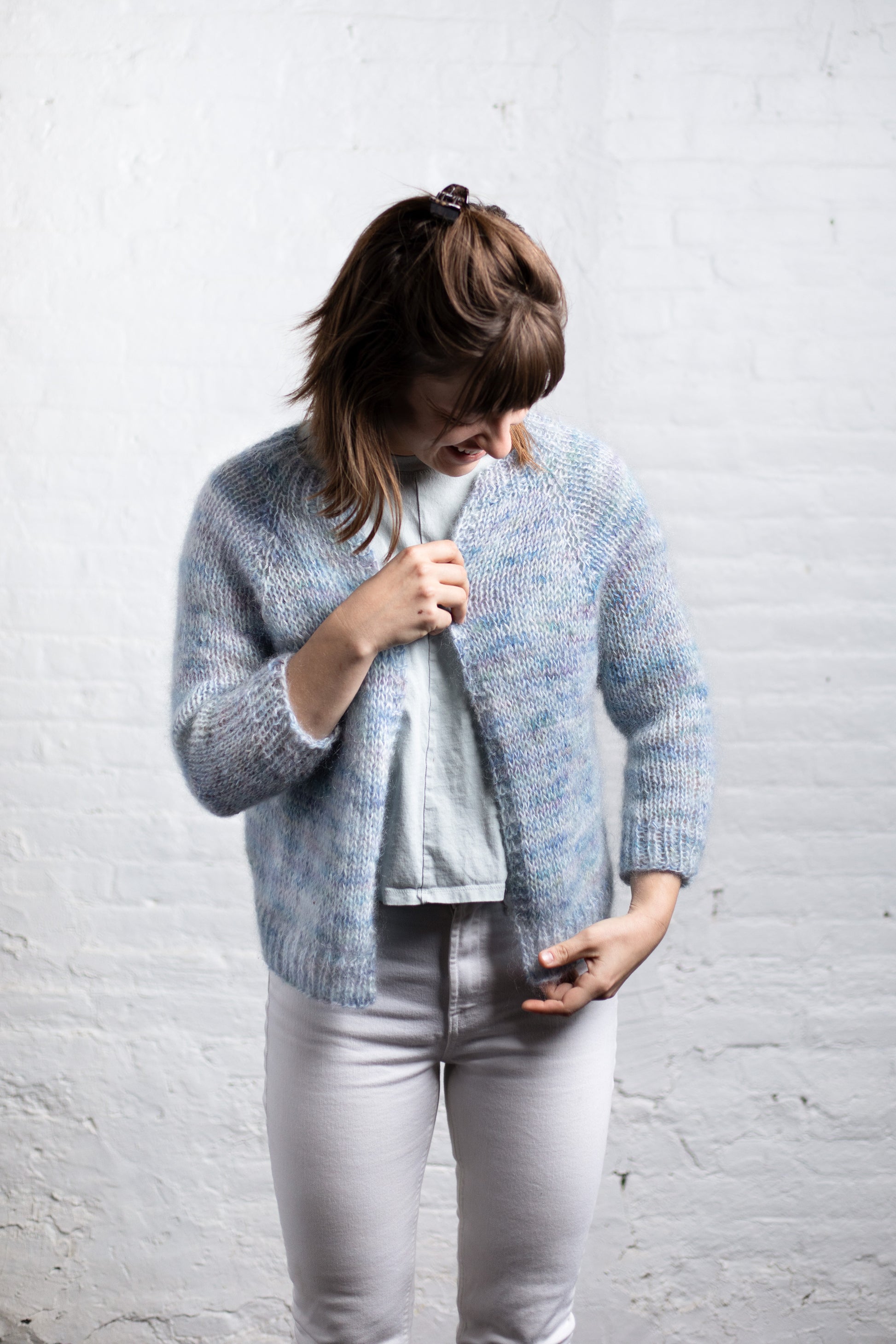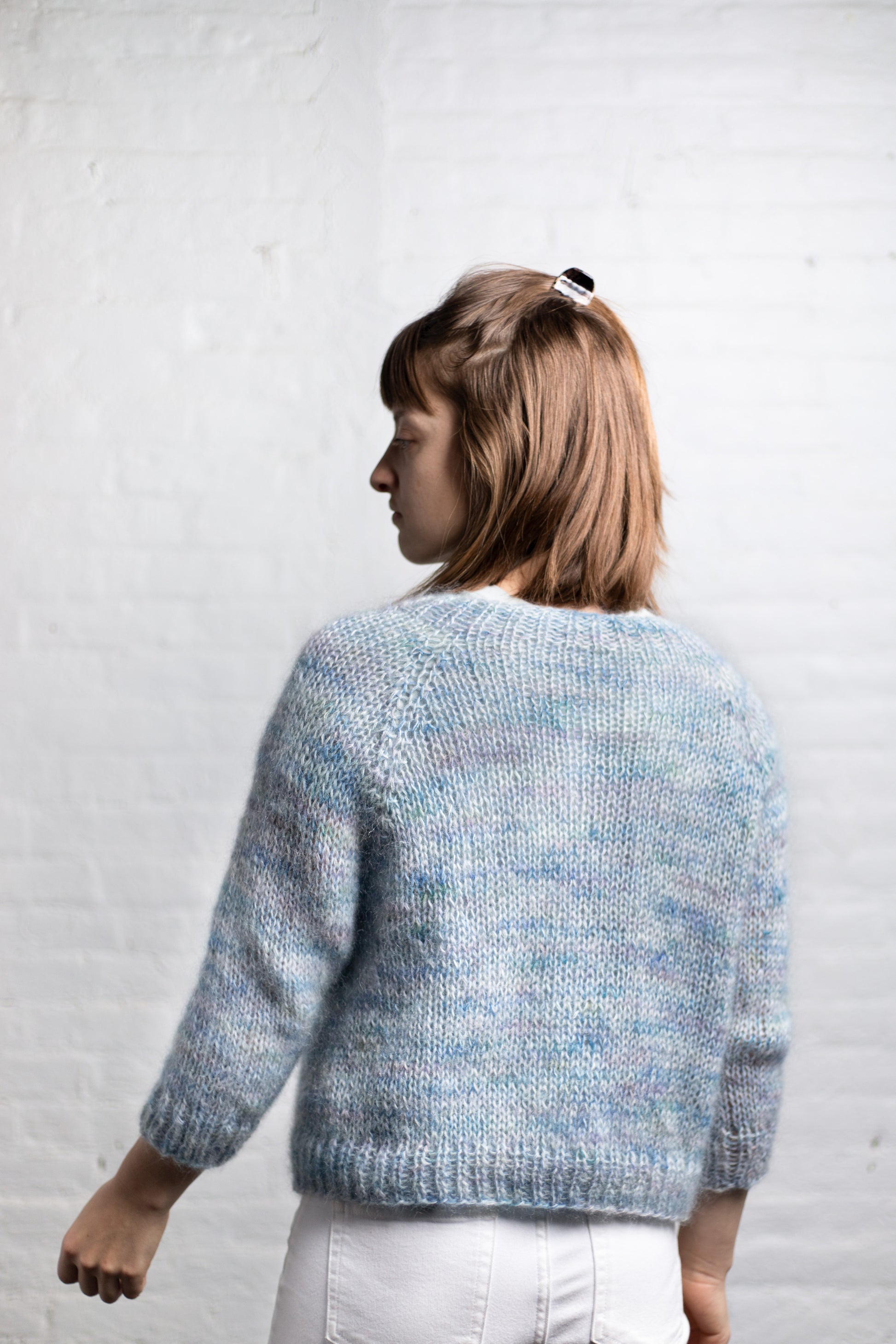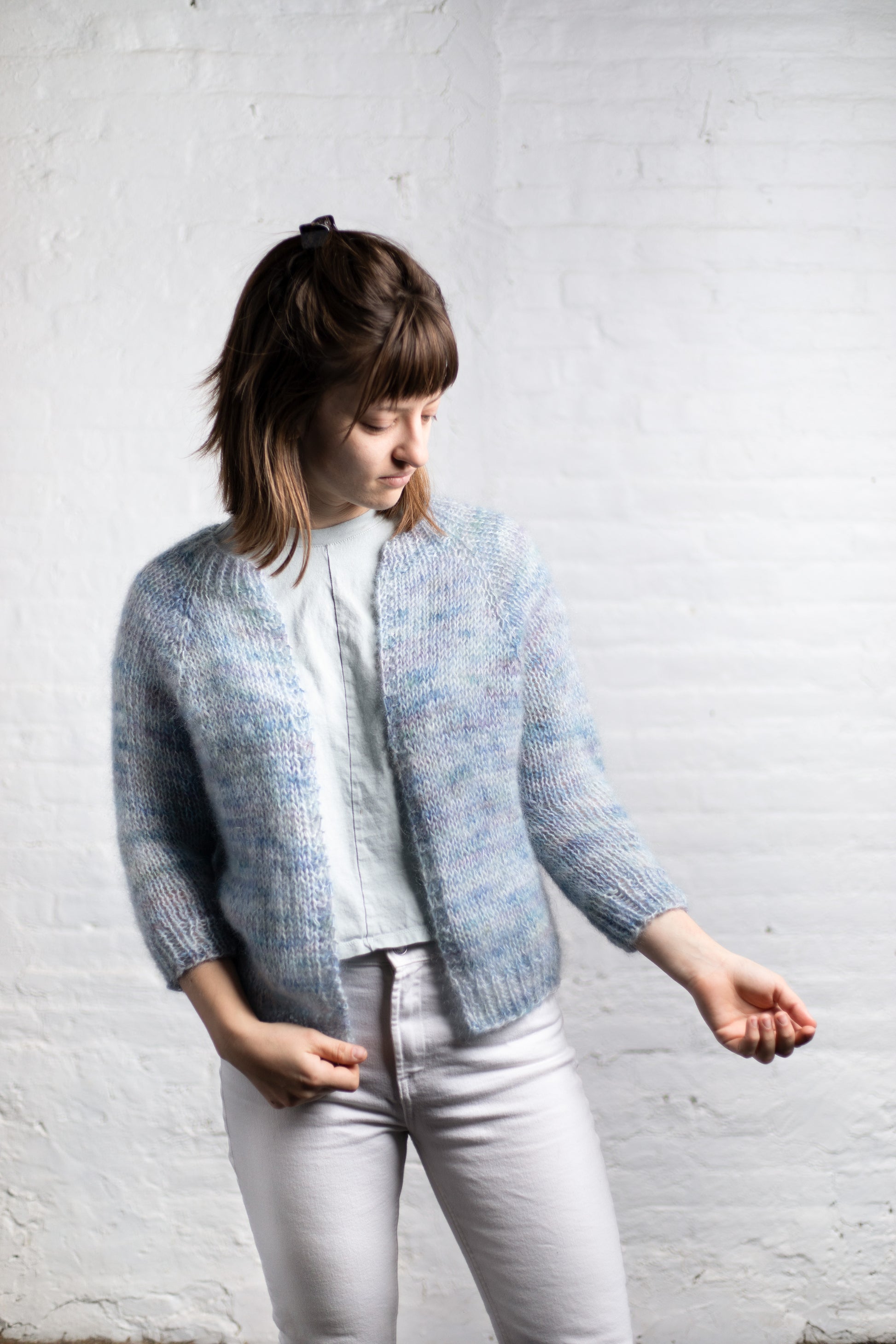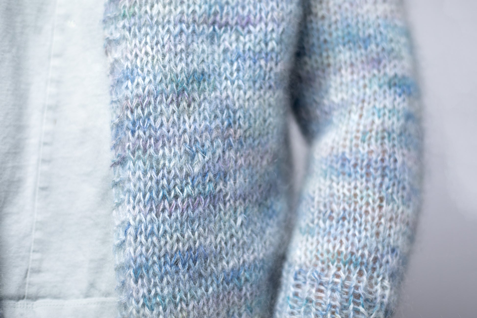The Contrails Cardigan is knit with one strand of Marina (laceweight) and 2 strands of Cabrito (mohair) in two different colors. Together, the colors are subtle and soft, shifting over the course of the garment. Knit at a larger gauge, the fabric becomes soft and airy and cloud-like.