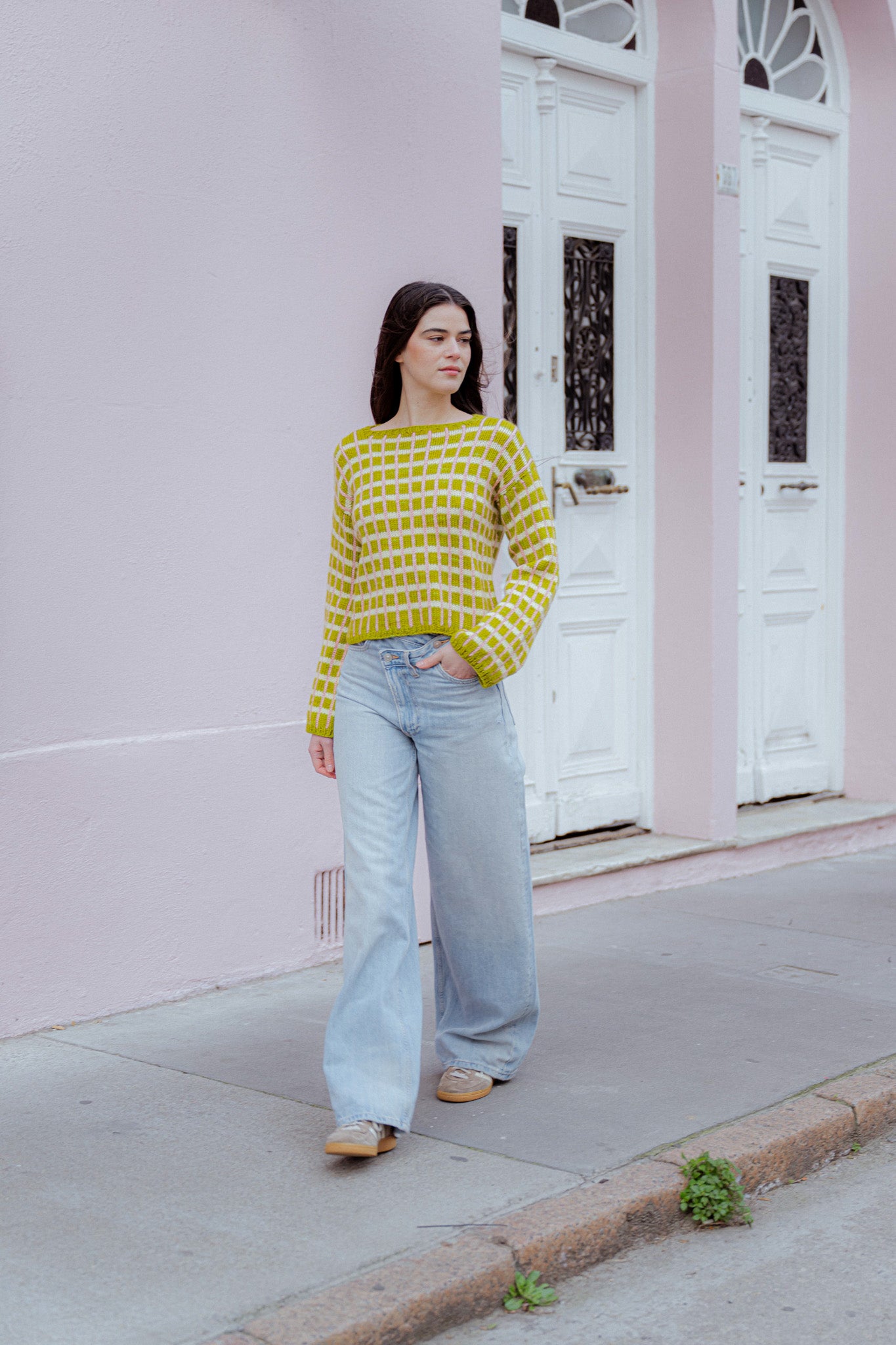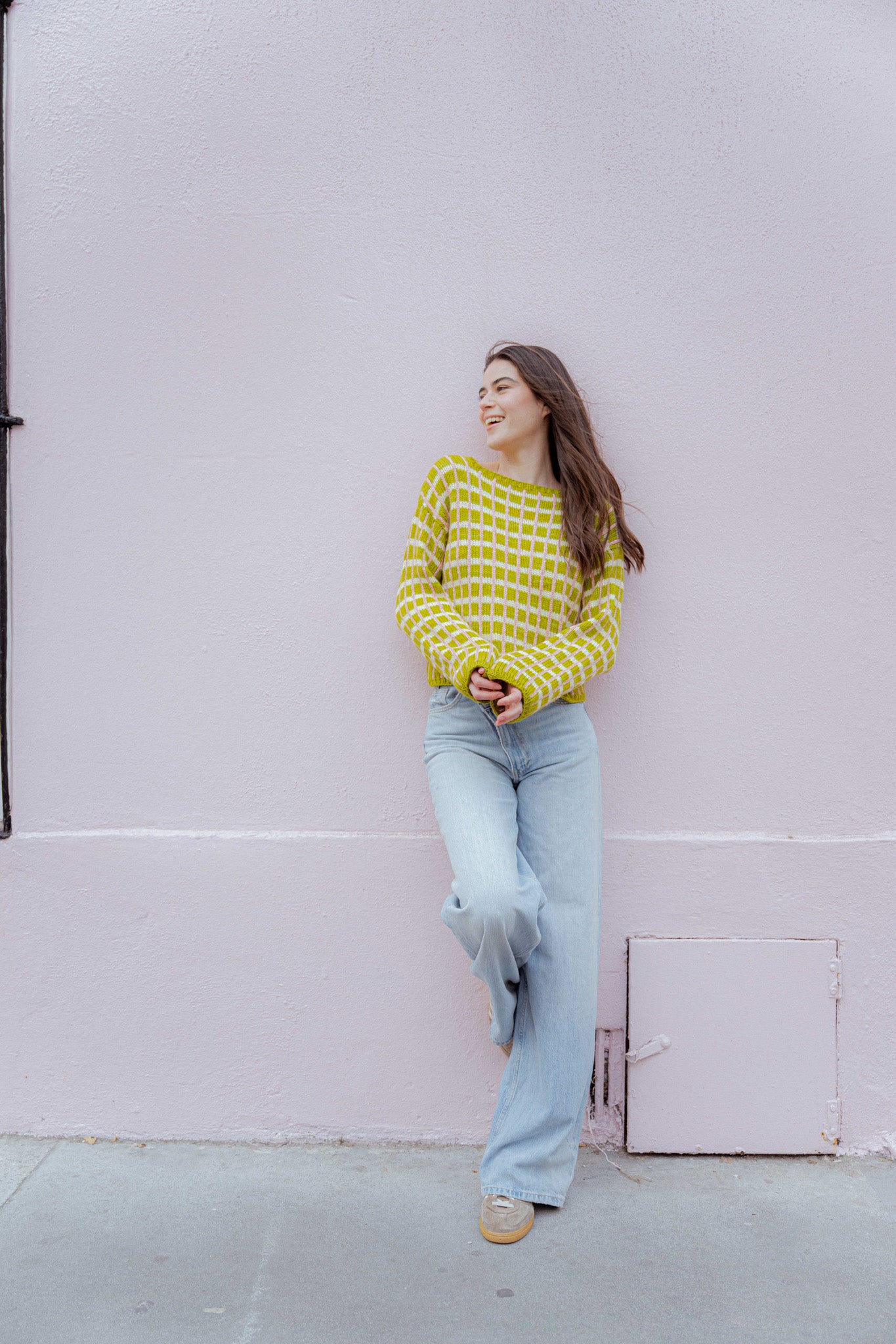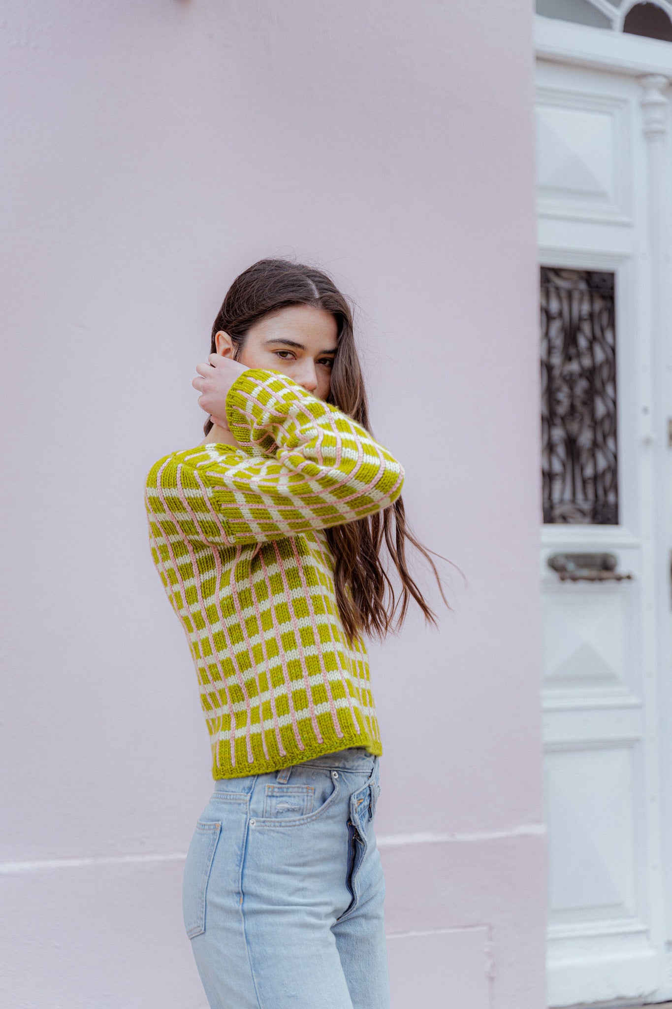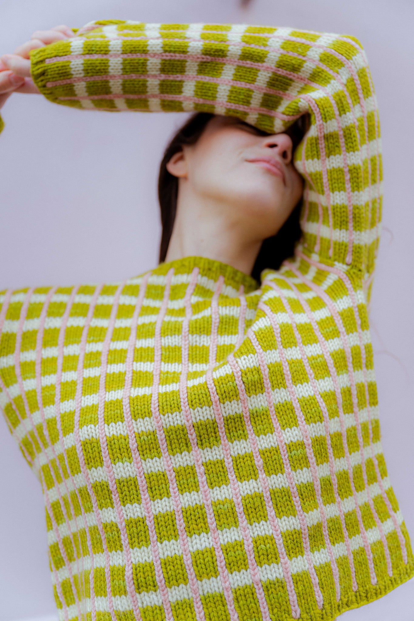 Knit in Ideal, our 100% Polwarth wool yarn, this pullover is worked from the bottom up. Although it may look like more complex colorwork, it actually uses just two colors while knitting — the third is added afterward using duplicate stitch with a crochet hook. It’s a great project for colorwork beginners who want to explore new techniques without making things too complicated.