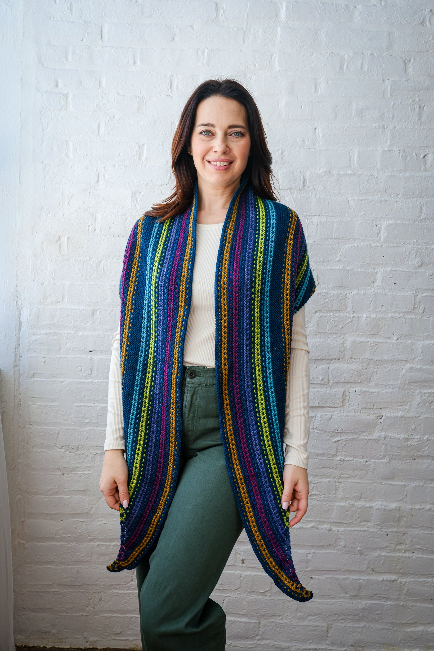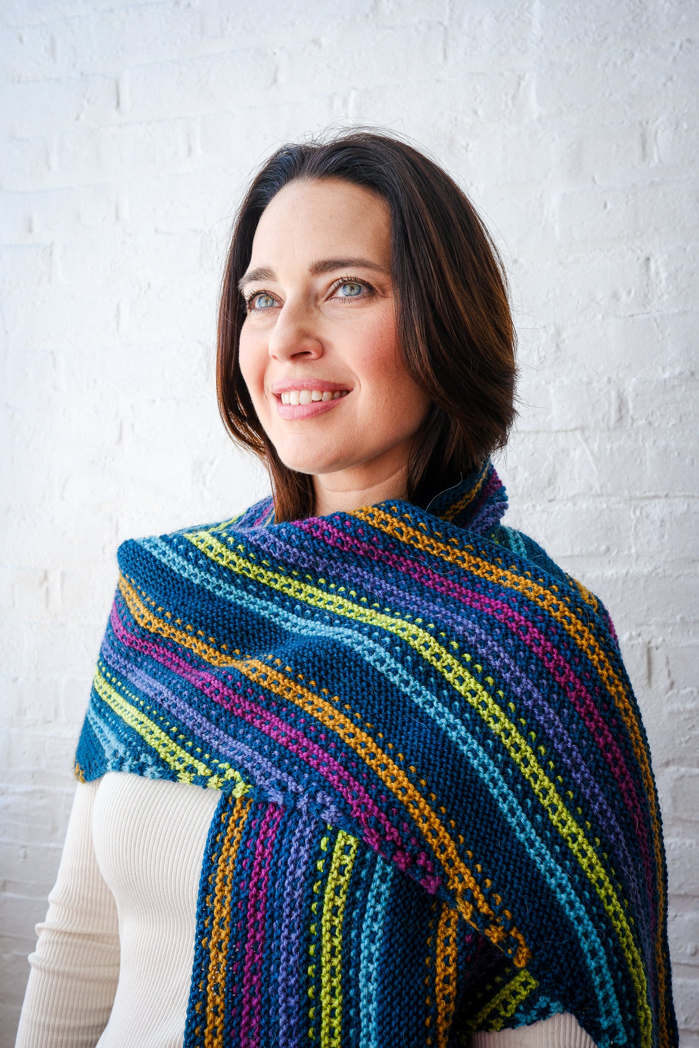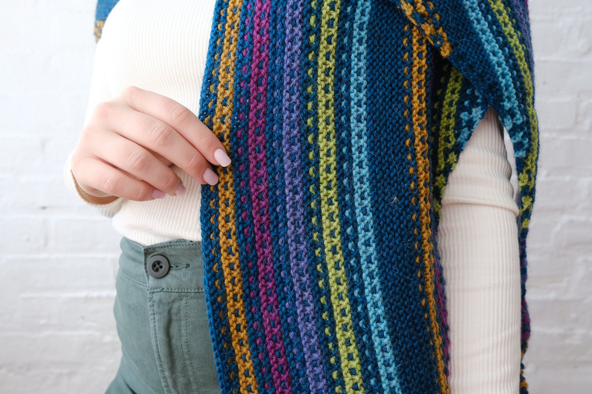 Esme's Sister is a parallel to our Esme Shawl in Fino! This version uses Alpaca Heather for a thicker and cozier shawl, while still playing with a multitude of colors in a mesmerizing slip-stitch pattern.