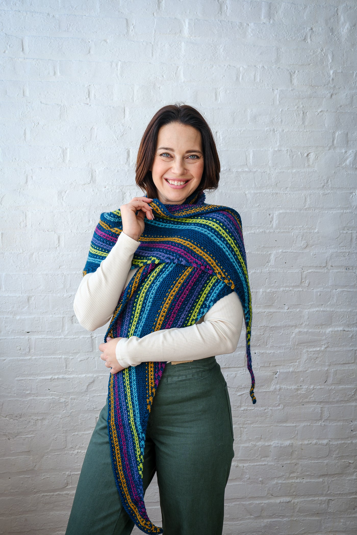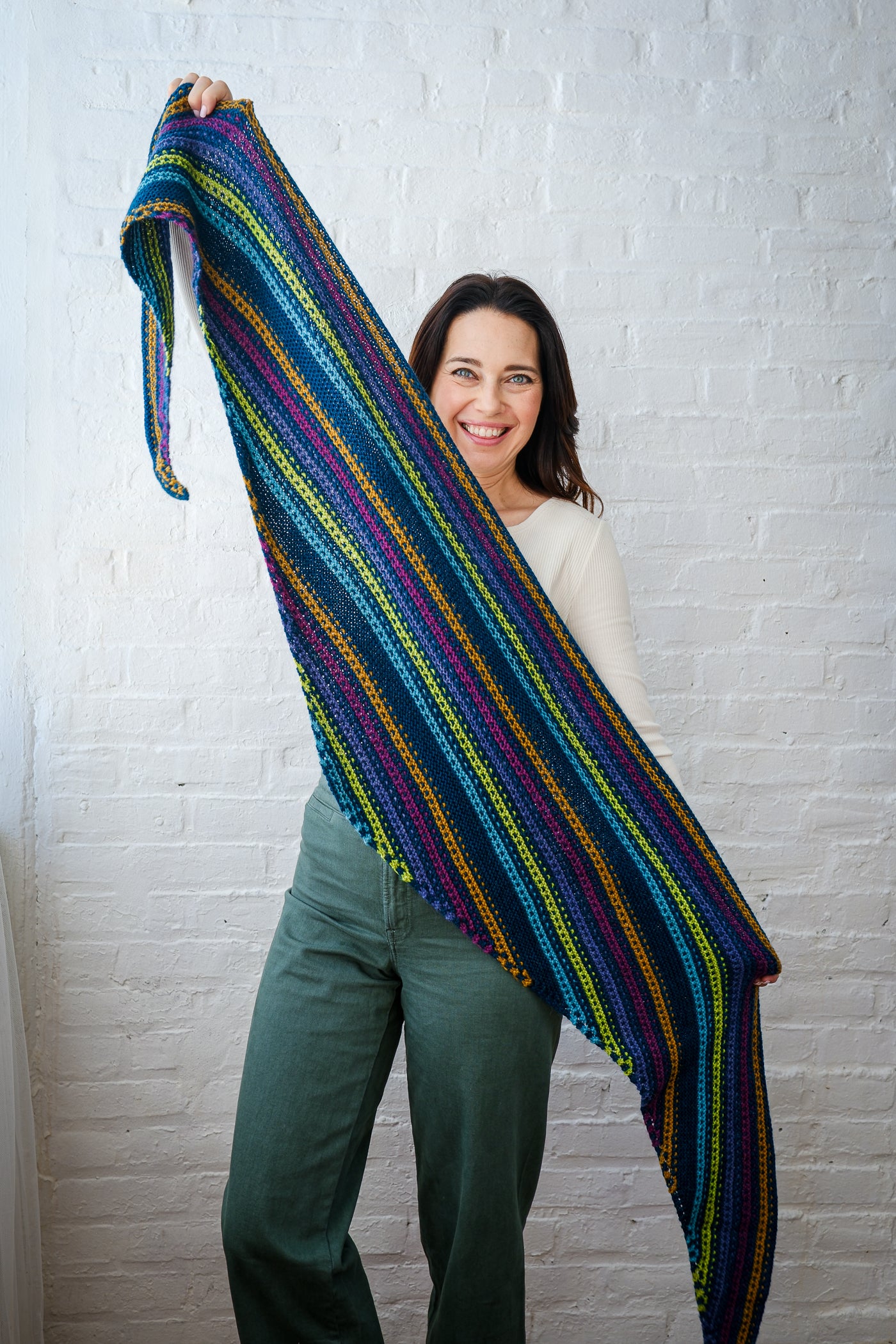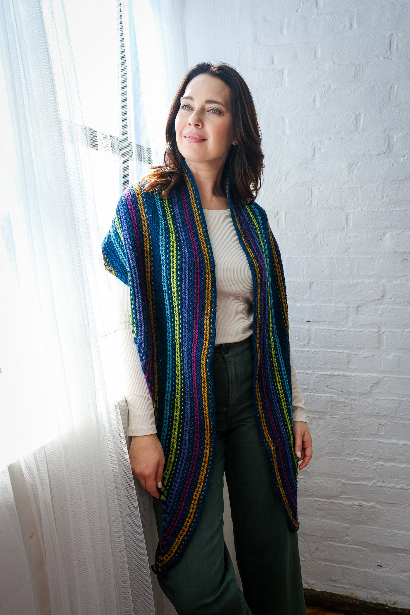 Esme's Sister is a parallel to our Esme Shawl in Fino! This version uses Alpaca Heather for a thicker and cozier shawl, while still playing with a multitude of colors in a mesmerizing slip-stitch pattern.