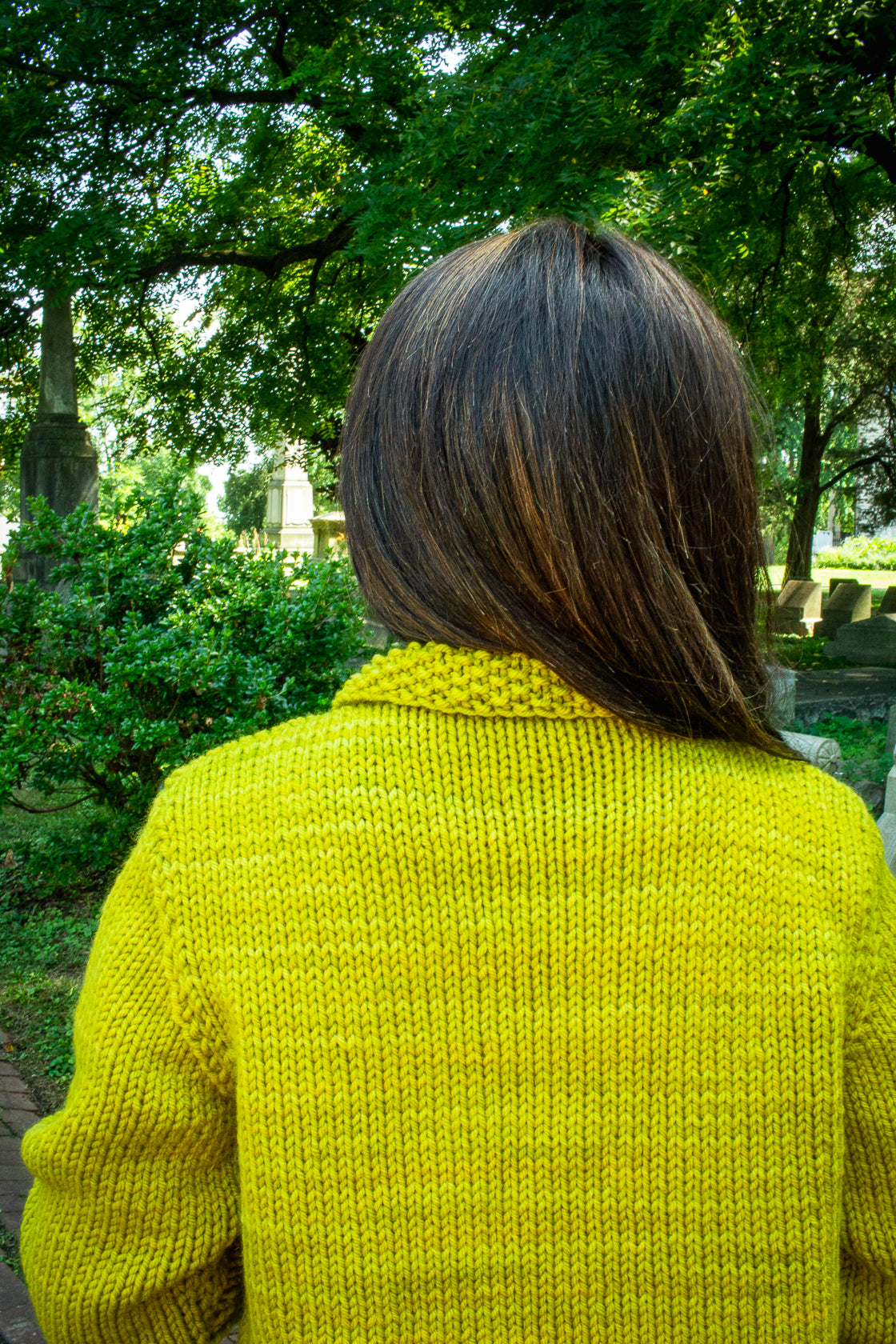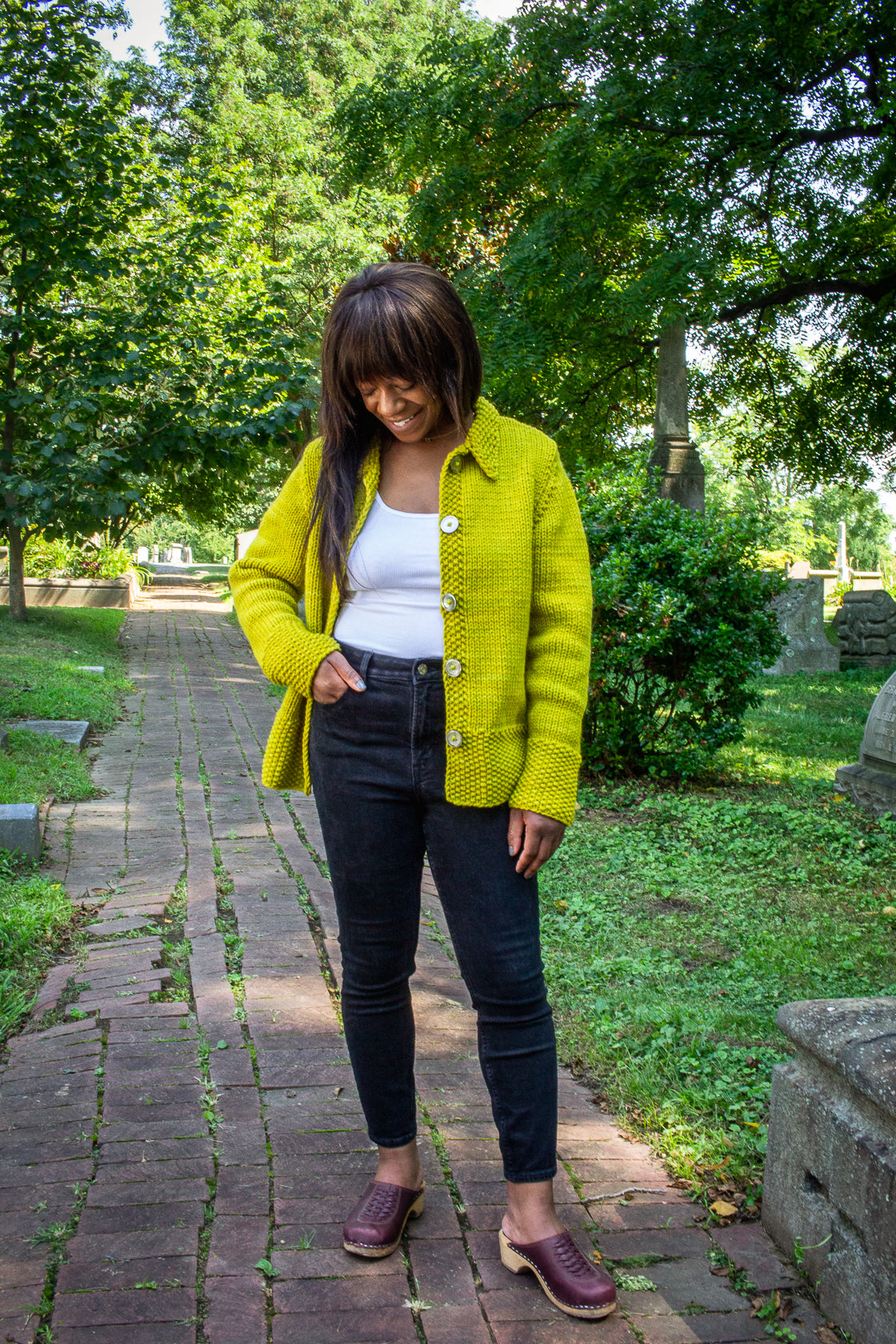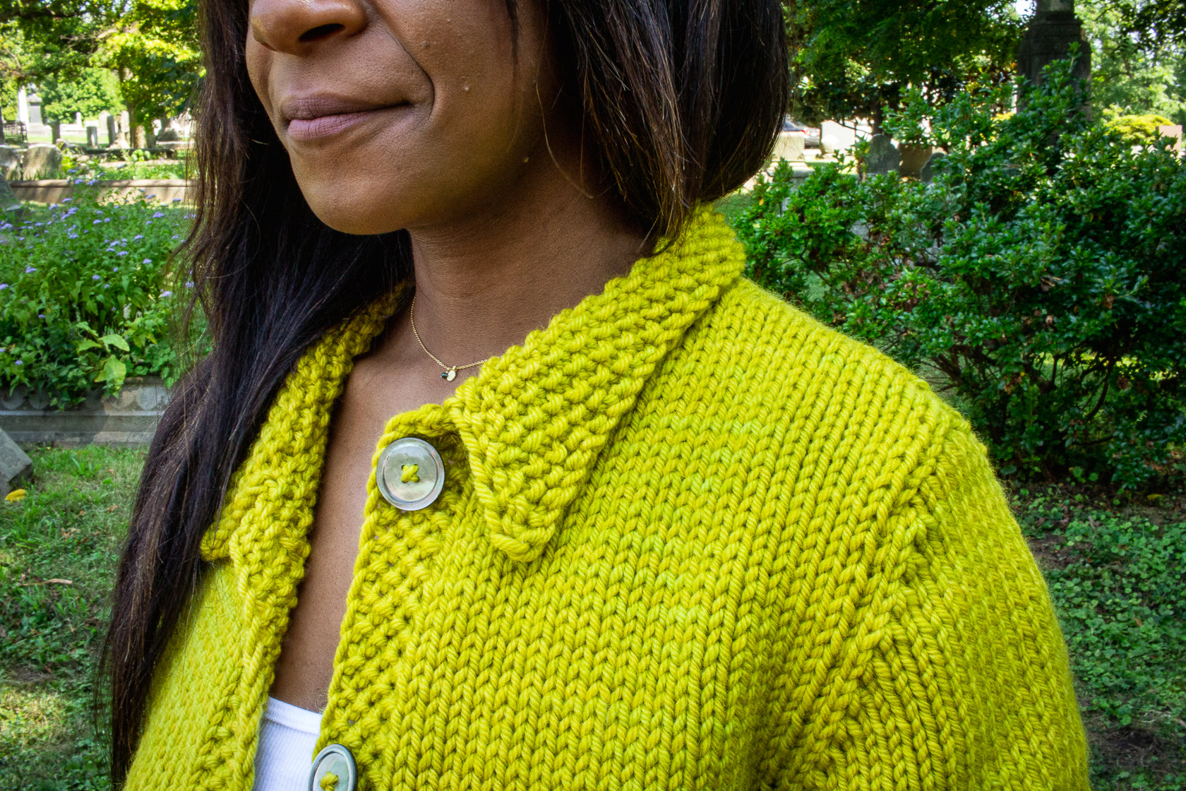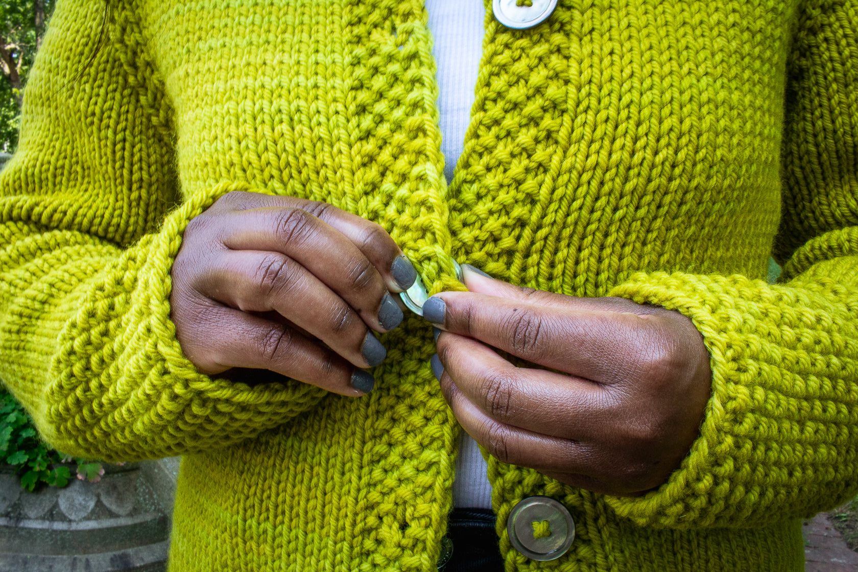 Jabiru is a jacket with clean lines and classic details: collar; knitted-in button bands; set-in sleeves; selvedge stitch to keep edges tidy and make seaming easier. Seed stitch provides an ornamental element that's still in keeping with the overall tailored look. The takeaway: with Cardo, a quick-knitting yarn doesn't compromise neatness or refinement.