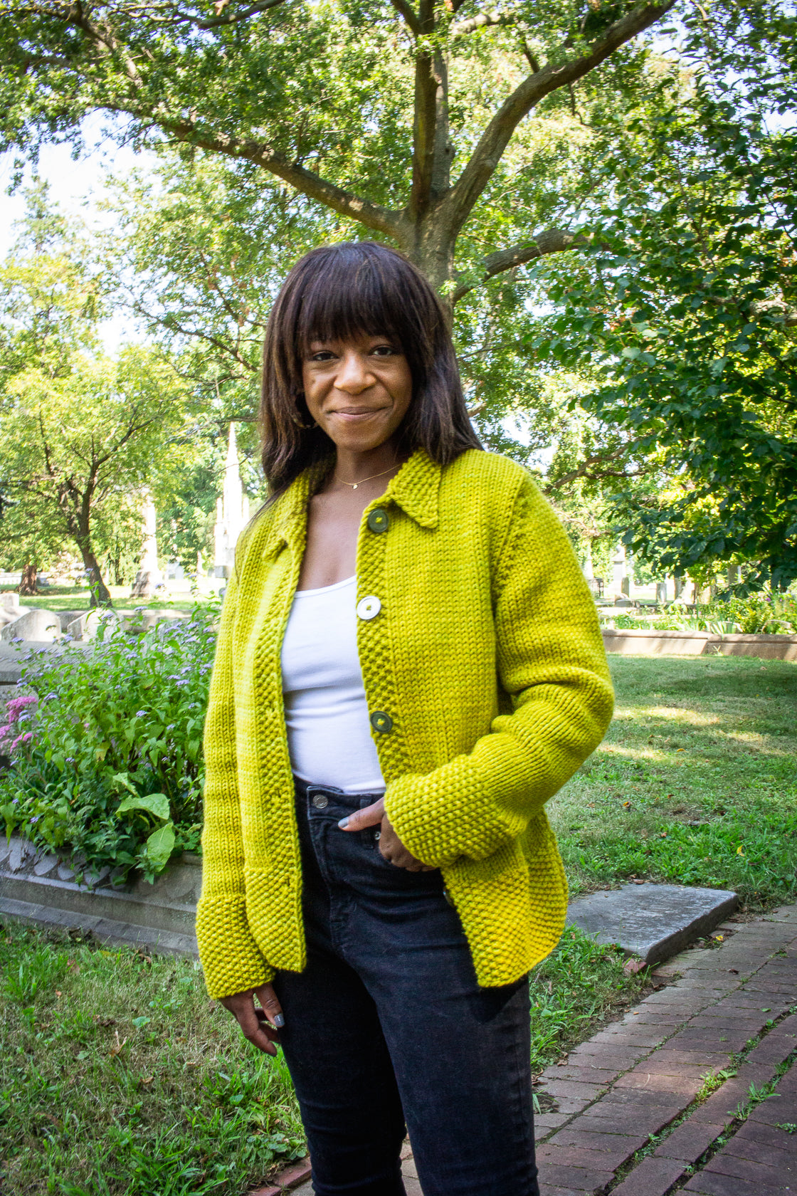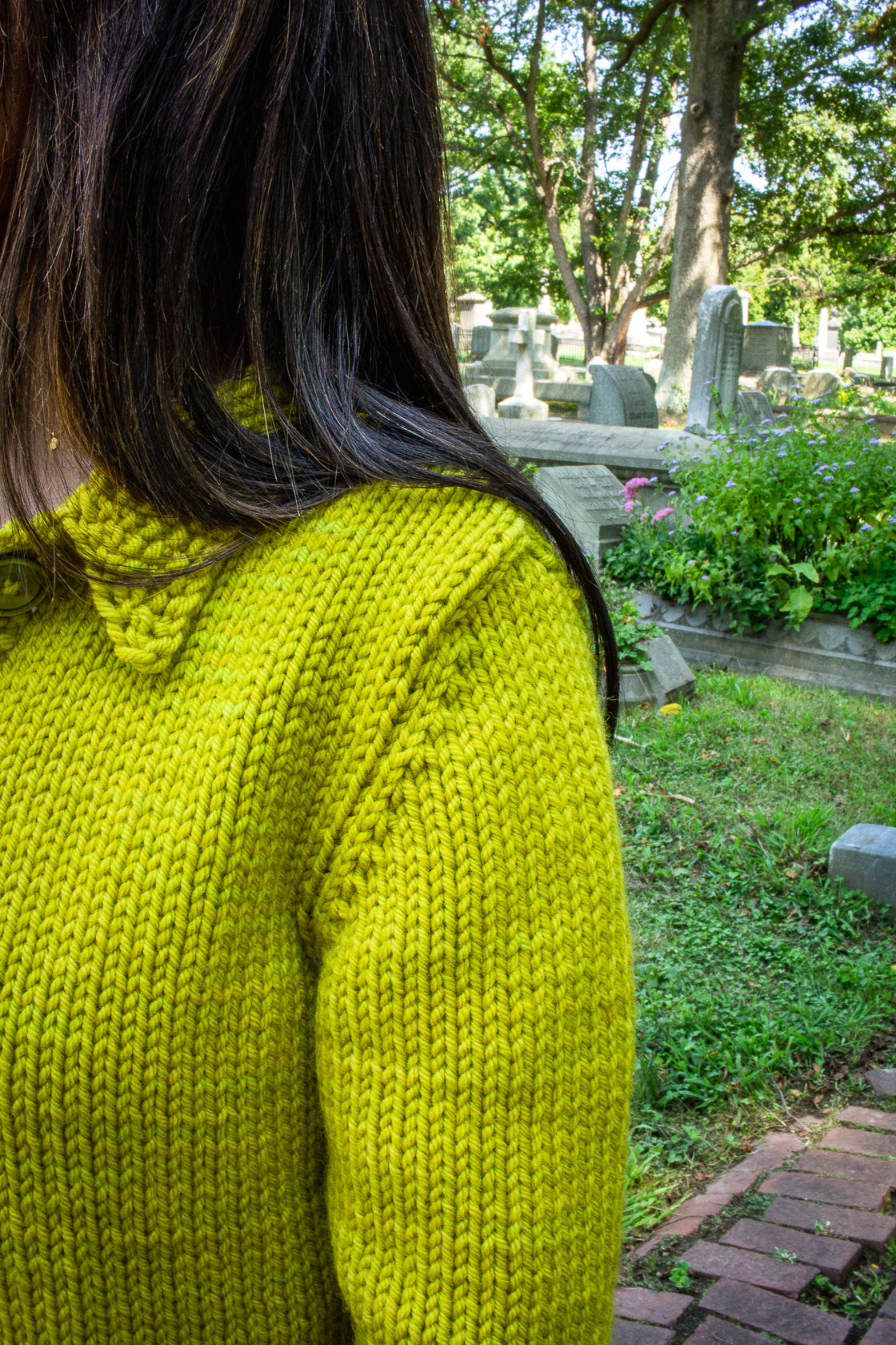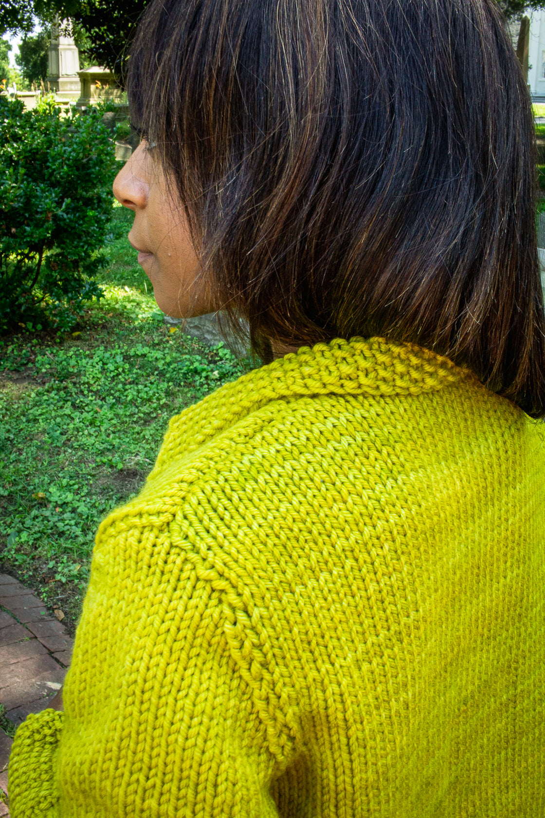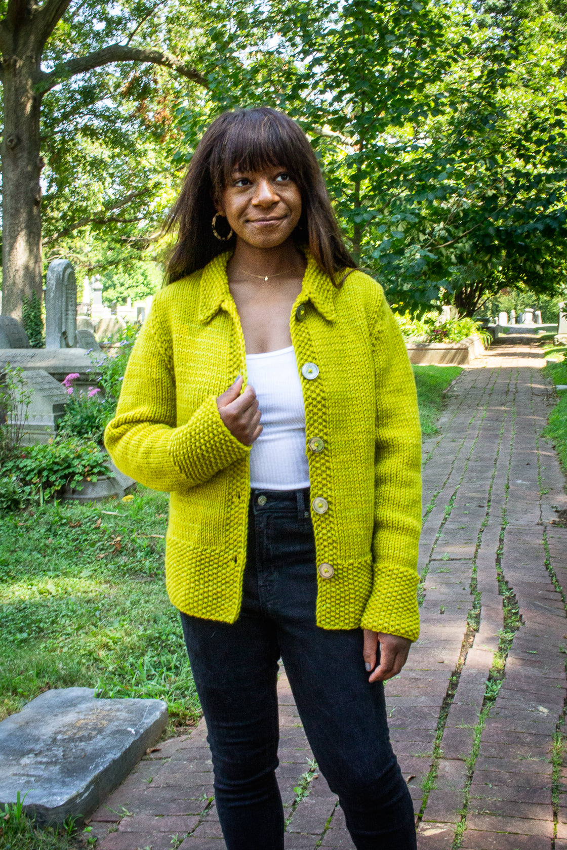 Jabiru is a jacket with clean lines and classic details: collar; knitted-in button bands; set-in sleeves; selvedge stitch to keep edges tidy and make seaming easier. Seed stitch provides an ornamental element that's still in keeping with the overall tailored look. The takeaway: with Cardo, a quick-knitting yarn doesn't compromise neatness or refinement.