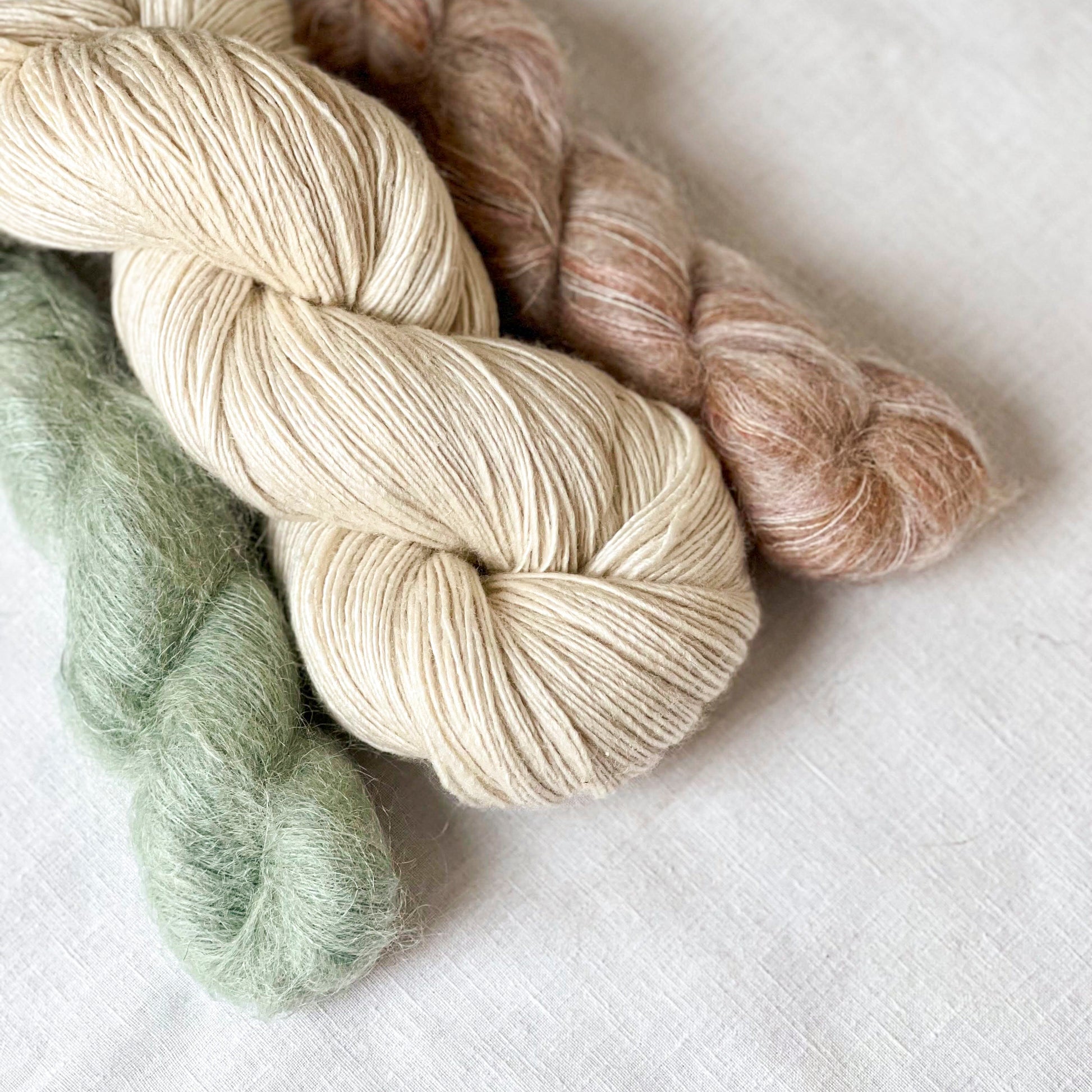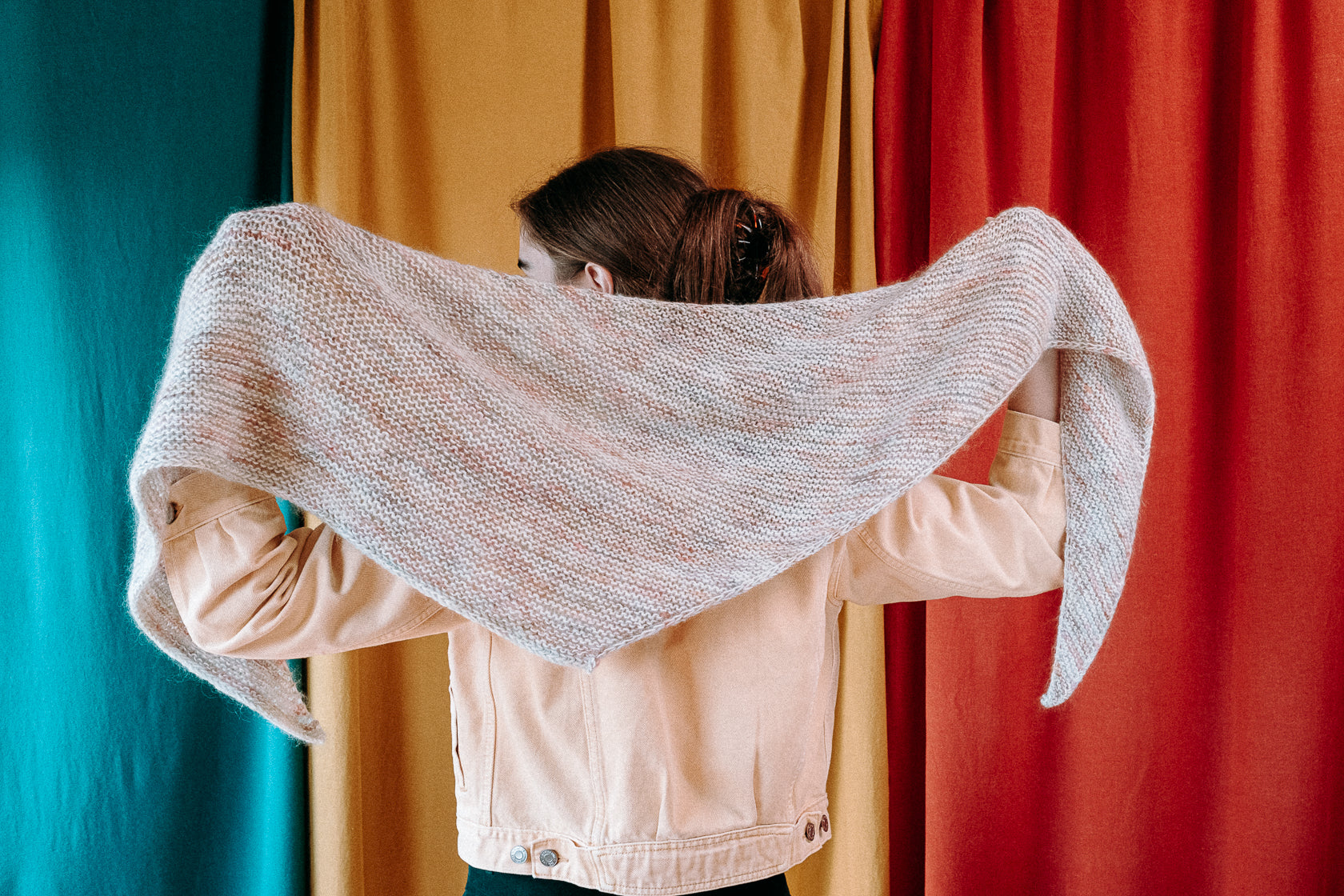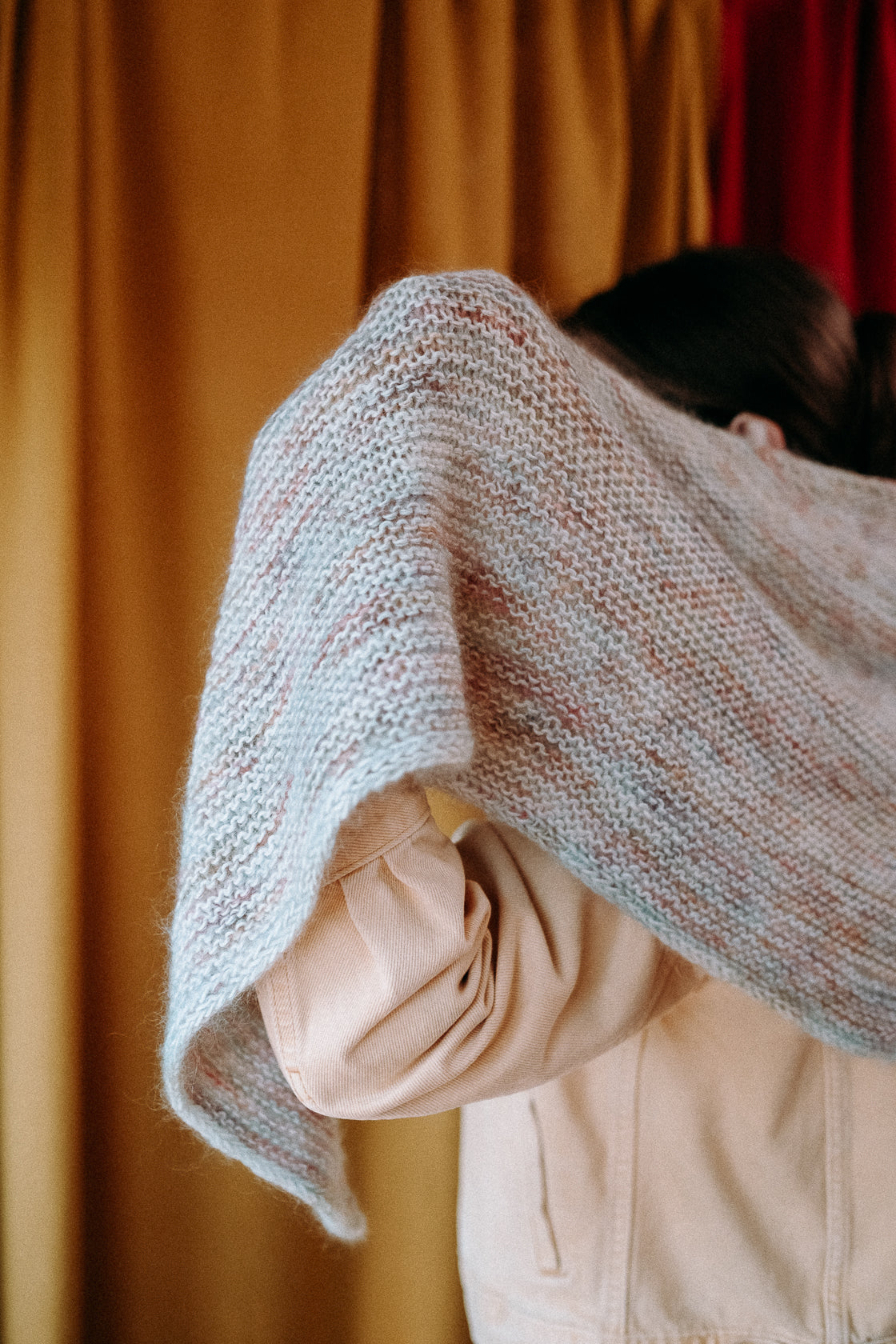 The Meadowgrass Shawl is knit with one strand of Fino, our lustrous silk and wool fingering weight yarn, and one strand of Cabrito, a laceweight kid mohair blend. Knit at a larger gauge, this shawl has an effervescent sheerness: it's drapey with an almost velvety feel thanks to the two yarns held together.