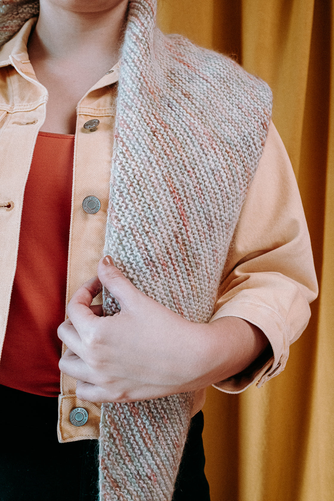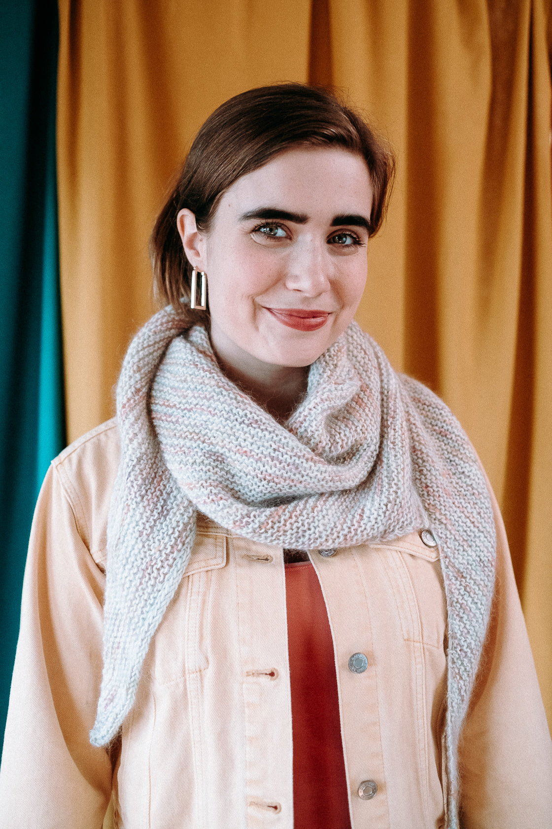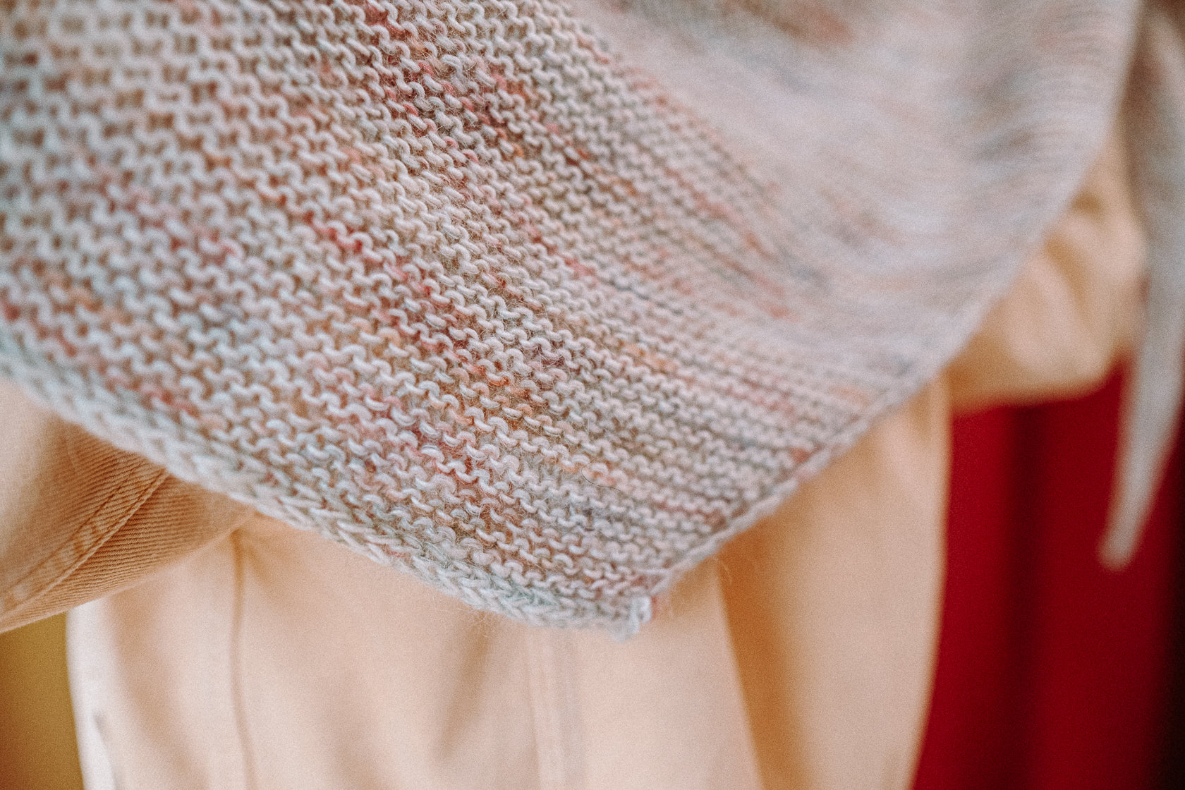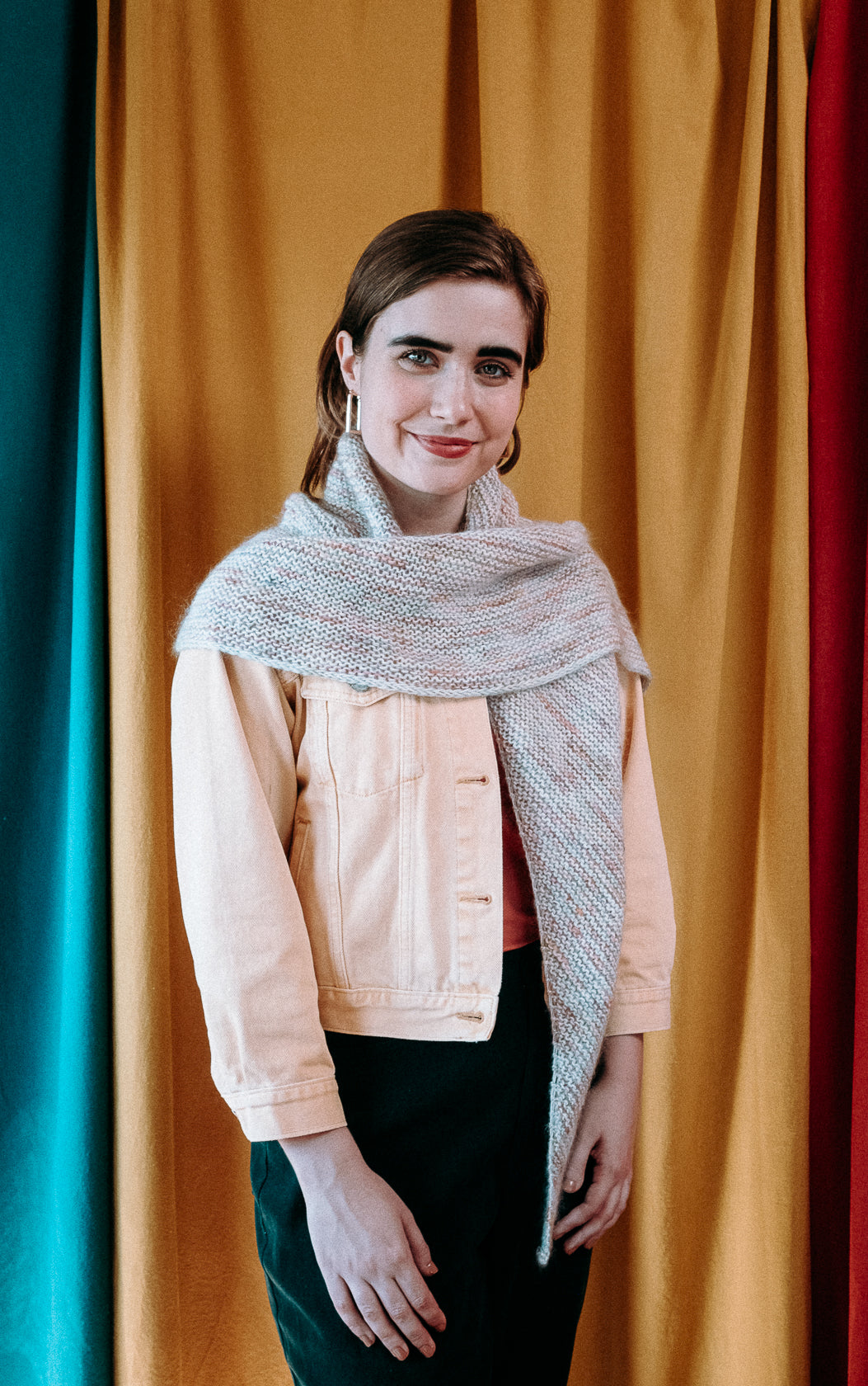 The Meadowgrass Shawl is knit with one strand of Fino, our lustrous silk and wool fingering weight yarn, and one strand of Cabrito, a laceweight kid mohair blend. Knit at a larger gauge, this shawl has an effervescent sheerness: it's drapey with an almost velvety feel thanks to the two yarns held together.