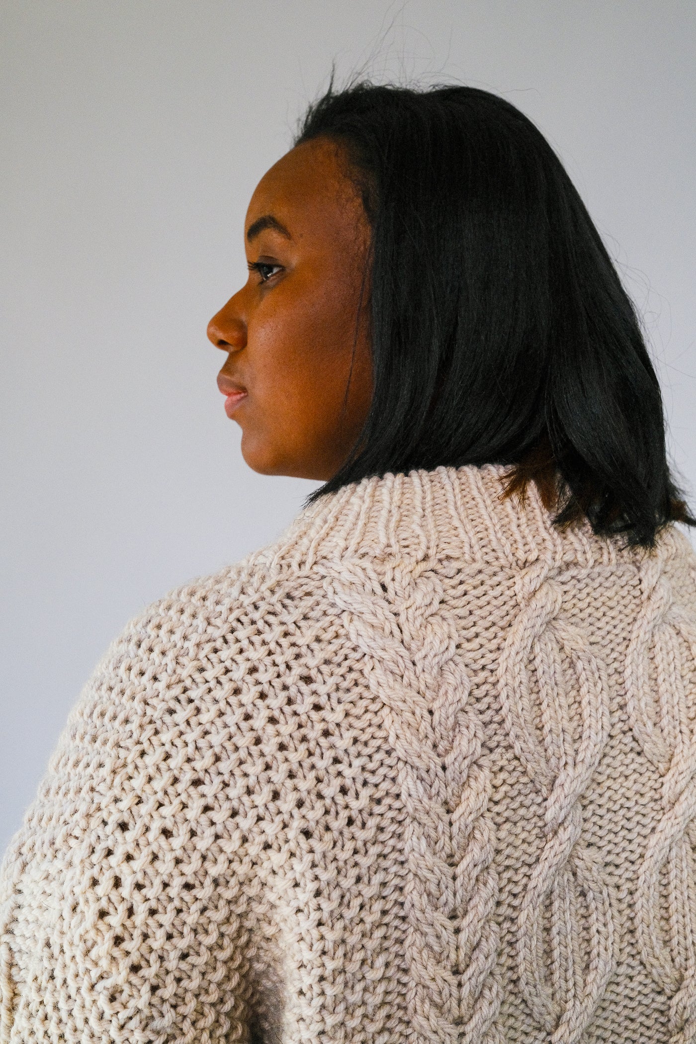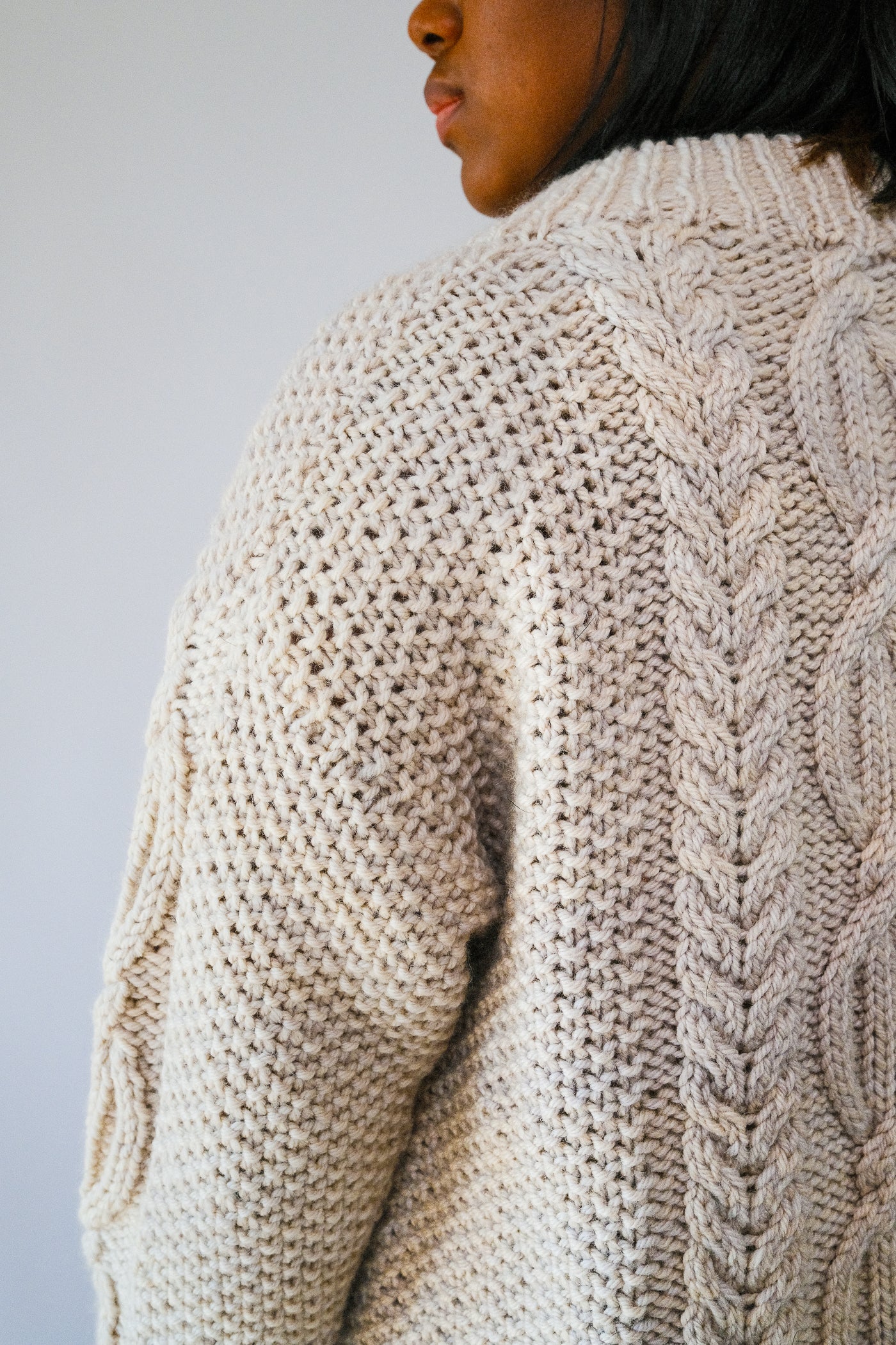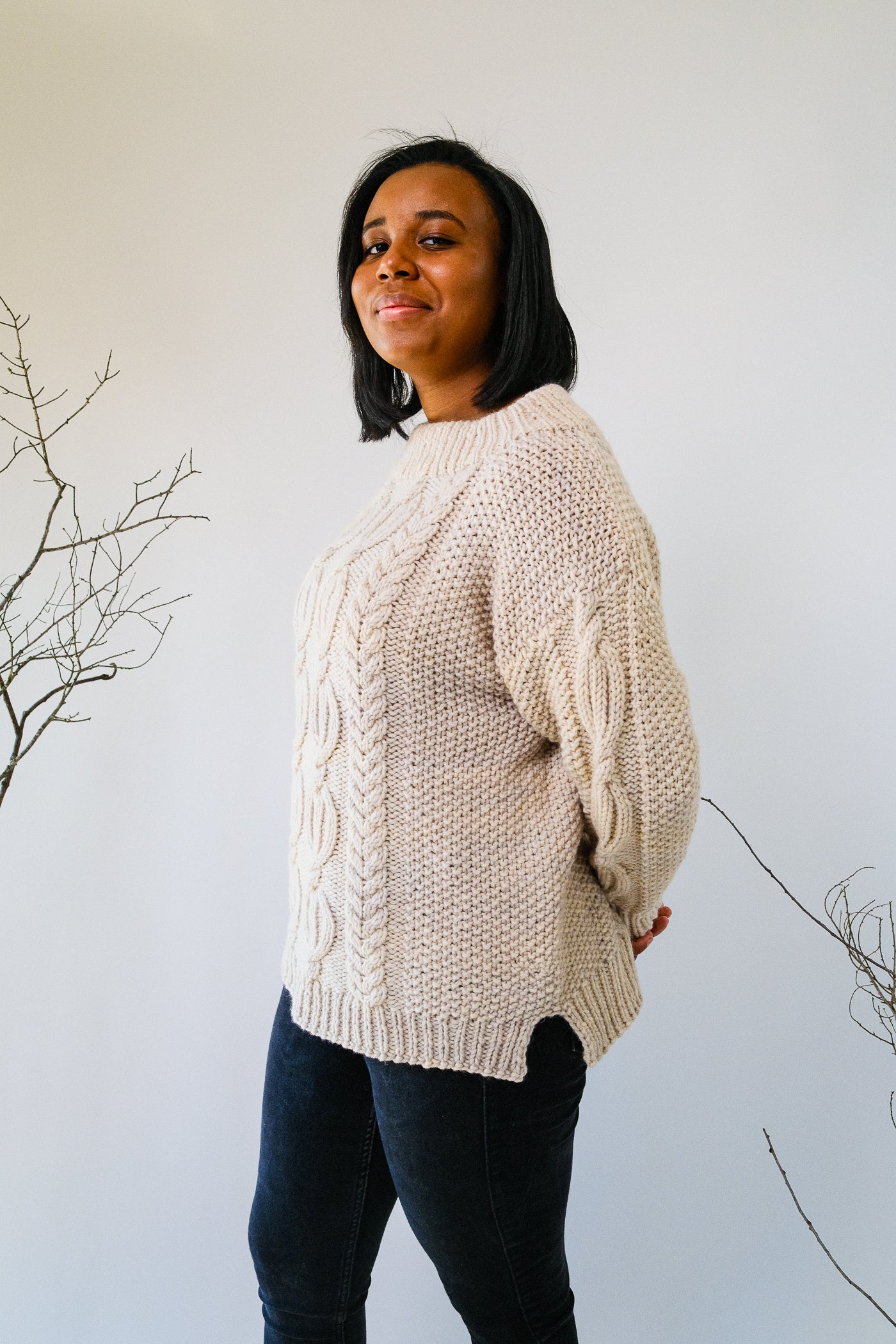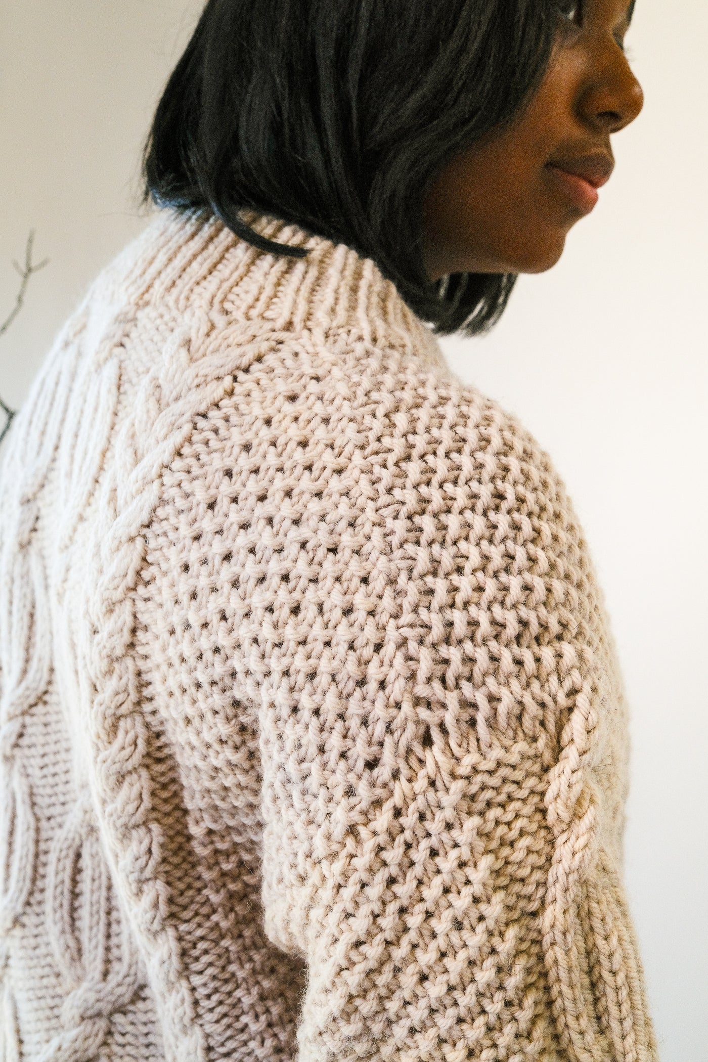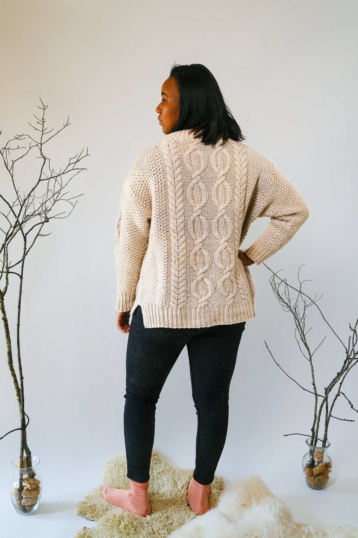 October Mornings is a bulky, drop shoulder sweater. It features a funnel neck and is heavily textured with large cables and seed stitch. October Mornings is one of those cozy, oversized sweaters you can throw on before running out the door and still look polished. The bottom has a split hem knit in 1x1 rib.